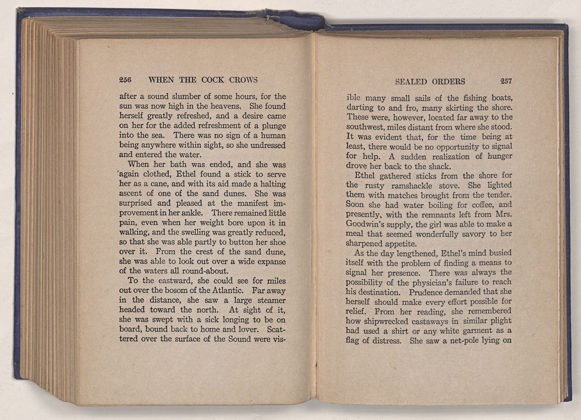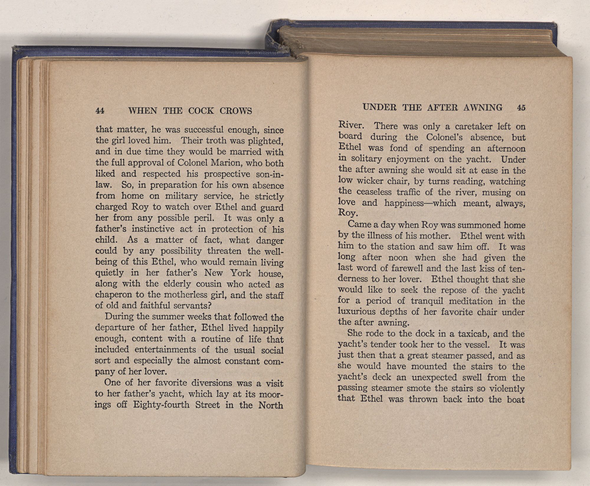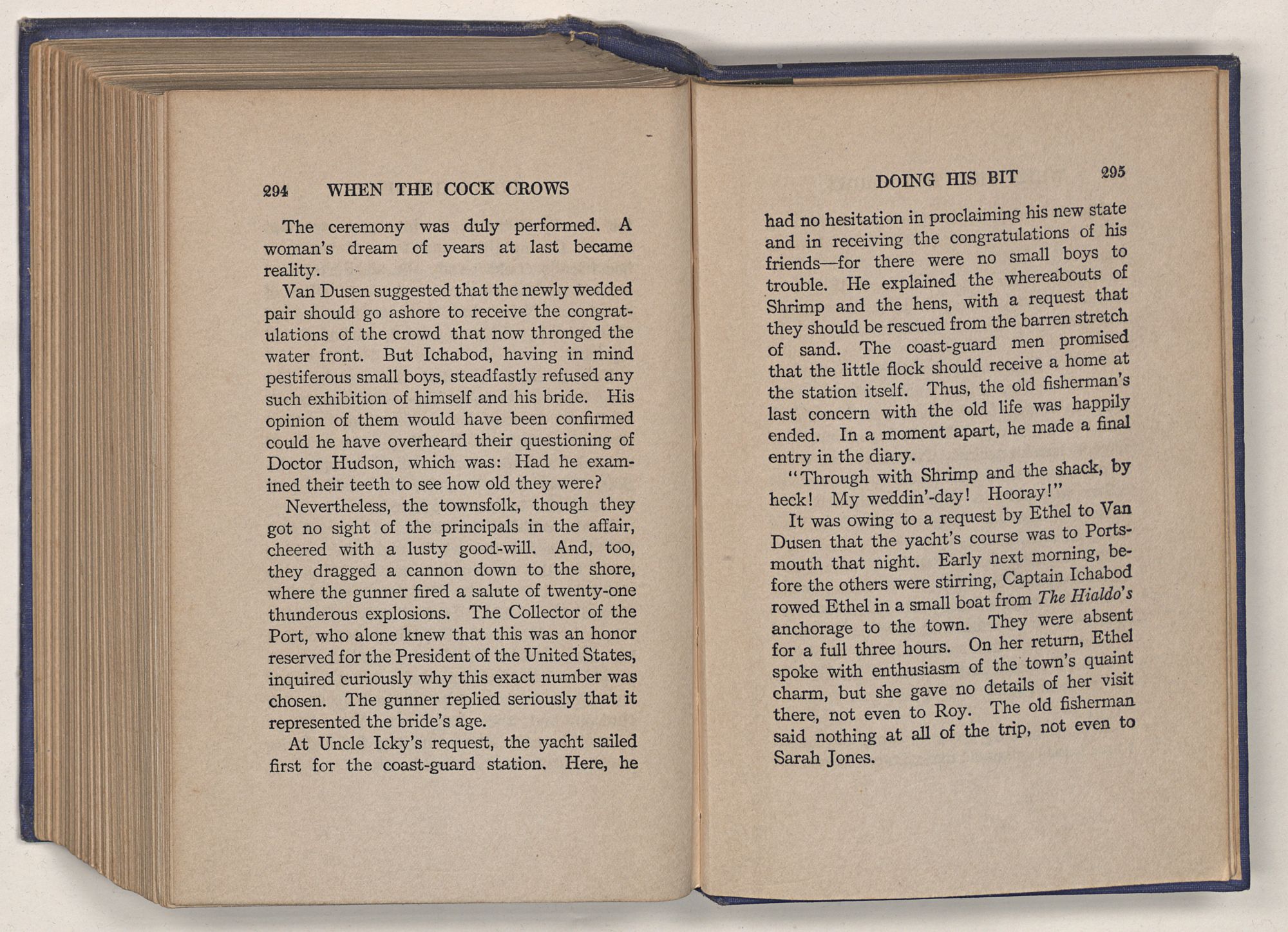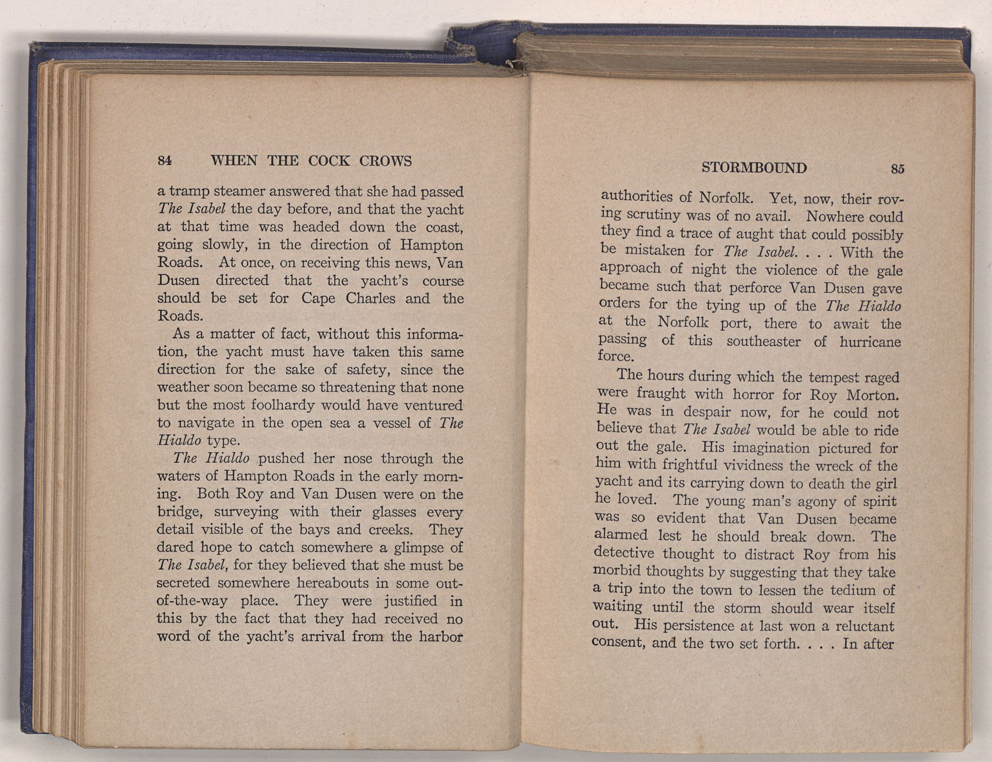 CHAPTER XXV Doing His BitICHABOD saw Ethel come out on the porch and take a seat at the far end. He somewhat hastily released Sarah from his arms, with the explanation that he ought to leave her free to make her preparations for the wedding. The spinster, blushing with happiness and excitement, hurried to busy herself with making ready for her new state of full womanhood. Just as Roy reached Ethel's side, Ichabod joined the two with the glad tidings of his sweetheart's acceptance of the “pre-nuptals.” The fisherman's apprehensions concerning too much publicity for the wedding ceremony led him rather shyly to suggest that it should take place on board The Hialdo, away from the prying eyes of the townsfolk. He explained that he didn't know which would be worse—the