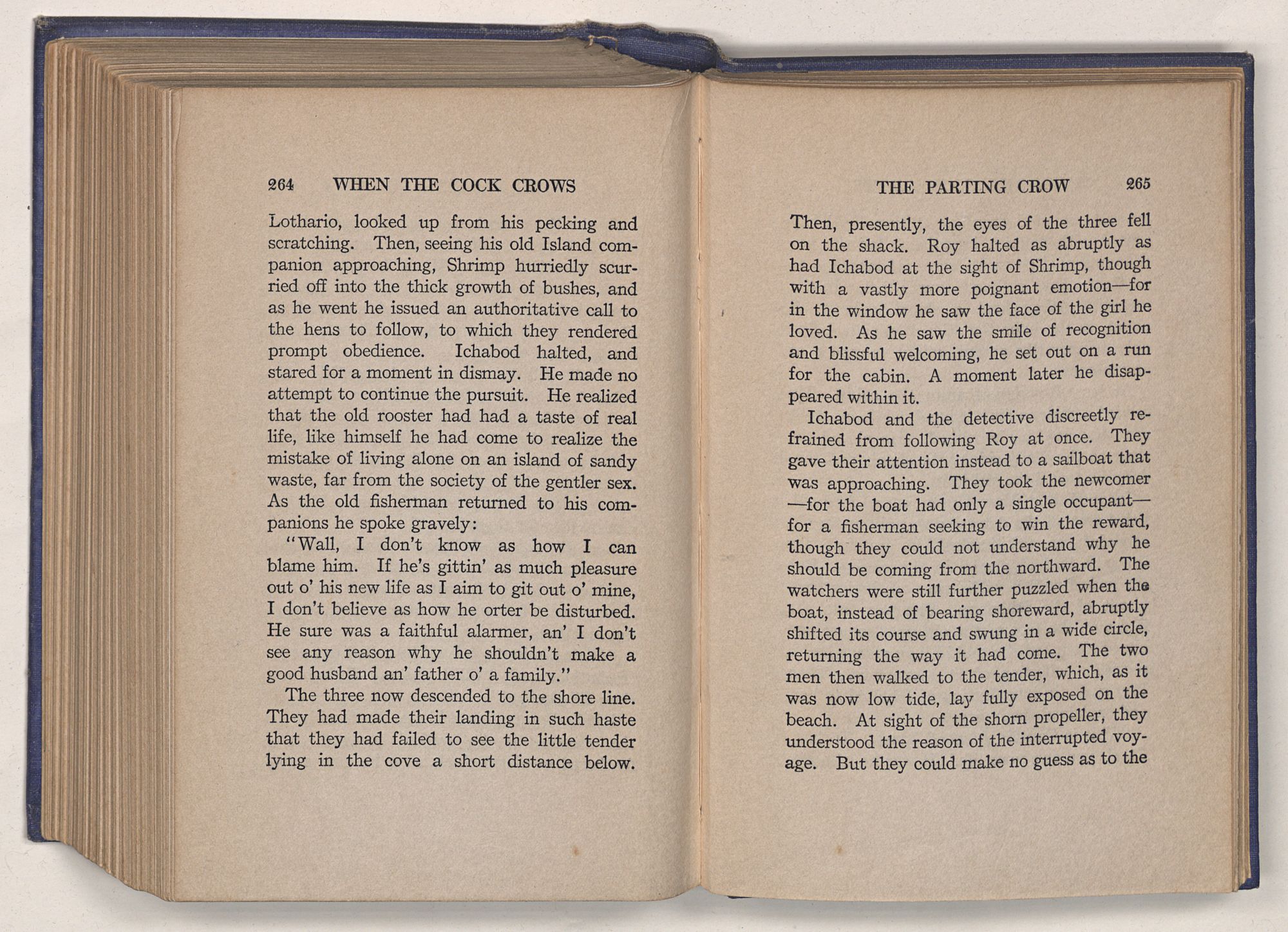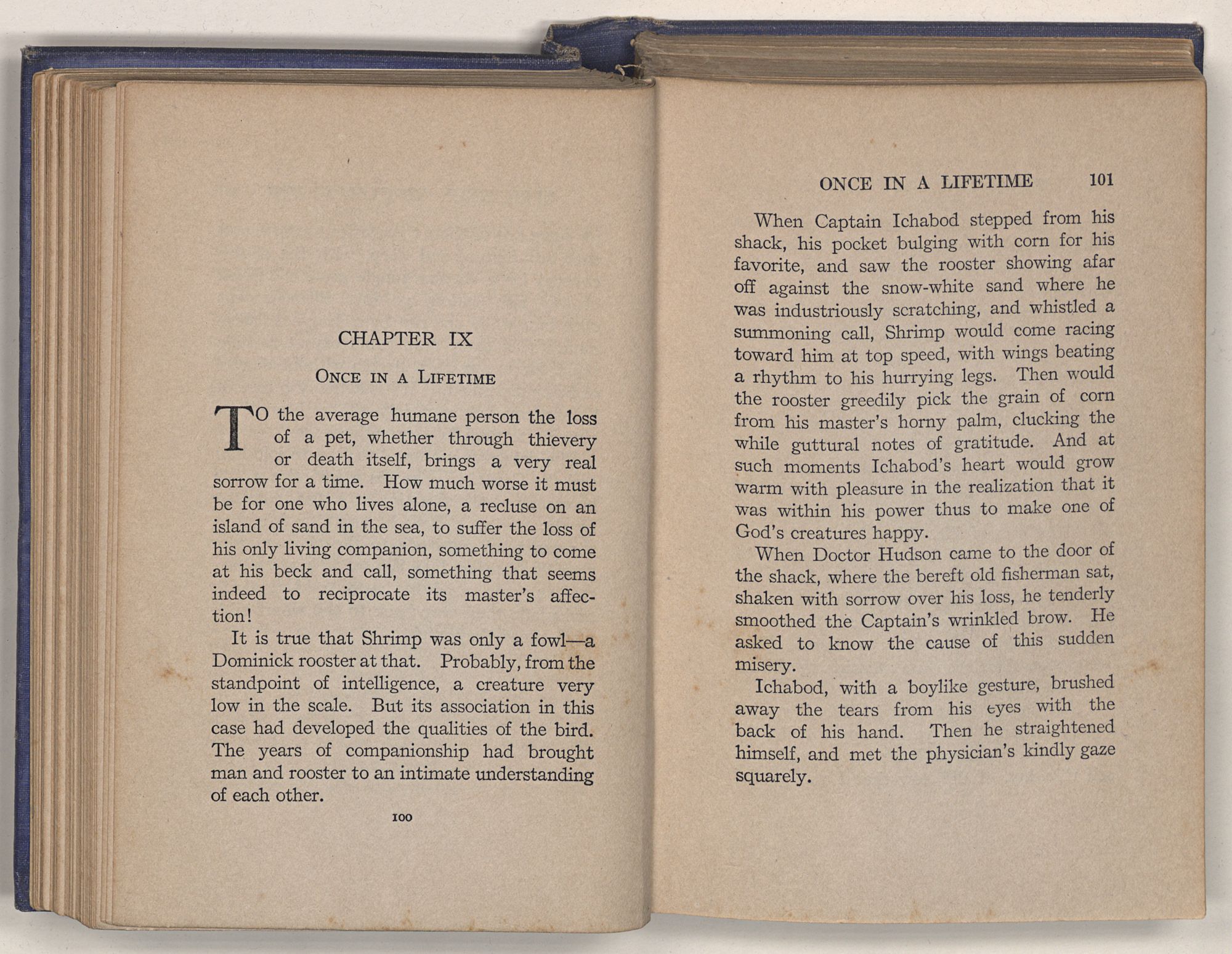 The Captain was a woman-hater. This fact accounted for his choosing to live as a hermit on the bit of sand, which he had grown to love. But that loneliness was a trial to Shrimp, who naturally desired a harem of his own. Many times, when the wind was from the mainland, Captain Ichabod had heard the far-away crow of a barnyard fowl, and had gravely and criticizingly listened as Shrimp returned the salute in lusty manner. He had seen the bird swell in rage, and his comb turn red in jealous envy of the other rooster on the mainland.