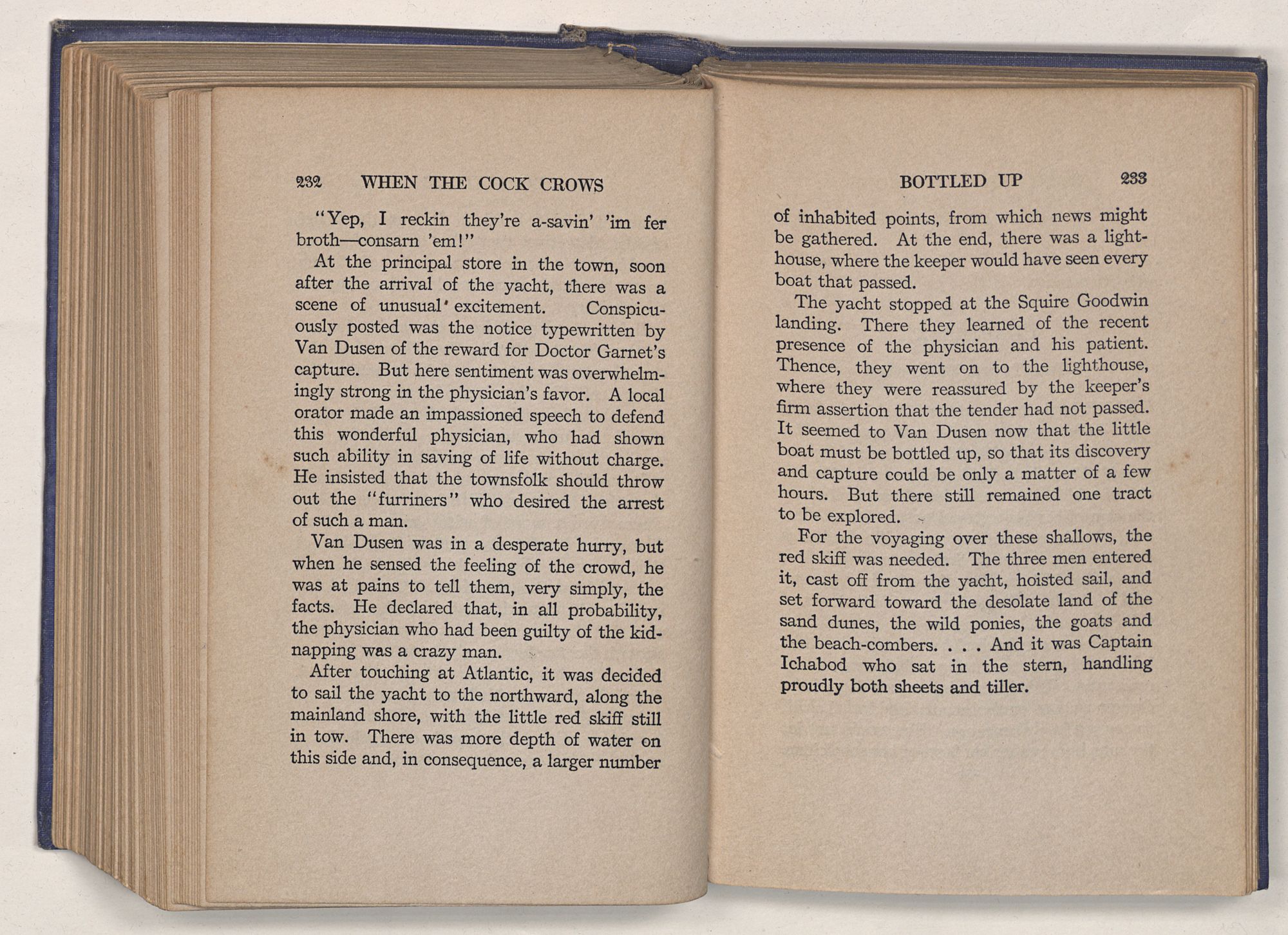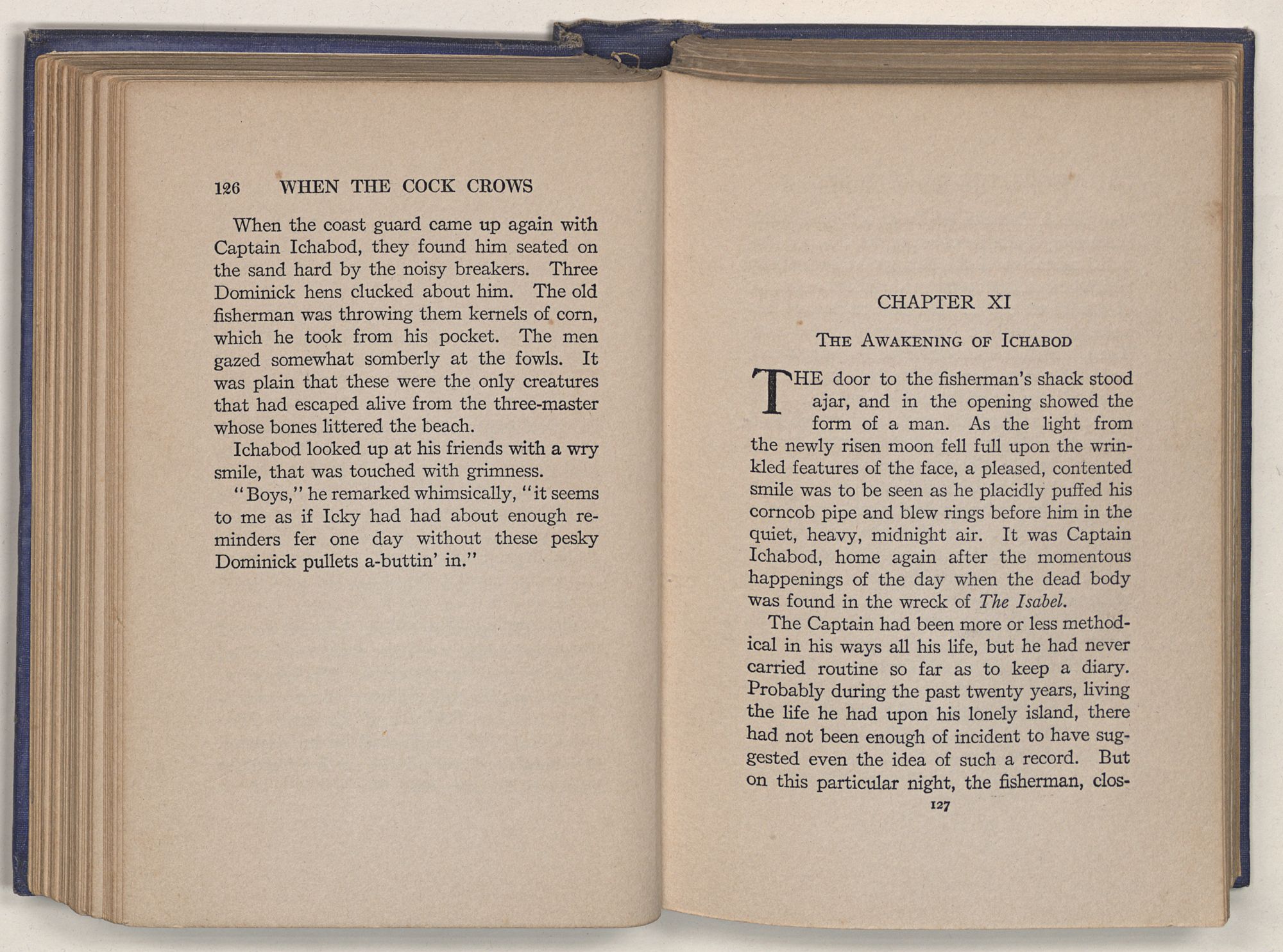 The Captain realized that a gale was brewing. He gathered up his nets from their racks. He made them snug in the shack, and stowed away everything movable. He was weather-wise. He would not be caught unawares. A high tide had more than once taught him the lesson of that beach. He had the red skiff hauled well up out of harm's way. There was, too, an extra anchor tied to the painter. Captain Ichabod and the rooster entered their cottage, for refuge from the wind that was now blowing dangerously.