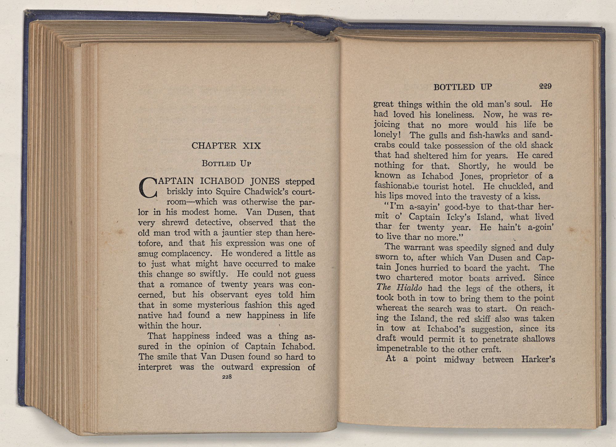 “Captain Ichabod had a confession to make to me. That confession was vastly more of a surprise to me, as you will soon understand, than this news in father's letter. The old fellow first swore me to secrecy. Then he out and told me, not without a certain exultation at his shrewdness, that he had put one over on the greatest detective in America, Arthur Van Dusen. He explained that when he and