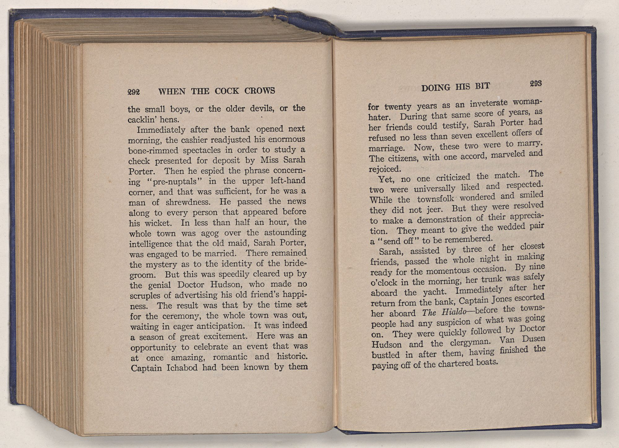 Immediately after the bank opened next morning, the cashier readjusted his enormous bone-rimmed spectacles in order to study a check presented for deposit by Miss Sarah Porter. Then he espied the phrase concerning “pre-nuptals” in the upper left-hand corner, and that was sufficient, for he was a man of shrewdness. He passed the news along to every person that appeared before his wicket. In less than half an hour, the whole town was agog over the astounding intelligence that the old maid, Sarah Porter, was engaged to be married. There remained the mystery as to the identity of the bridegroom. But this was speedily cleared up by the genial Doctor Hudson, who made no scruples of advertising his old friend's happiness. The result was that by the time set for the ceremony, the whole town was out, waiting in eager anticipation. It was indeed a season of great excitement. Here was an opportunity to celebrate an event that was at once amazing, romantic and historic. Captain Ichabod had been known by them