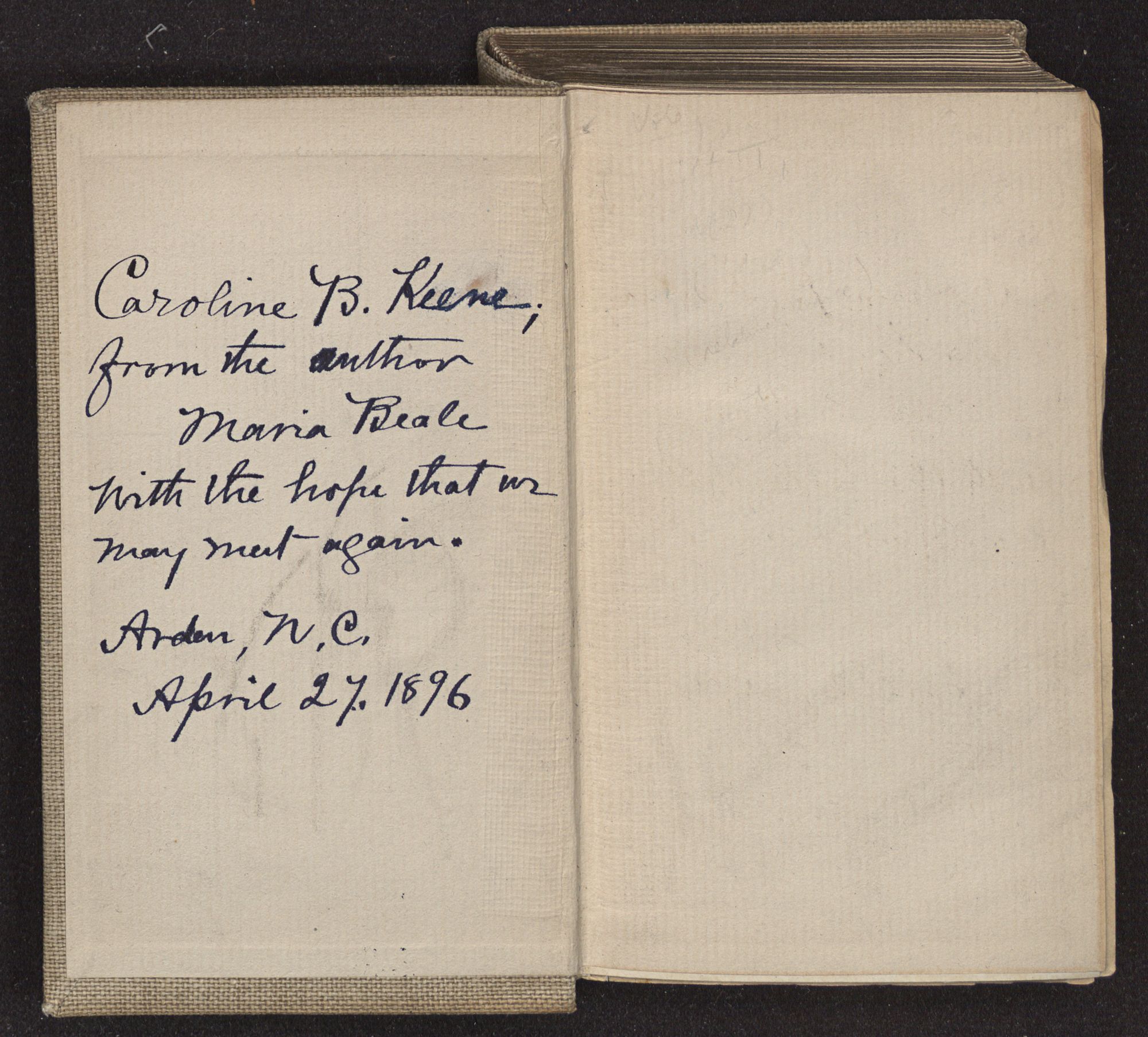 Caroline B. Keene, from the author Maria Beale with the hope that we may meet again. Arden, N.C. April 27, 1896