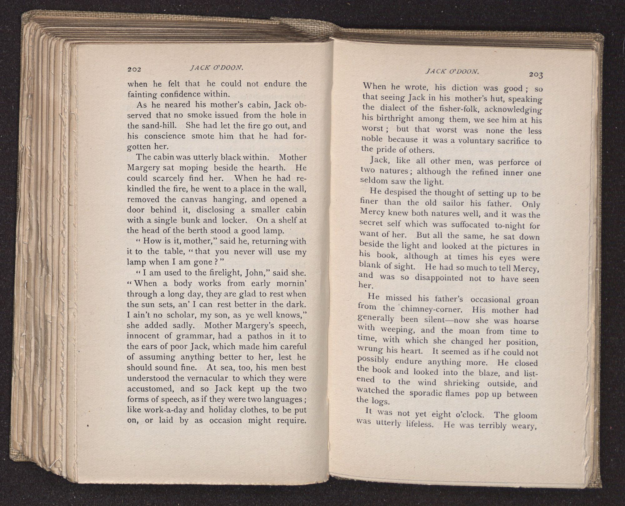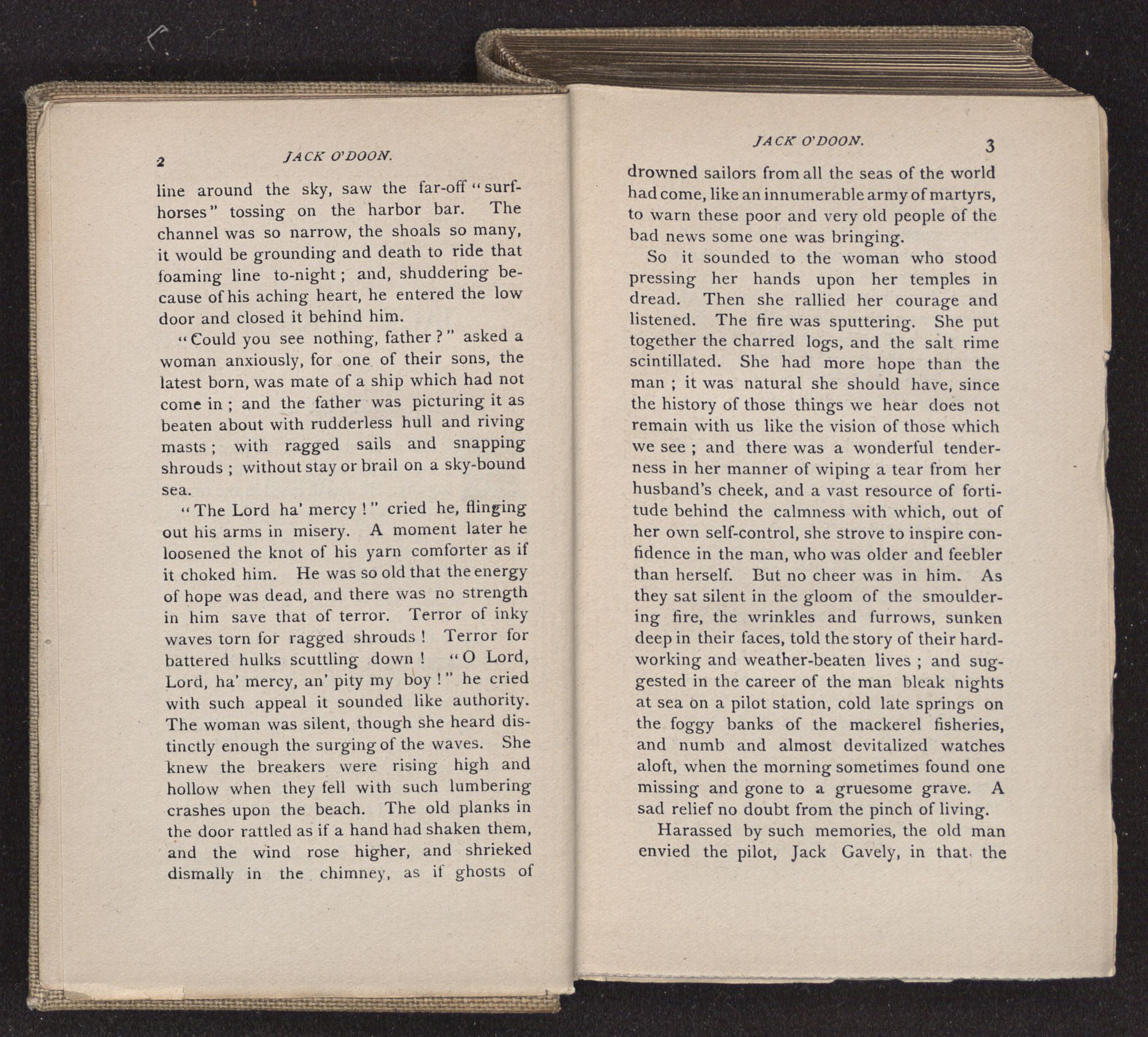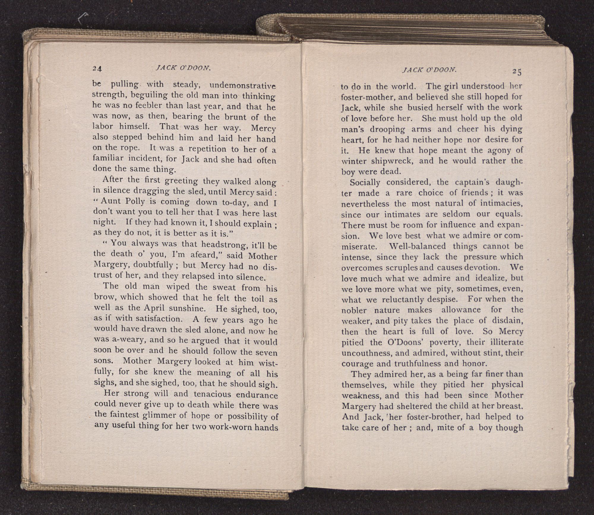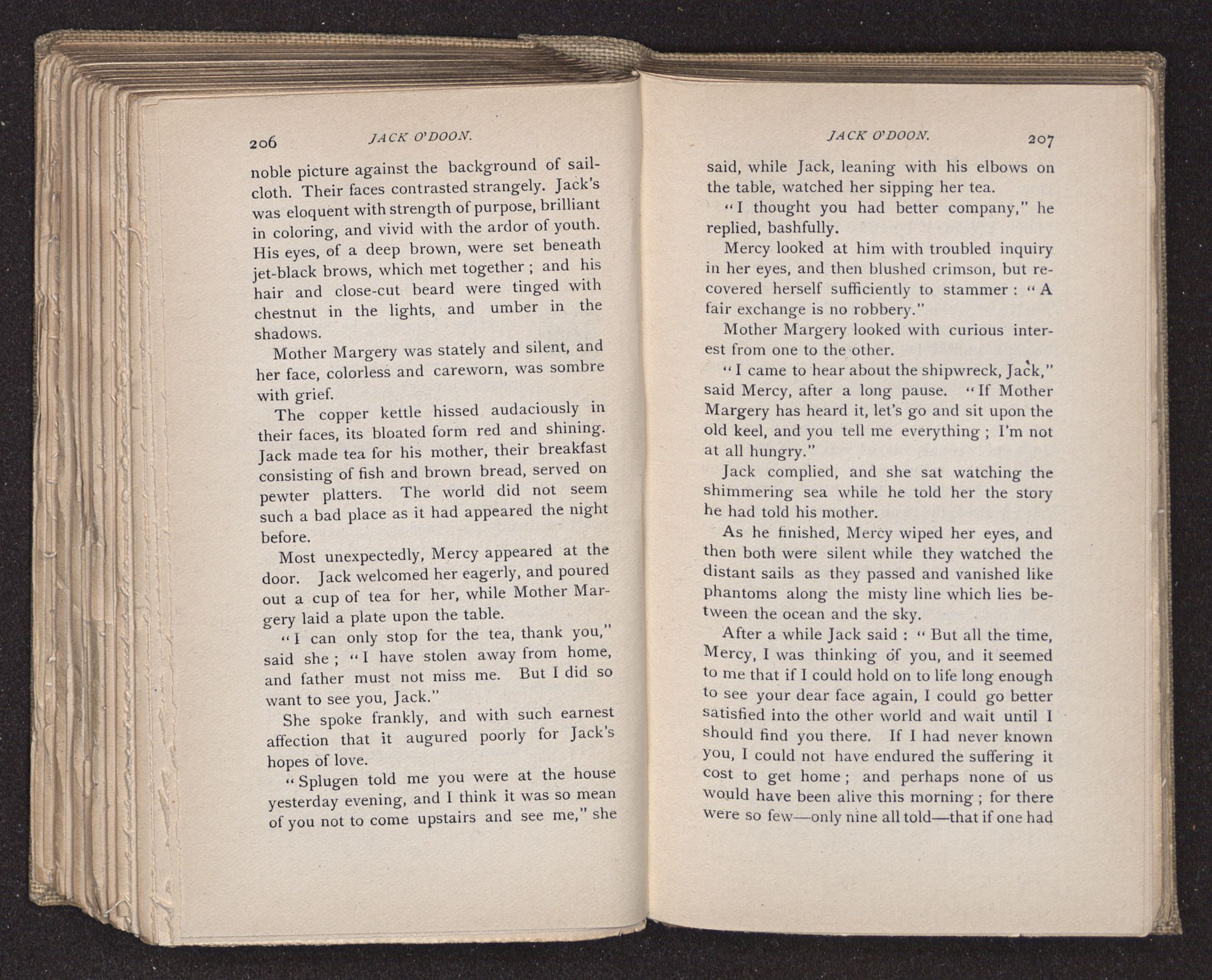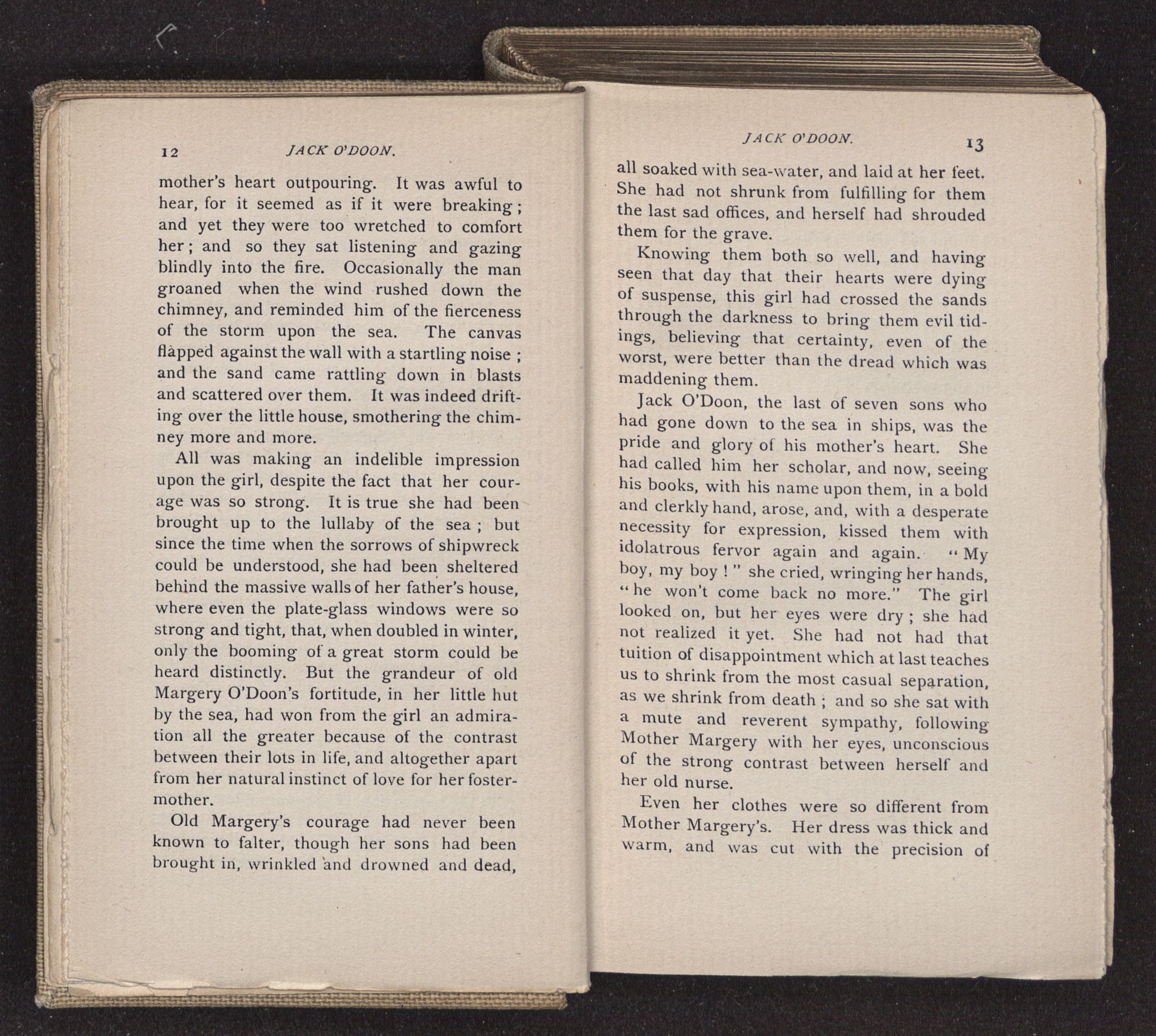 Jack O'Doon, the last of seven sons who had gone down to the sea in ships, was the pride and glory of his mother's heart. She had called him her scholar, and now, seeing his books, with his name upon them, in a bold and clerkly hand, arose, and, with a desperate necessity for expression, kissed them with idolatrous fervor again and again. “My boy, my boy!” she cried, wringing her hands, “he won't come back no more.” The girl looked on, but her eyes were dry; she had not realized it yet. She had not had that tuition of disappointment which at last teaches us to shrink from the most casual separation, as we shrink from death; and so she sat with a mute and reverent sympathy, following Mother Margery with her eyes, unconscious of the strong contrast between herself and her old nurse.