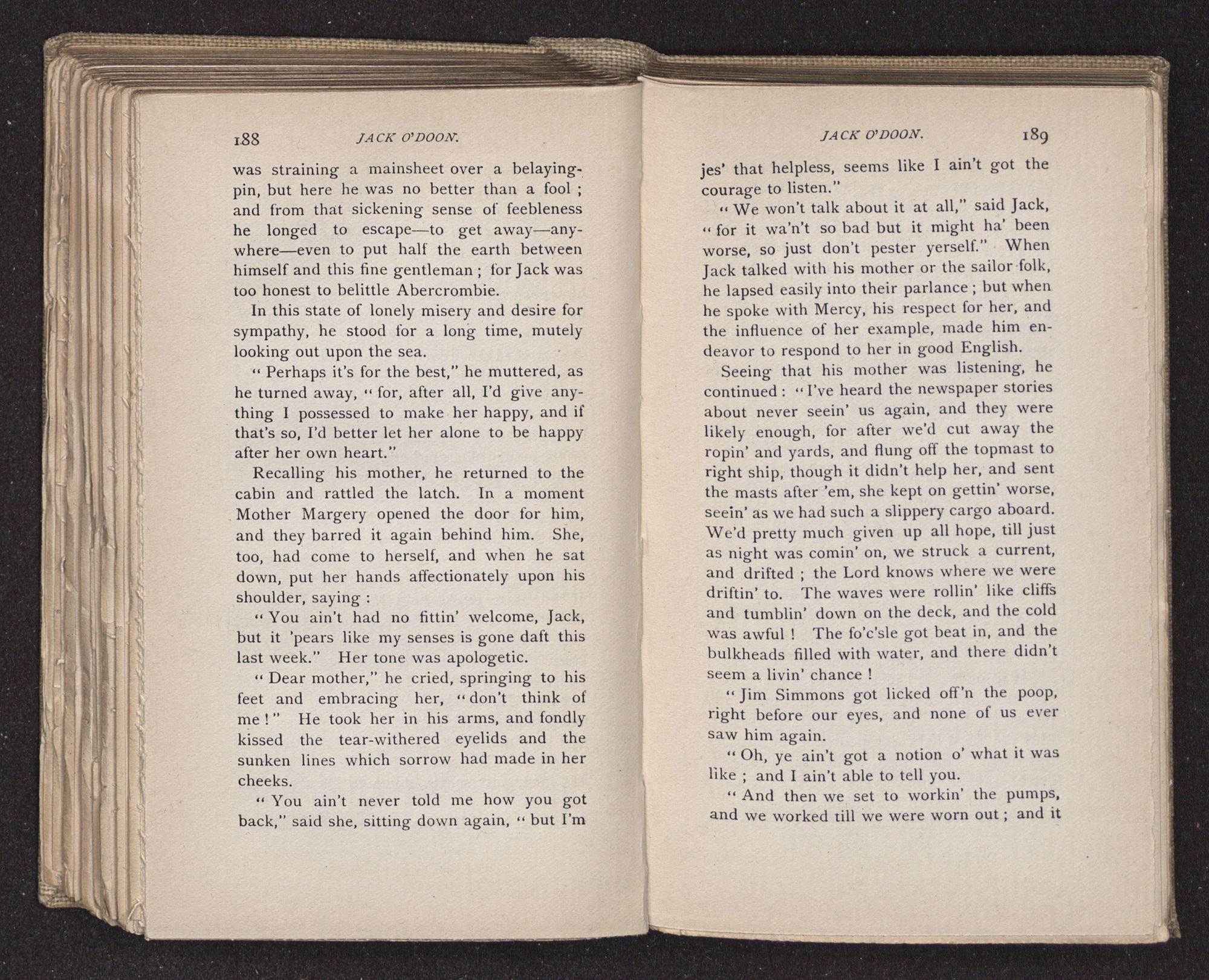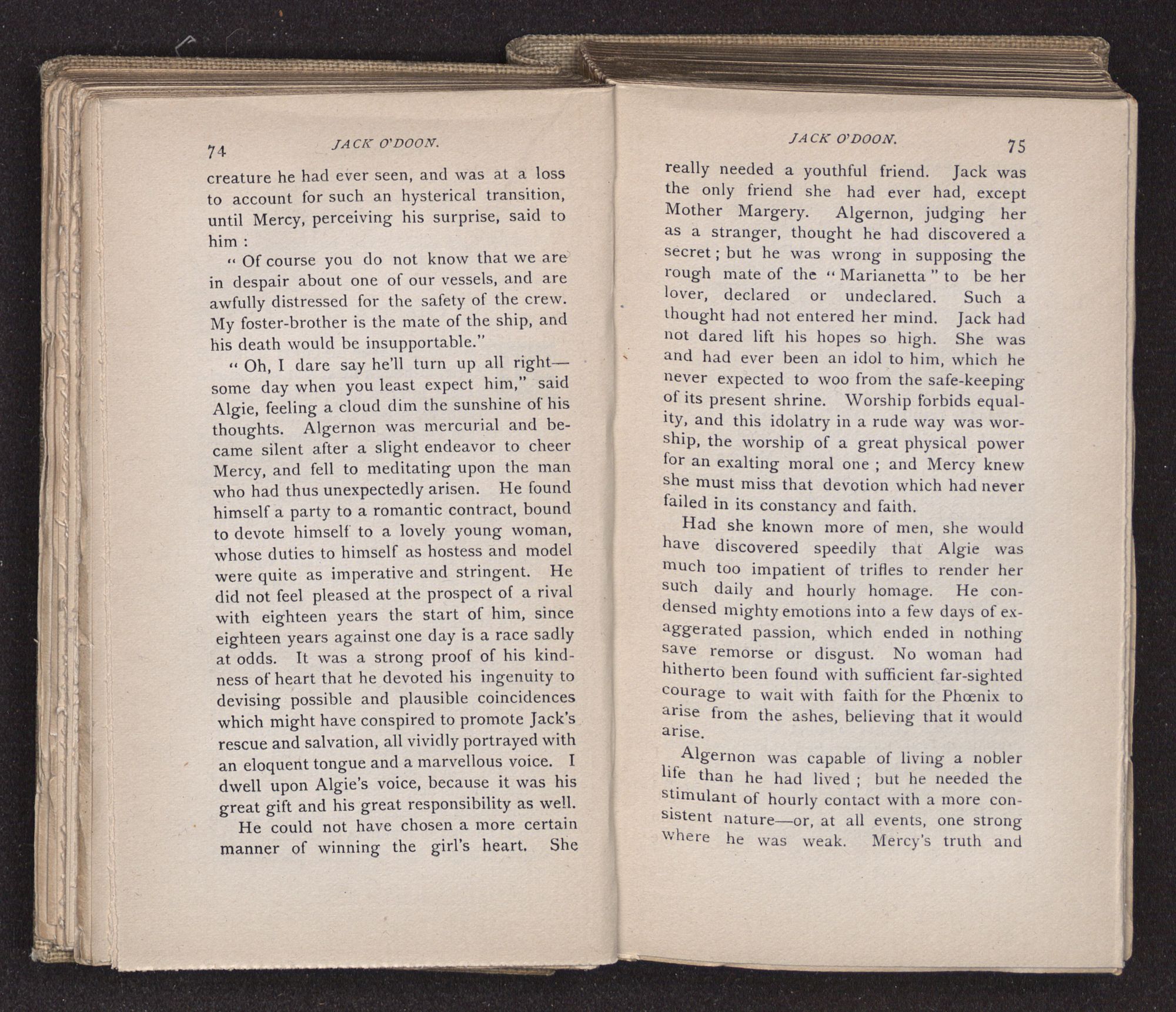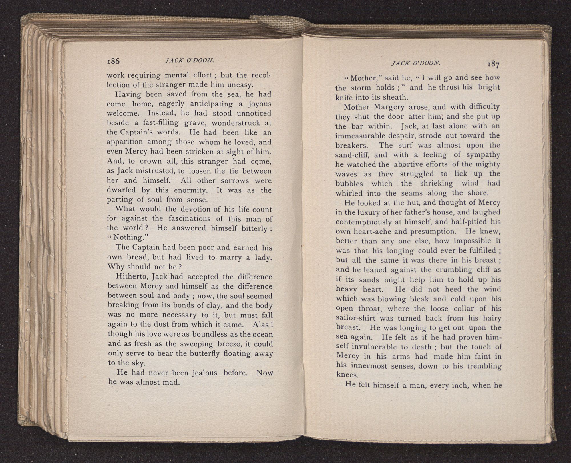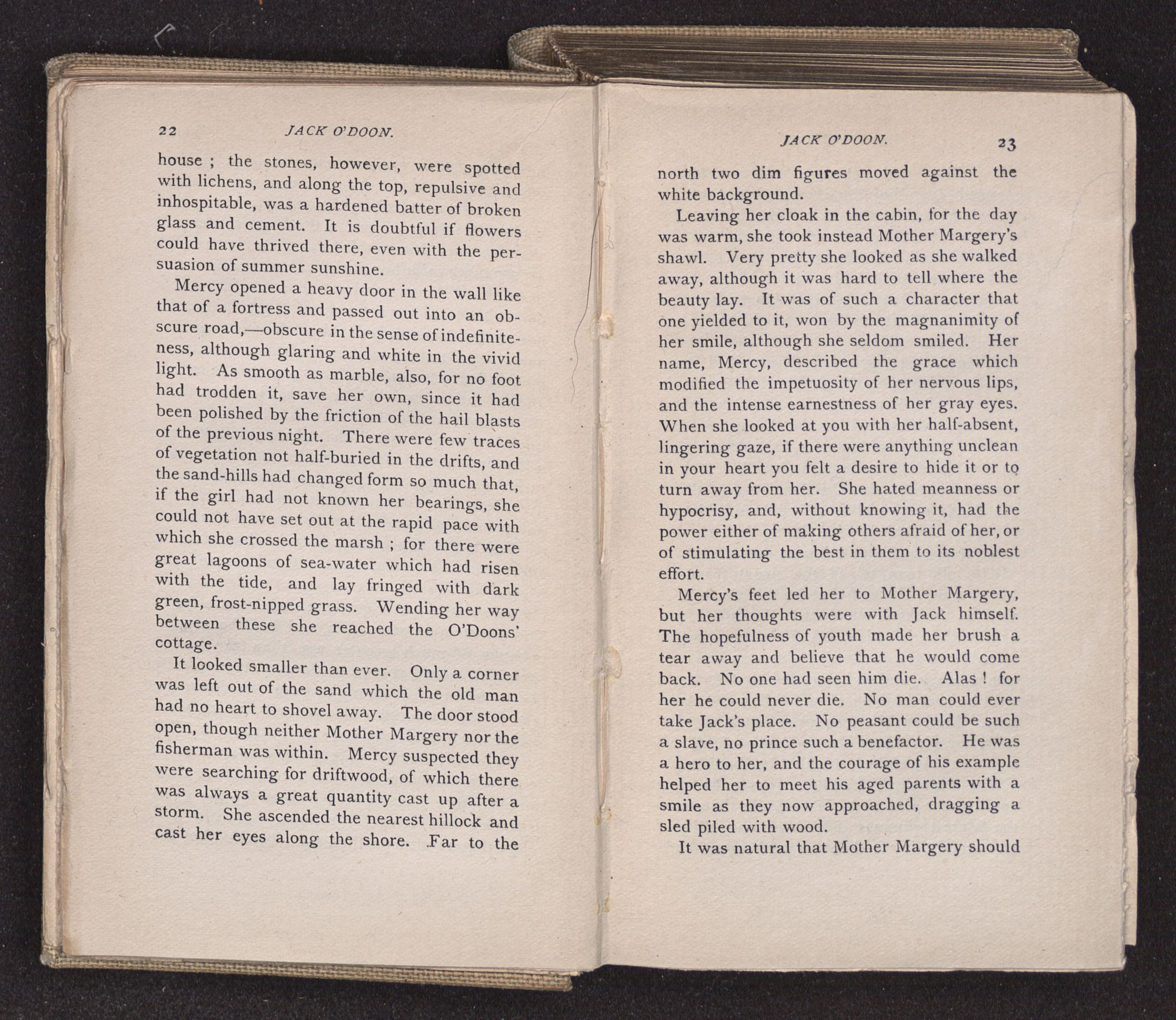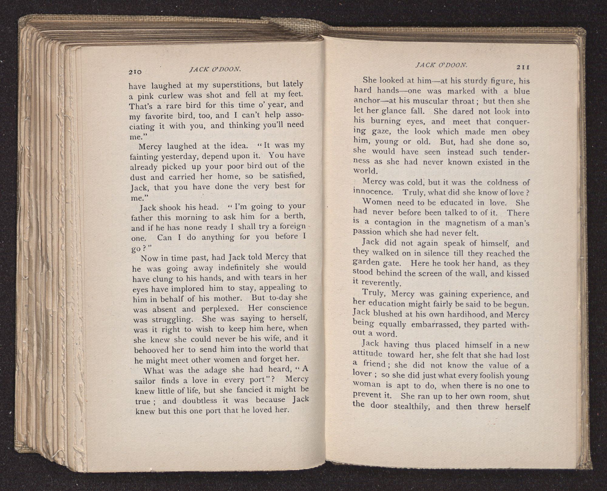 Jack O'Doon, the last of seven sons who had gone down to the sea in ships, was the pride and glory of his mother's heart. She had called him her scholar, and now, seeing his books, with his name upon them, in a bold and clerkly hand, arose, and, with a desperate necessity for expression, kissed them with idolatrous fervor again and again. “My boy, my boy!” she cried, wringing her hands, “he won't come back no more.” The girl looked on, but her eyes were dry; she had not realized it yet. She had not had that tuition of disappointment which at last teaches us to shrink from the most casual separation, as we shrink from death; and so she sat with a mute and reverent sympathy, following Mother Margery with her eyes, unconscious of the strong contrast between herself and her old nurse.