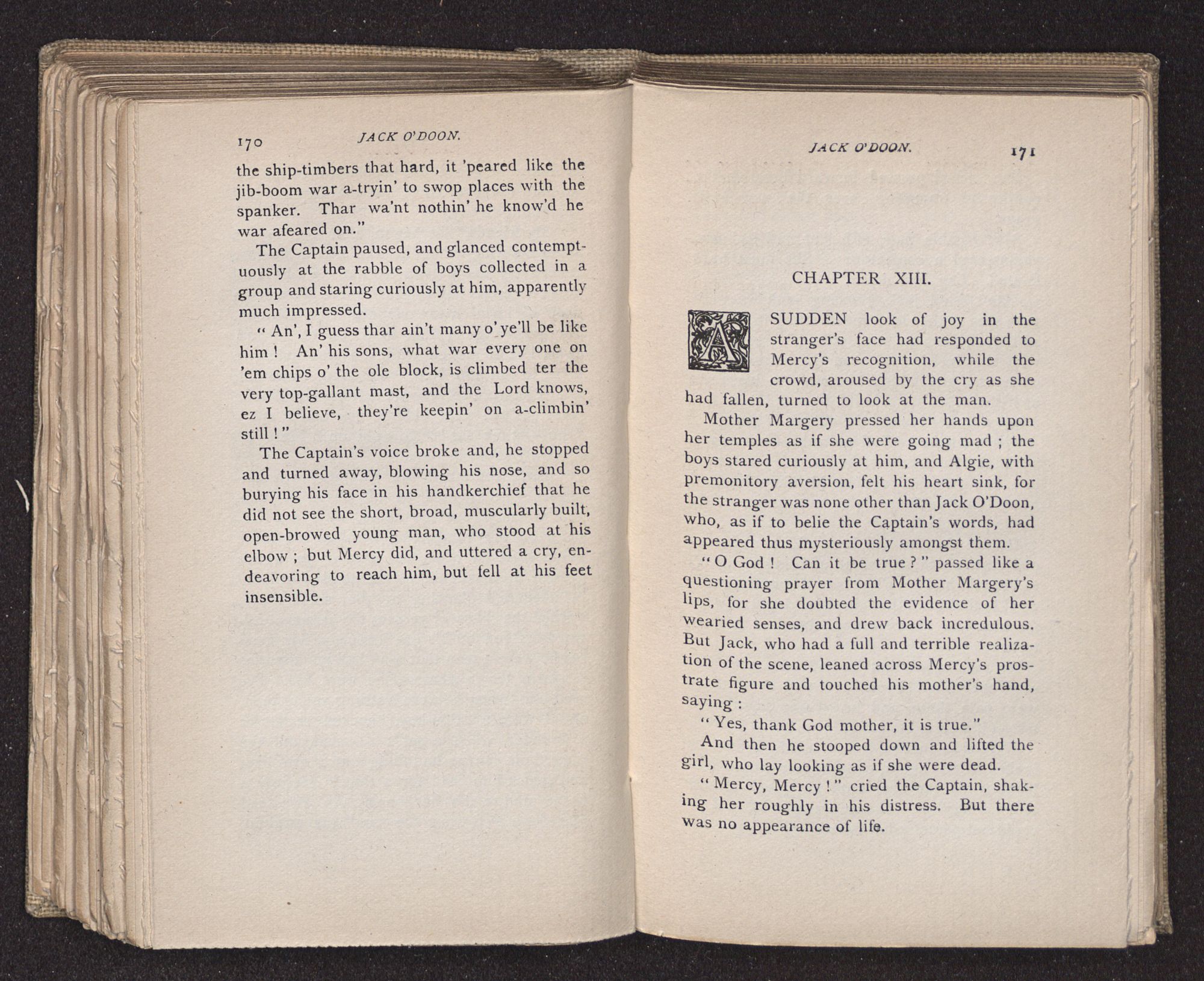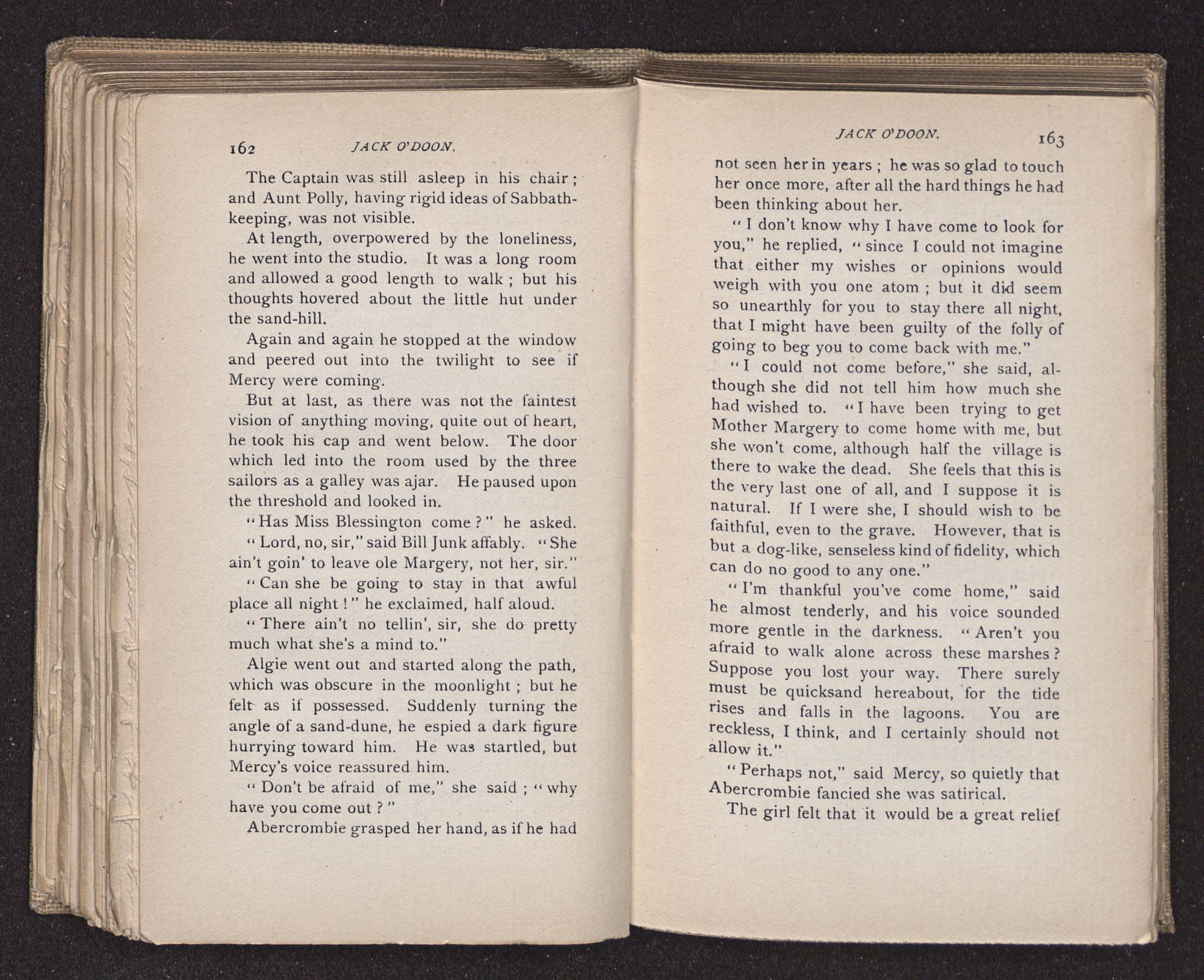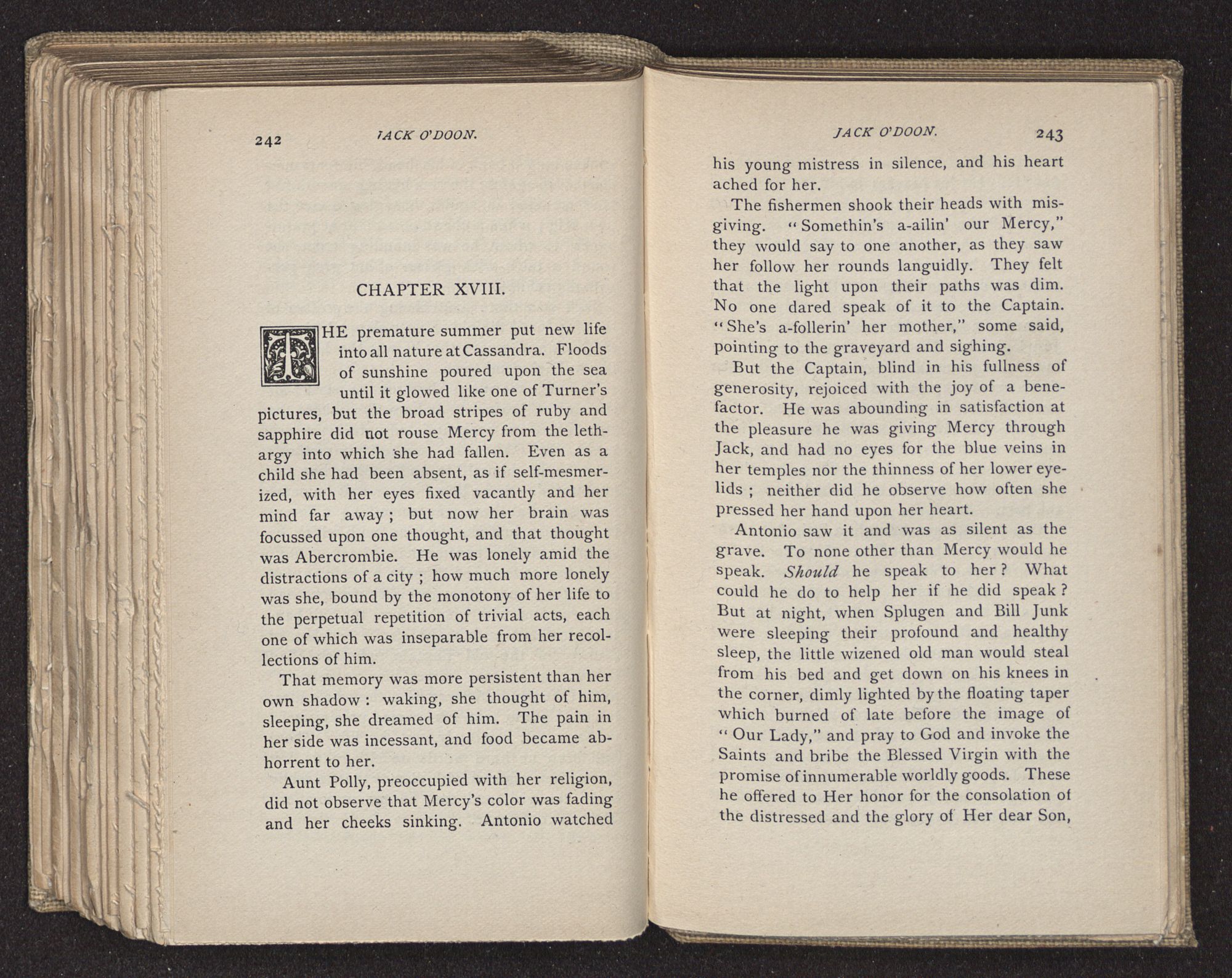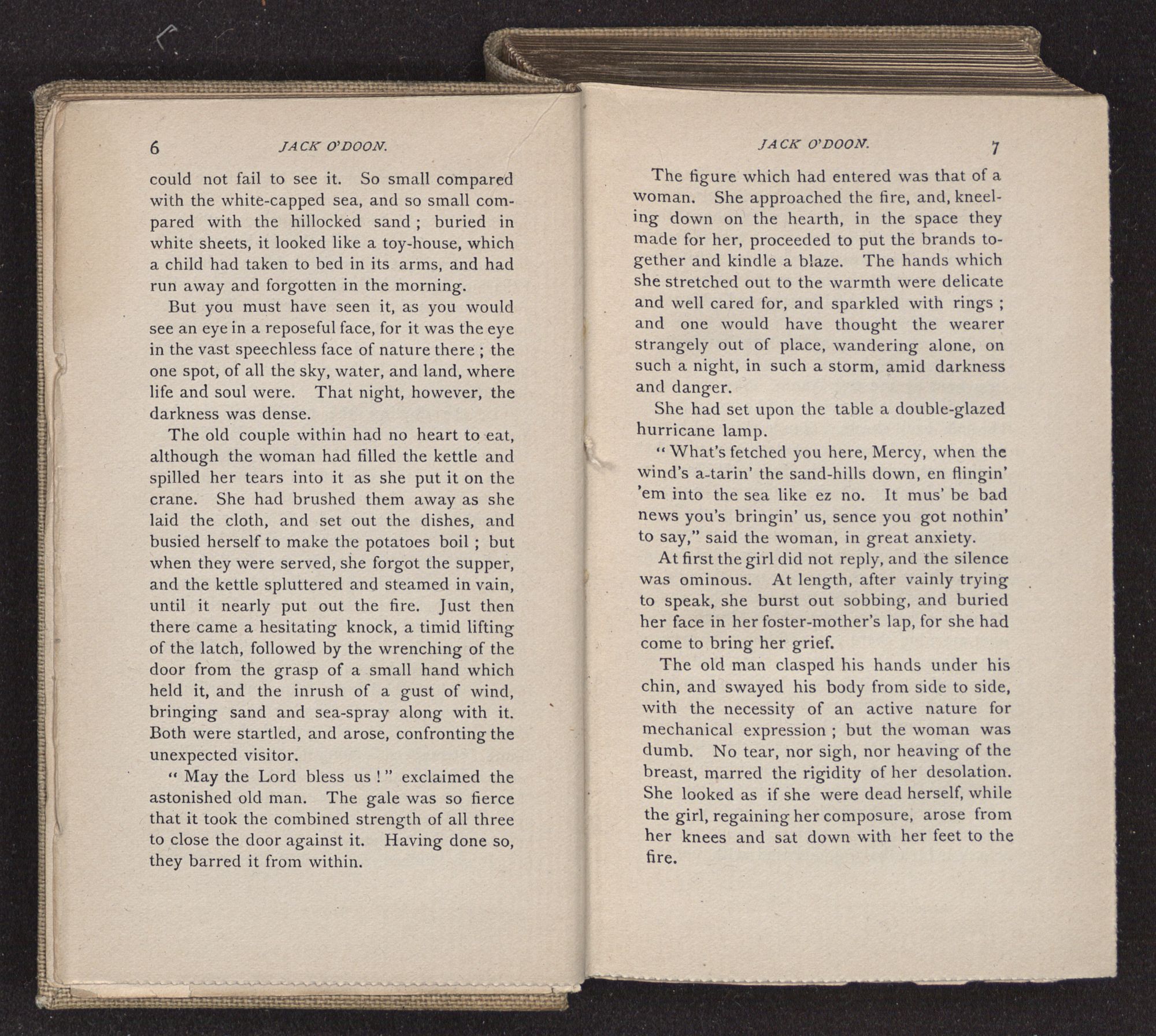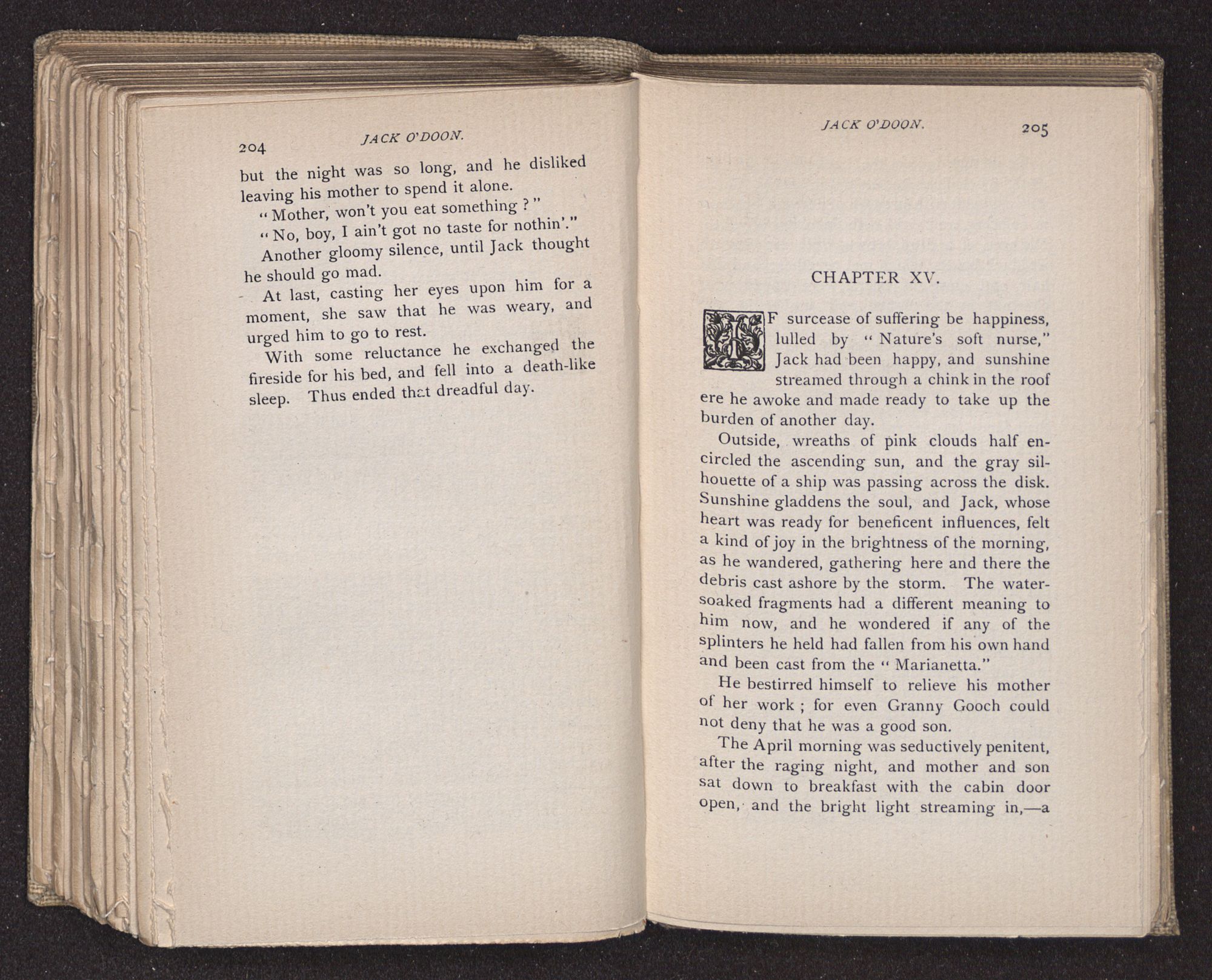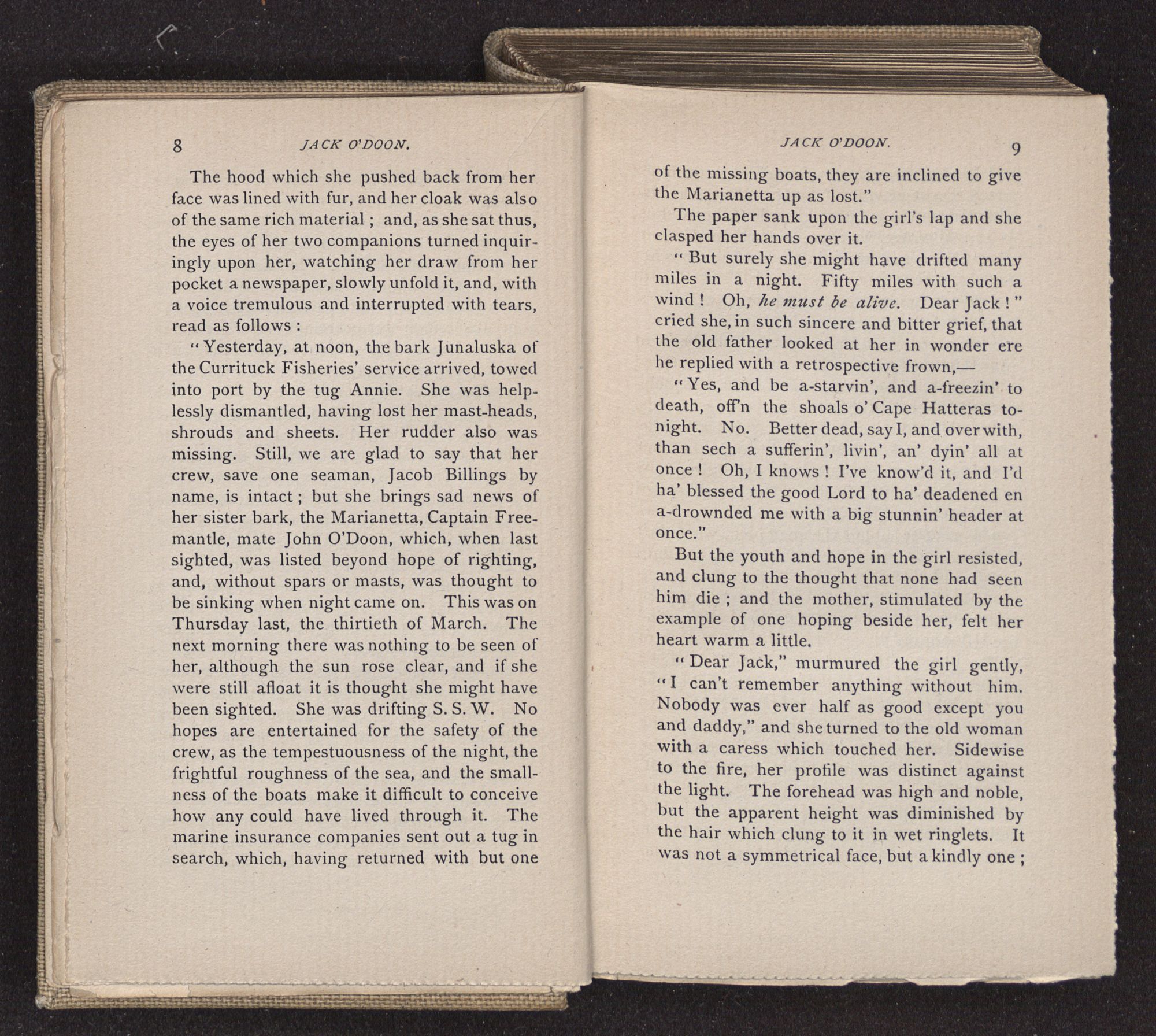 Jack O'Doon, the last of seven sons who had gone down to the sea in ships, was the pride and glory of his mother's heart. She had called him her scholar, and now, seeing his books, with his name upon them, in a bold and clerkly hand, arose, and, with a desperate necessity for expression, kissed them with idolatrous fervor again and again. “My boy, my boy!” she cried, wringing her hands, “he won't come back no more.” The girl looked on, but her eyes were dry; she had not realized it yet. She had not had that tuition of disappointment which at last teaches us to shrink from the most casual separation, as we shrink from death; and so she sat with a mute and reverent sympathy, following Mother Margery with her eyes, unconscious of the strong contrast between herself and her old nurse.