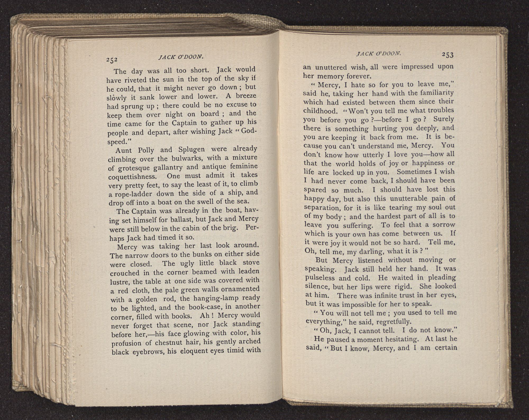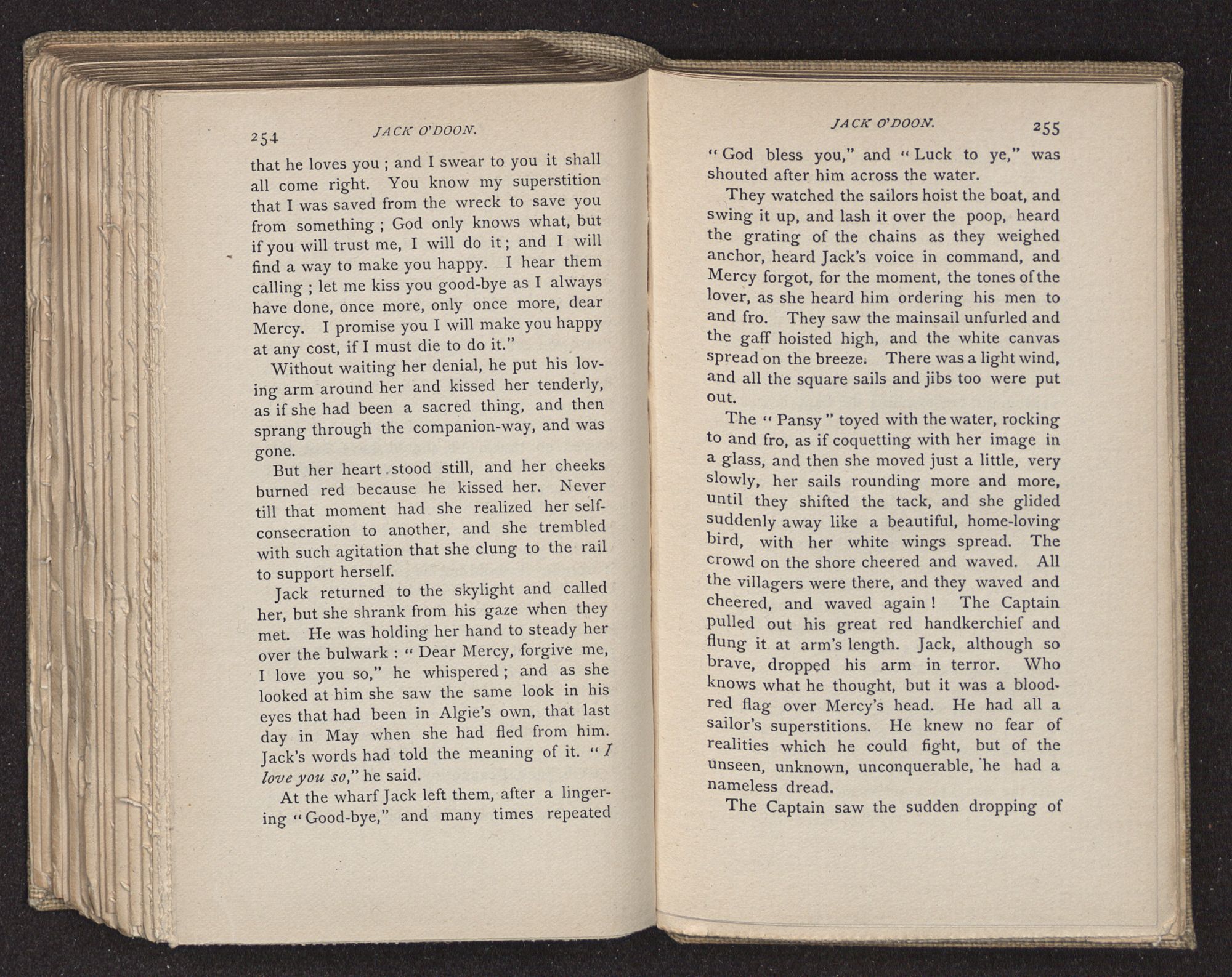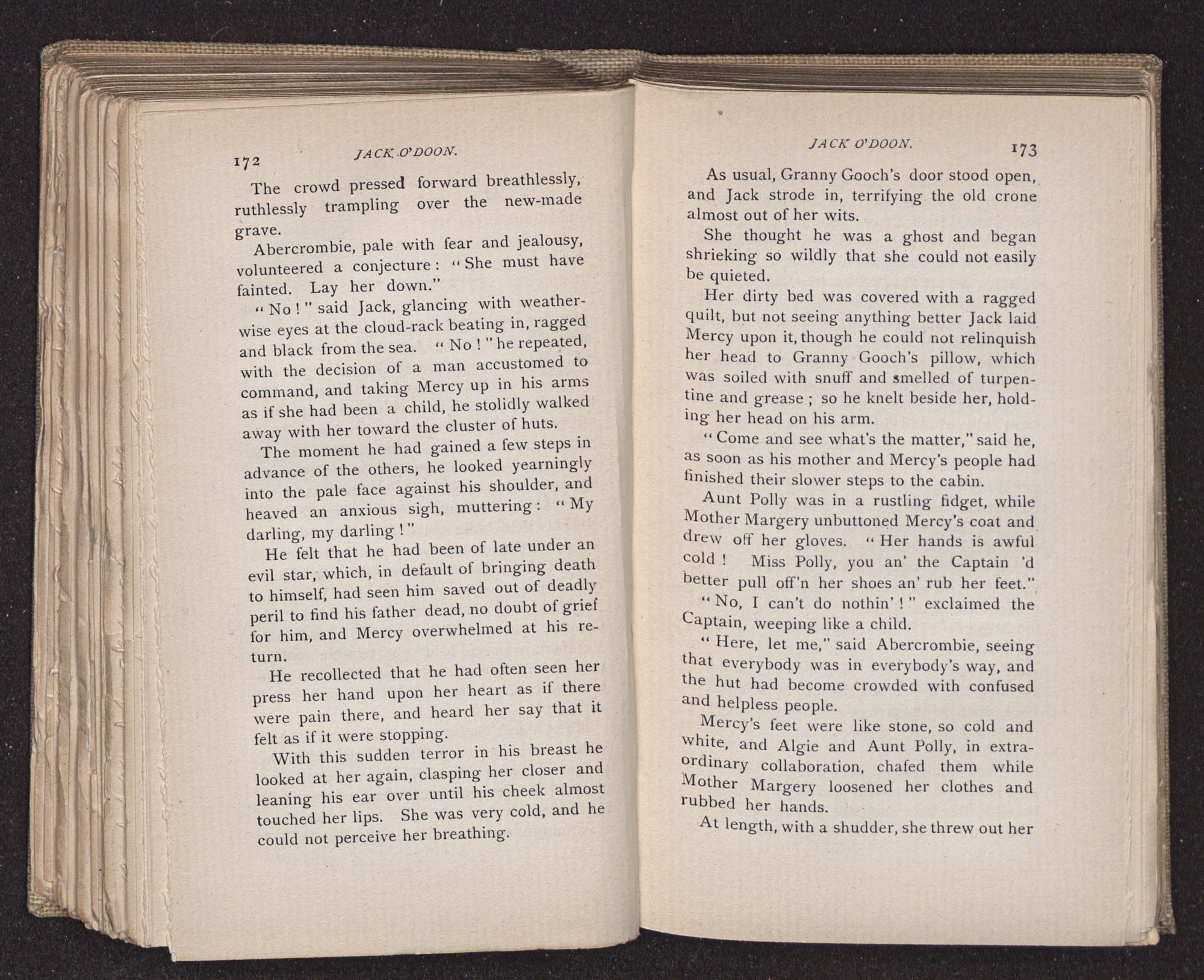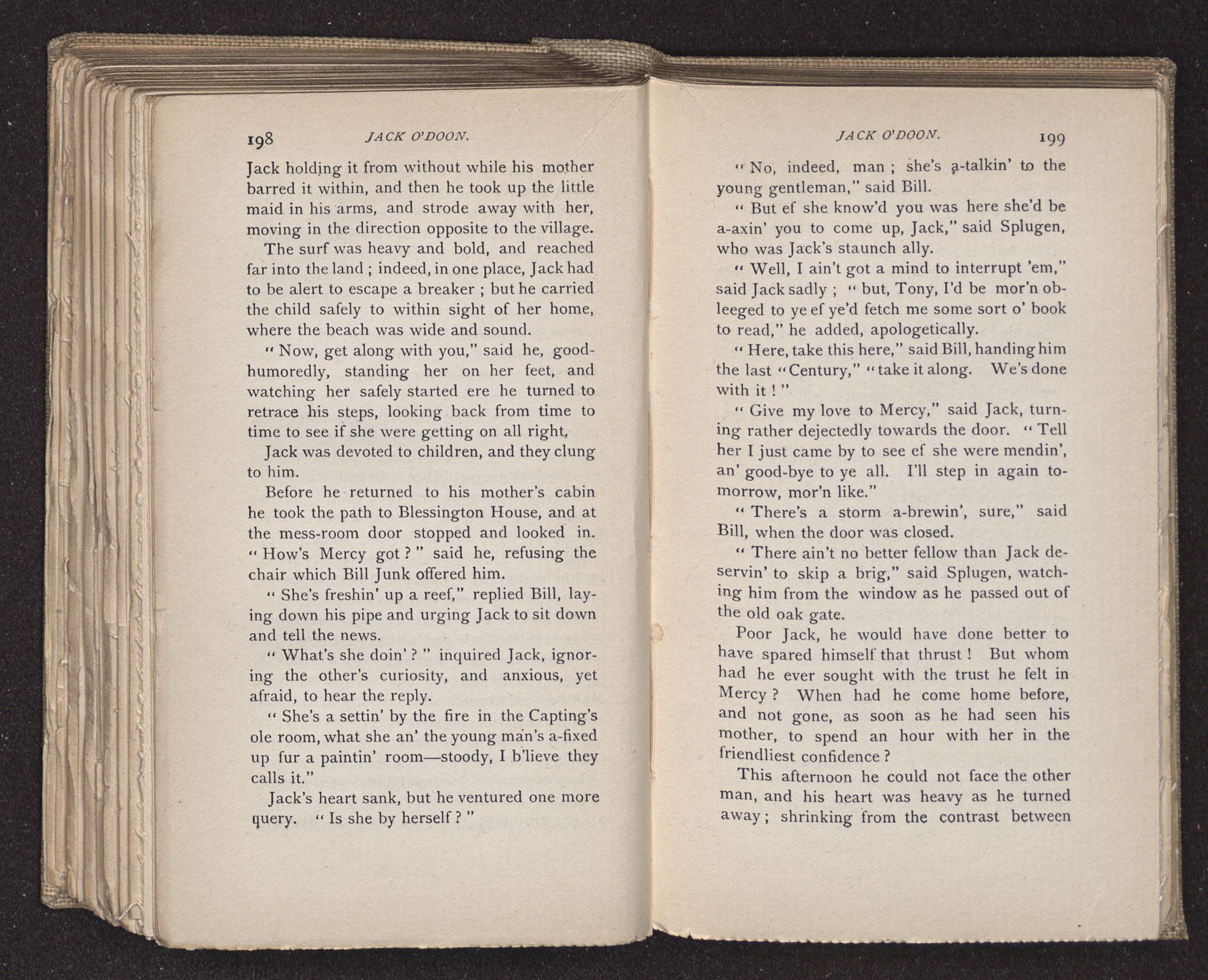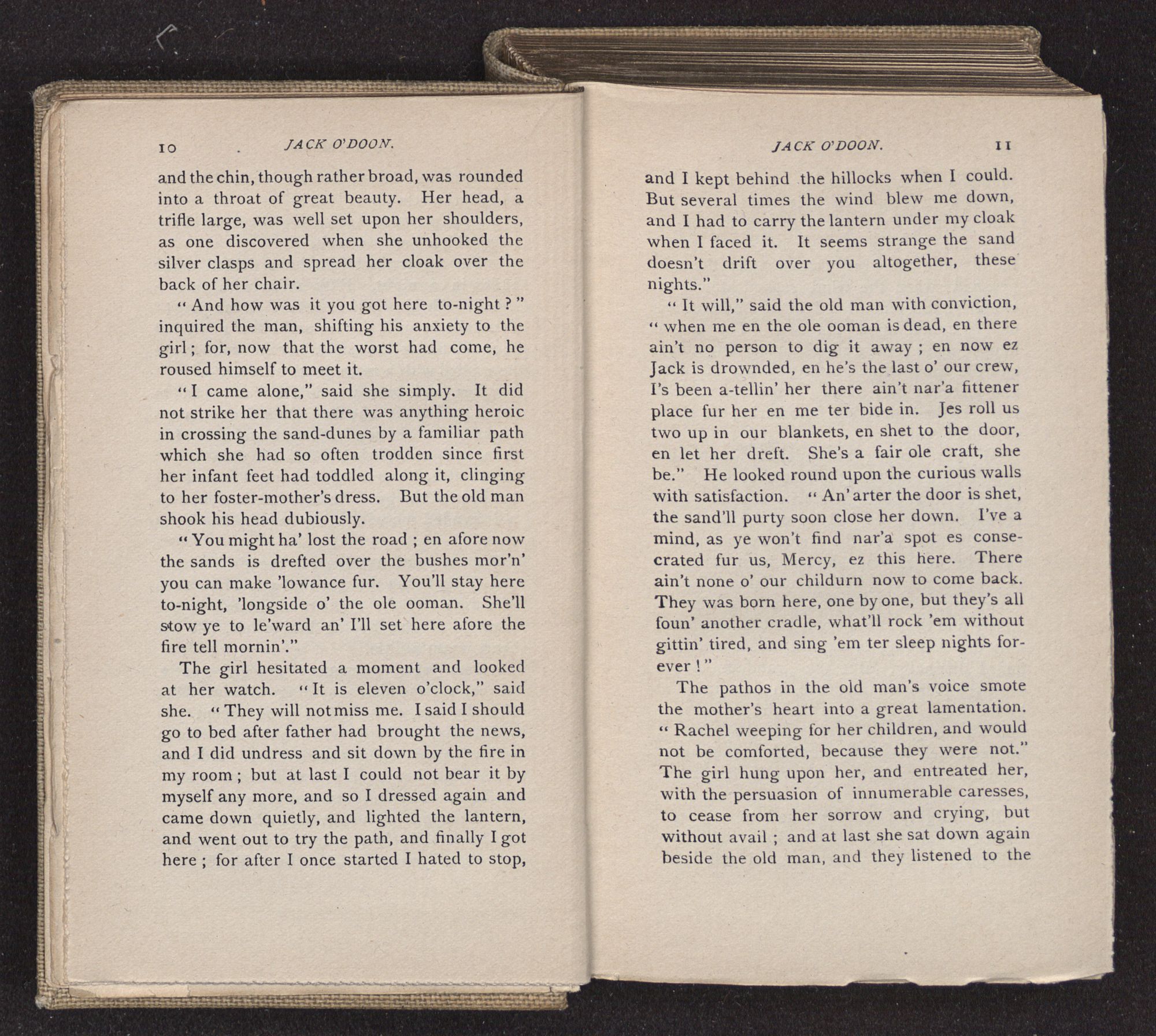 Jack O'Doon, the last of seven sons who had gone down to the sea in ships, was the pride and glory of his mother's heart. She had called him her scholar, and now, seeing his books, with his name upon them, in a bold and clerkly hand, arose, and, with a desperate necessity for expression, kissed them with idolatrous fervor again and again. “My boy, my boy!” she cried, wringing her hands, “he won't come back no more.” The girl looked on, but her eyes were dry; she had not realized it yet. She had not had that tuition of disappointment which at last teaches us to shrink from the most casual separation, as we shrink from death; and so she sat with a mute and reverent sympathy, following Mother Margery with her eyes, unconscious of the strong contrast between herself and her old nurse.
