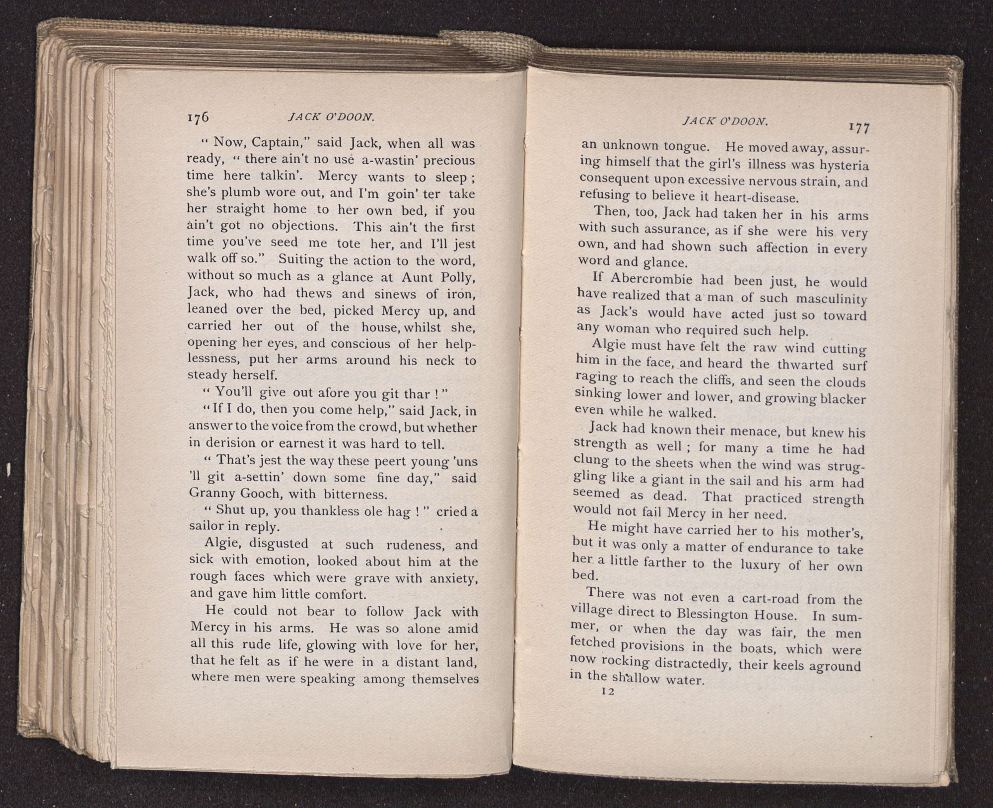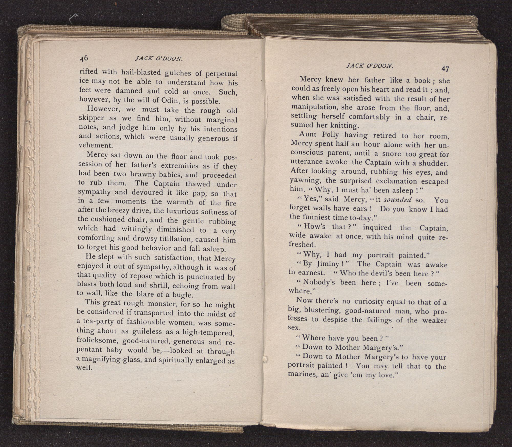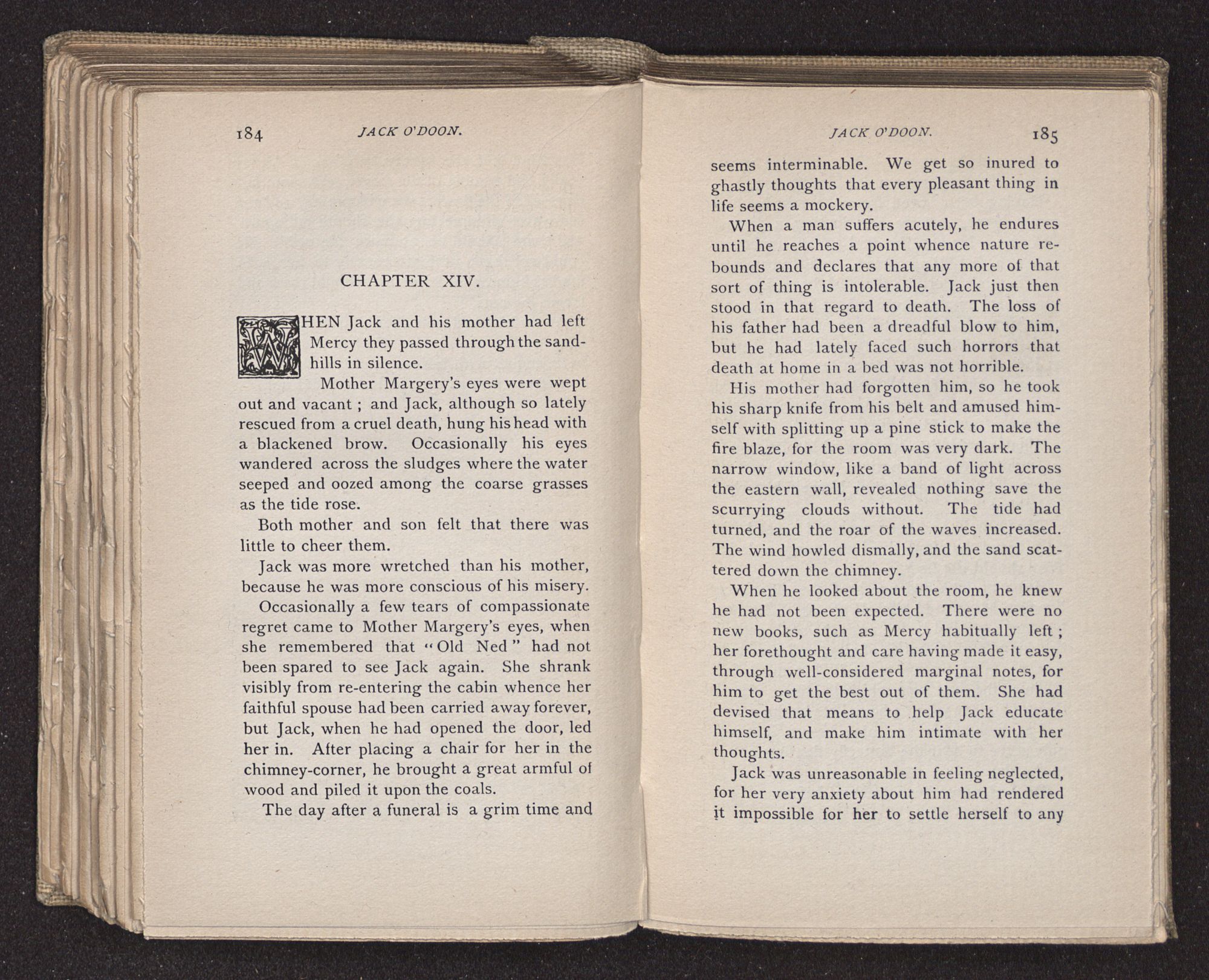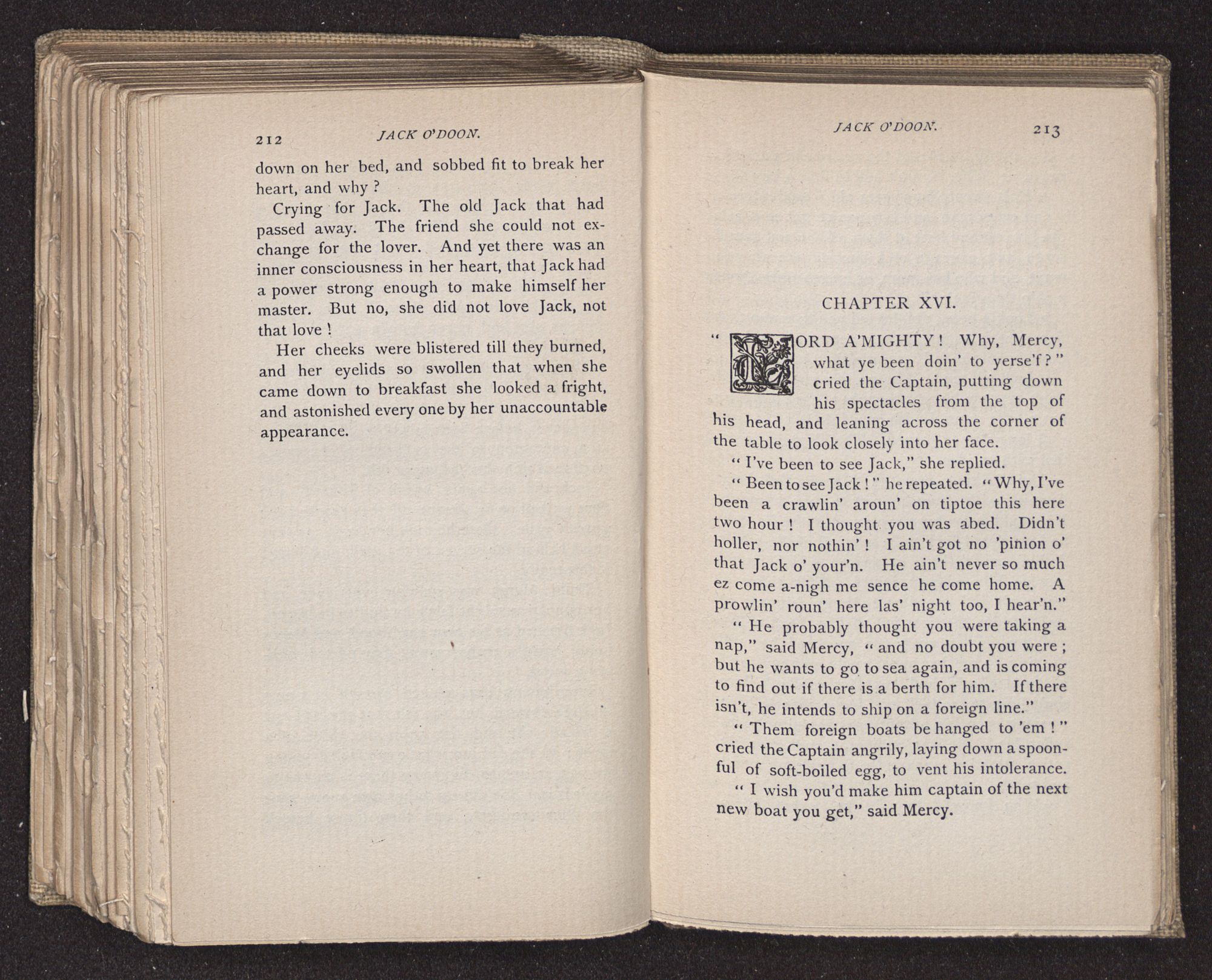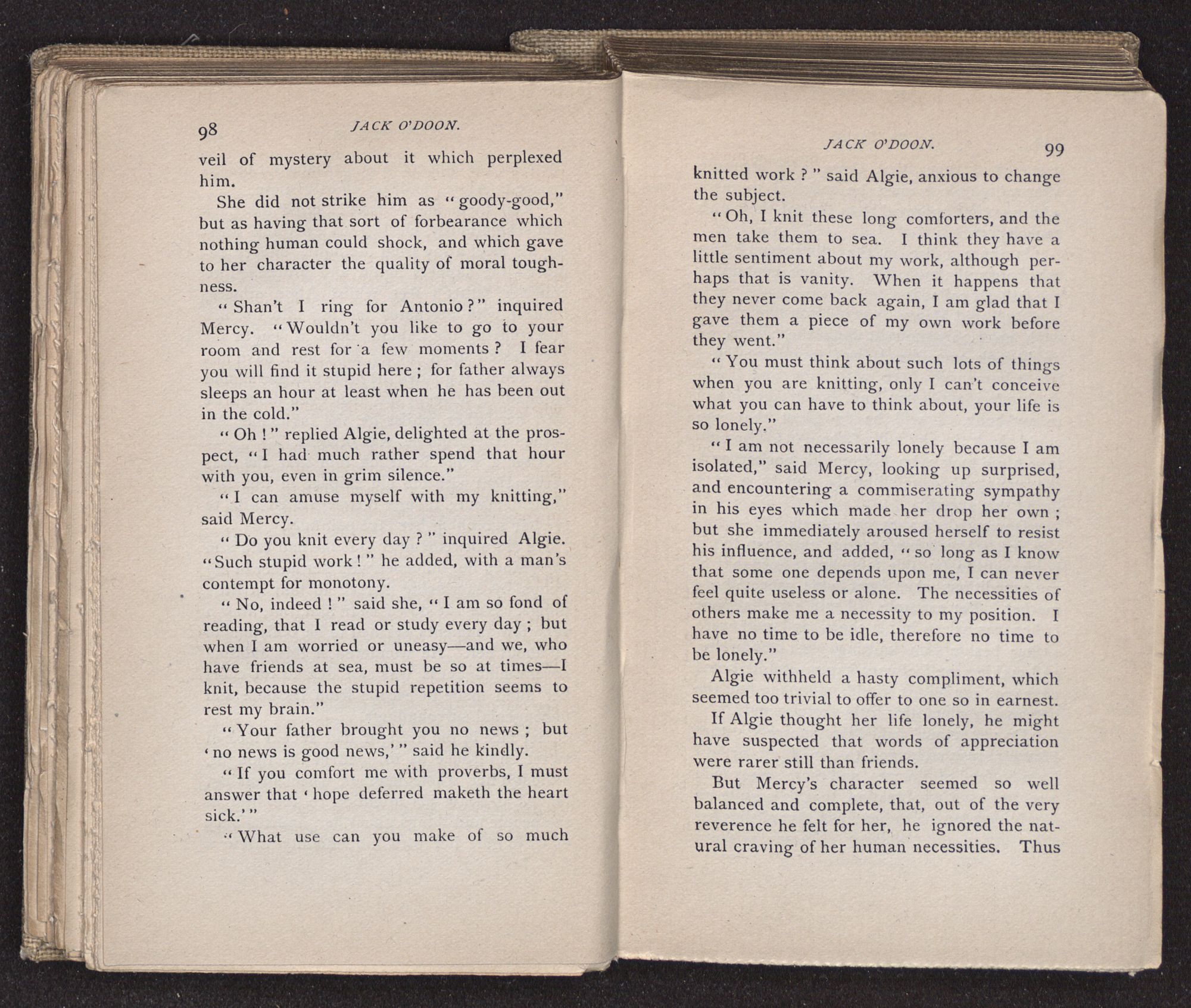 Jack O'Doon, the last of seven sons who had gone down to the sea in ships, was the pride and glory of his mother's heart. She had called him her scholar, and now, seeing his books, with his name upon them, in a bold and clerkly hand, arose, and, with a desperate necessity for expression, kissed them with idolatrous fervor again and again. “My boy, my boy!” she cried, wringing her hands, “he won't come back no more.” The girl looked on, but her eyes were dry; she had not realized it yet. She had not had that tuition of disappointment which at last teaches us to shrink from the most casual separation, as we shrink from death; and so she sat with a mute and reverent sympathy, following Mother Margery with her eyes, unconscious of the strong contrast between herself and her old nurse.