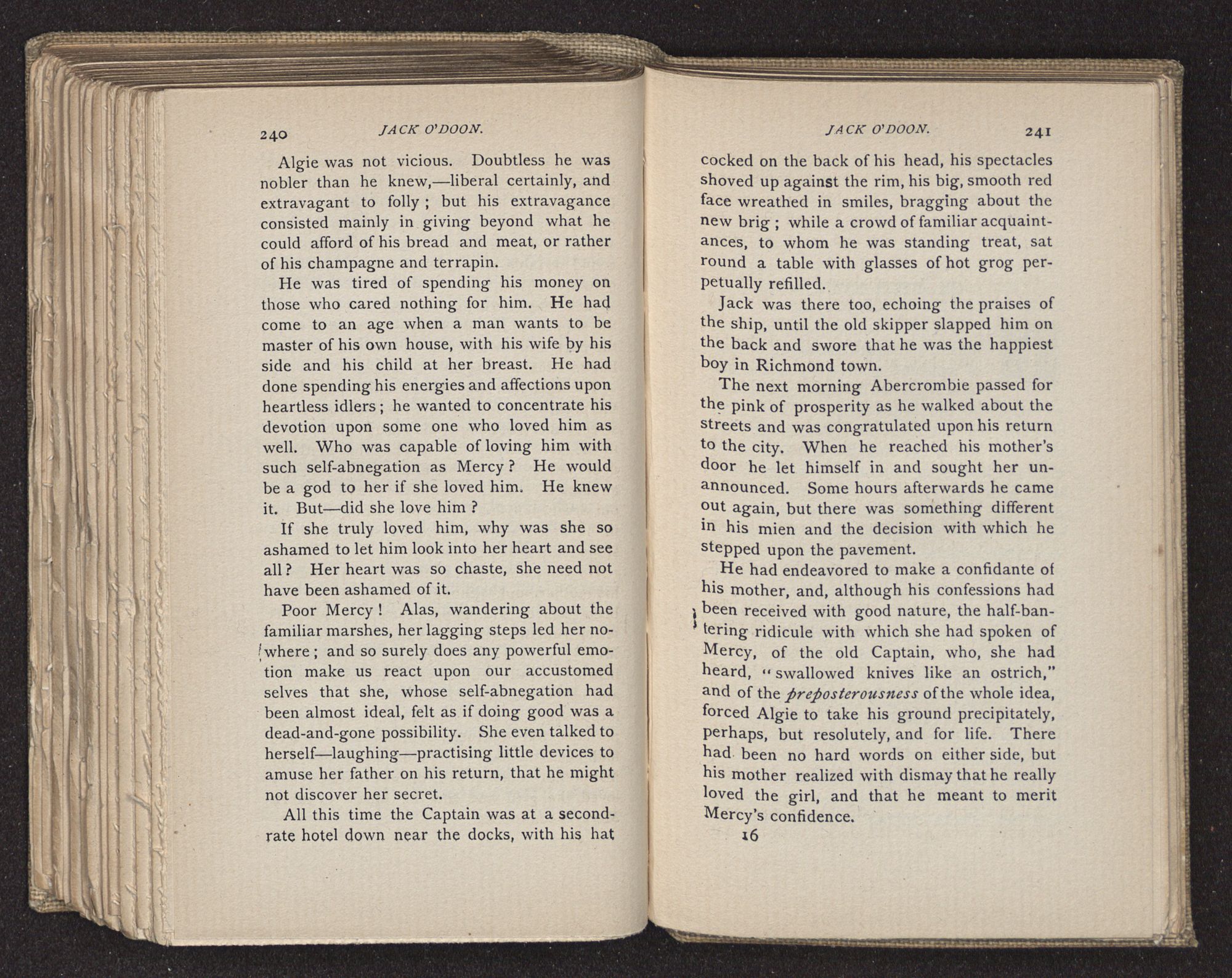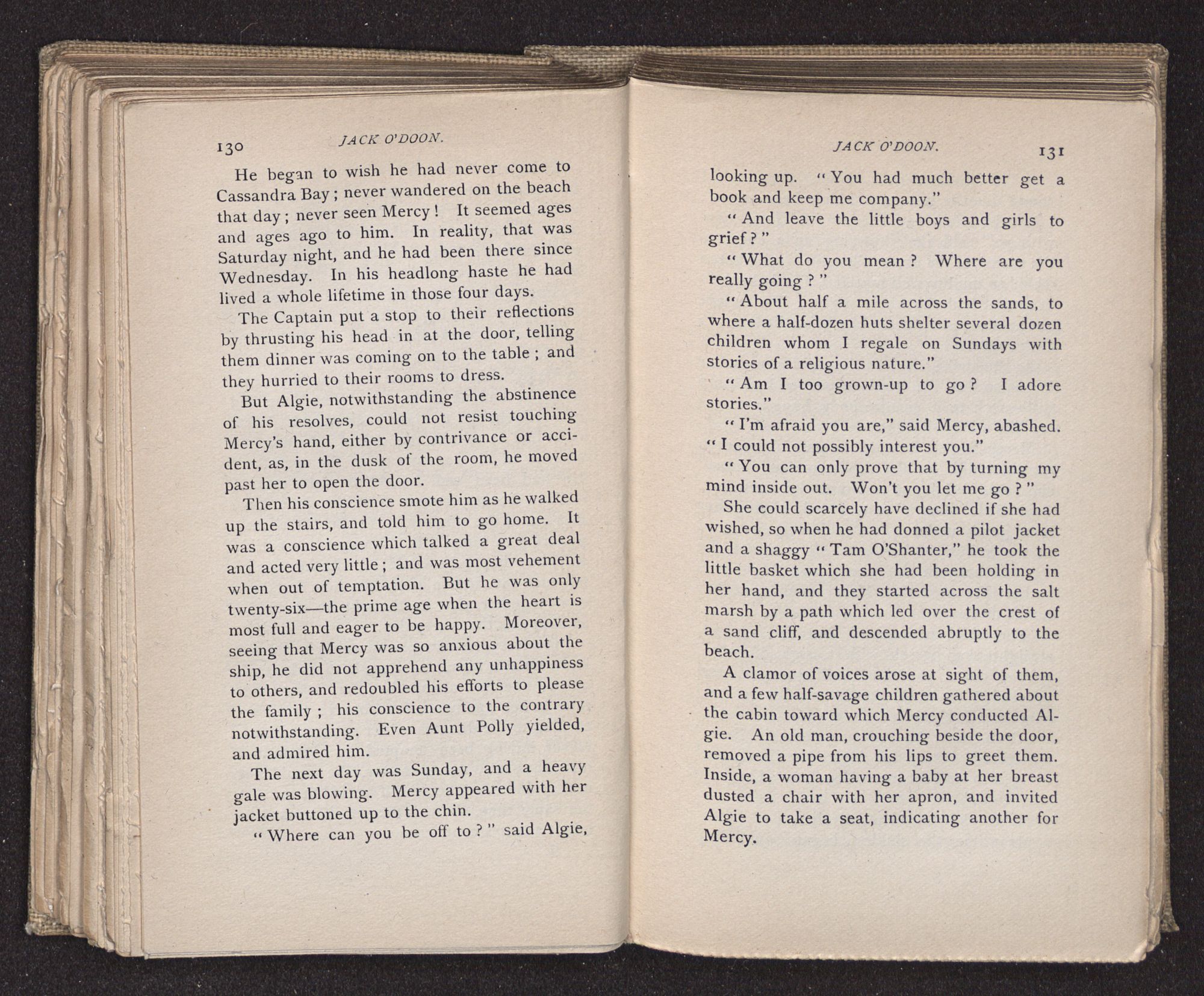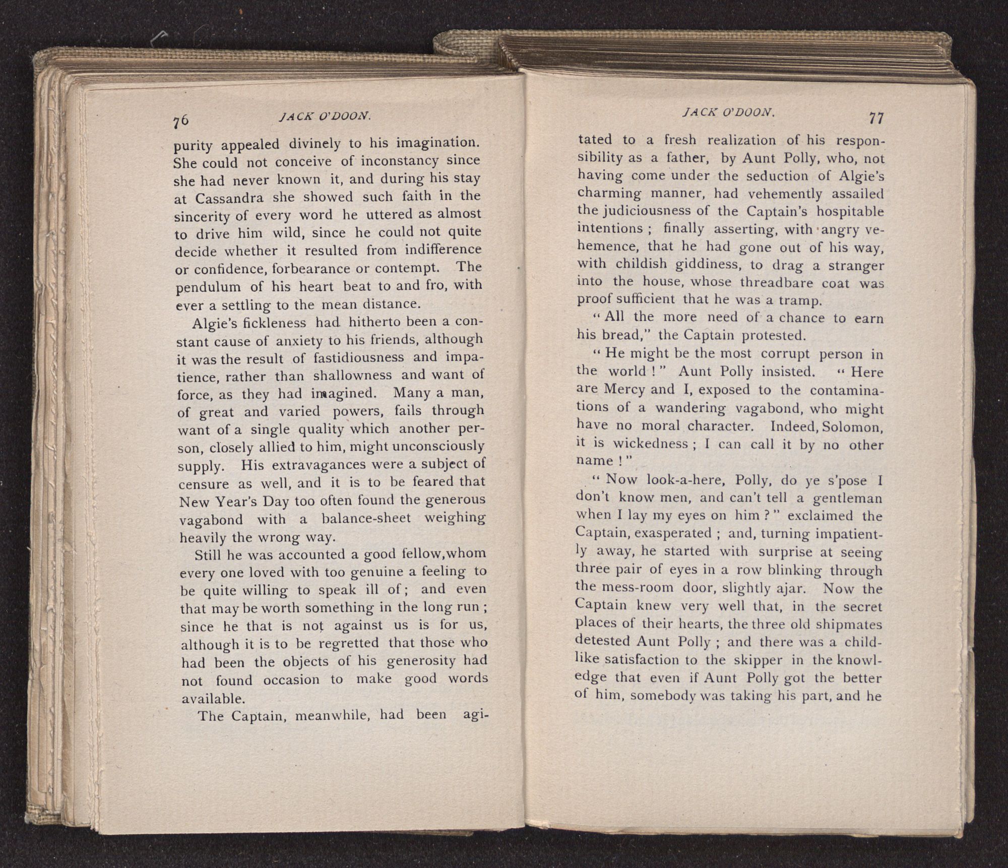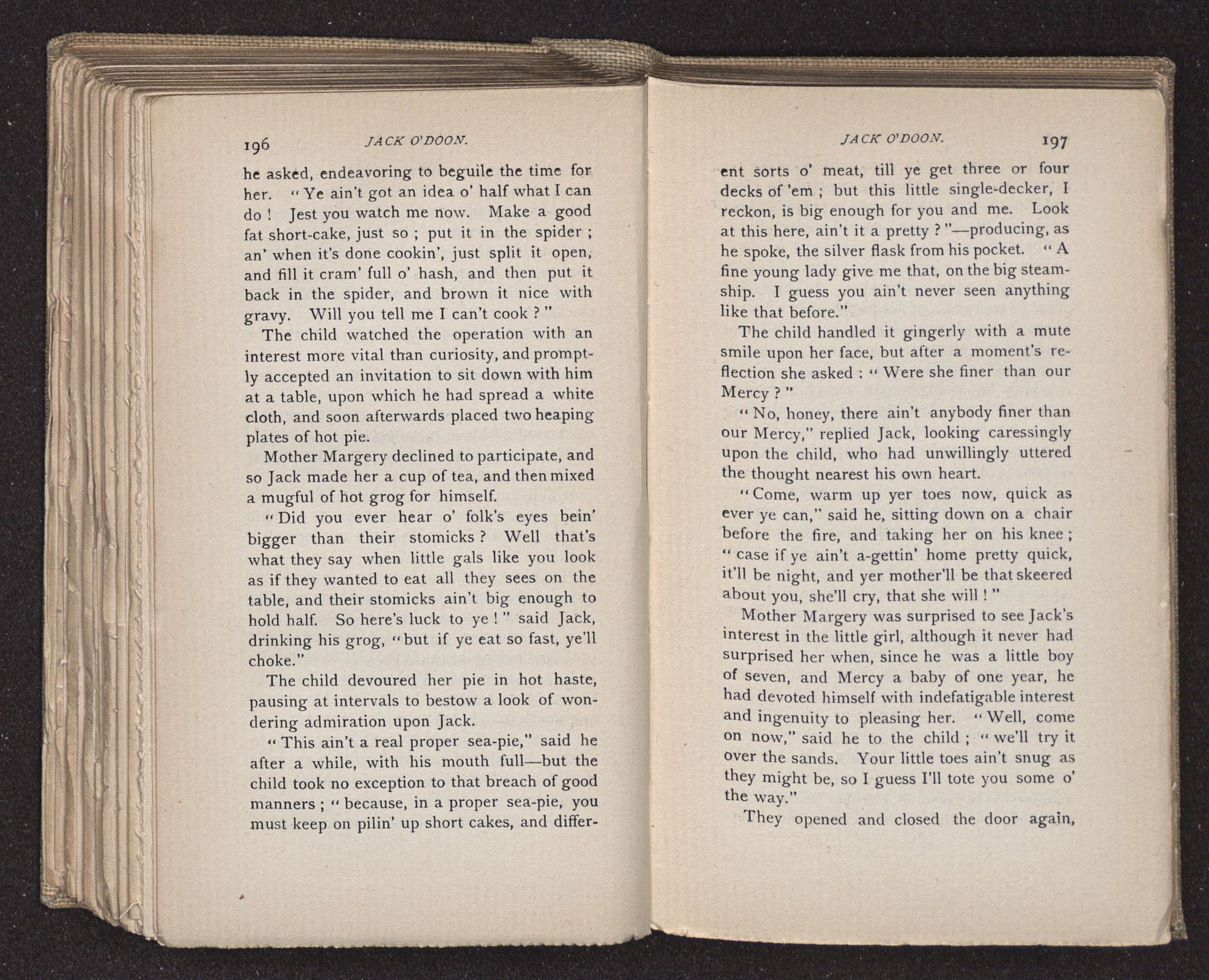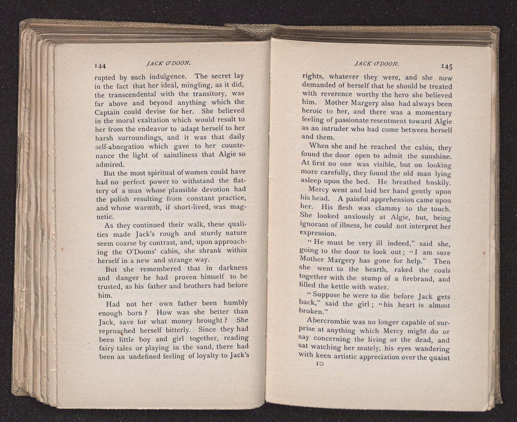 Jack O'Doon, the last of seven sons who had gone down to the sea in ships, was the pride and glory of his mother's heart. She had called him her scholar, and now, seeing his books, with his name upon them, in a bold and clerkly hand, arose, and, with a desperate necessity for expression, kissed them with idolatrous fervor again and again. “My boy, my boy!” she cried, wringing her hands, “he won't come back no more.” The girl looked on, but her eyes were dry; she had not realized it yet. She had not had that tuition of disappointment which at last teaches us to shrink from the most casual separation, as we shrink from death; and so she sat with a mute and reverent sympathy, following Mother Margery with her eyes, unconscious of the strong contrast between herself and her old nurse.
