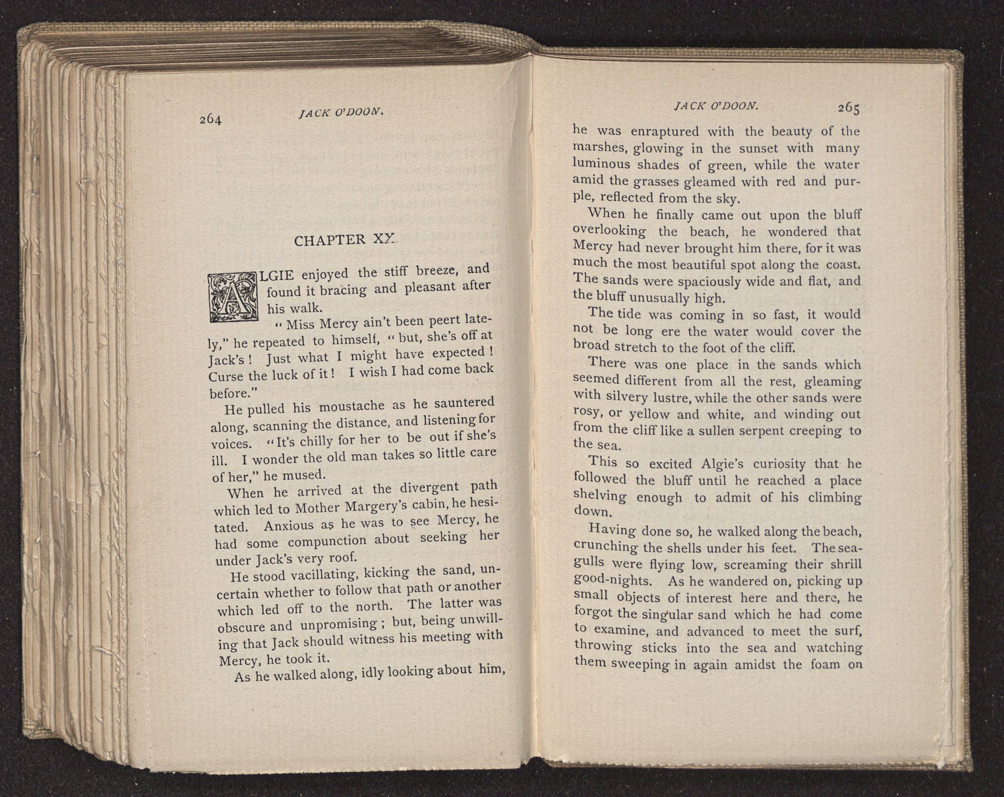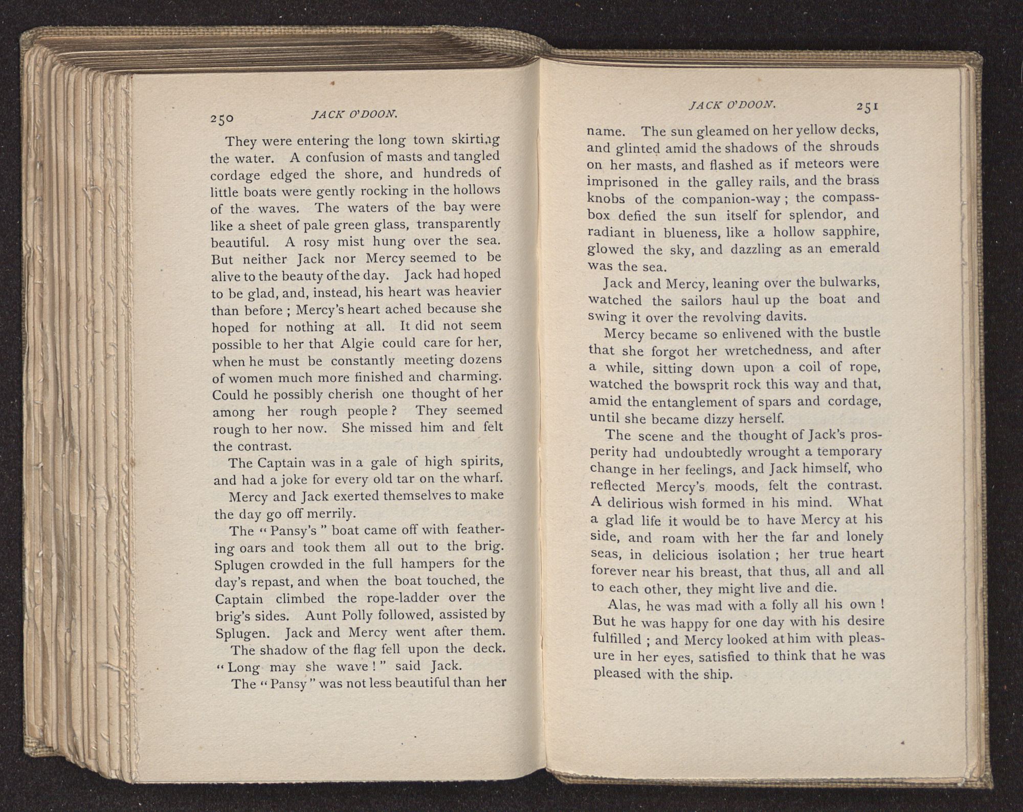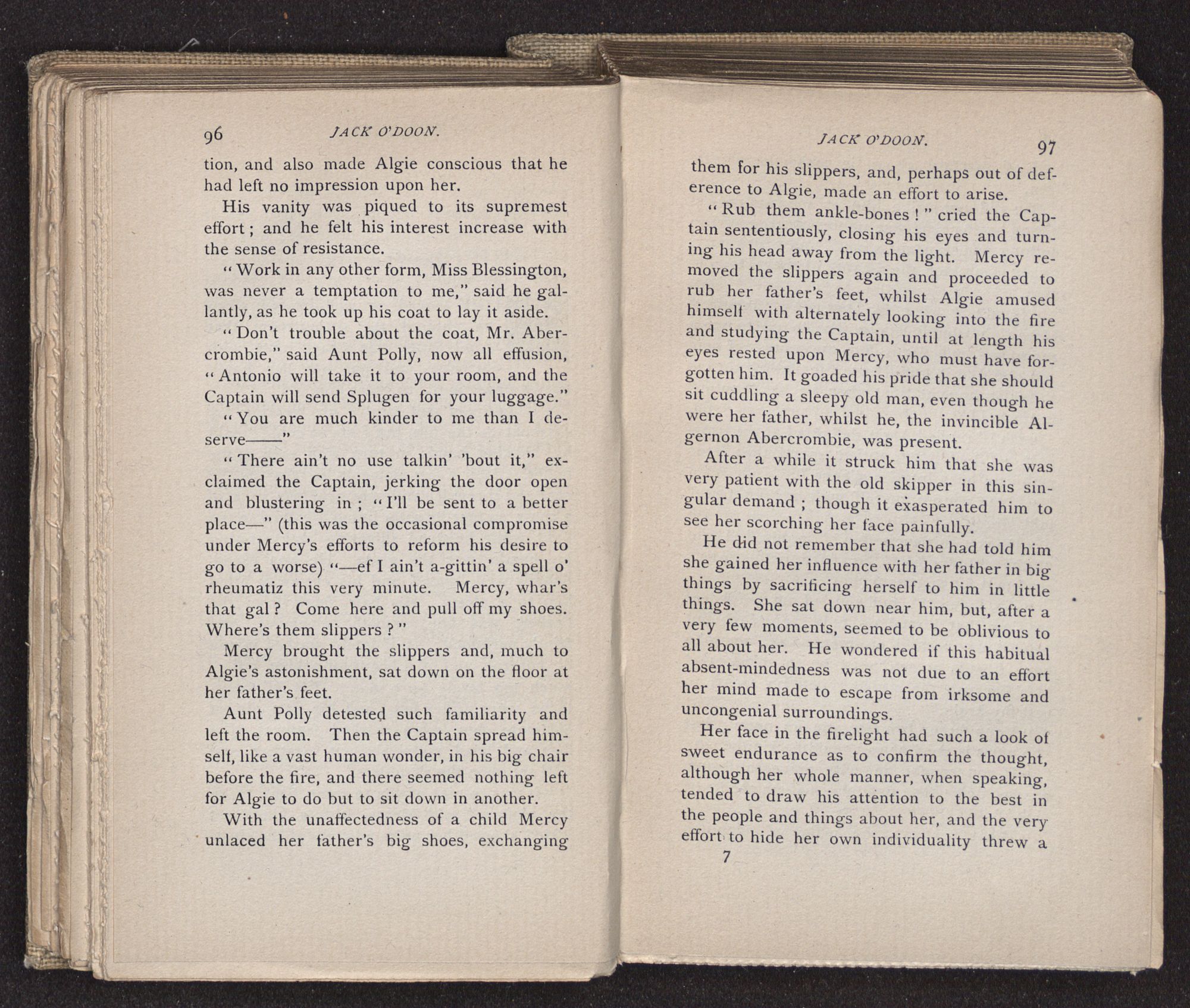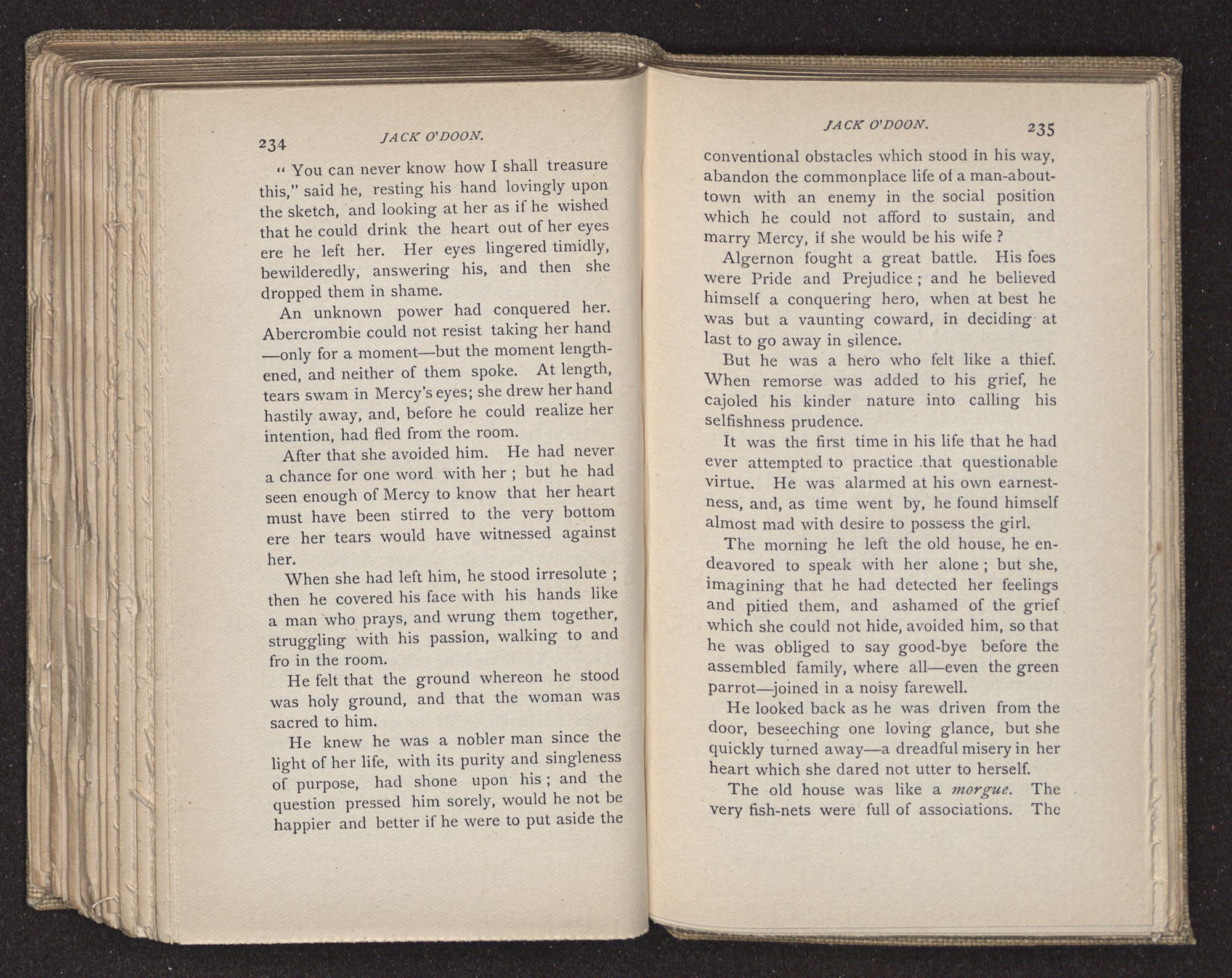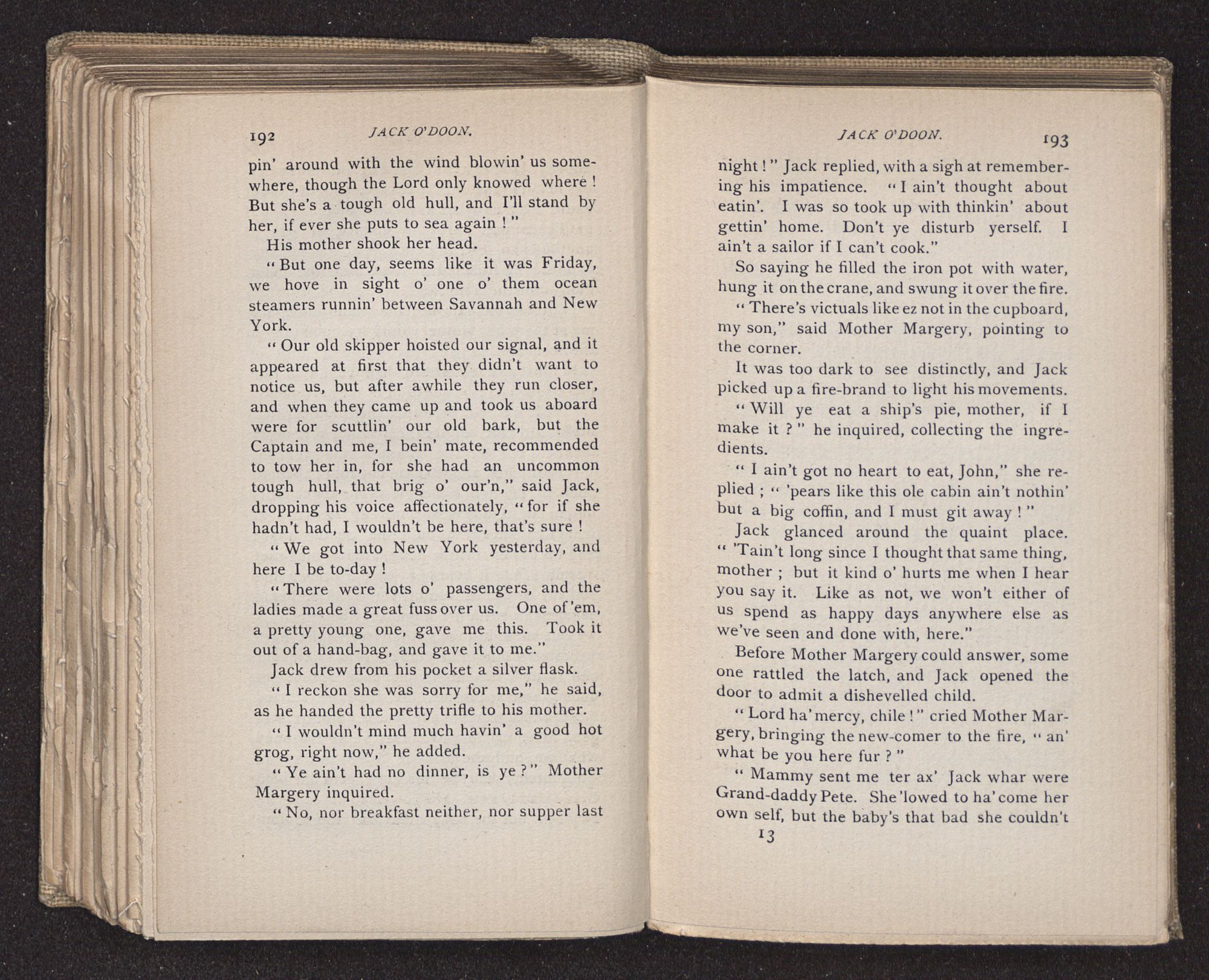 Jack O'Doon, the last of seven sons who had gone down to the sea in ships, was the pride and glory of his mother's heart. She had called him her scholar, and now, seeing his books, with his name upon them, in a bold and clerkly hand, arose, and, with a desperate necessity for expression, kissed them with idolatrous fervor again and again. “My boy, my boy!” she cried, wringing her hands, “he won't come back no more.” The girl looked on, but her eyes were dry; she had not realized it yet. She had not had that tuition of disappointment which at last teaches us to shrink from the most casual separation, as we shrink from death; and so she sat with a mute and reverent sympathy, following Mother Margery with her eyes, unconscious of the strong contrast between herself and her old nurse.