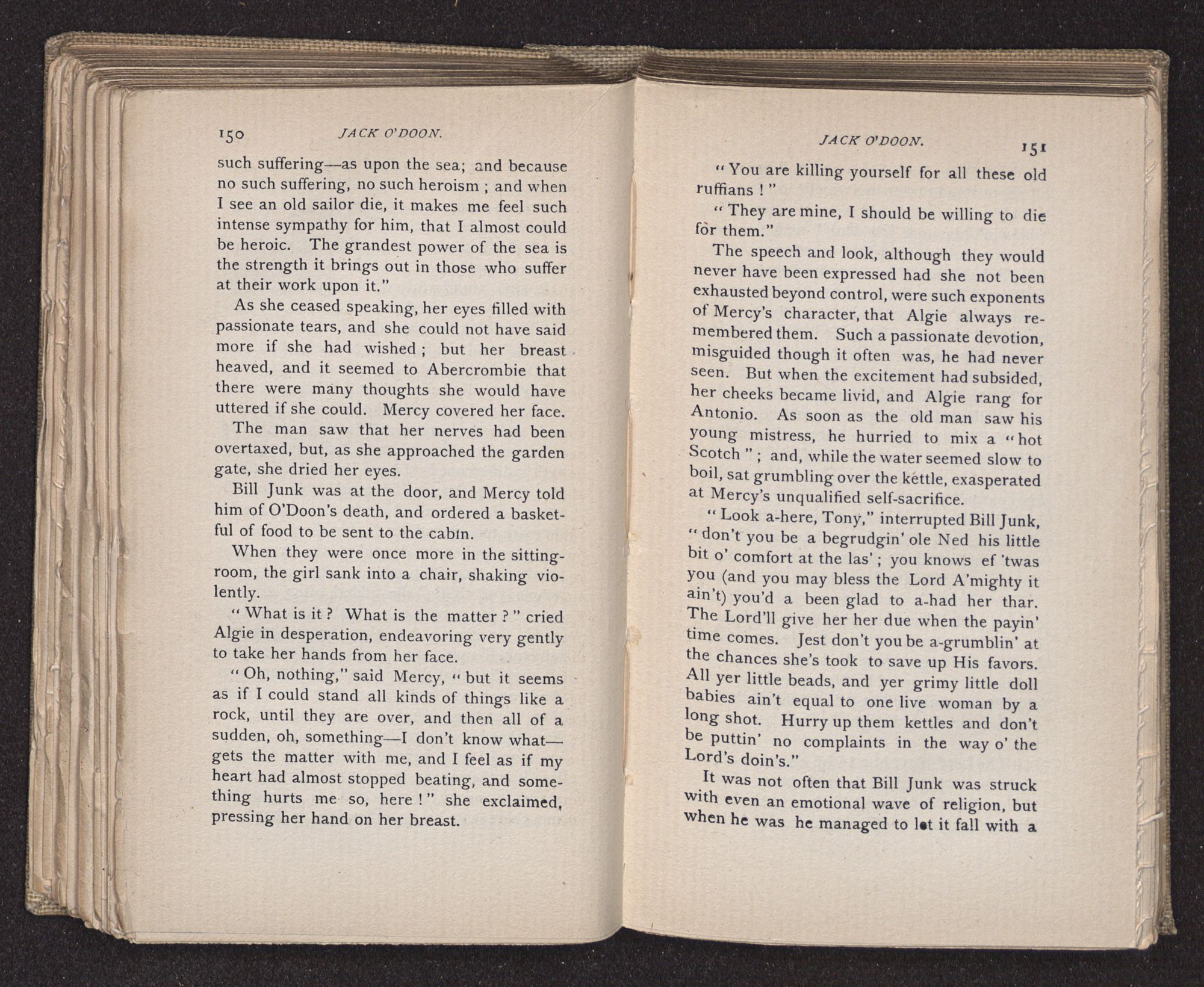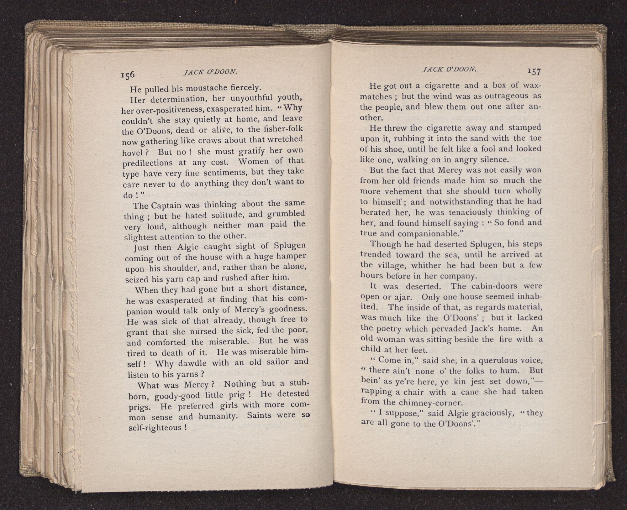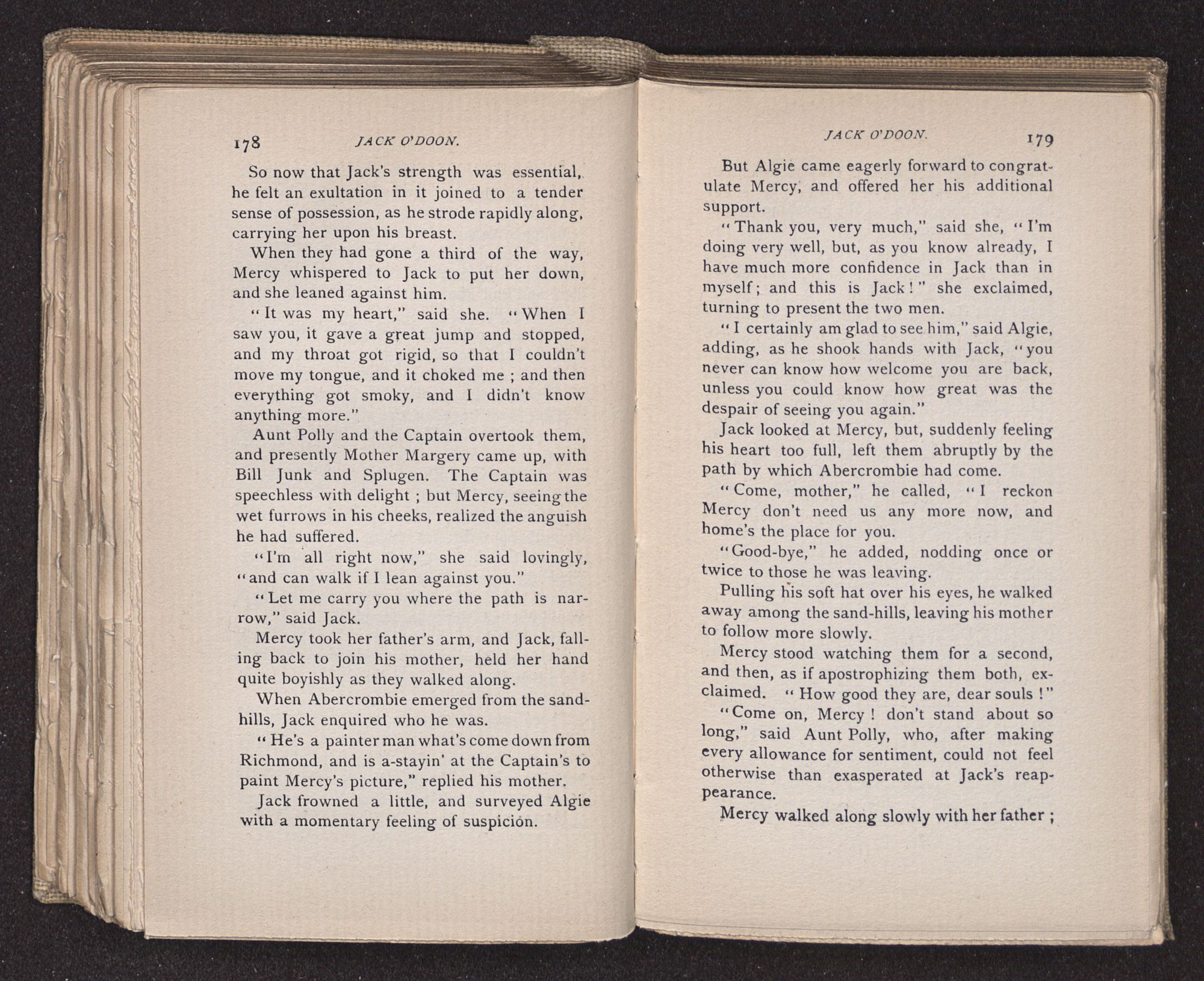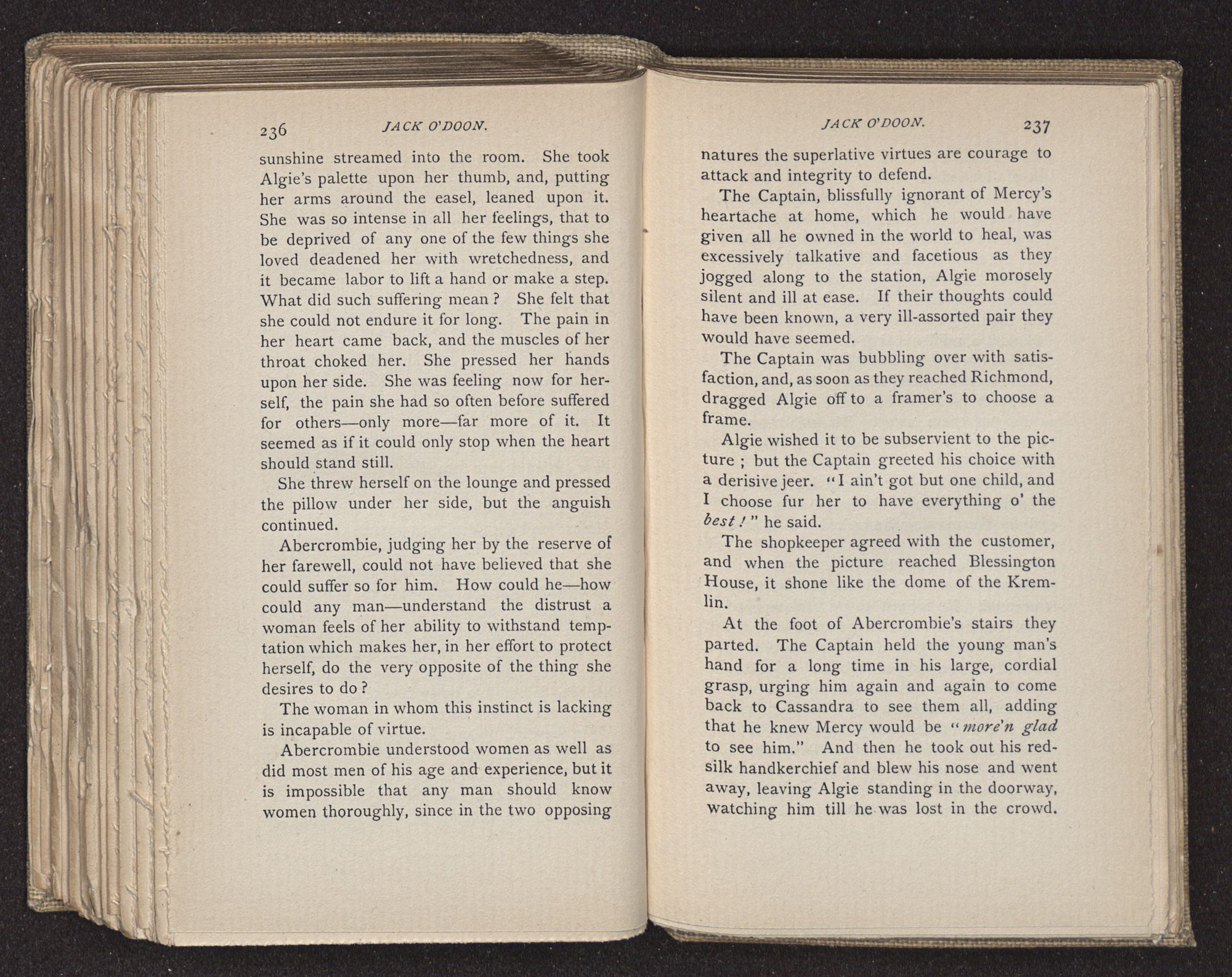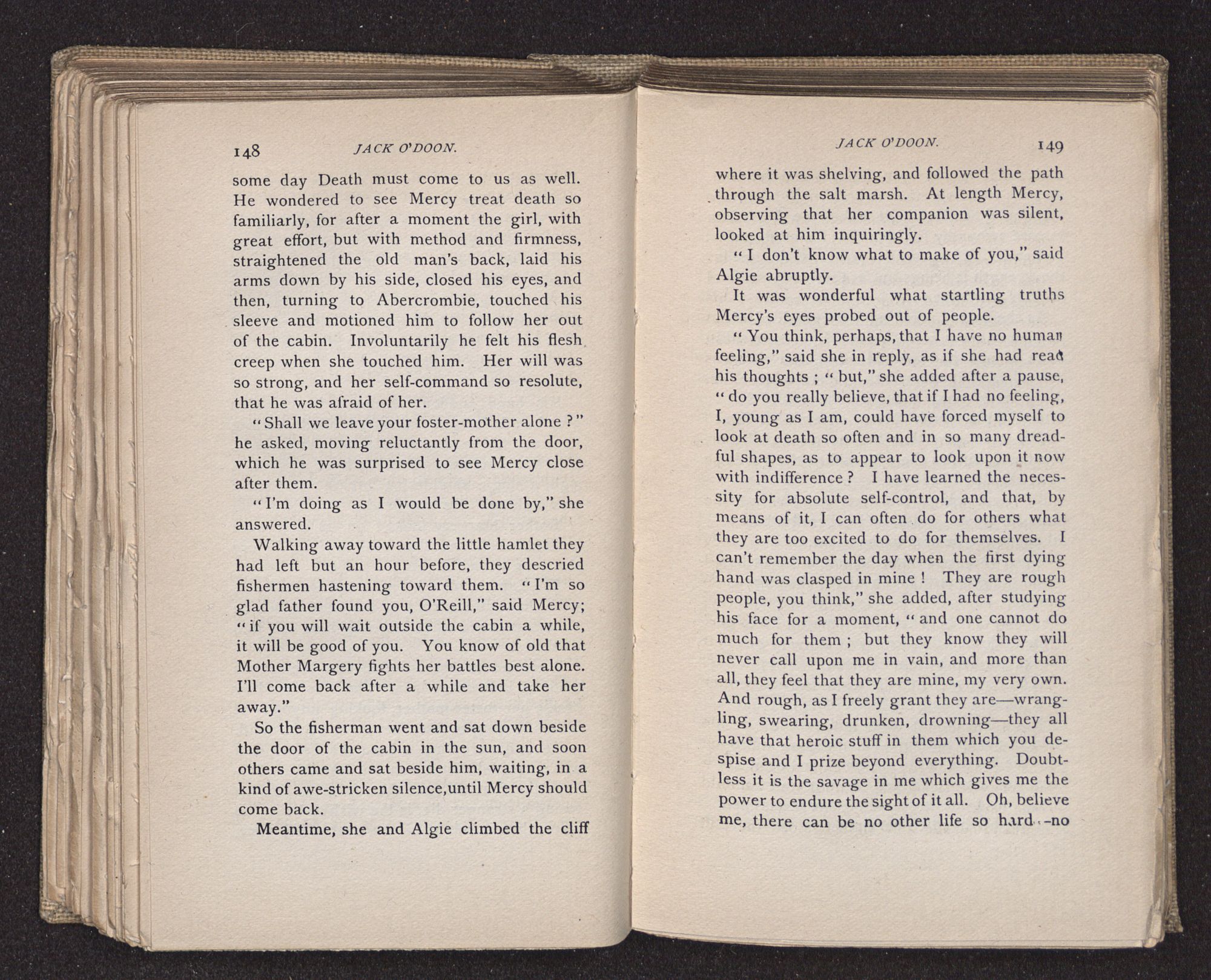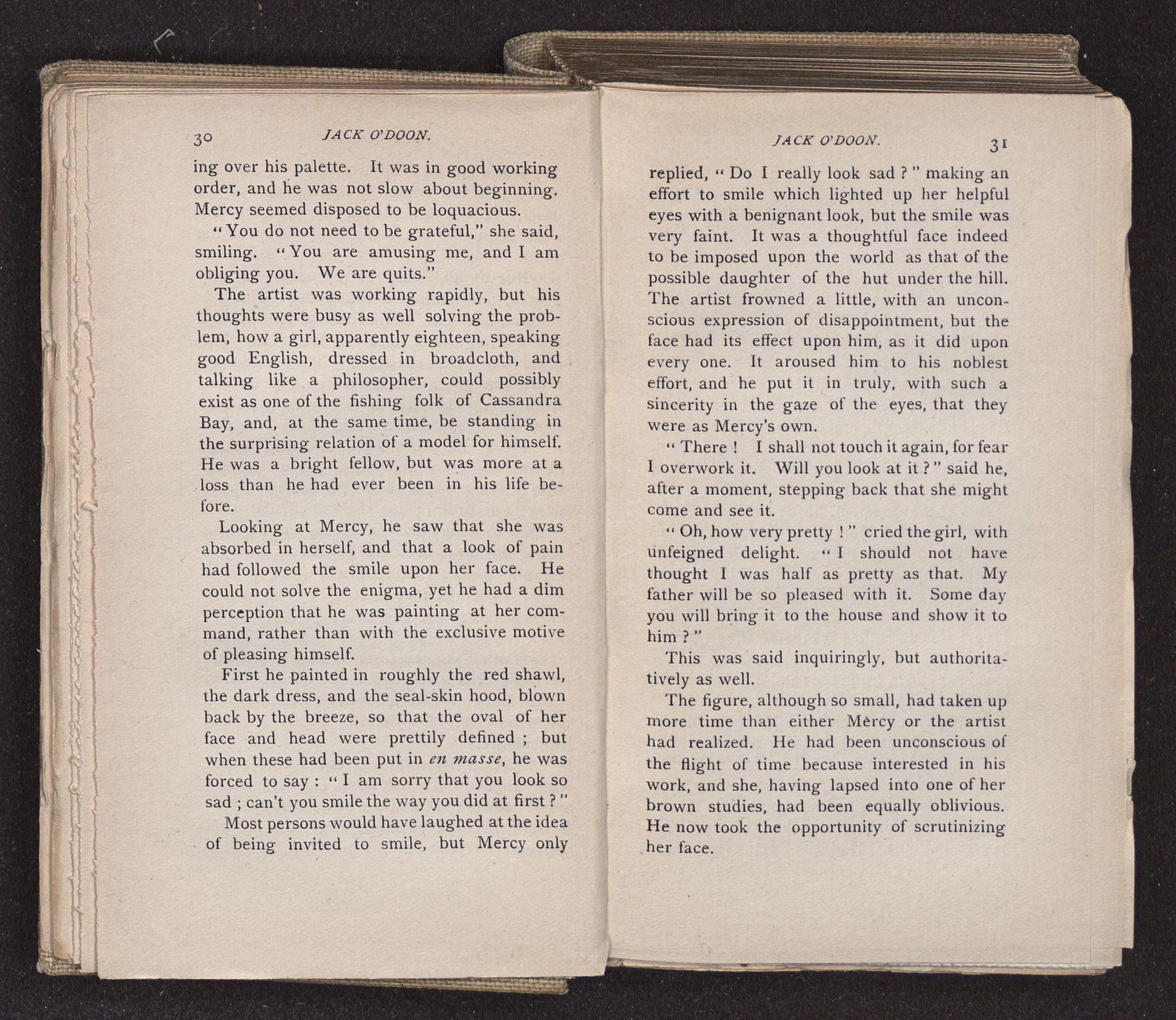 Jack O'Doon, the last of seven sons who had gone down to the sea in ships, was the pride and glory of his mother's heart. She had called him her scholar, and now, seeing his books, with his name upon them, in a bold and clerkly hand, arose, and, with a desperate necessity for expression, kissed them with idolatrous fervor again and again. “My boy, my boy!” she cried, wringing her hands, “he won't come back no more.” The girl looked on, but her eyes were dry; she had not realized it yet. She had not had that tuition of disappointment which at last teaches us to shrink from the most casual separation, as we shrink from death; and so she sat with a mute and reverent sympathy, following Mother Margery with her eyes, unconscious of the strong contrast between herself and her old nurse.