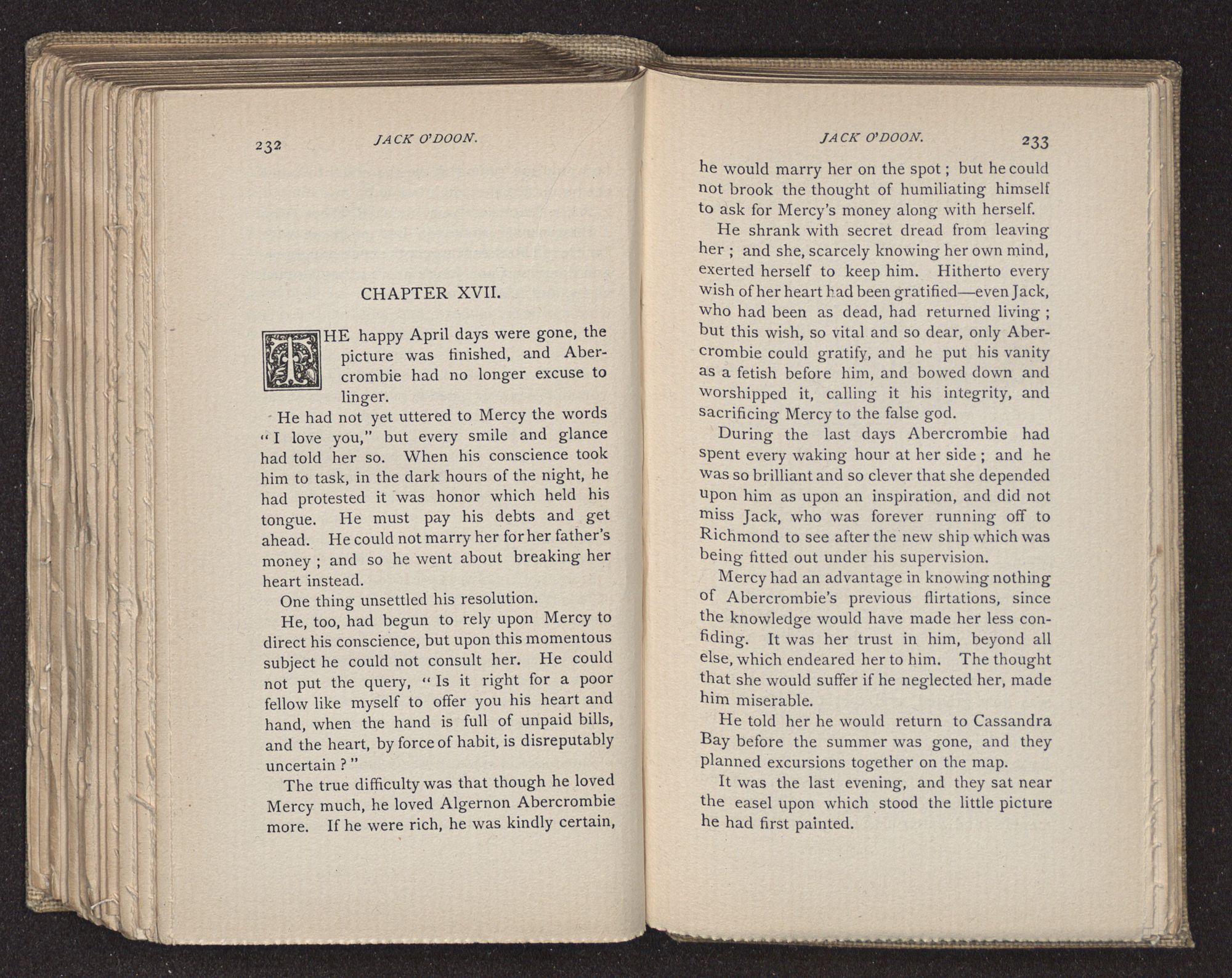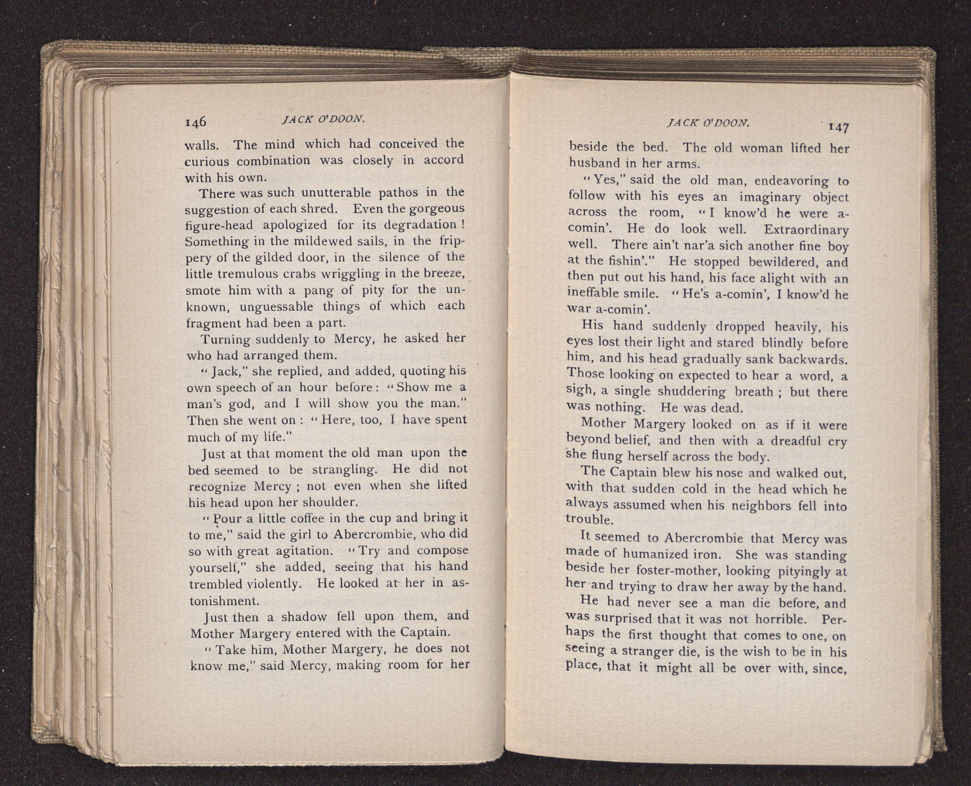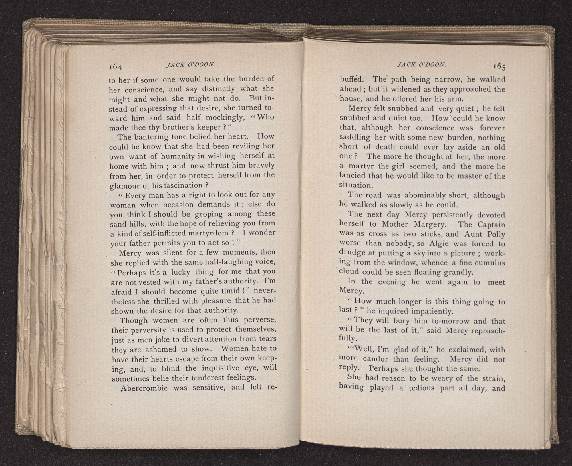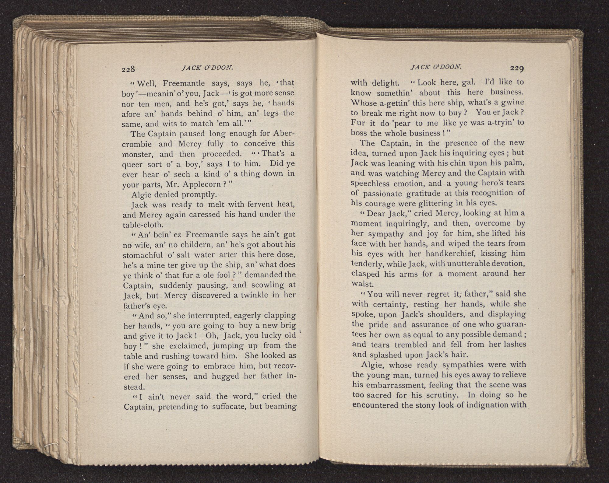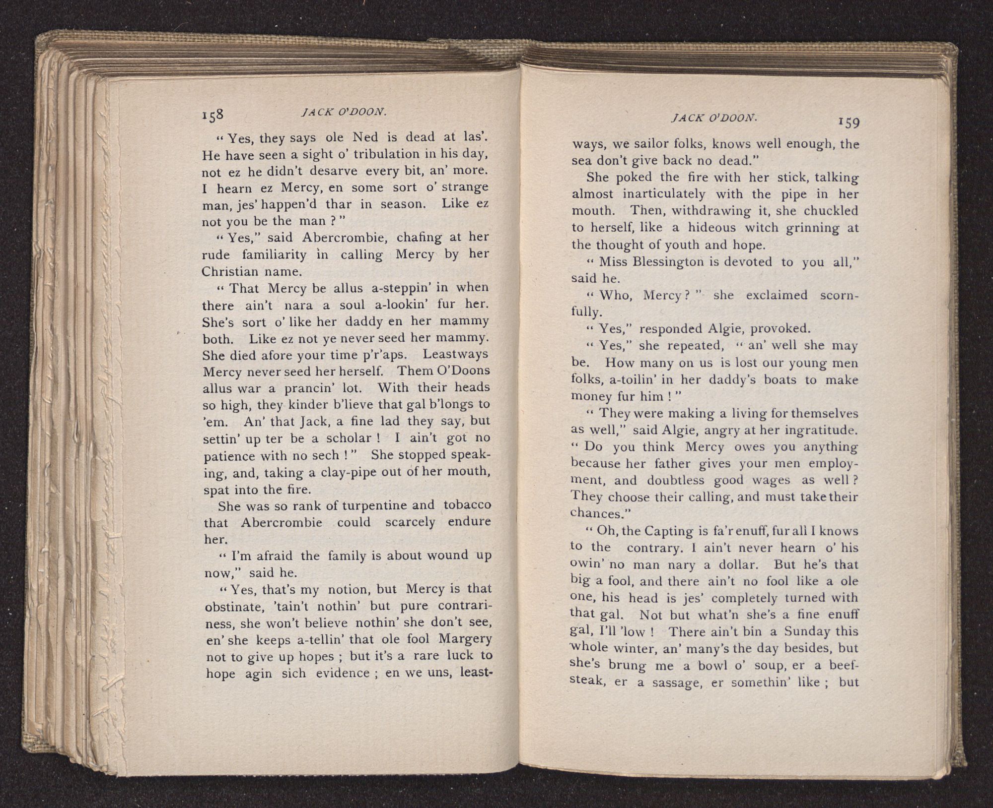 Jack O'Doon, the last of seven sons who had gone down to the sea in ships, was the pride and glory of his mother's heart. She had called him her scholar, and now, seeing his books, with his name upon them, in a bold and clerkly hand, arose, and, with a desperate necessity for expression, kissed them with idolatrous fervor again and again. “My boy, my boy!” she cried, wringing her hands, “he won't come back no more.” The girl looked on, but her eyes were dry; she had not realized it yet. She had not had that tuition of disappointment which at last teaches us to shrink from the most casual separation, as we shrink from death; and so she sat with a mute and reverent sympathy, following Mother Margery with her eyes, unconscious of the strong contrast between herself and her old nurse.
