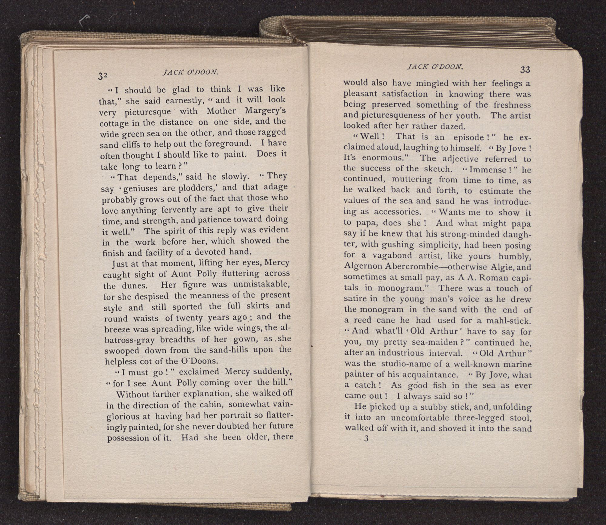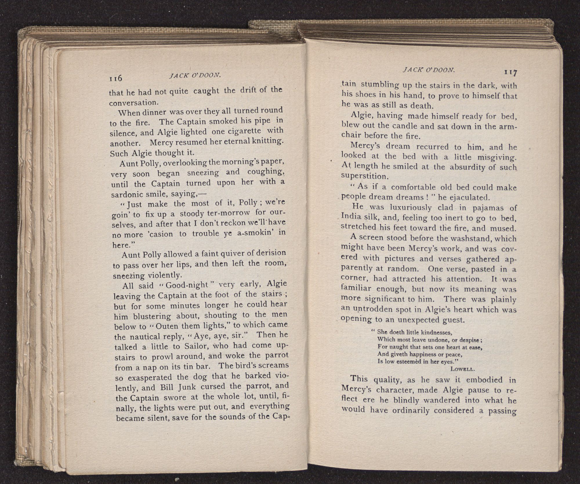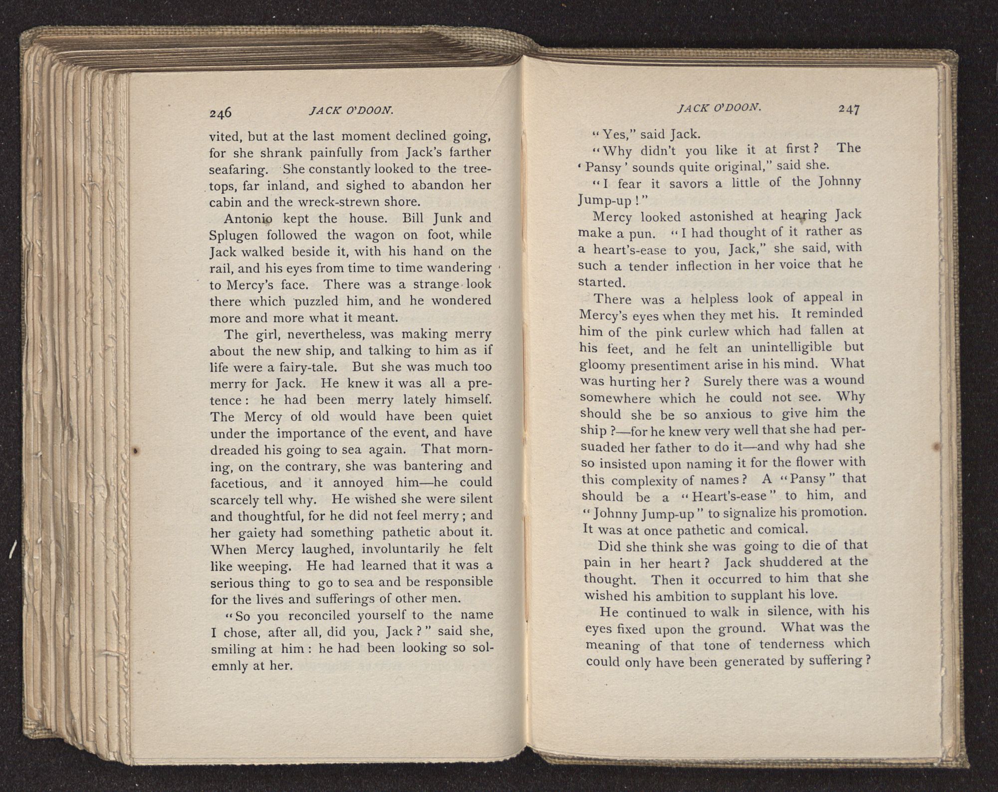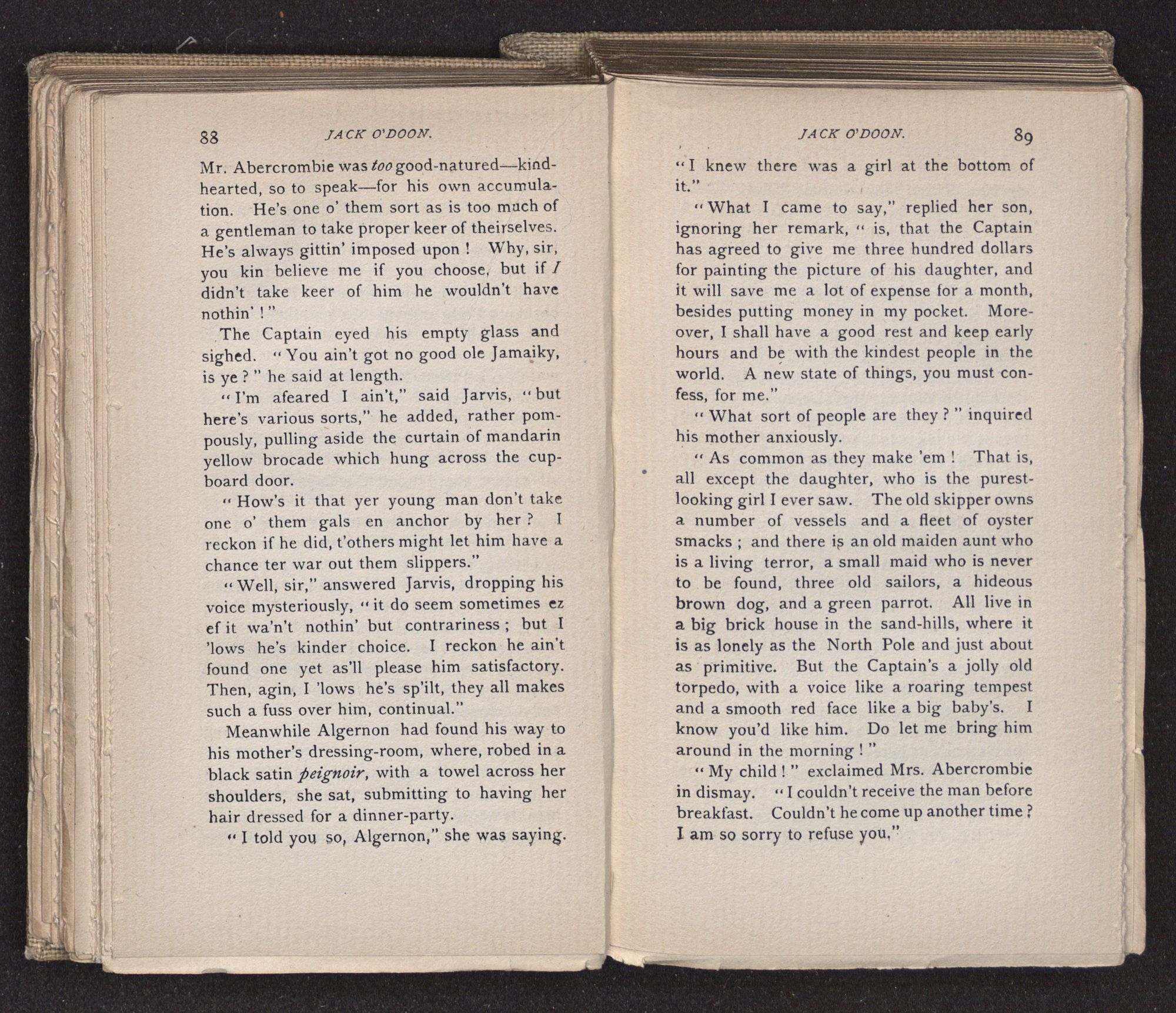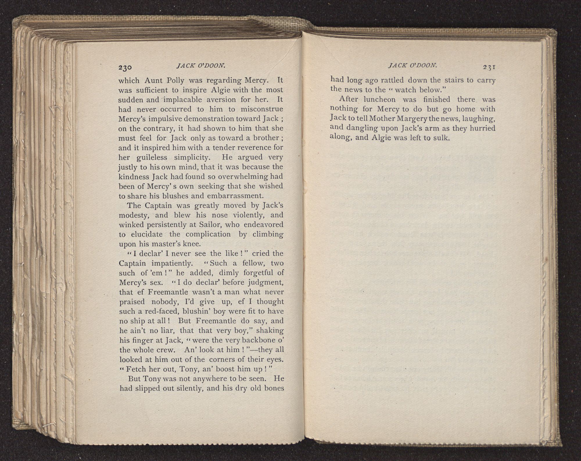 Jack O'Doon, the last of seven sons who had gone down to the sea in ships, was the pride and glory of his mother's heart. She had called him her scholar, and now, seeing his books, with his name upon them, in a bold and clerkly hand, arose, and, with a desperate necessity for expression, kissed them with idolatrous fervor again and again. “My boy, my boy!” she cried, wringing her hands, “he won't come back no more.” The girl looked on, but her eyes were dry; she had not realized it yet. She had not had that tuition of disappointment which at last teaches us to shrink from the most casual separation, as we shrink from death; and so she sat with a mute and reverent sympathy, following Mother Margery with her eyes, unconscious of the strong contrast between herself and her old nurse.