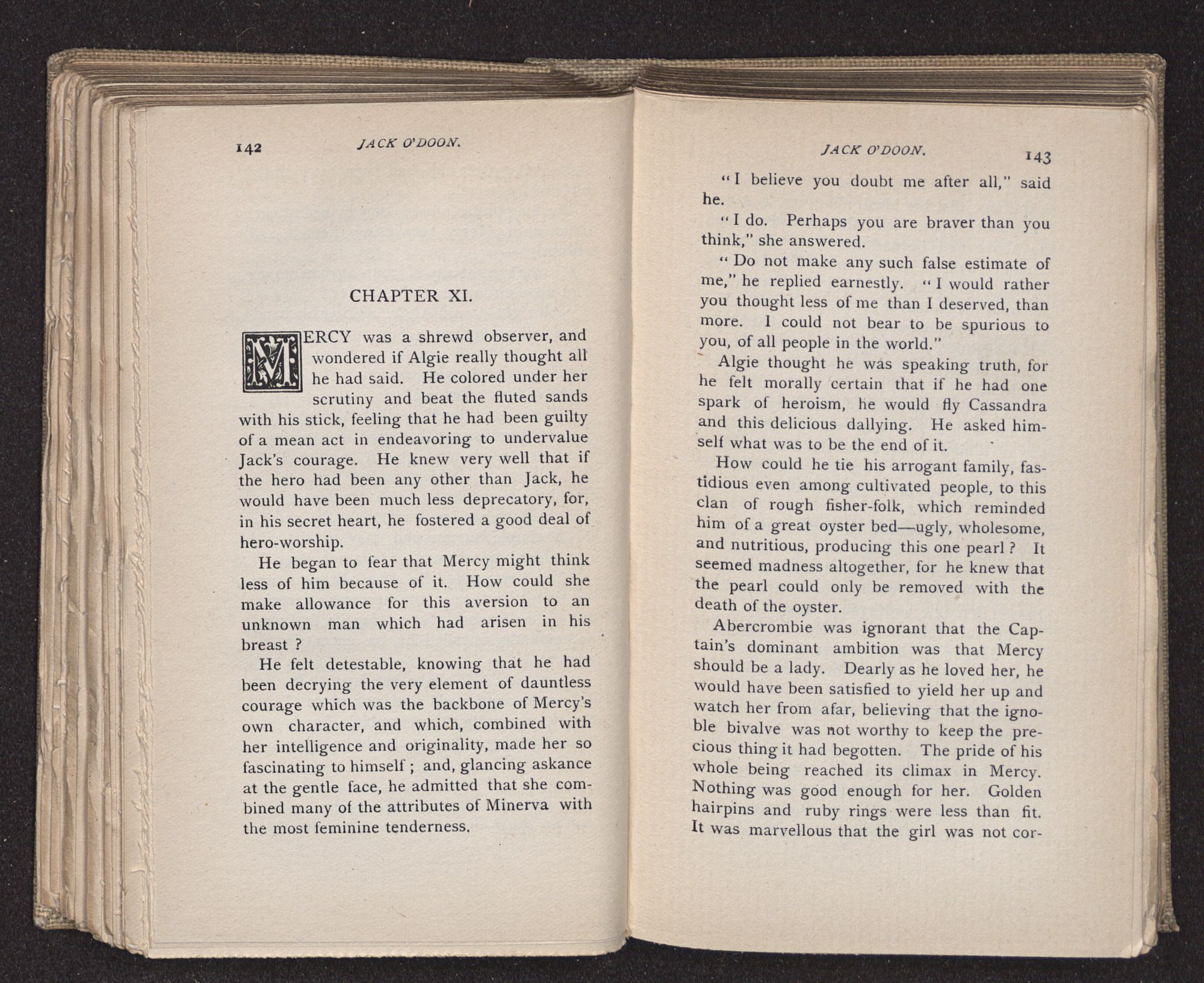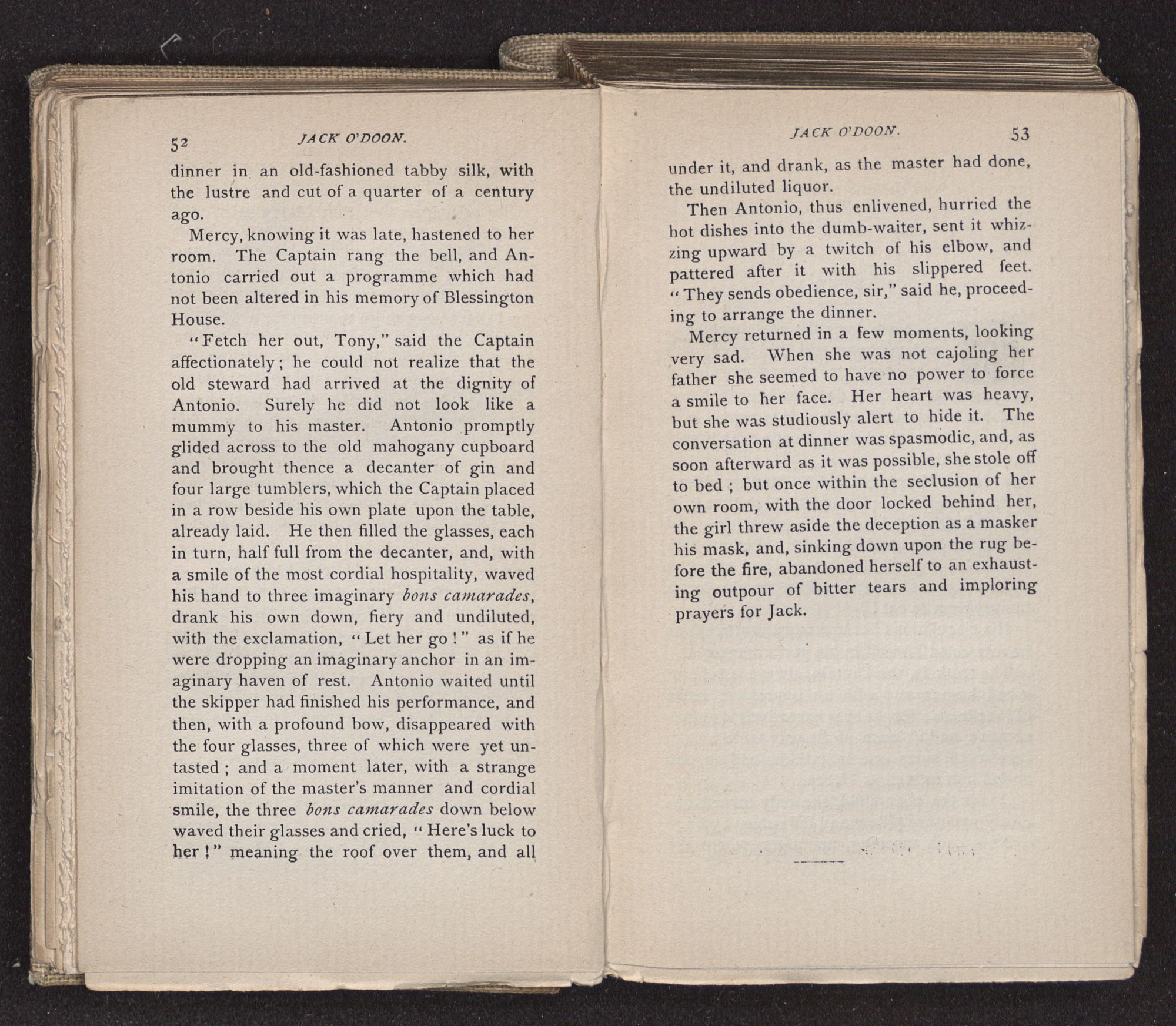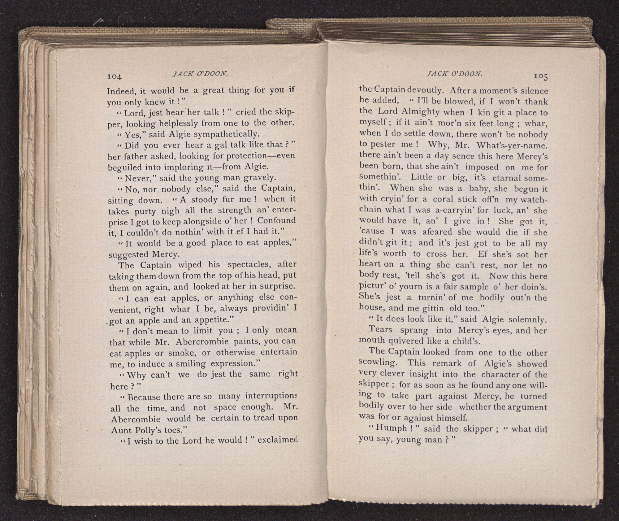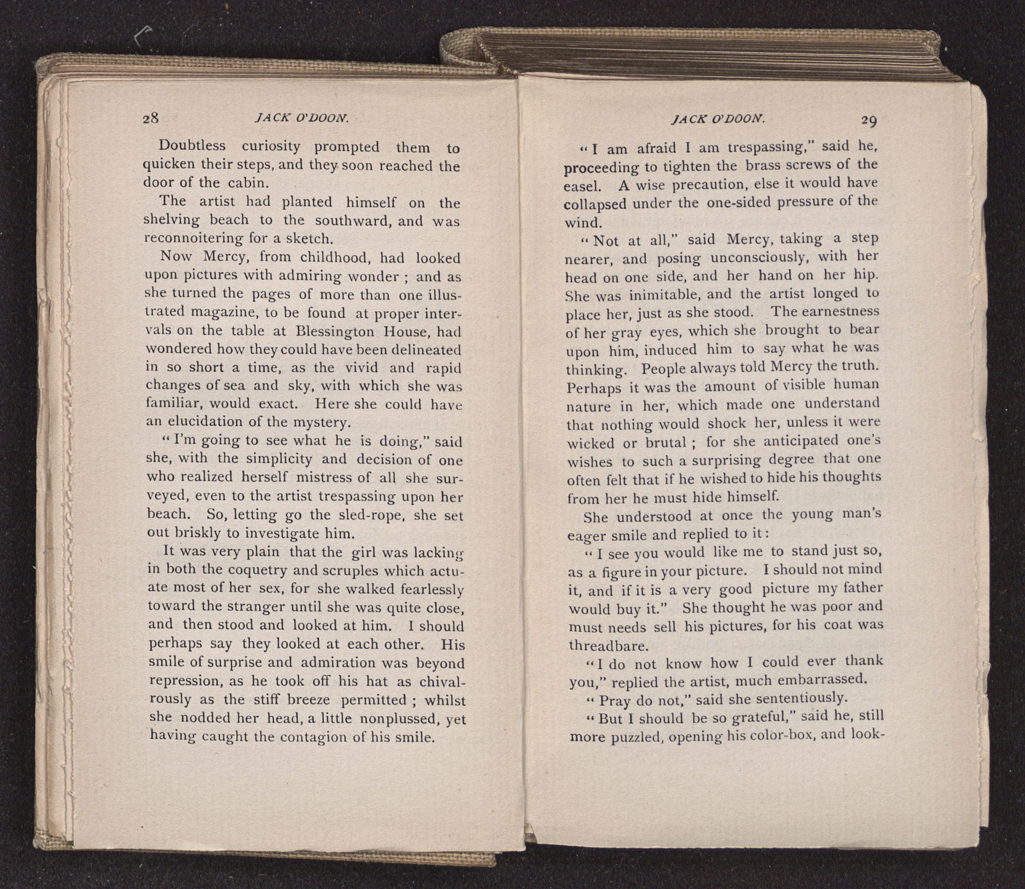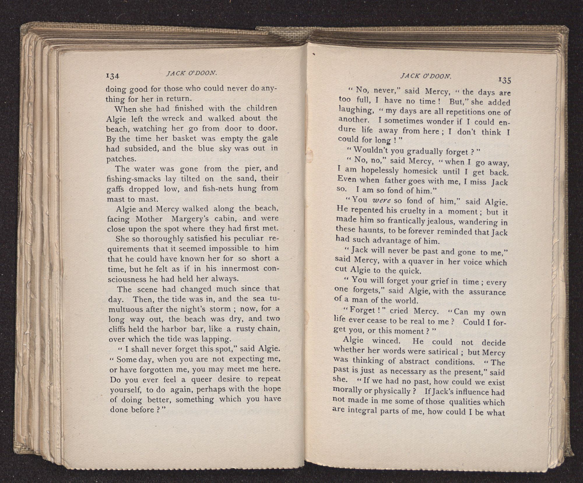 Jack O'Doon, the last of seven sons who had gone down to the sea in ships, was the pride and glory of his mother's heart. She had called him her scholar, and now, seeing his books, with his name upon them, in a bold and clerkly hand, arose, and, with a desperate necessity for expression, kissed them with idolatrous fervor again and again. “My boy, my boy!” she cried, wringing her hands, “he won't come back no more.” The girl looked on, but her eyes were dry; she had not realized it yet. She had not had that tuition of disappointment which at last teaches us to shrink from the most casual separation, as we shrink from death; and so she sat with a mute and reverent sympathy, following Mother Margery with her eyes, unconscious of the strong contrast between herself and her old nurse.