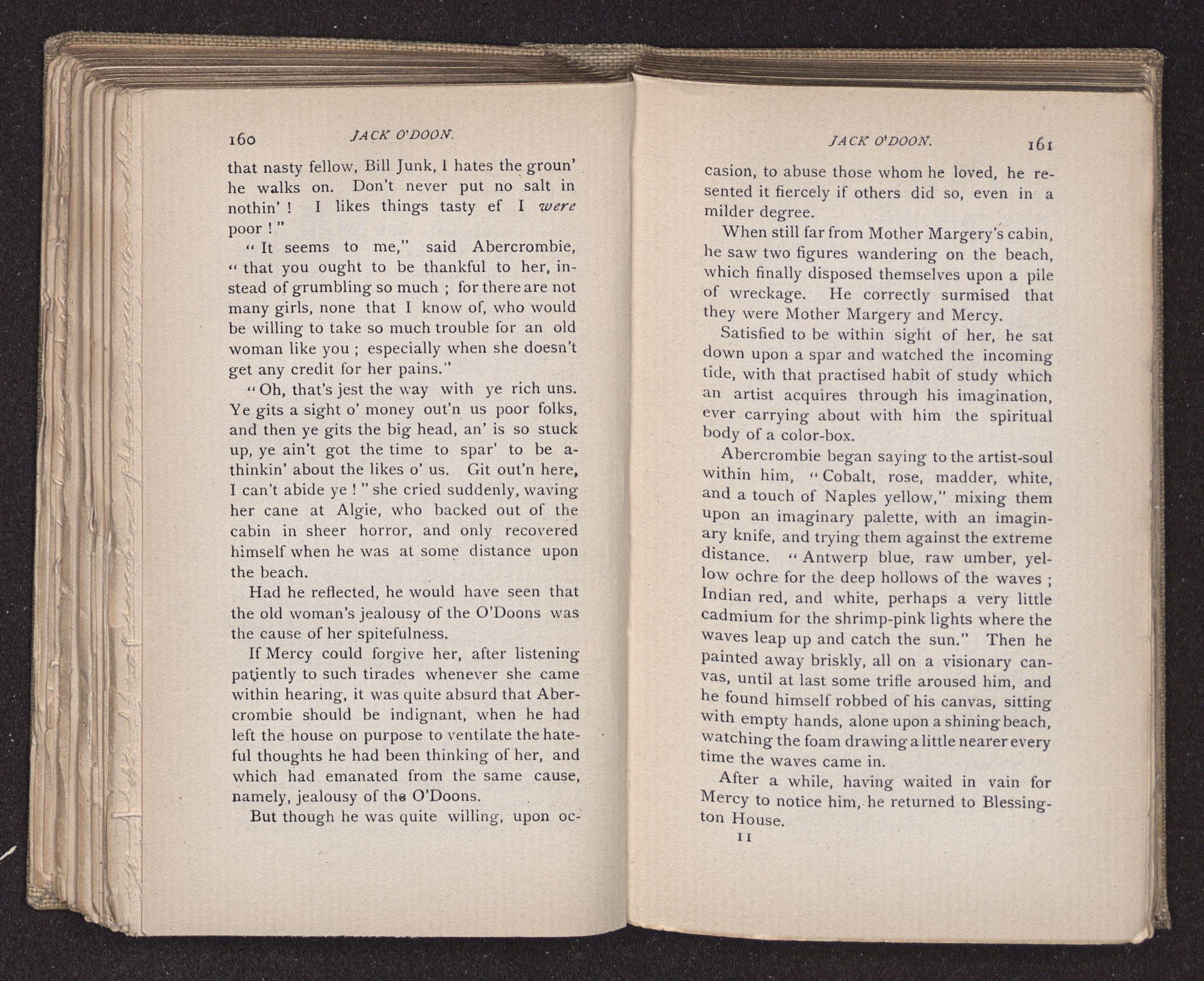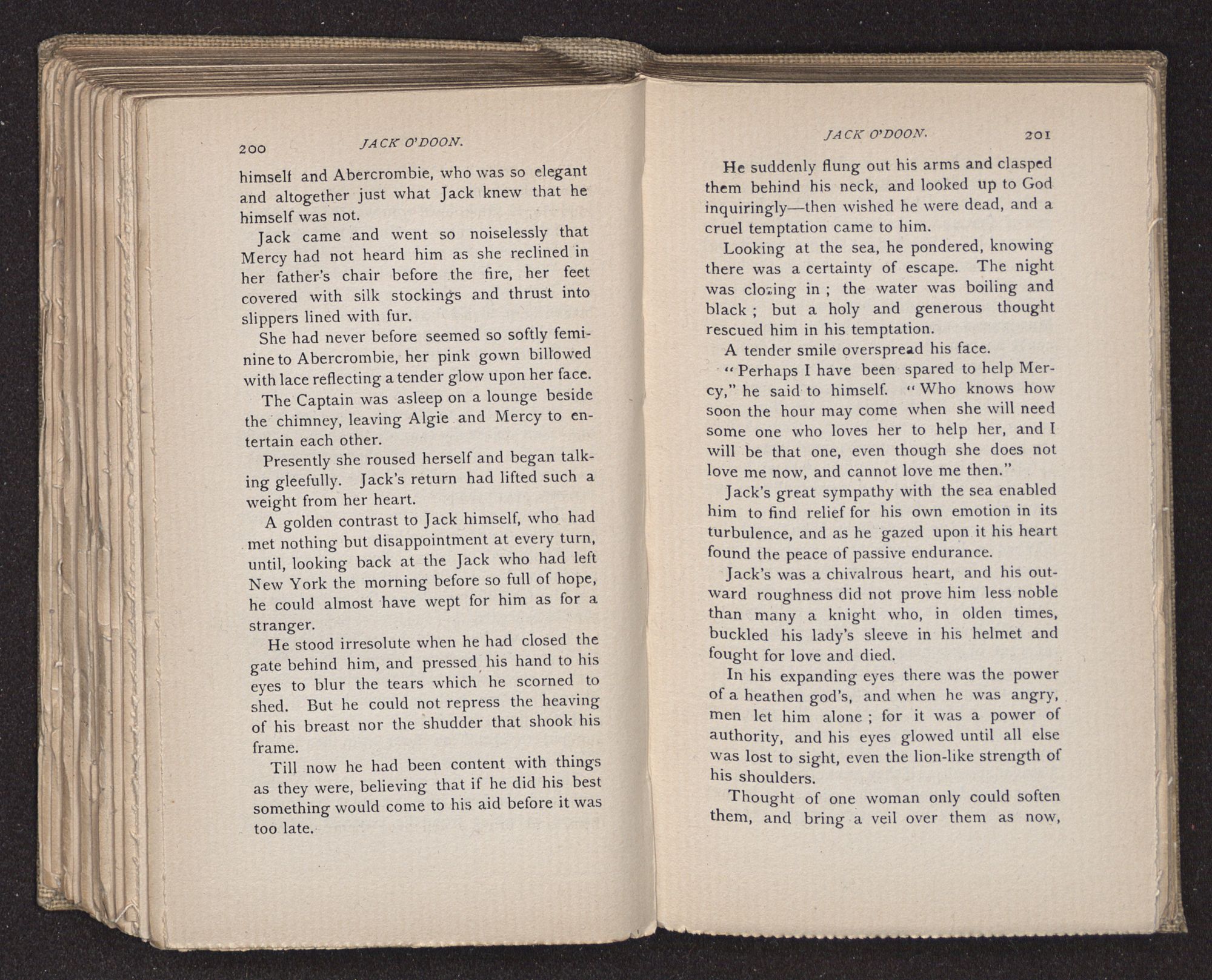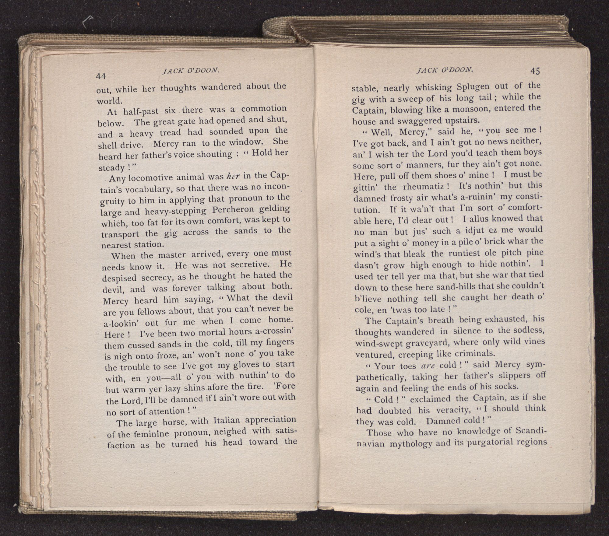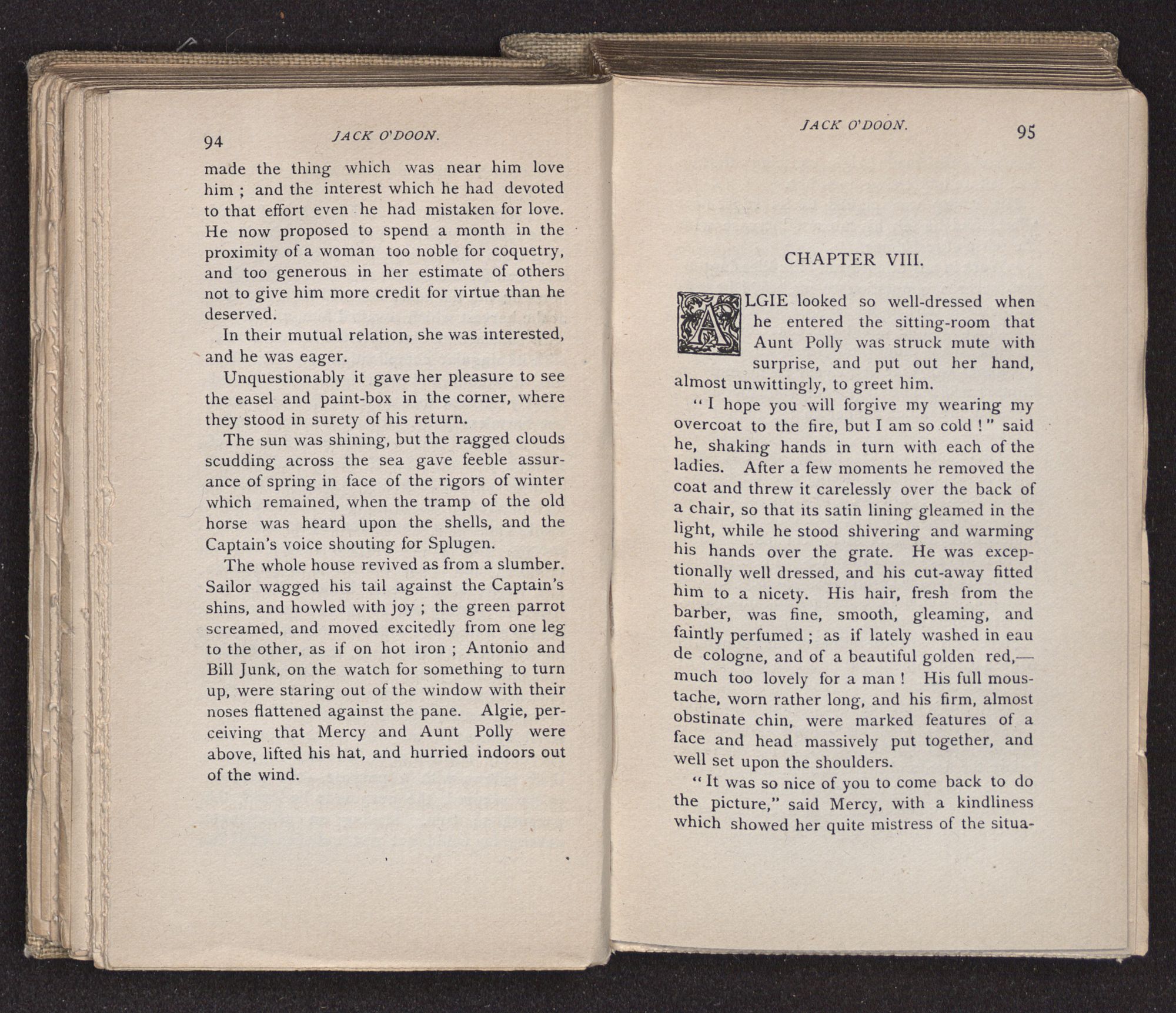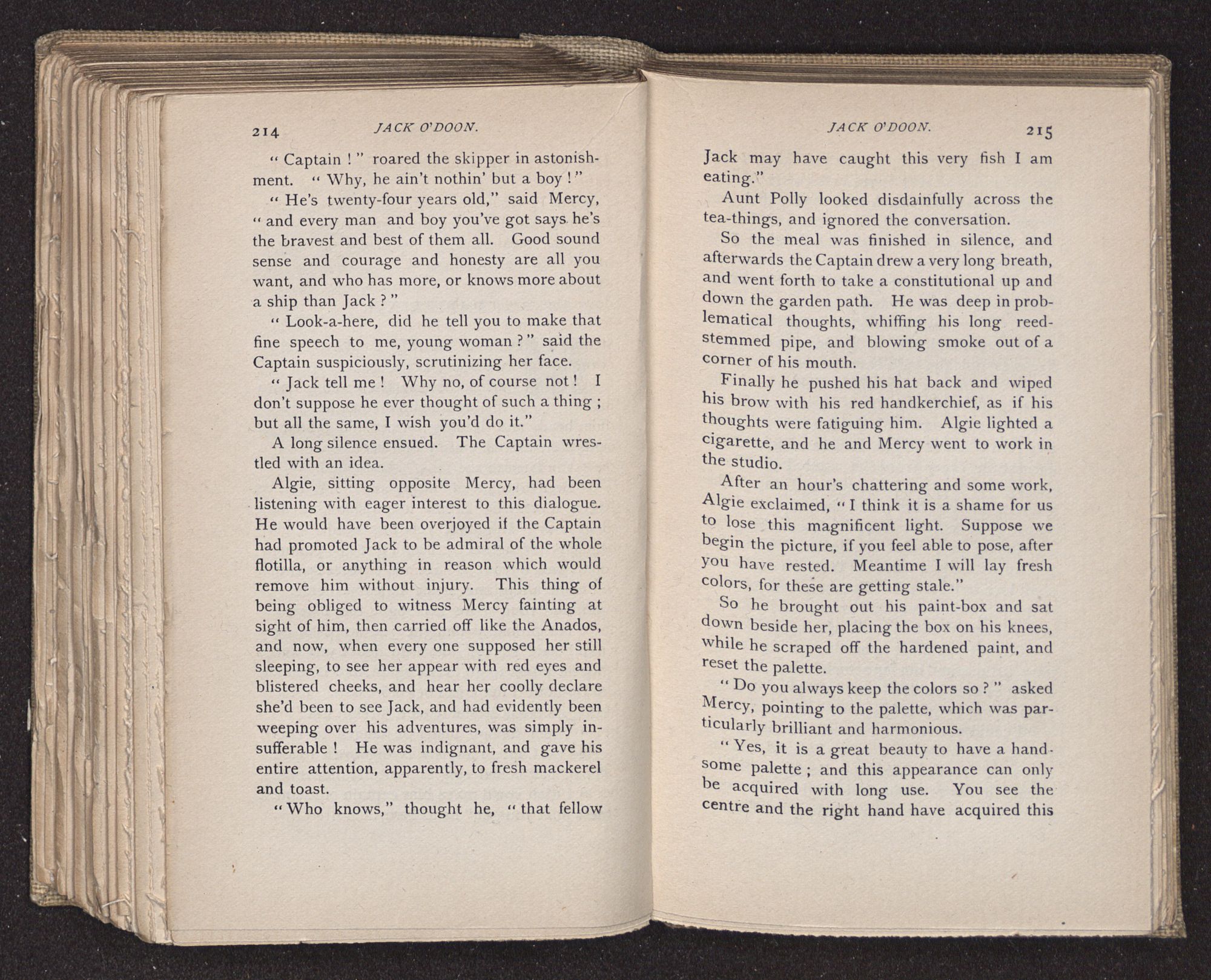Jack O'Doon, the last of seven sons who had gone down to the sea in ships, was the pride and glory of his mother's heart. She had called him her scholar, and now, seeing his books, with his name upon them, in a bold and clerkly hand, arose, and, with a desperate necessity for expression, kissed them with idolatrous fervor again and again. “My boy, my boy!” she cried, wringing her hands, “he won't come back no more.” The girl looked on, but her eyes were dry; she had not realized it yet. She had not had that tuition of disappointment which at last teaches us to shrink from the most casual separation, as we shrink from death; and so she sat with a mute and reverent sympathy, following Mother Margery with her eyes, unconscious of the strong contrast between herself and her old nurse.