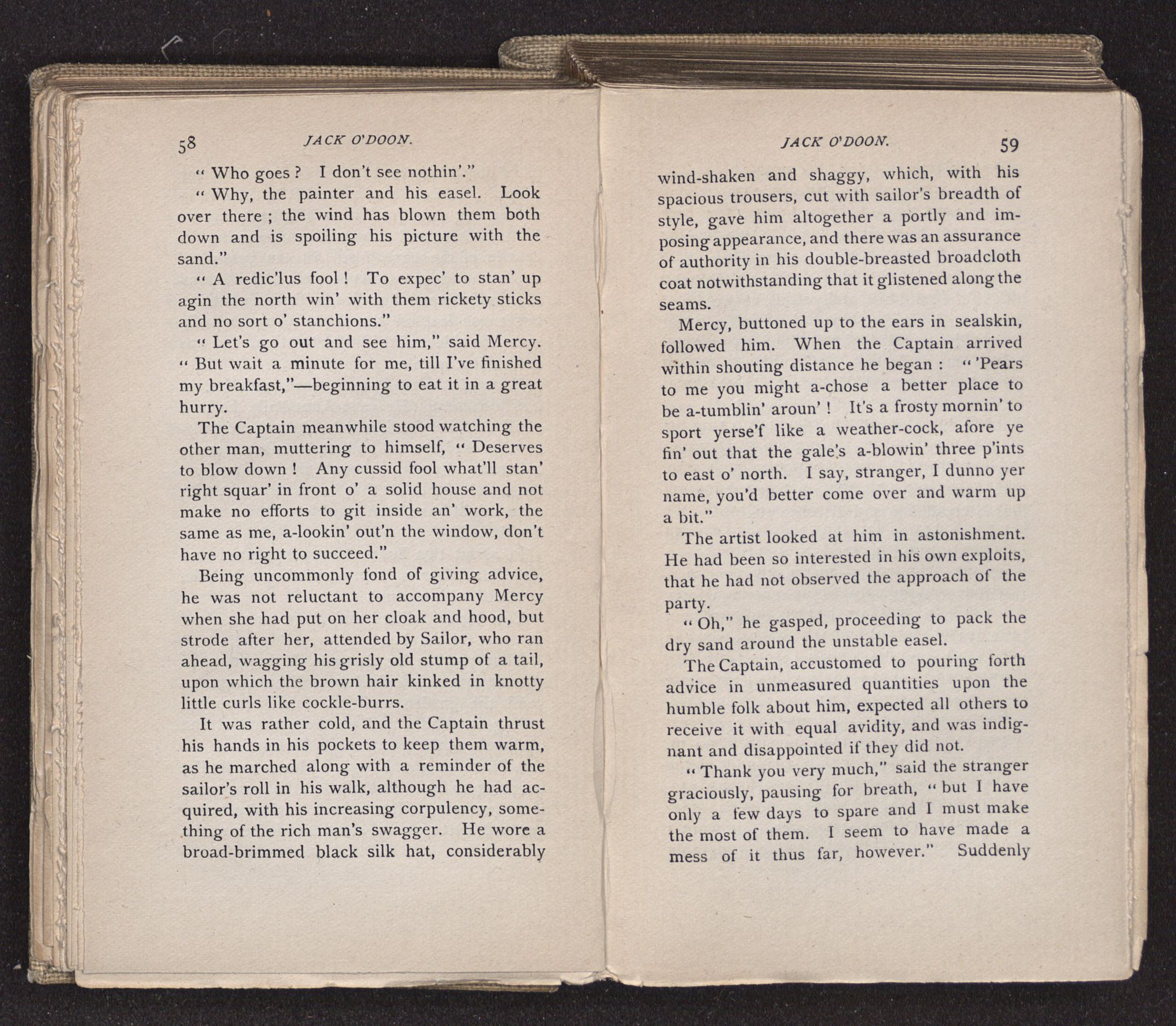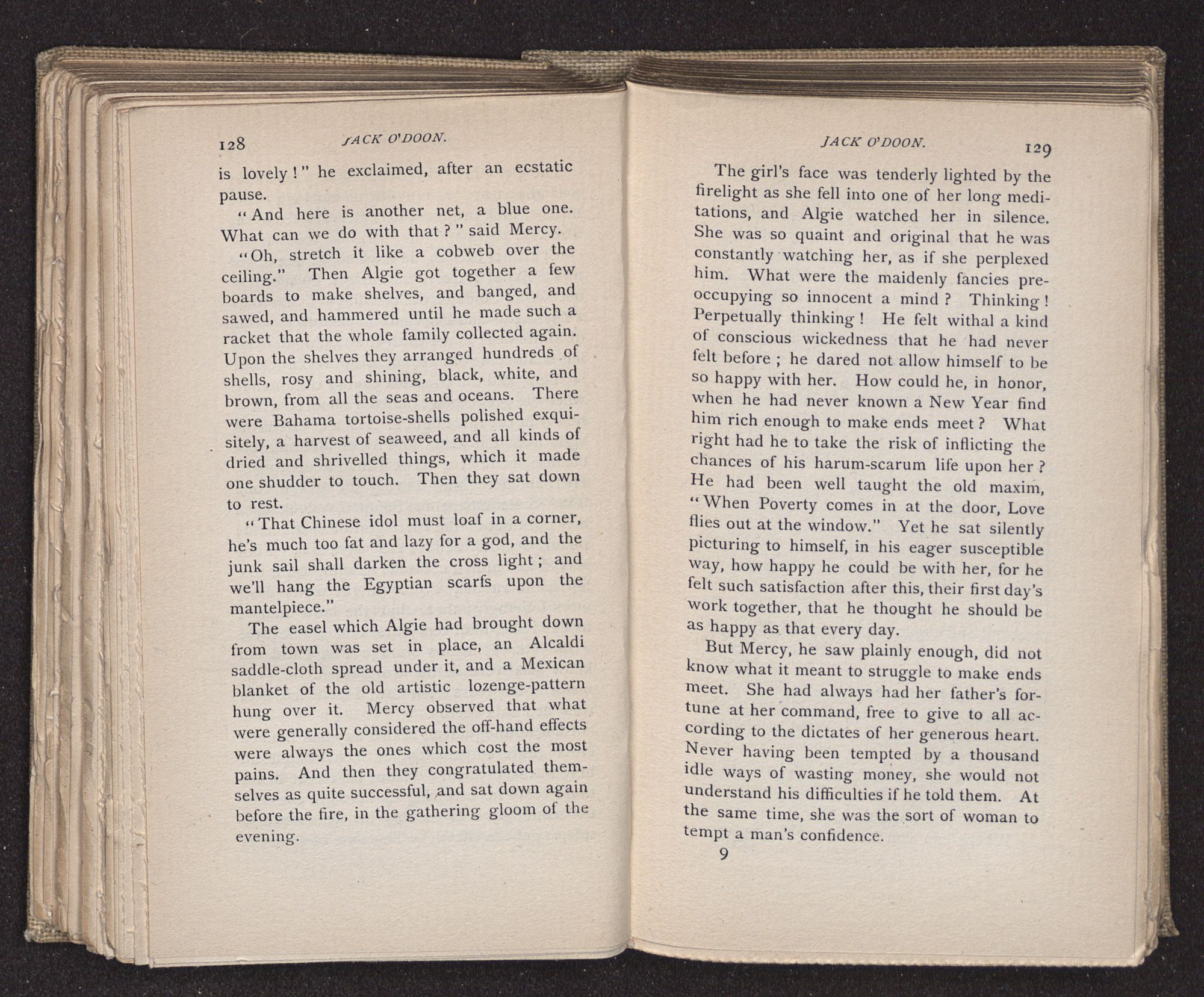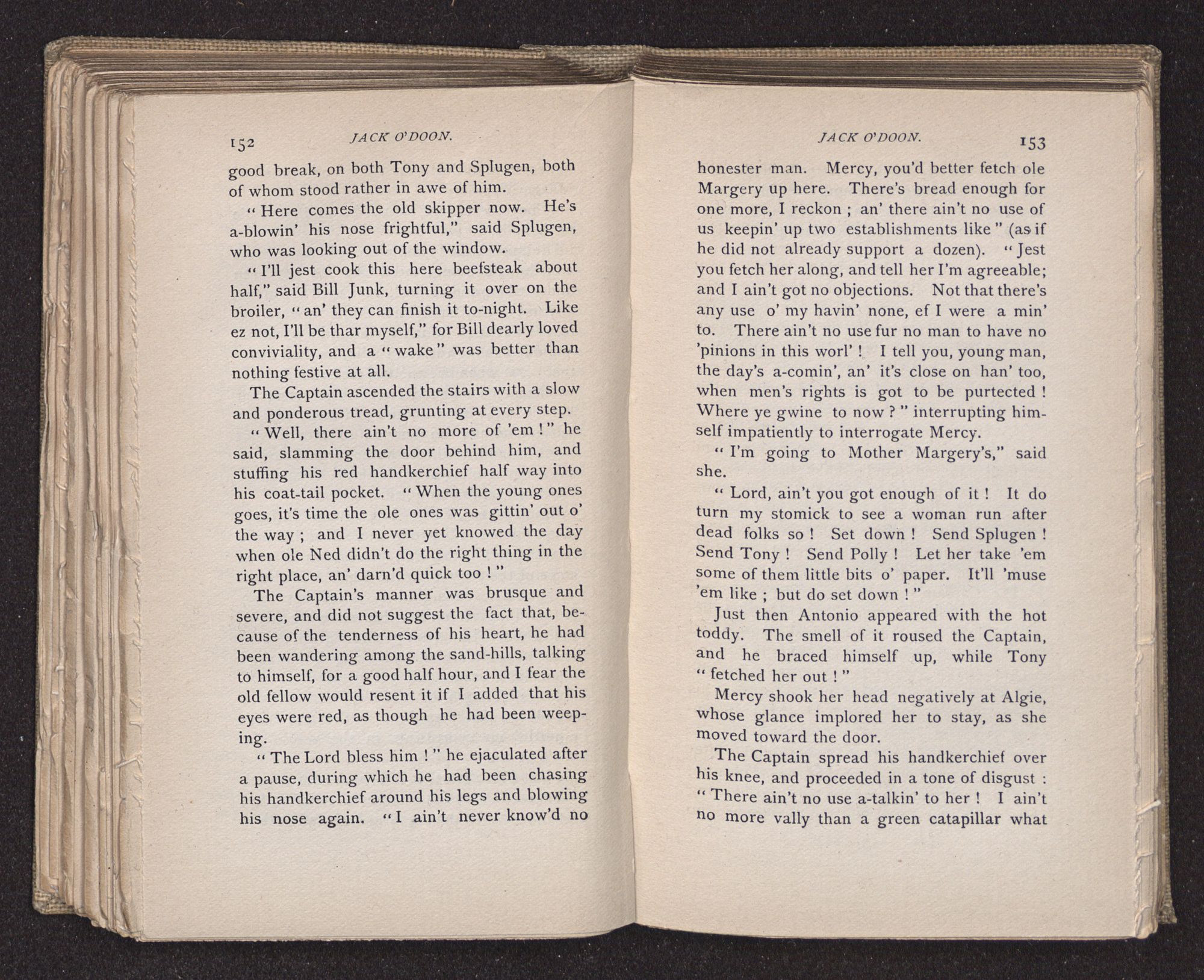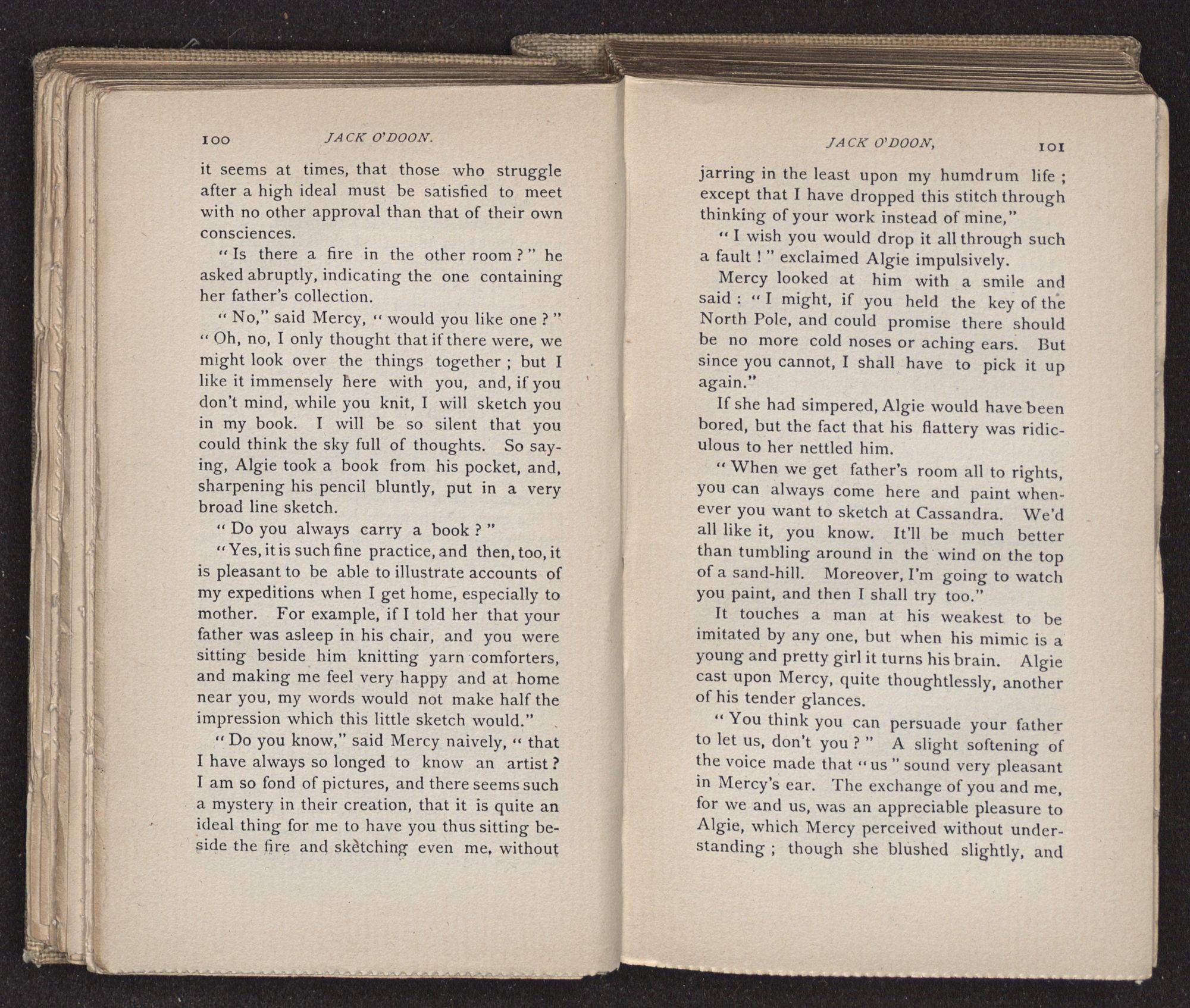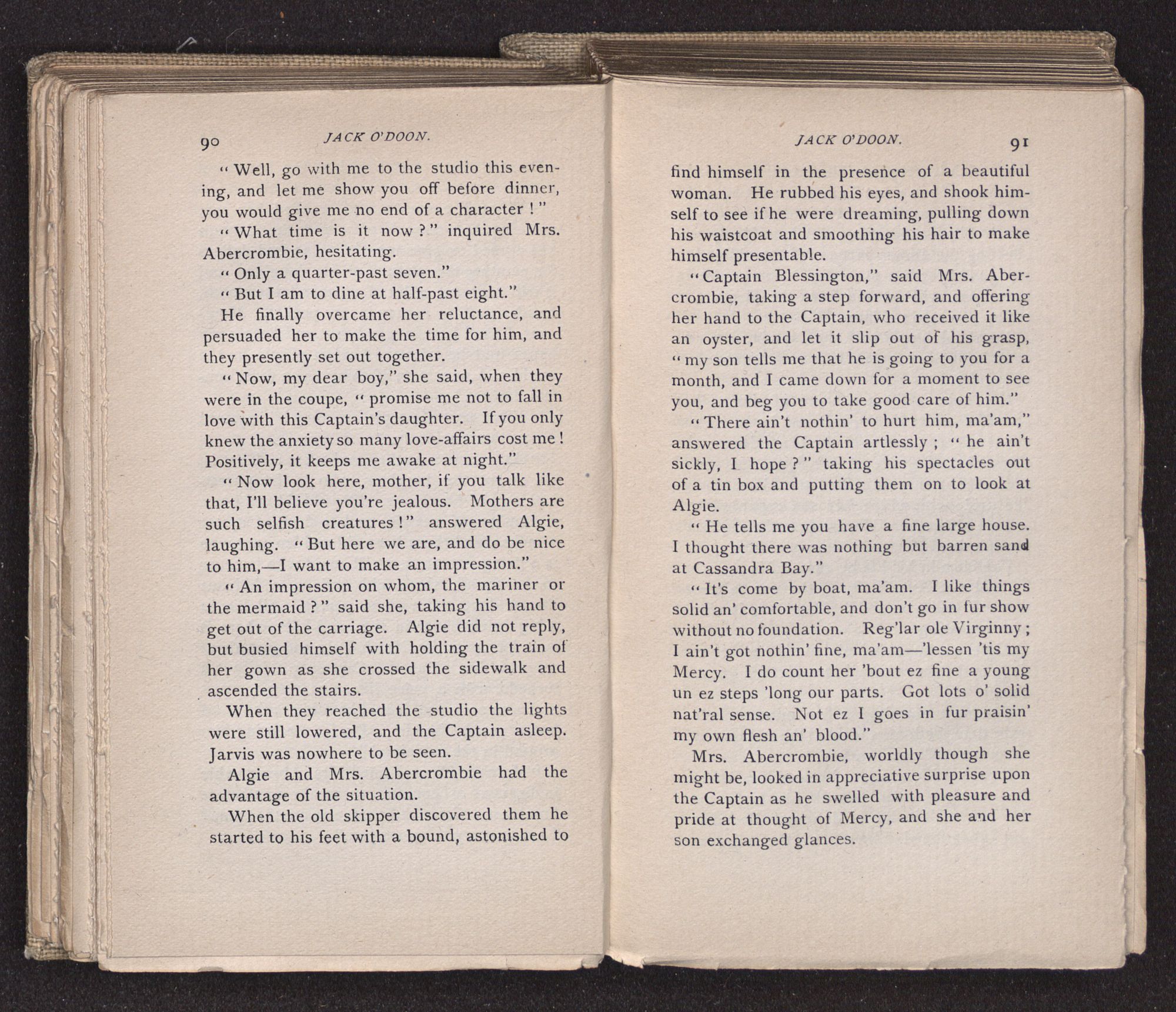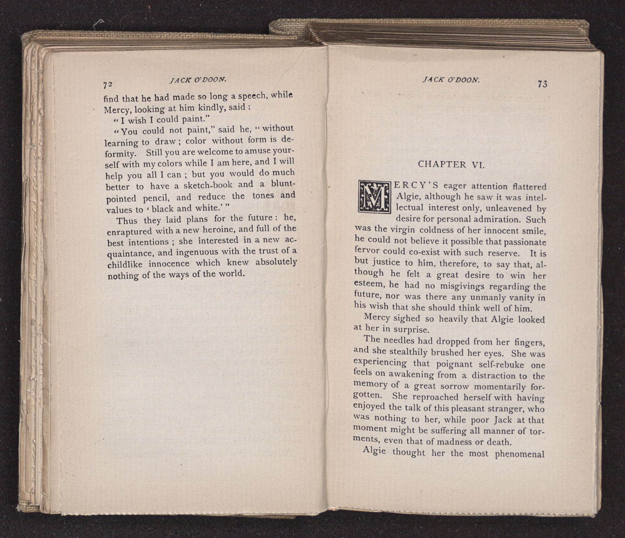 Jack O'Doon, the last of seven sons who had gone down to the sea in ships, was the pride and glory of his mother's heart. She had called him her scholar, and now, seeing his books, with his name upon them, in a bold and clerkly hand, arose, and, with a desperate necessity for expression, kissed them with idolatrous fervor again and again. “My boy, my boy!” she cried, wringing her hands, “he won't come back no more.” The girl looked on, but her eyes were dry; she had not realized it yet. She had not had that tuition of disappointment which at last teaches us to shrink from the most casual separation, as we shrink from death; and so she sat with a mute and reverent sympathy, following Mother Margery with her eyes, unconscious of the strong contrast between herself and her old nurse.