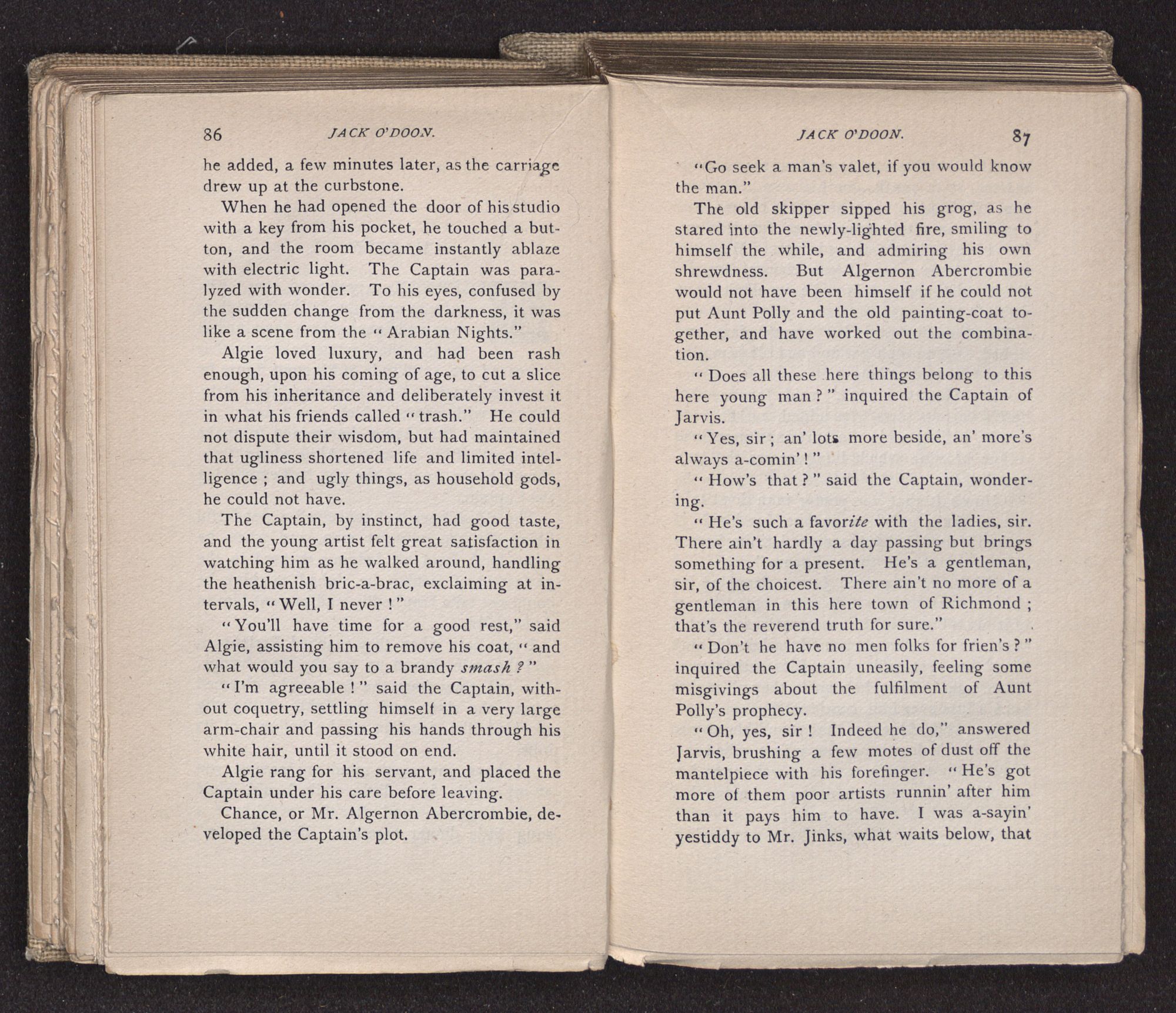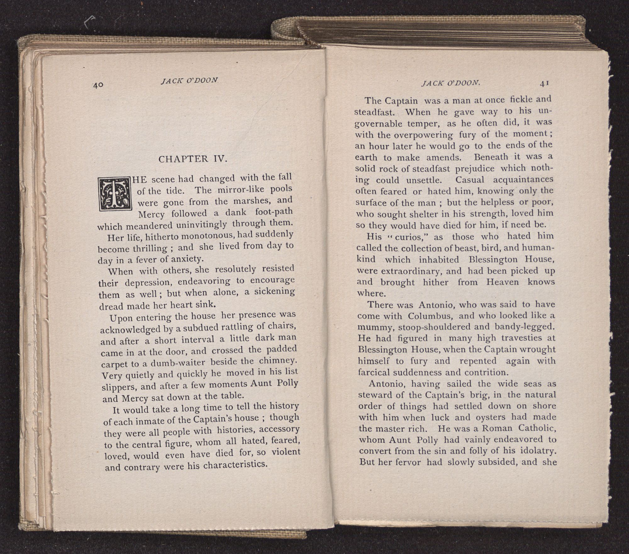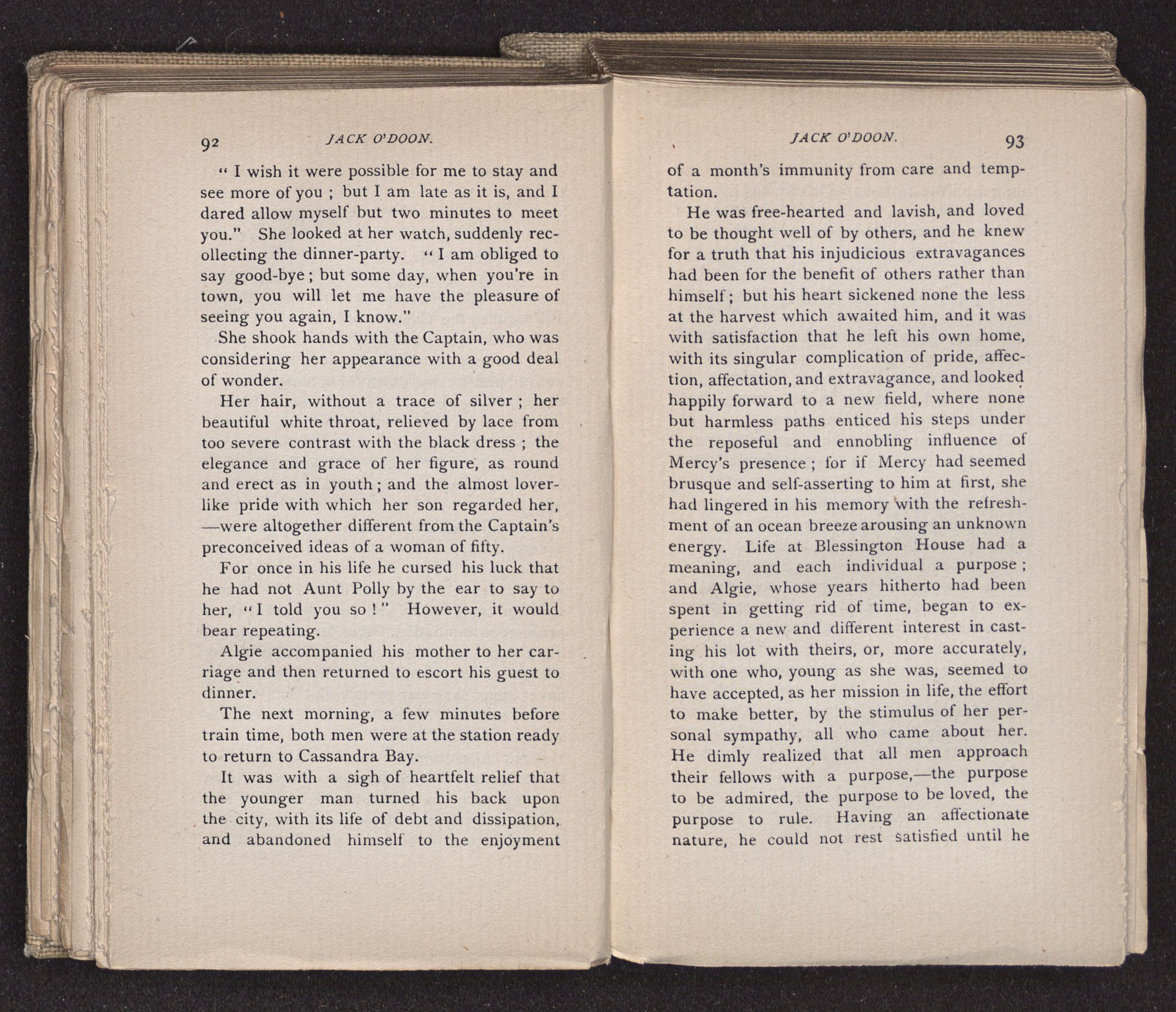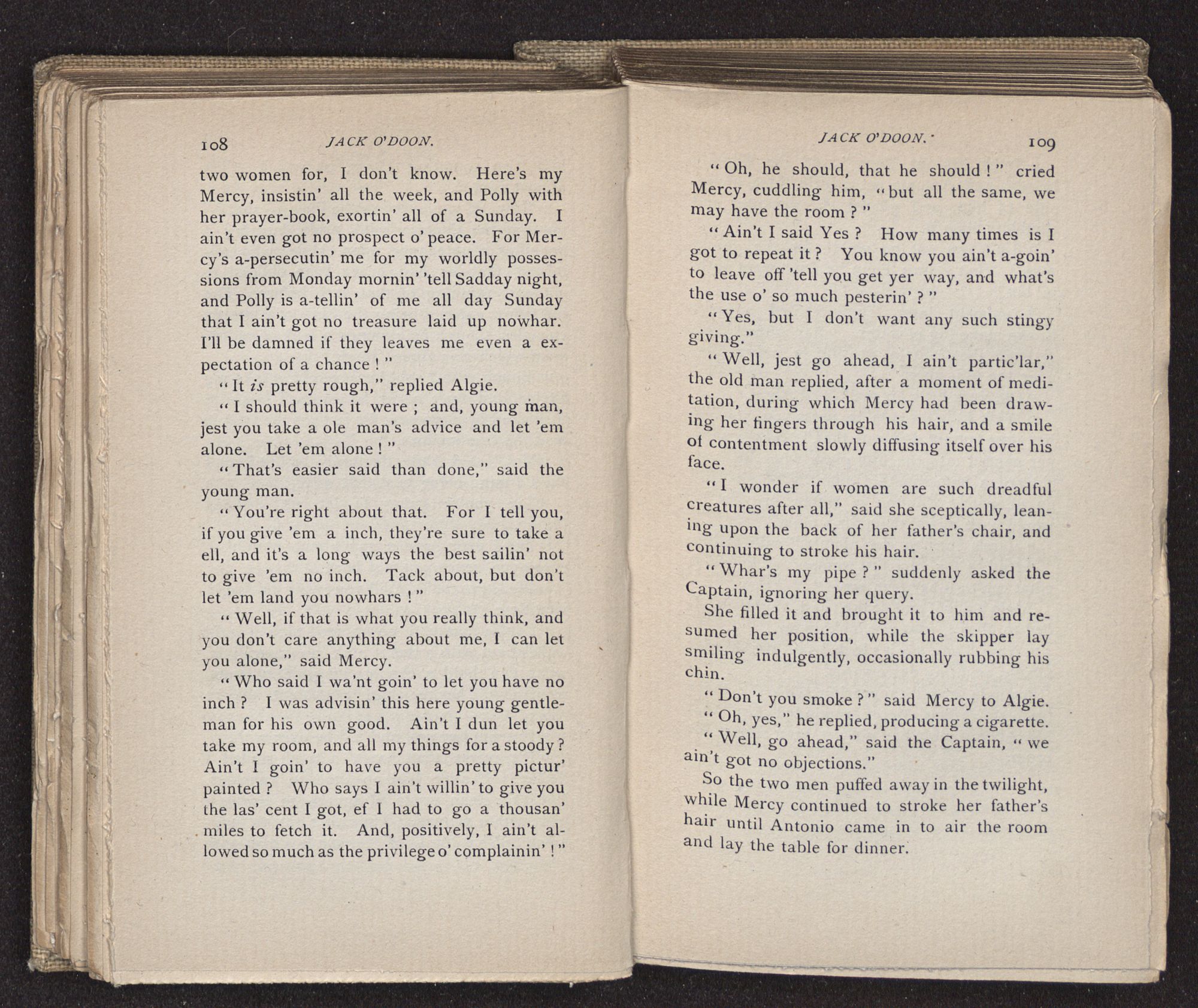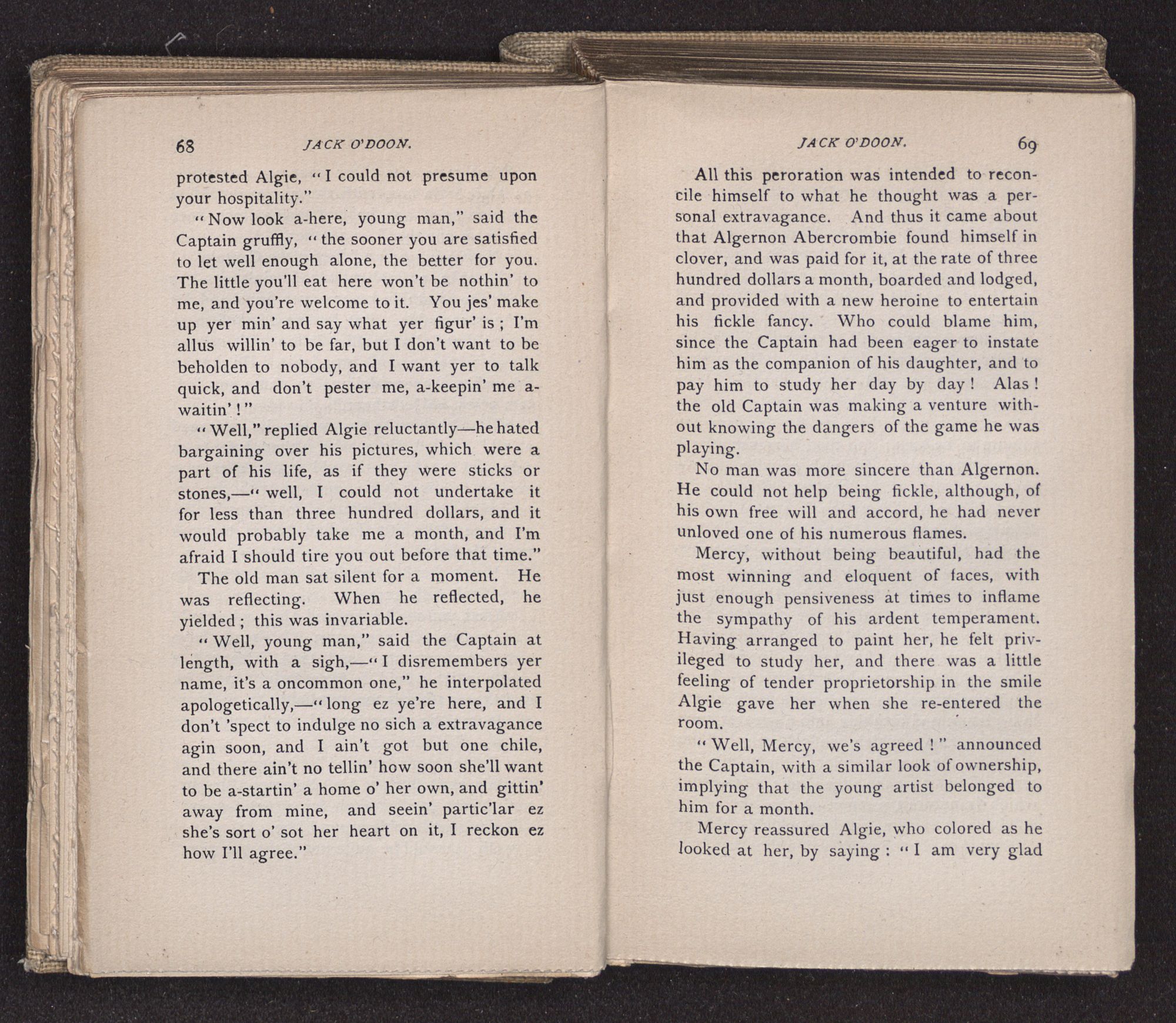 Jack O'Doon, the last of seven sons who had gone down to the sea in ships, was the pride and glory of his mother's heart. She had called him her scholar, and now, seeing his books, with his name upon them, in a bold and clerkly hand, arose, and, with a desperate necessity for expression, kissed them with idolatrous fervor again and again. “My boy, my boy!” she cried, wringing her hands, “he won't come back no more.” The girl looked on, but her eyes were dry; she had not realized it yet. She had not had that tuition of disappointment which at last teaches us to shrink from the most casual separation, as we shrink from death; and so she sat with a mute and reverent sympathy, following Mother Margery with her eyes, unconscious of the strong contrast between herself and her old nurse.