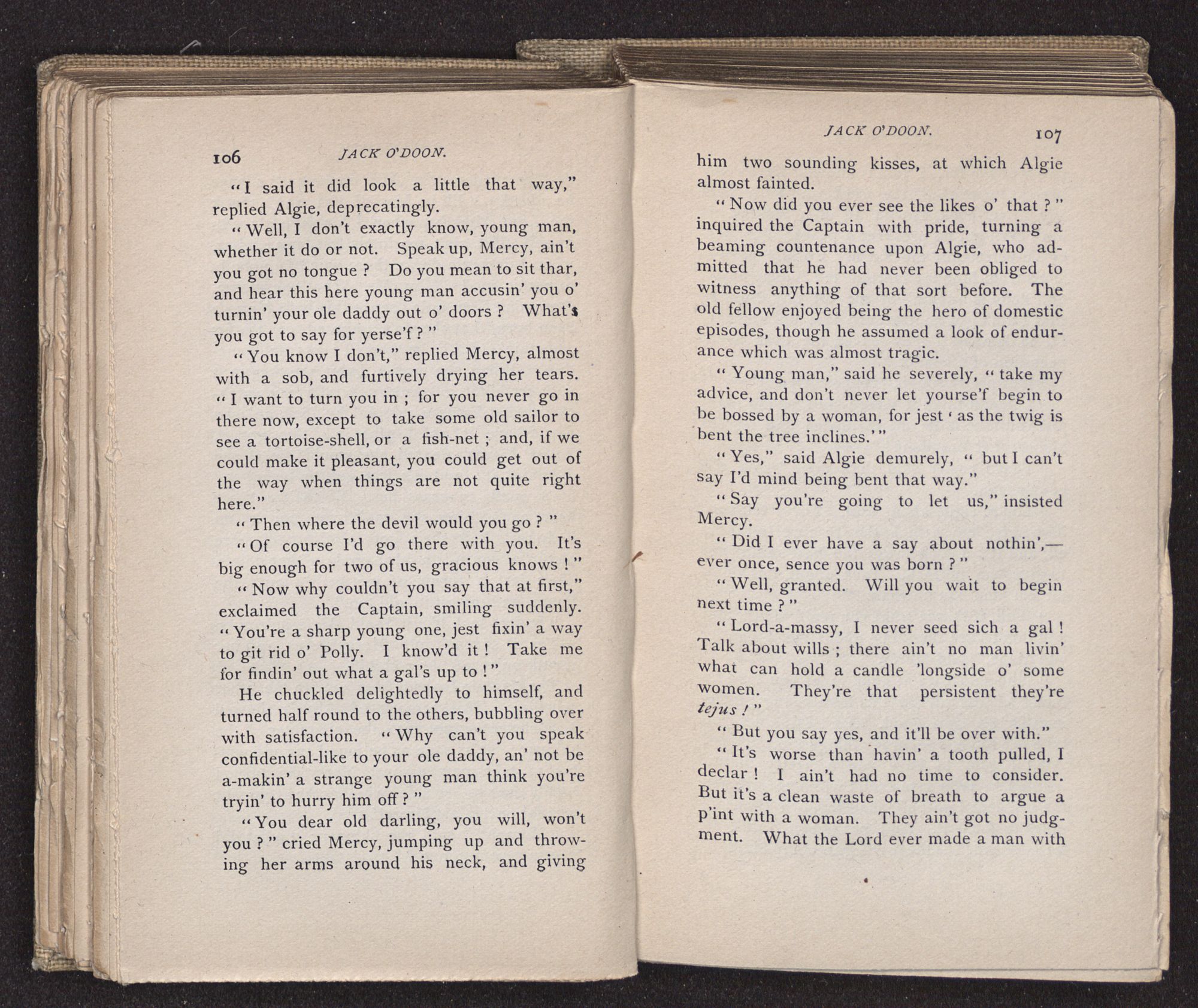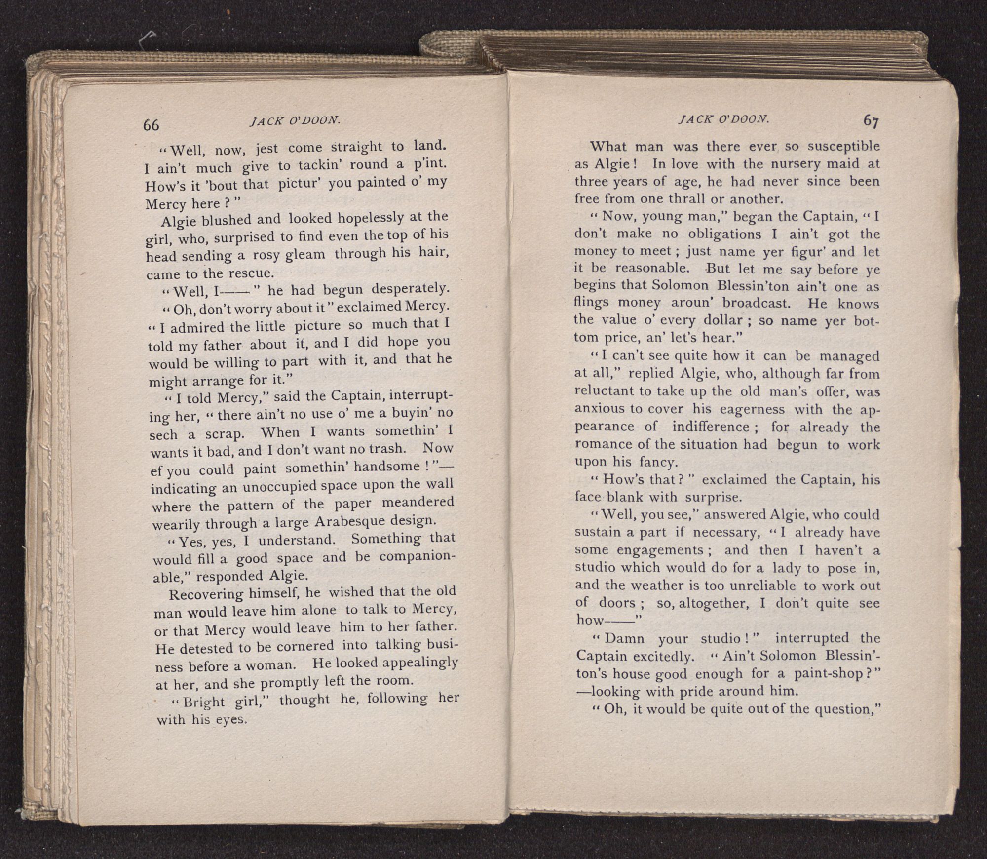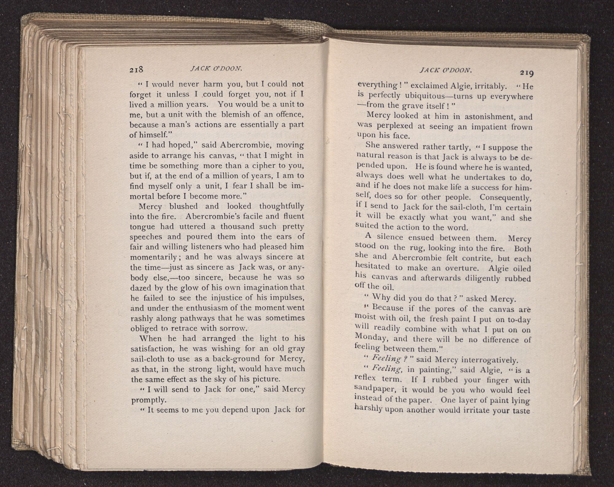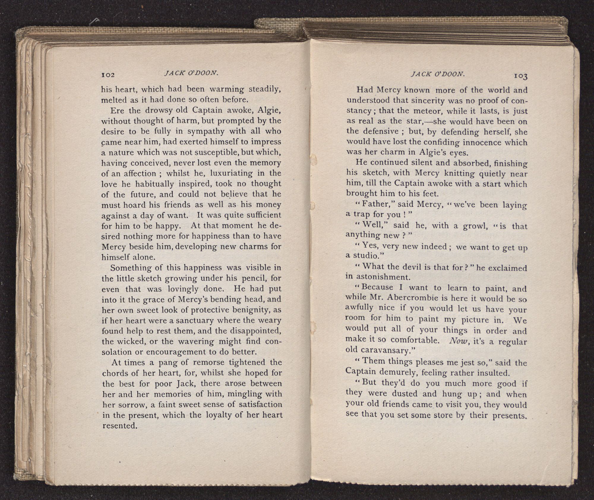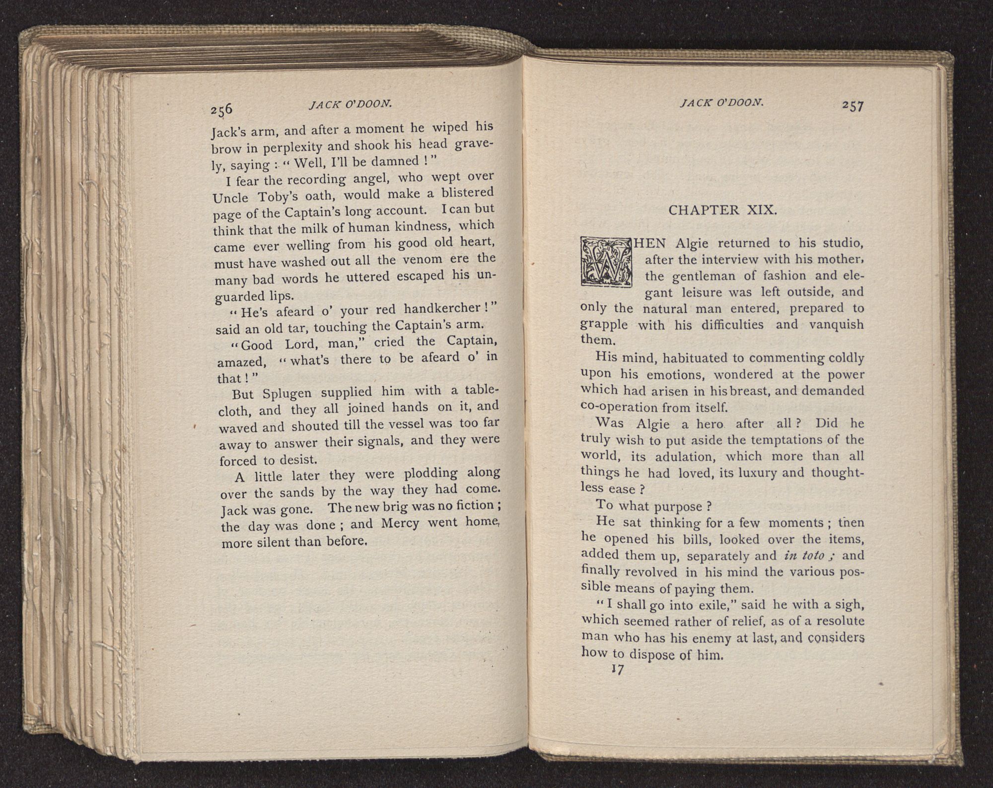 Jack O'Doon, the last of seven sons who had gone down to the sea in ships, was the pride and glory of his mother's heart. She had called him her scholar, and now, seeing his books, with his name upon them, in a bold and clerkly hand, arose, and, with a desperate necessity for expression, kissed them with idolatrous fervor again and again. “My boy, my boy!” she cried, wringing her hands, “he won't come back no more.” The girl looked on, but her eyes were dry; she had not realized it yet. She had not had that tuition of disappointment which at last teaches us to shrink from the most casual separation, as we shrink from death; and so she sat with a mute and reverent sympathy, following Mother Margery with her eyes, unconscious of the strong contrast between herself and her old nurse.