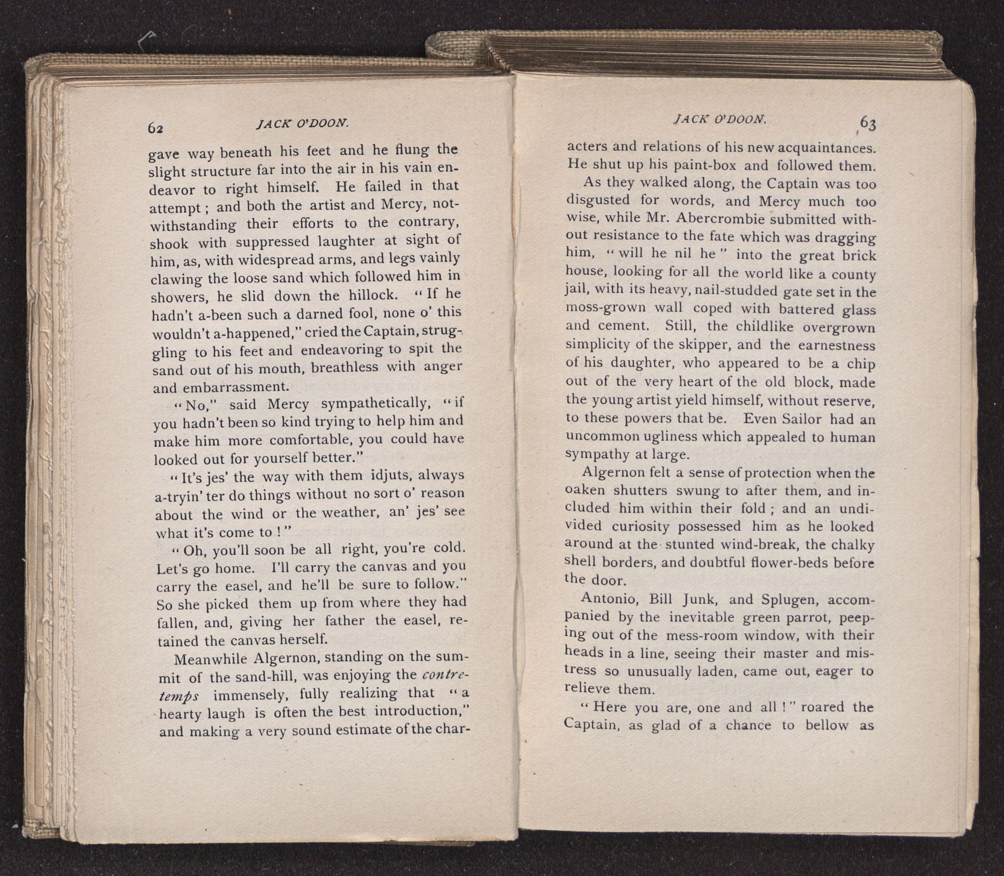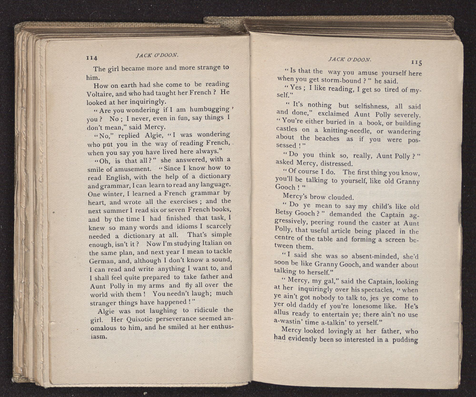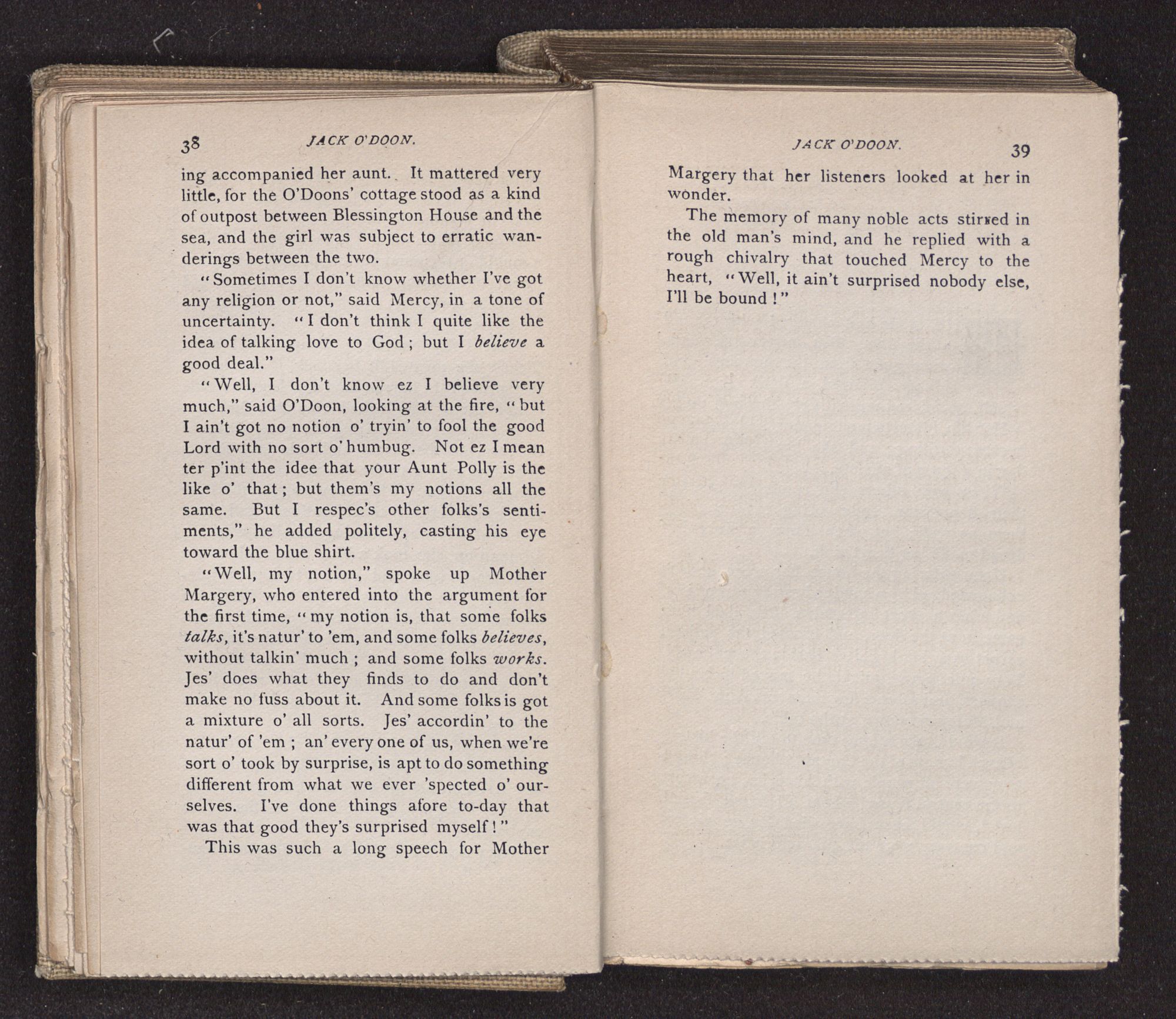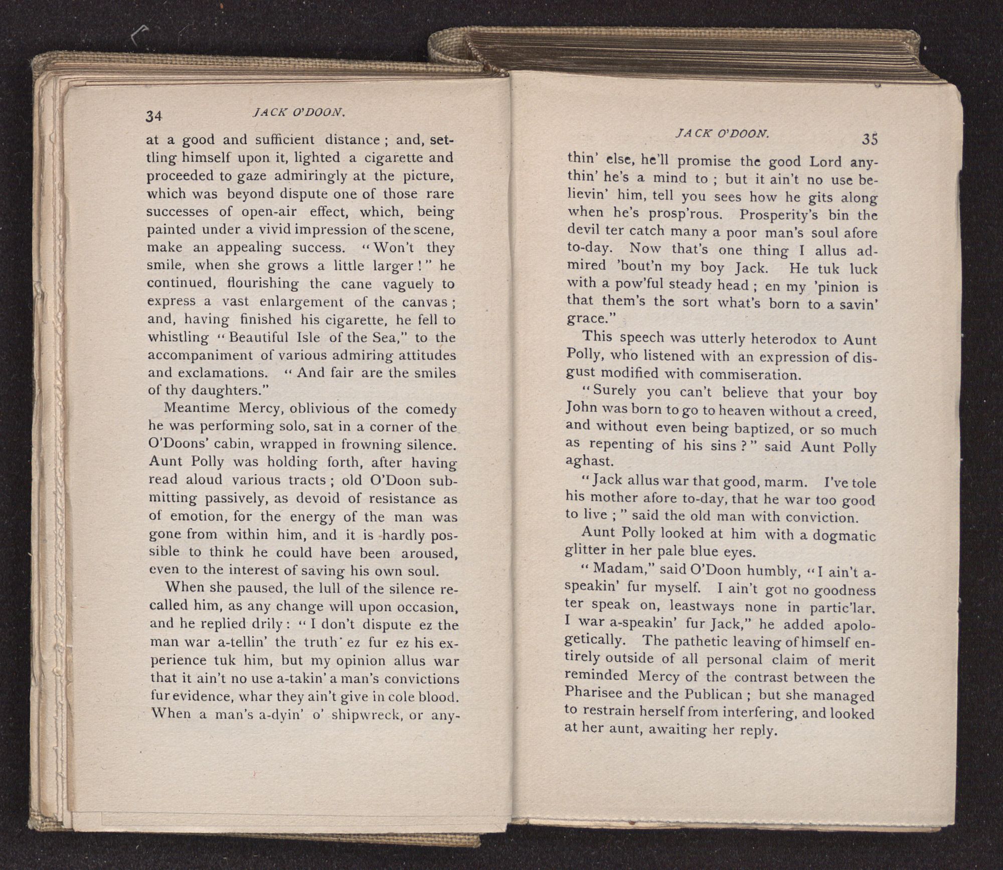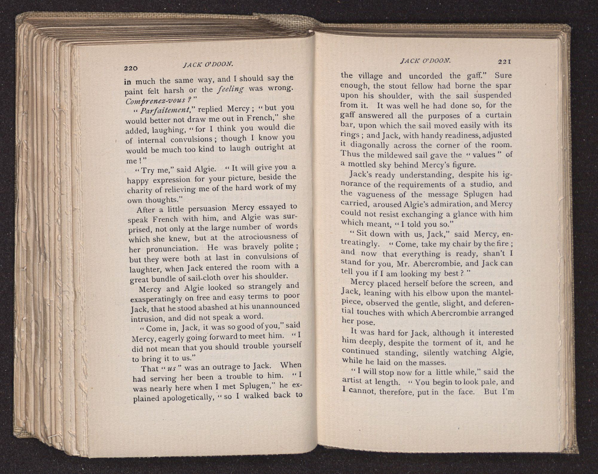 Jack O'Doon, the last of seven sons who had gone down to the sea in ships, was the pride and glory of his mother's heart. She had called him her scholar, and now, seeing his books, with his name upon them, in a bold and clerkly hand, arose, and, with a desperate necessity for expression, kissed them with idolatrous fervor again and again. “My boy, my boy!” she cried, wringing her hands, “he won't come back no more.” The girl looked on, but her eyes were dry; she had not realized it yet. She had not had that tuition of disappointment which at last teaches us to shrink from the most casual separation, as we shrink from death; and so she sat with a mute and reverent sympathy, following Mother Margery with her eyes, unconscious of the strong contrast between herself and her old nurse.