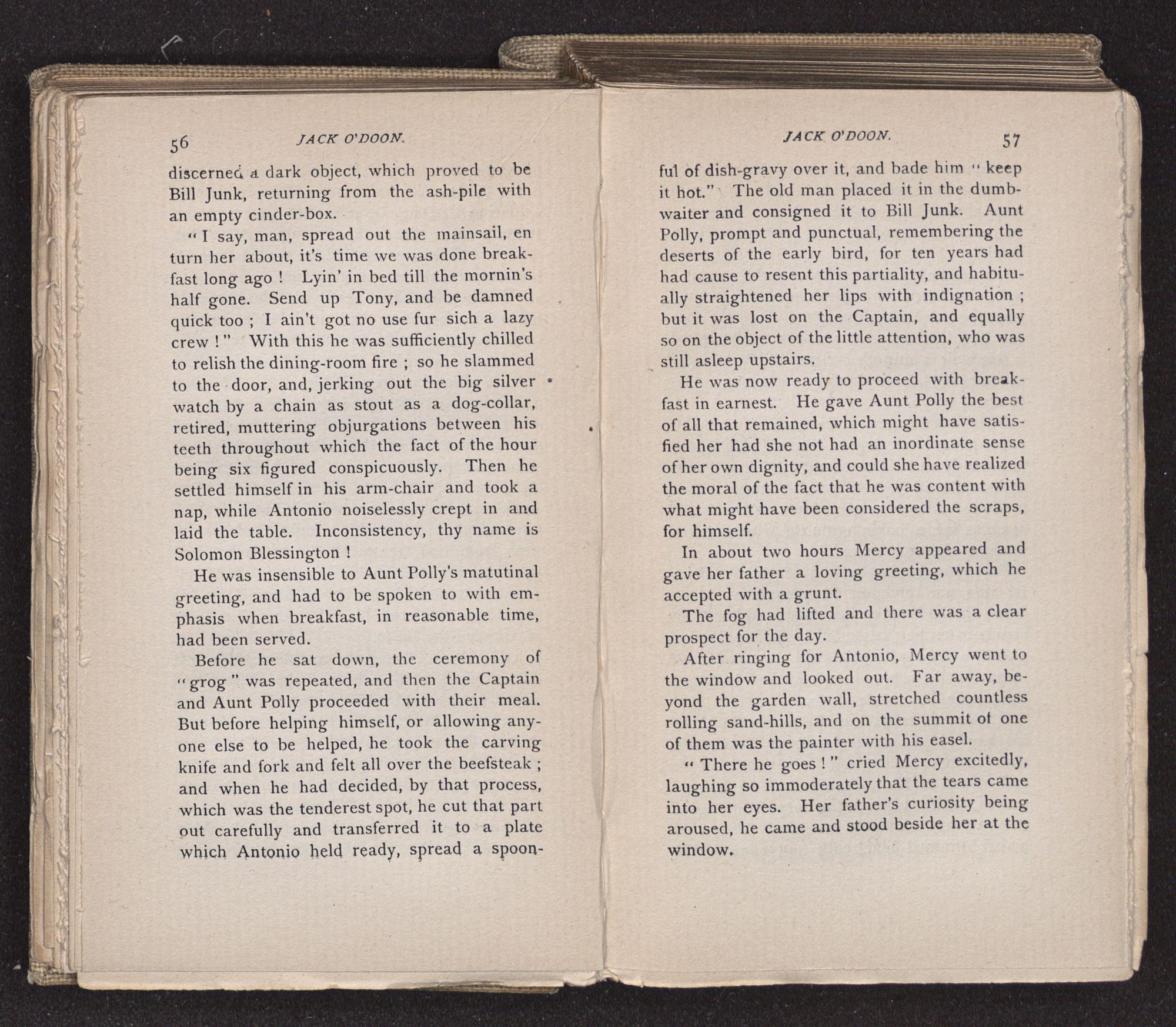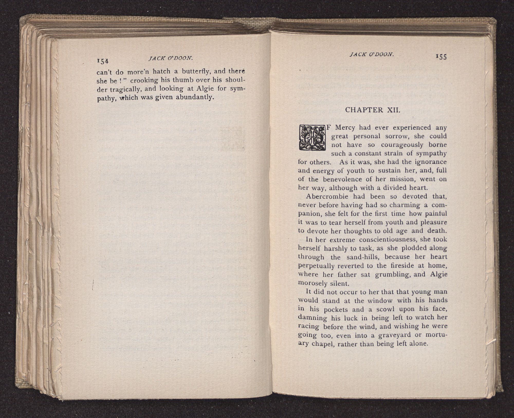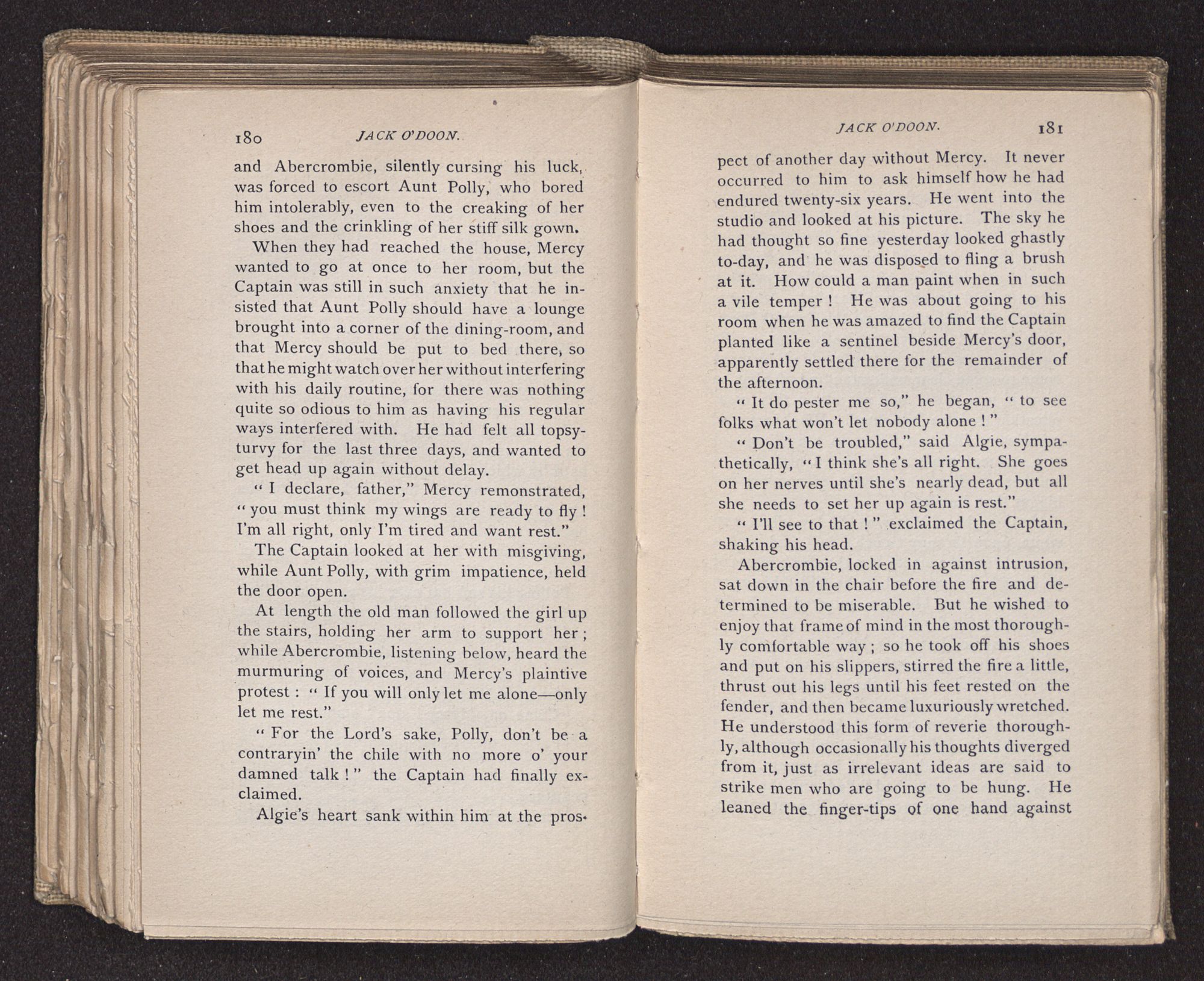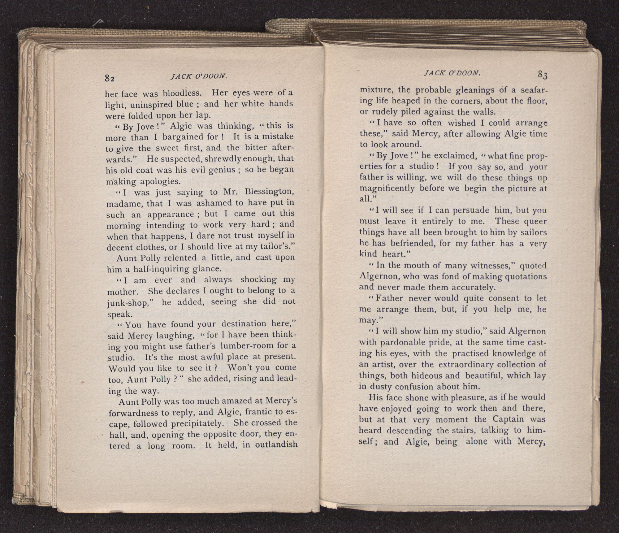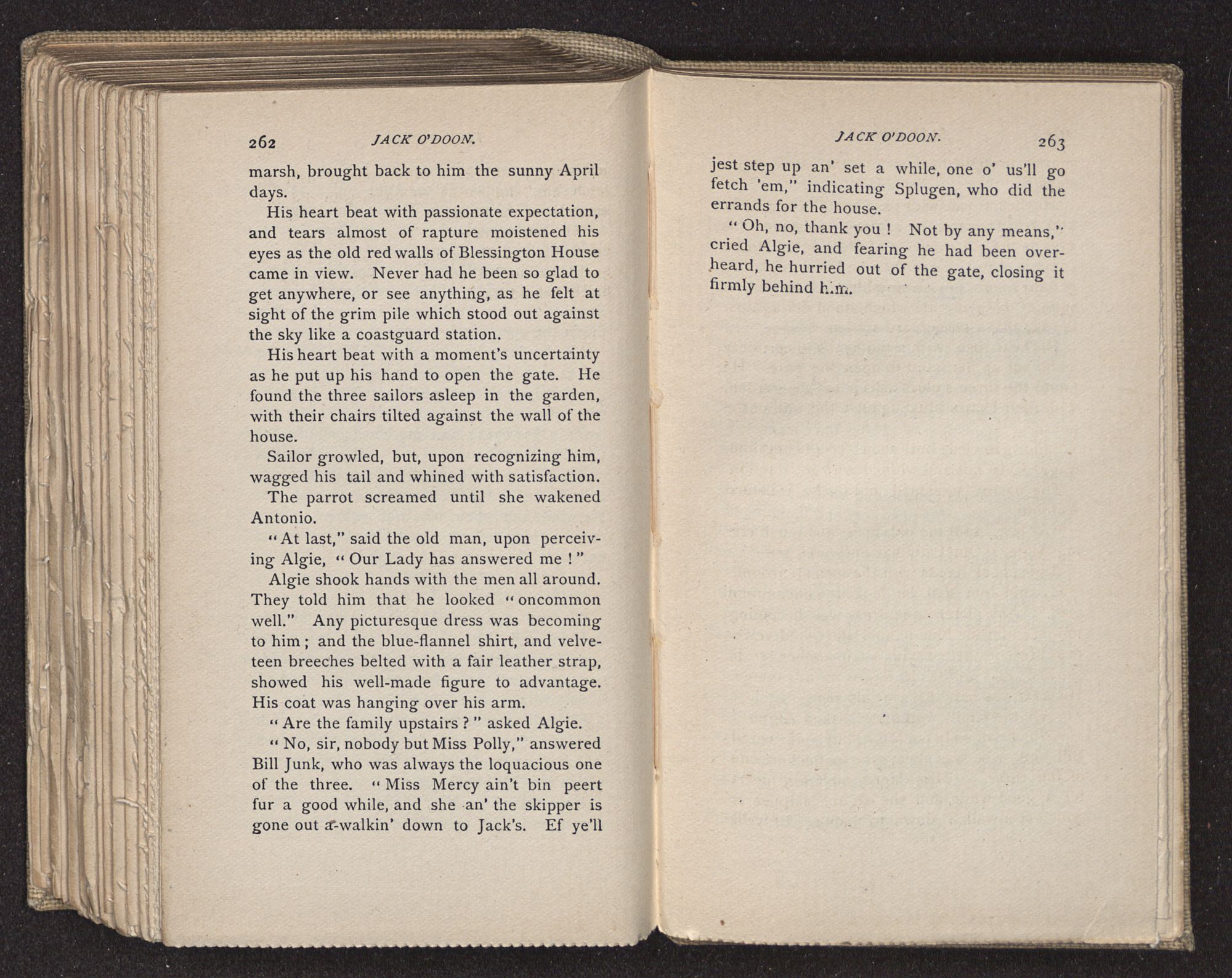 Jack O'Doon, the last of seven sons who had gone down to the sea in ships, was the pride and glory of his mother's heart. She had called him her scholar, and now, seeing his books, with his name upon them, in a bold and clerkly hand, arose, and, with a desperate necessity for expression, kissed them with idolatrous fervor again and again. “My boy, my boy!” she cried, wringing her hands, “he won't come back no more.” The girl looked on, but her eyes were dry; she had not realized it yet. She had not had that tuition of disappointment which at last teaches us to shrink from the most casual separation, as we shrink from death; and so she sat with a mute and reverent sympathy, following Mother Margery with her eyes, unconscious of the strong contrast between herself and her old nurse.