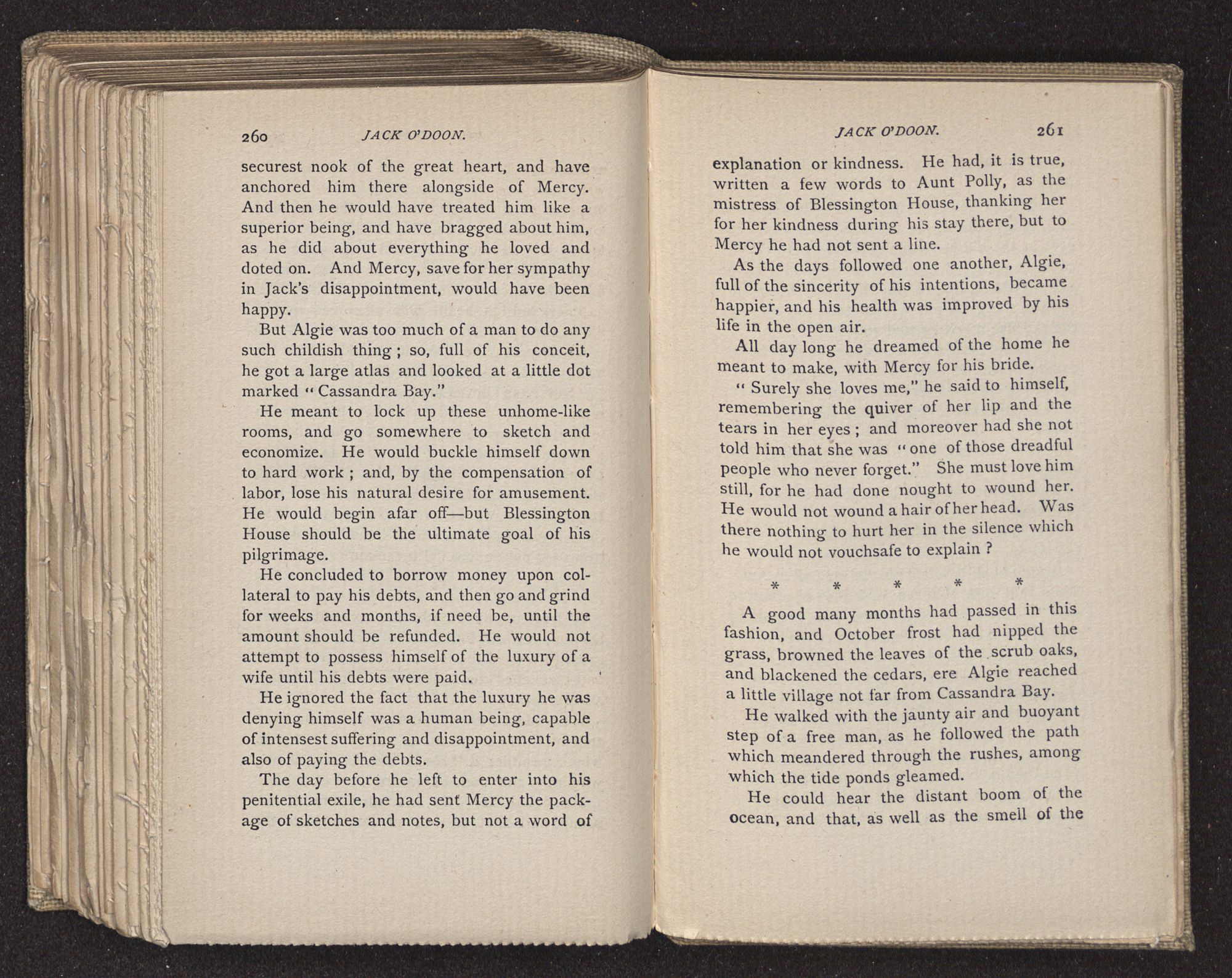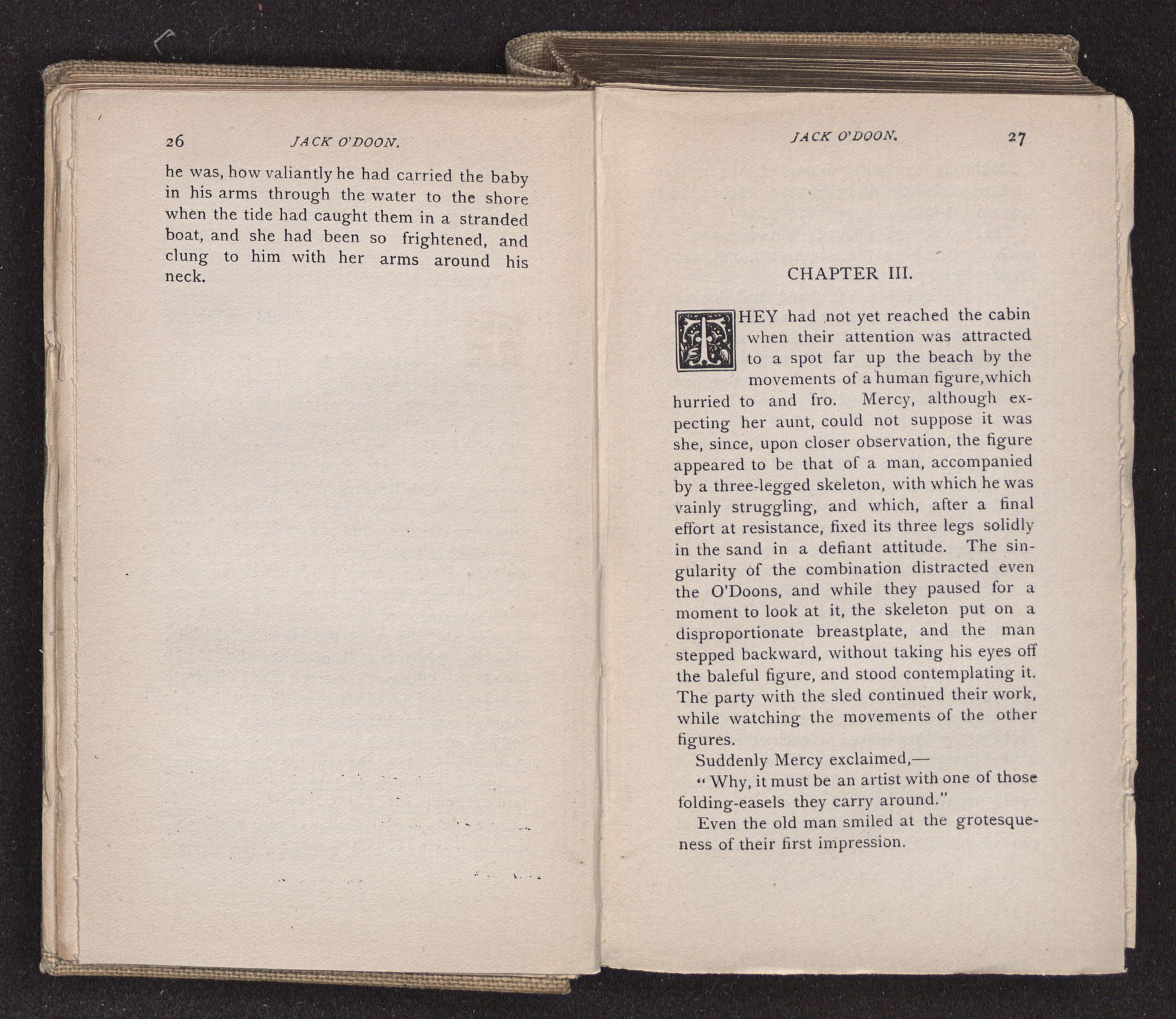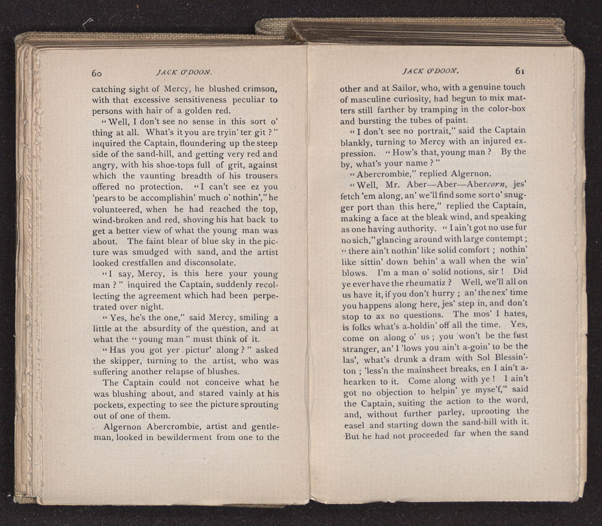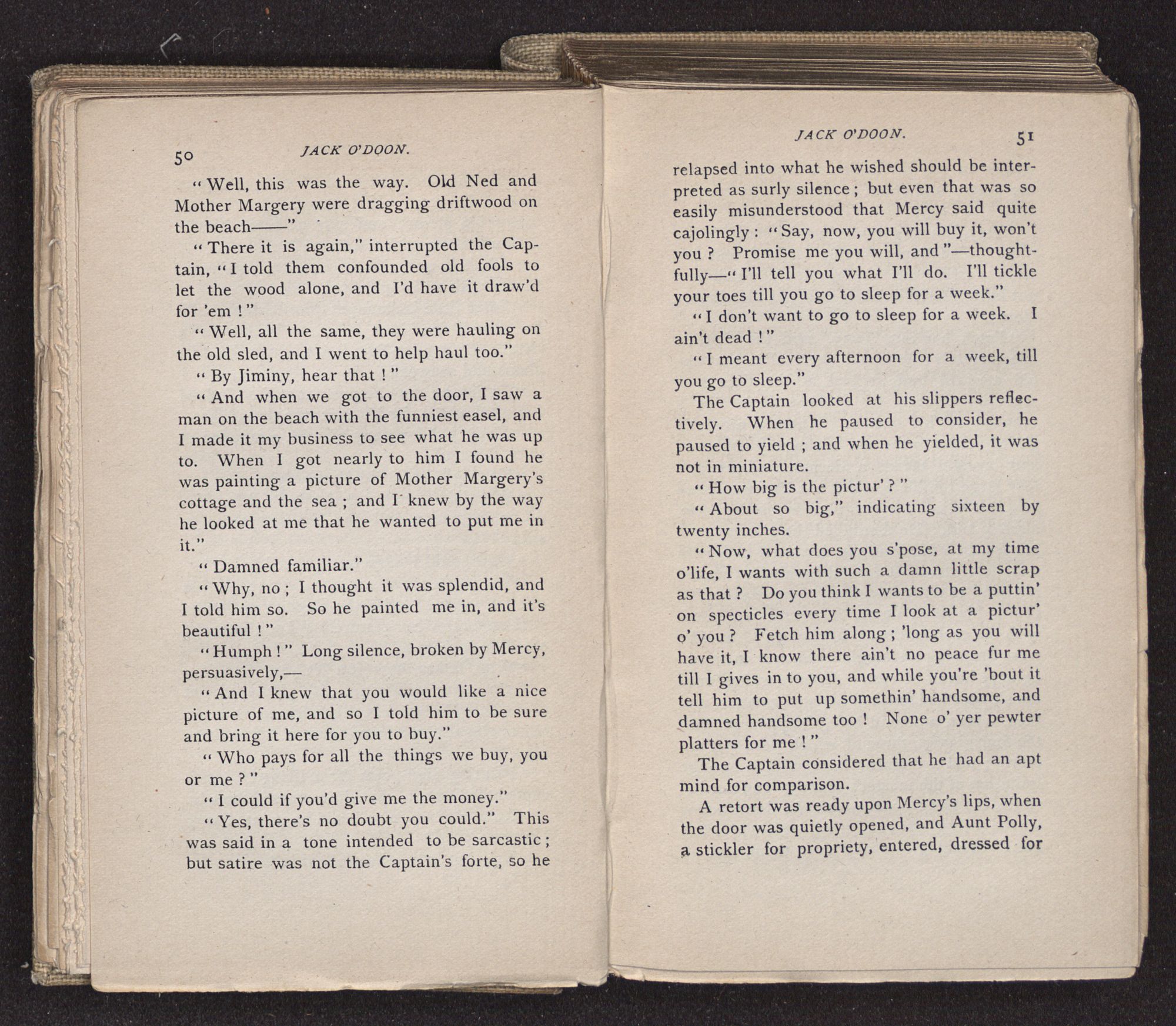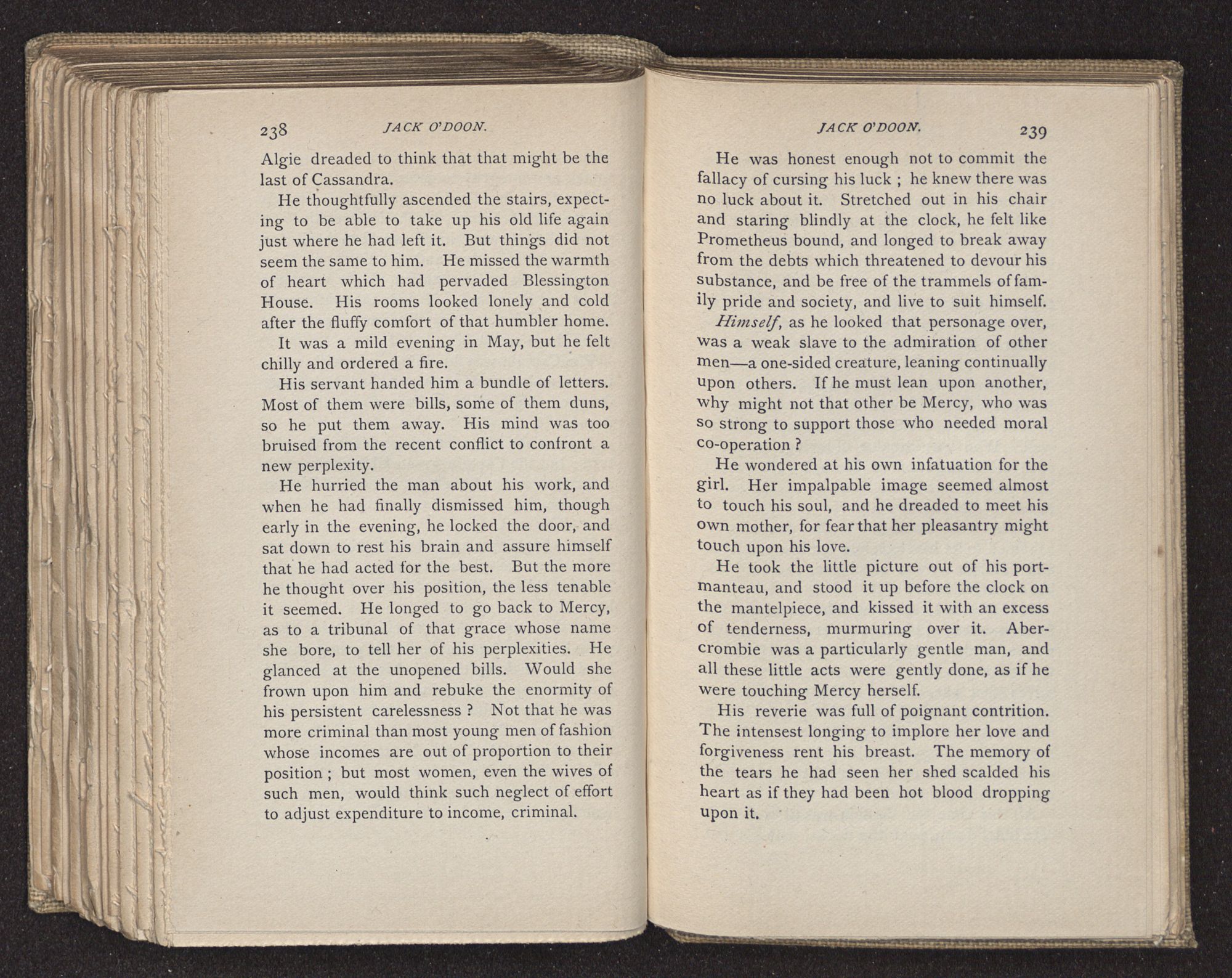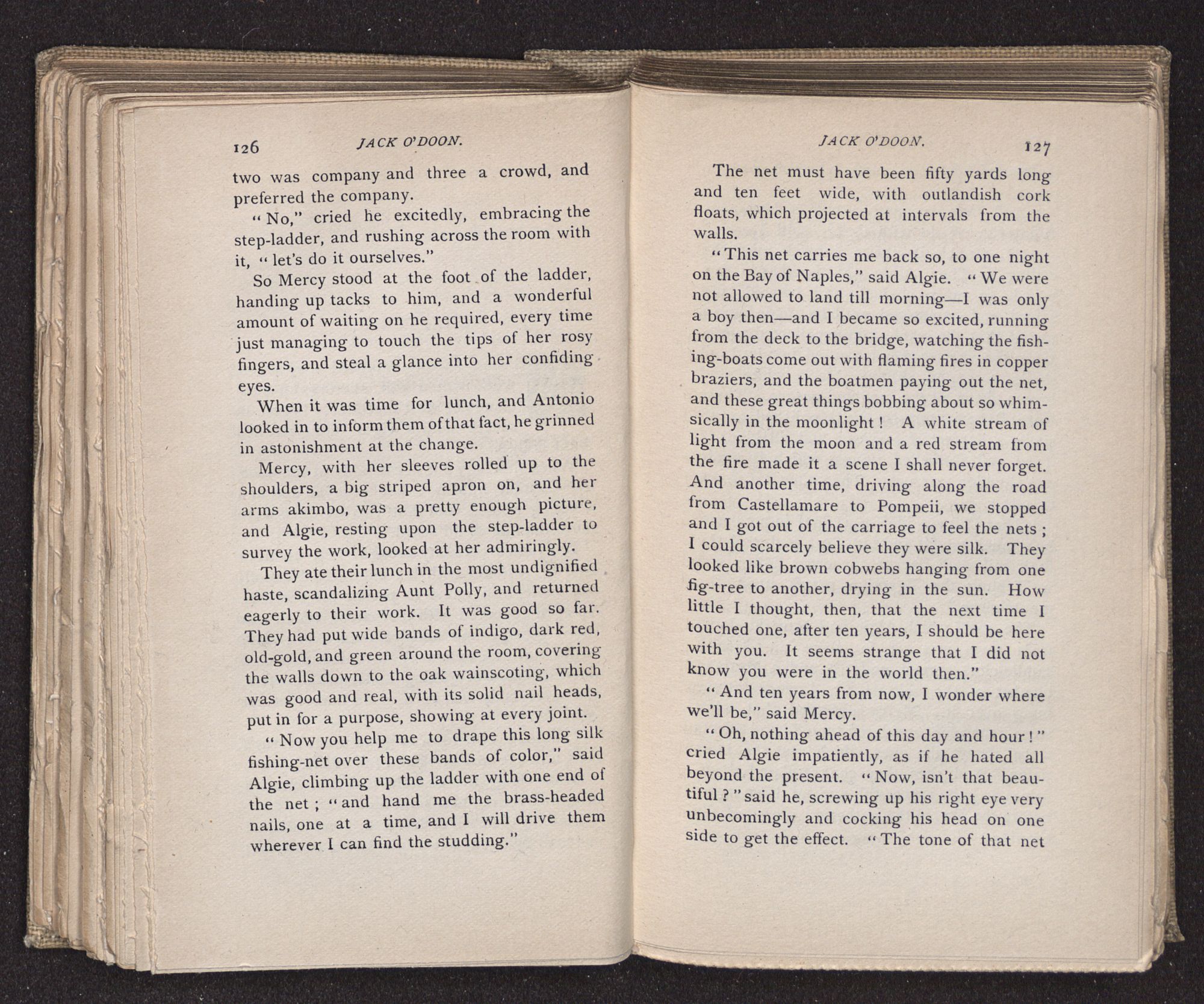 Jack O'Doon, the last of seven sons who had gone down to the sea in ships, was the pride and glory of his mother's heart. She had called him her scholar, and now, seeing his books, with his name upon them, in a bold and clerkly hand, arose, and, with a desperate necessity for expression, kissed them with idolatrous fervor again and again. “My boy, my boy!” she cried, wringing her hands, “he won't come back no more.” The girl looked on, but her eyes were dry; she had not realized it yet. She had not had that tuition of disappointment which at last teaches us to shrink from the most casual separation, as we shrink from death; and so she sat with a mute and reverent sympathy, following Mother Margery with her eyes, unconscious of the strong contrast between herself and her old nurse.