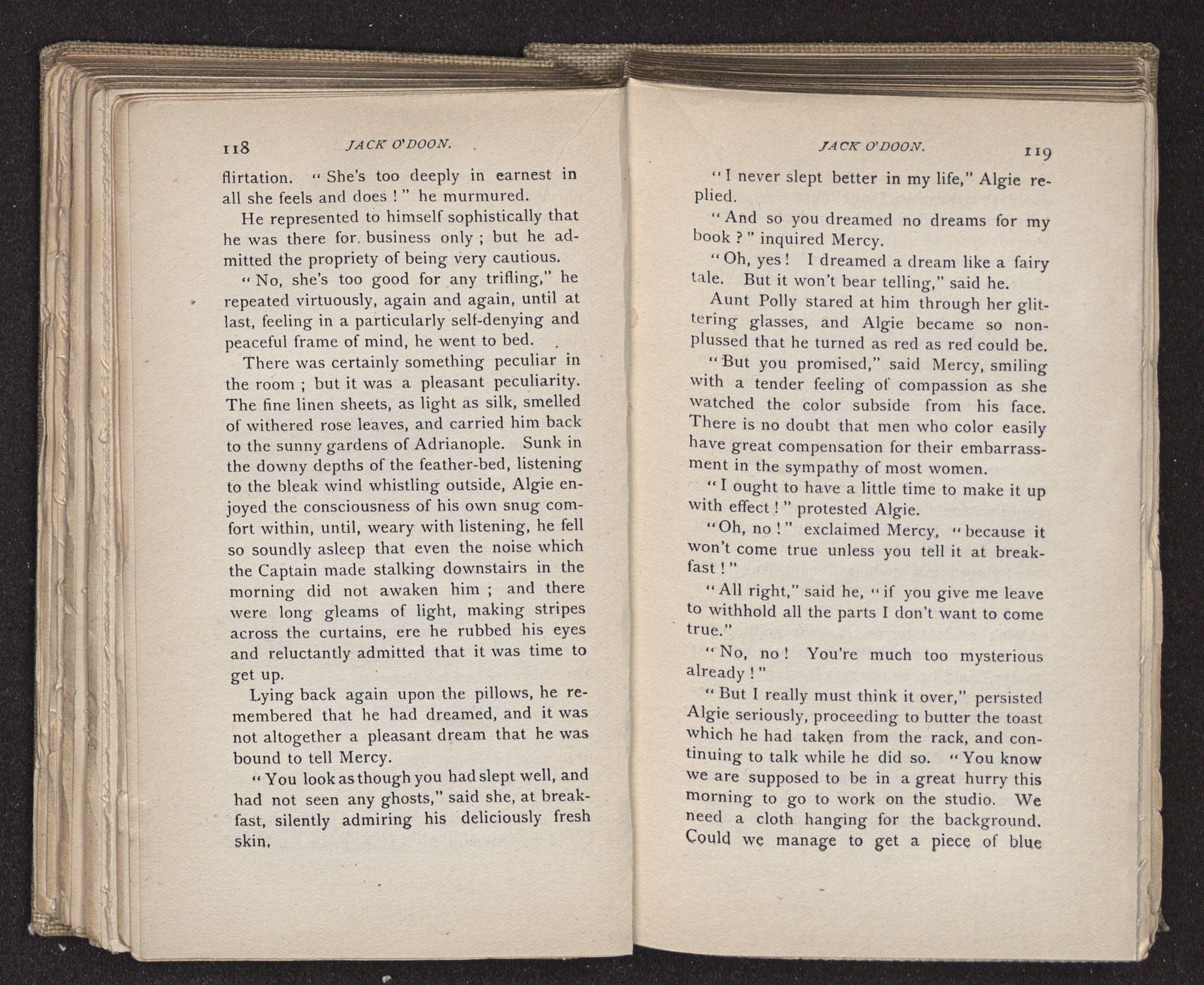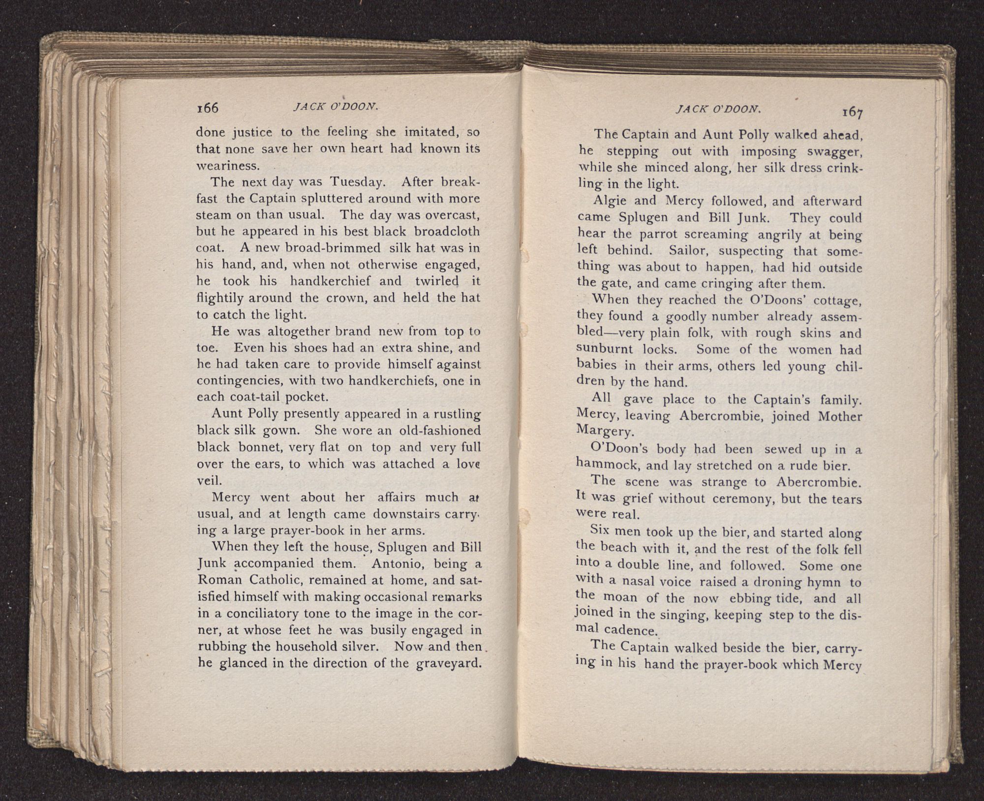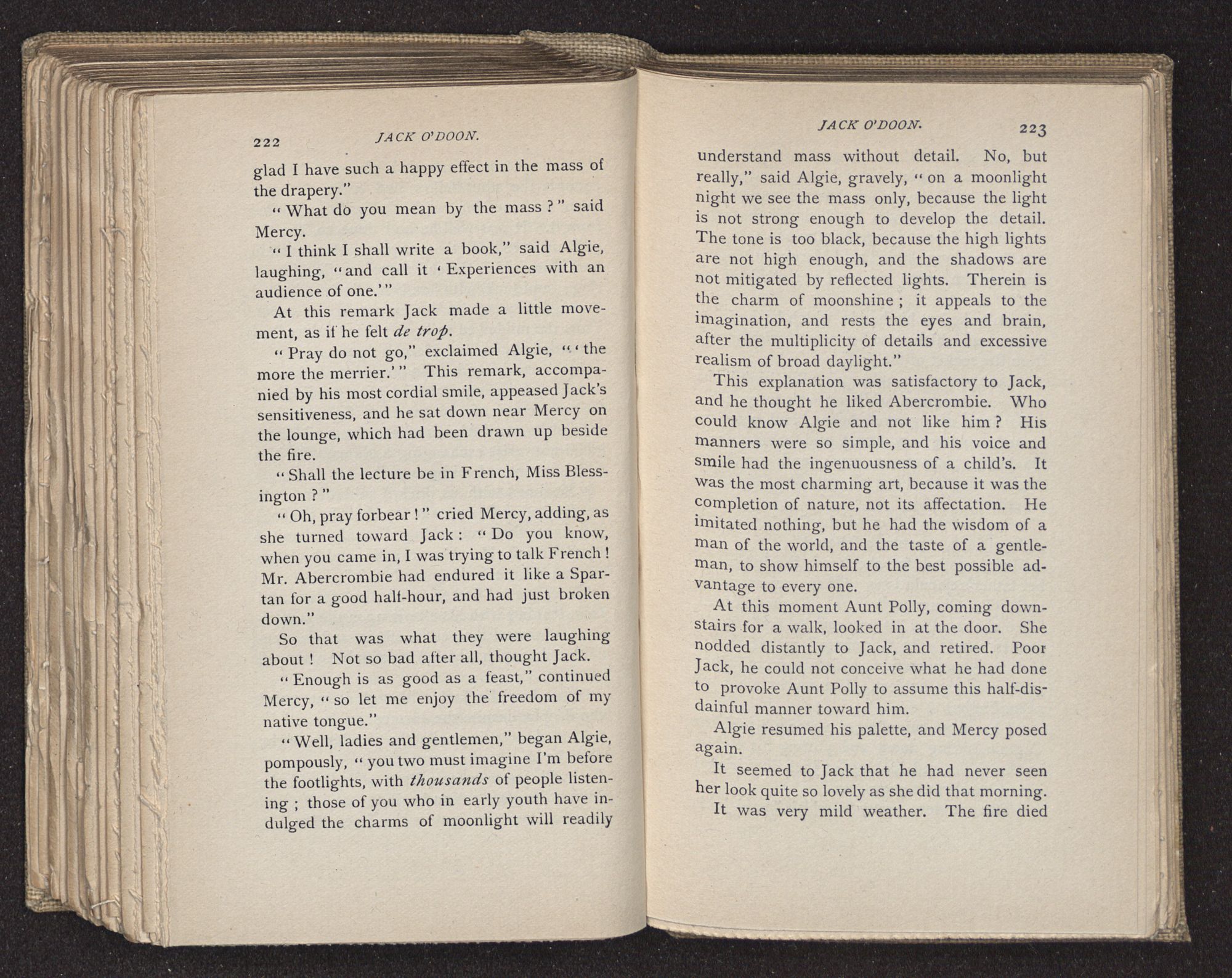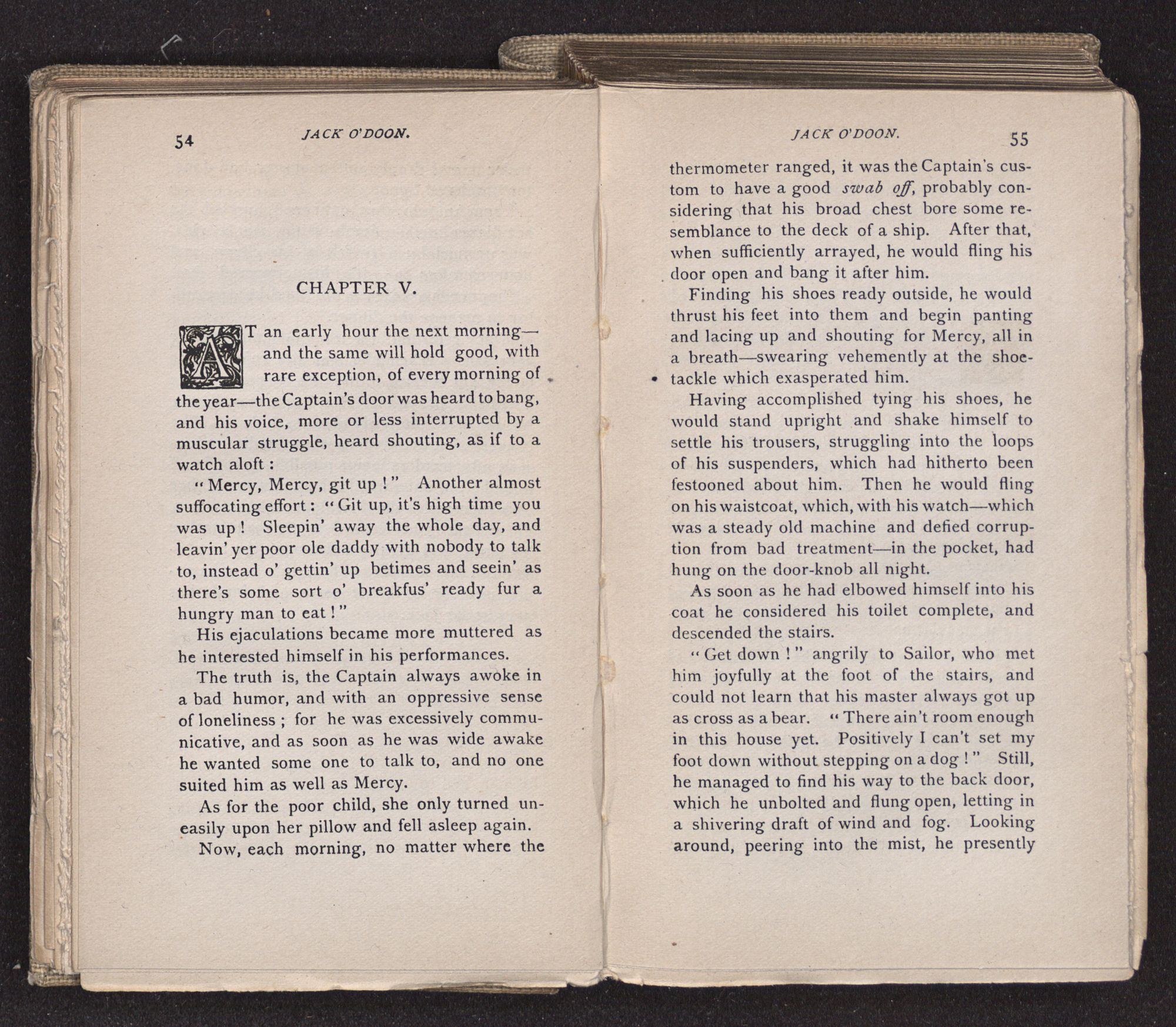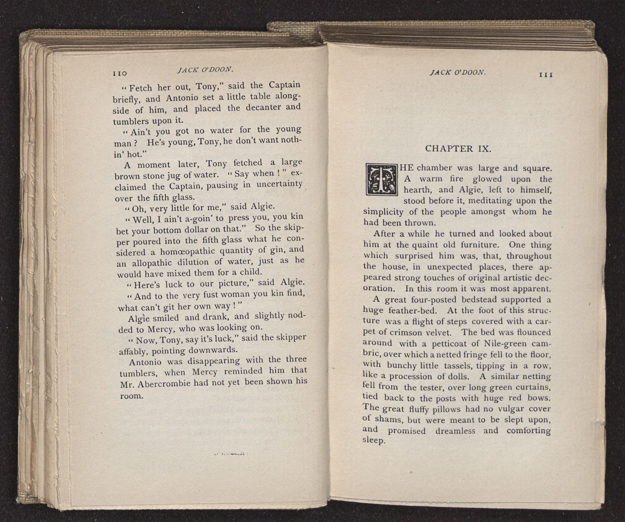 Jack O'Doon, the last of seven sons who had gone down to the sea in ships, was the pride and glory of his mother's heart. She had called him her scholar, and now, seeing his books, with his name upon them, in a bold and clerkly hand, arose, and, with a desperate necessity for expression, kissed them with idolatrous fervor again and again. “My boy, my boy!” she cried, wringing her hands, “he won't come back no more.” The girl looked on, but her eyes were dry; she had not realized it yet. She had not had that tuition of disappointment which at last teaches us to shrink from the most casual separation, as we shrink from death; and so she sat with a mute and reverent sympathy, following Mother Margery with her eyes, unconscious of the strong contrast between herself and her old nurse.