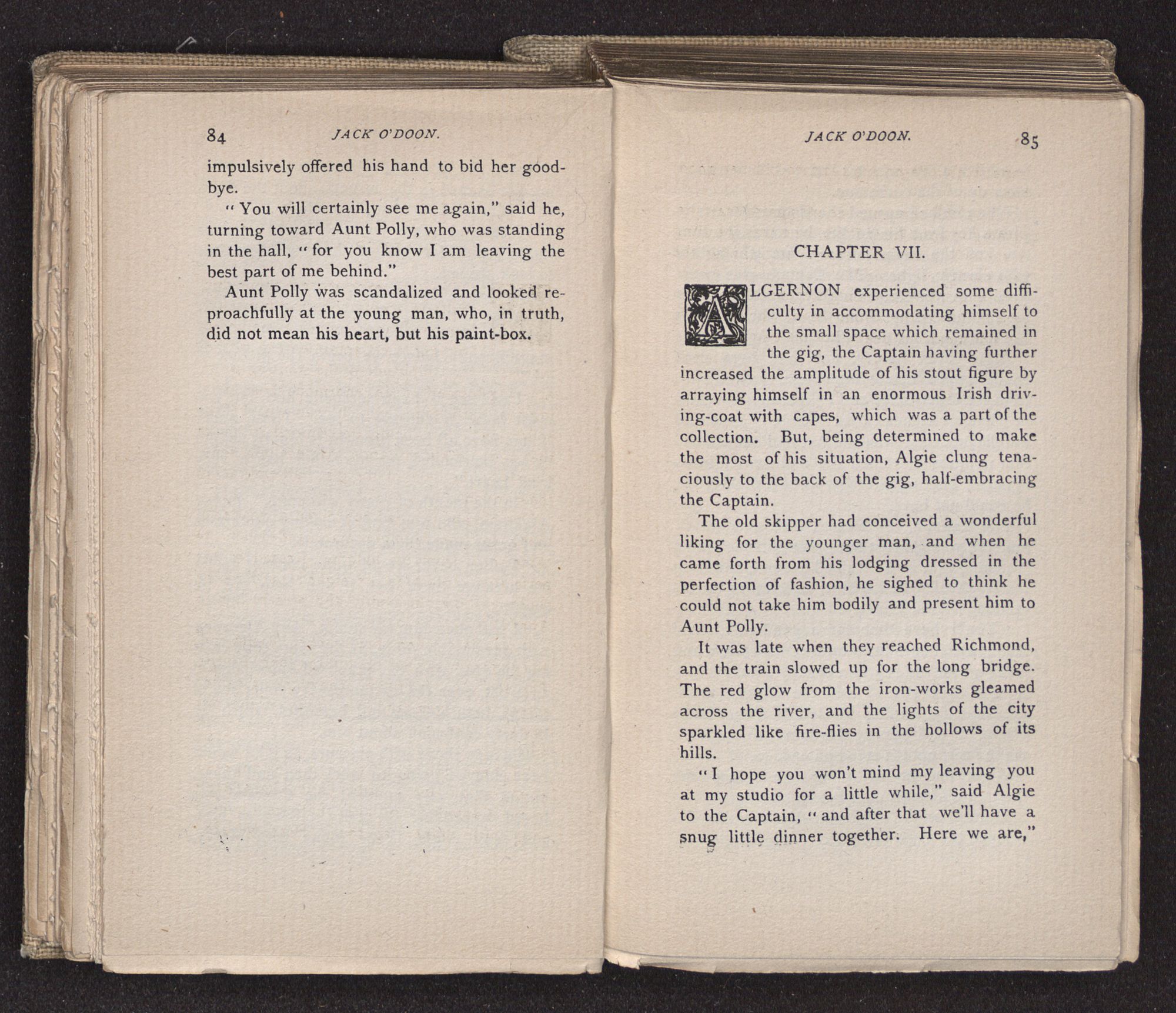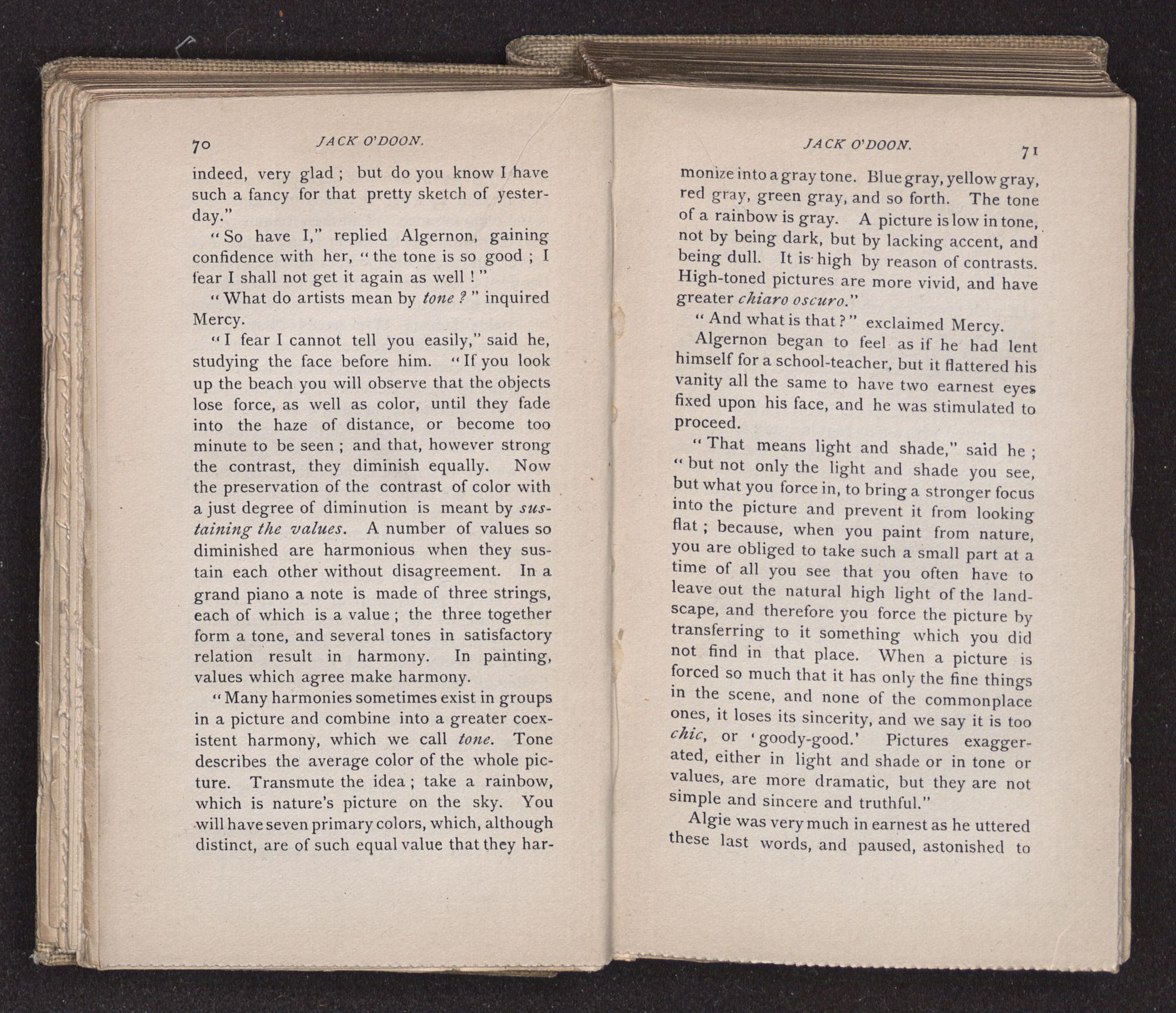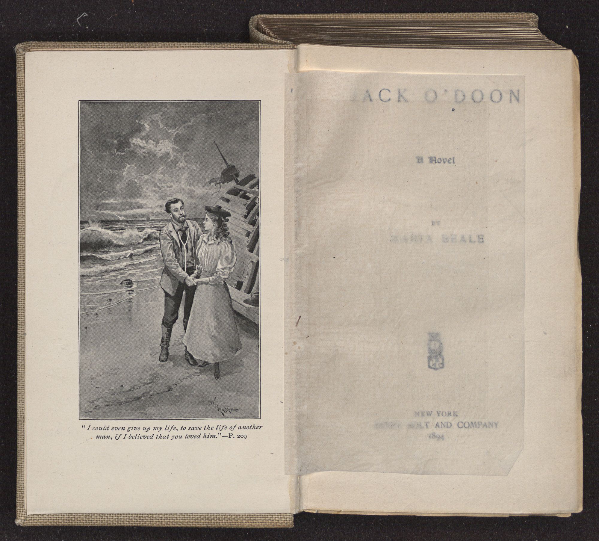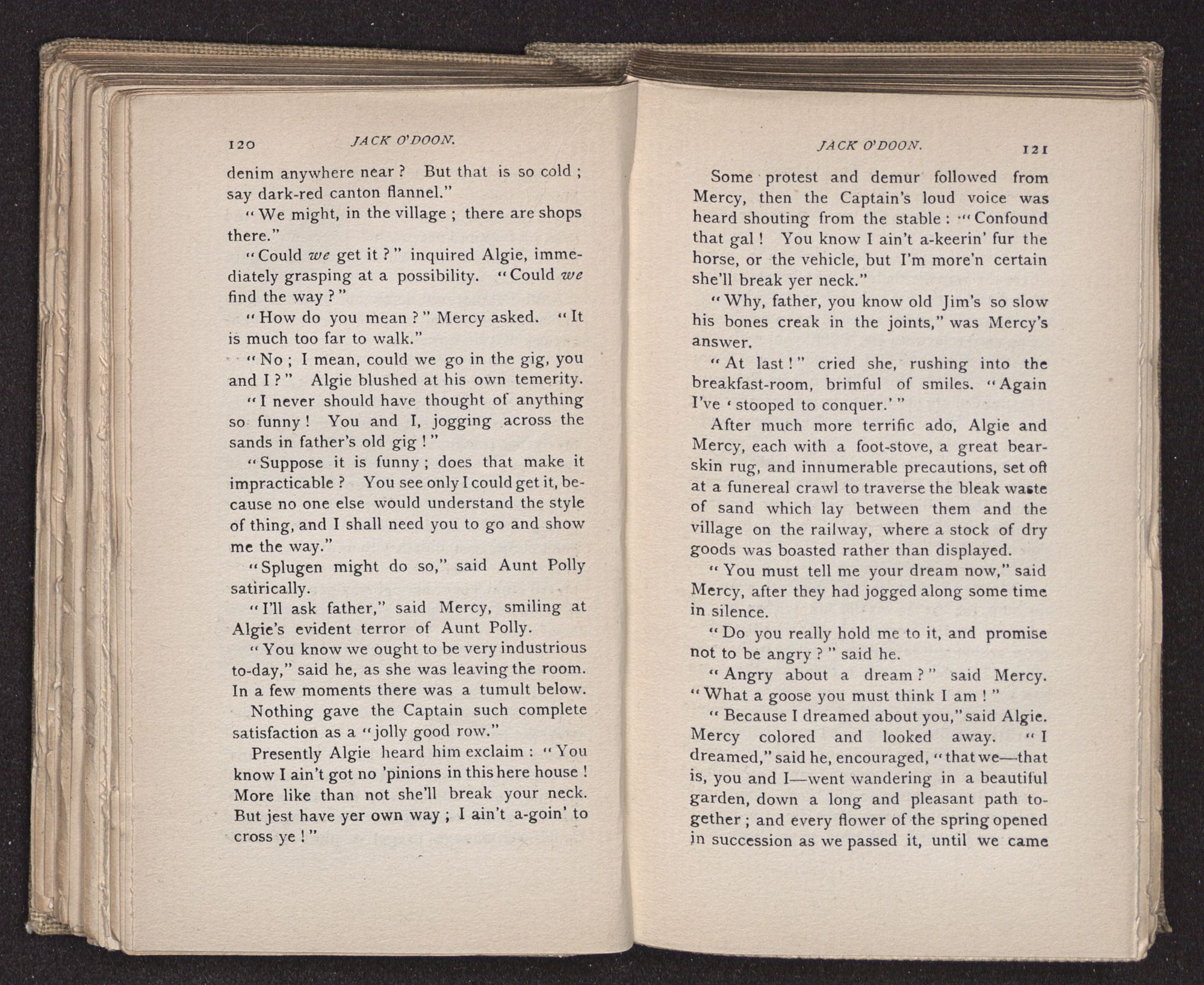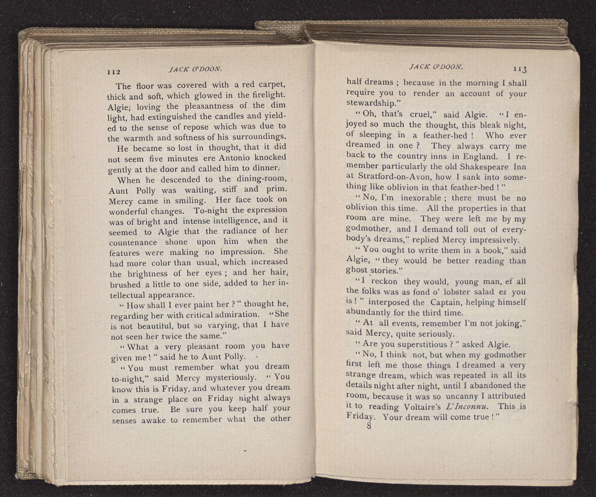 Jack O'Doon, the last of seven sons who had gone down to the sea in ships, was the pride and glory of his mother's heart. She had called him her scholar, and now, seeing his books, with his name upon them, in a bold and clerkly hand, arose, and, with a desperate necessity for expression, kissed them with idolatrous fervor again and again. “My boy, my boy!” she cried, wringing her hands, “he won't come back no more.” The girl looked on, but her eyes were dry; she had not realized it yet. She had not had that tuition of disappointment which at last teaches us to shrink from the most casual separation, as we shrink from death; and so she sat with a mute and reverent sympathy, following Mother Margery with her eyes, unconscious of the strong contrast between herself and her old nurse.