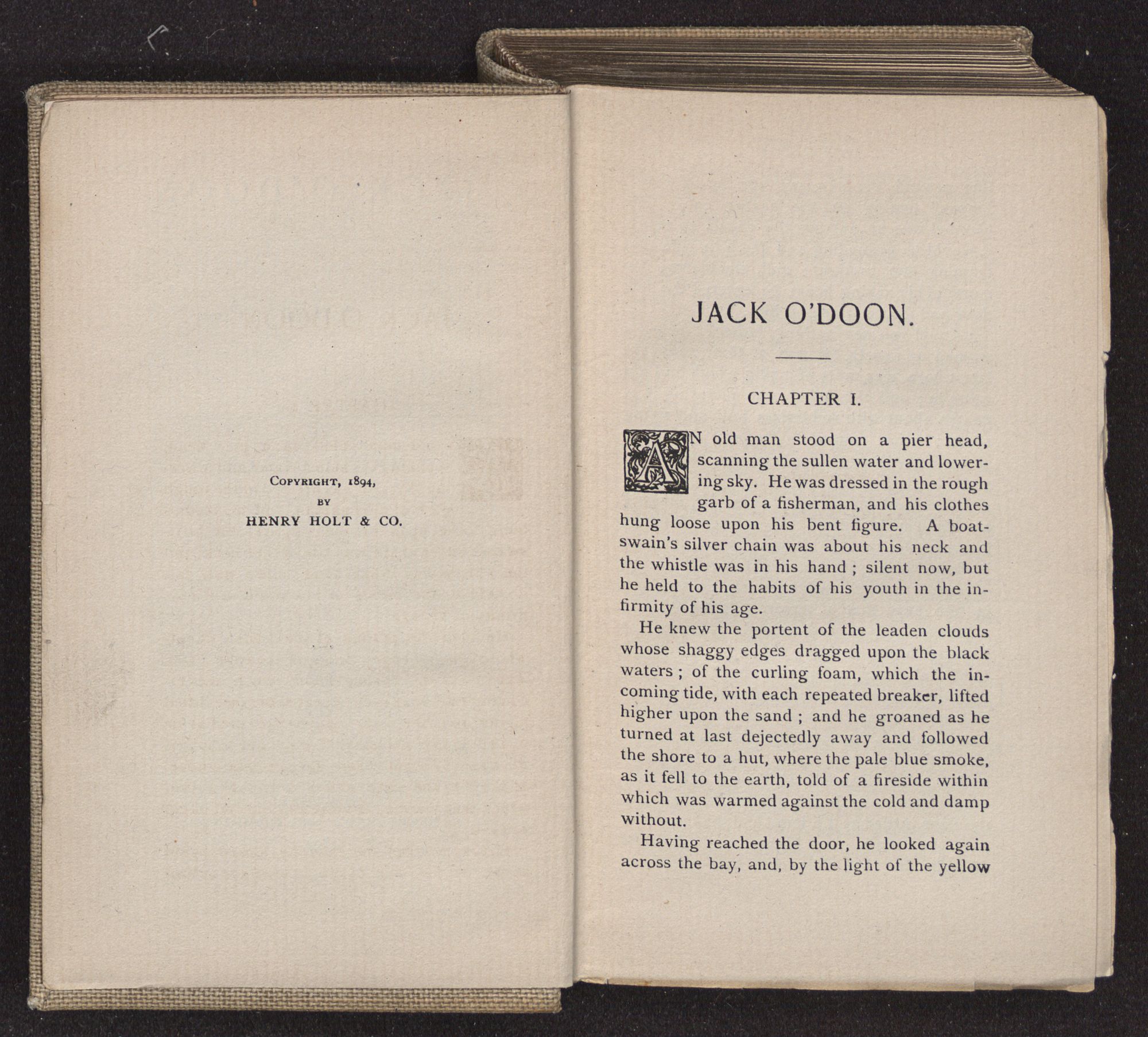CHAPTER I.AN old man stood on a pier head, scanning the sullen water and lowering sky. He was dressed in the rough garb of a fisherman, and his clothes hung loose upon his bent figure. A boatswain's silver chain was about his neck and the whistle was in his hand; silent now, but he held to the habits of his youth in the infirmity of his age.