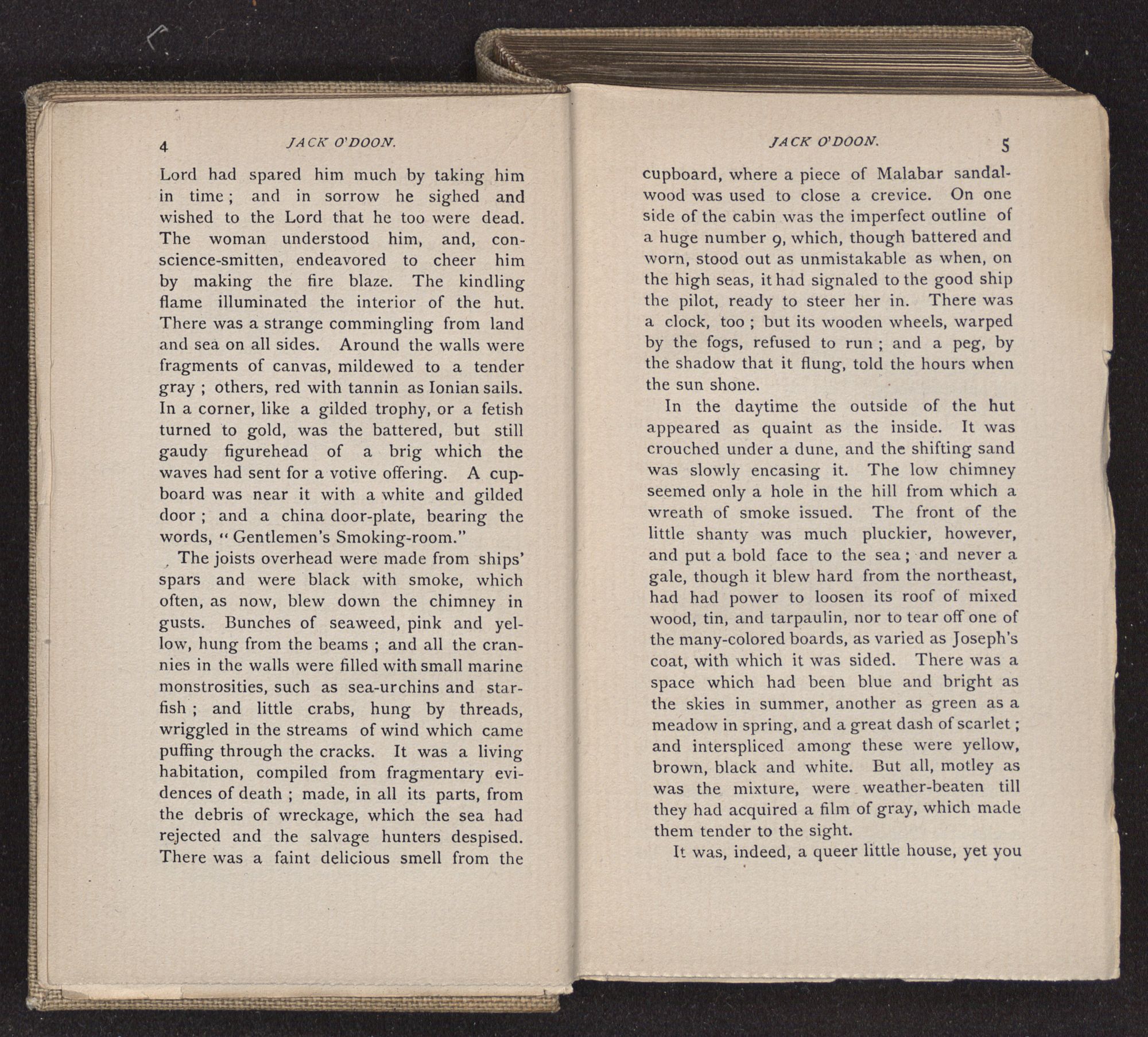 The joists overhead were made from ships’ spars and were black with smoke, which often, as now, blew down the chimney in gusts. Bunches of seaweed, pink and yellow, hung from the beams; and all the crannies in the walls were filled with small marine monstrosities, such as sea-urchins and star-fish; and little crabs, hung by threads, wriggled in the streams of wind which came puffing through the cracks. It was a living habitation, compiled from fragmentary evidences of death; made, in all its parts, from the debris of wreckage, which the sea had rejected and the salvage hunters despised. There was a faint delicious smell from the