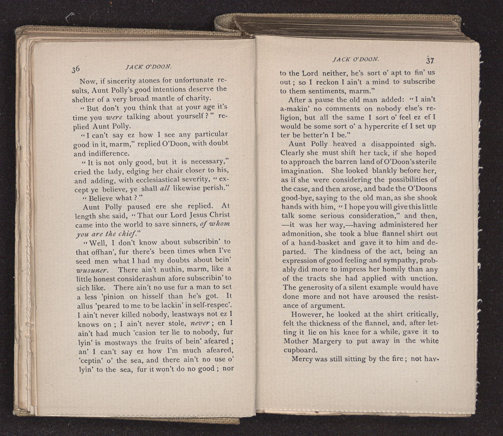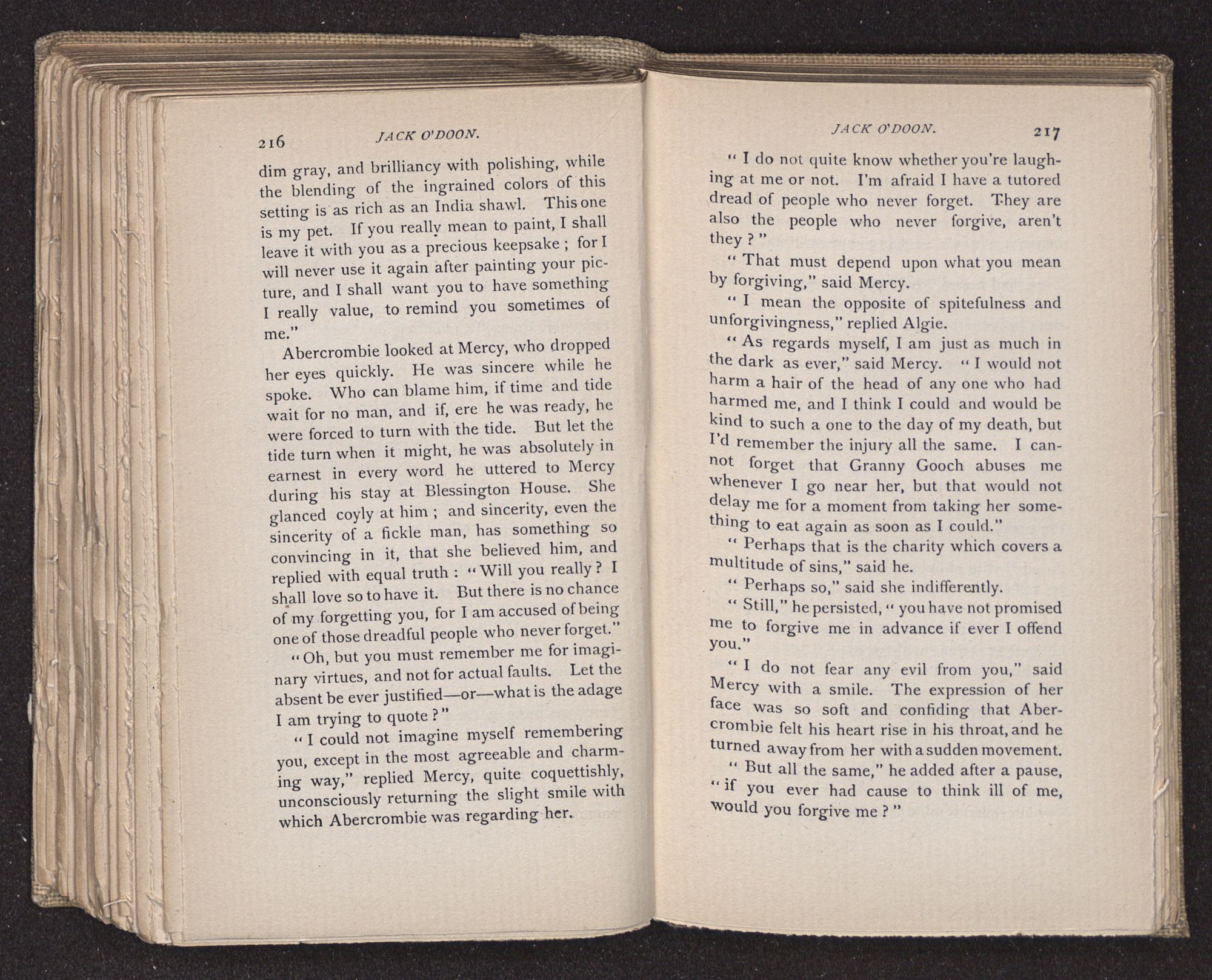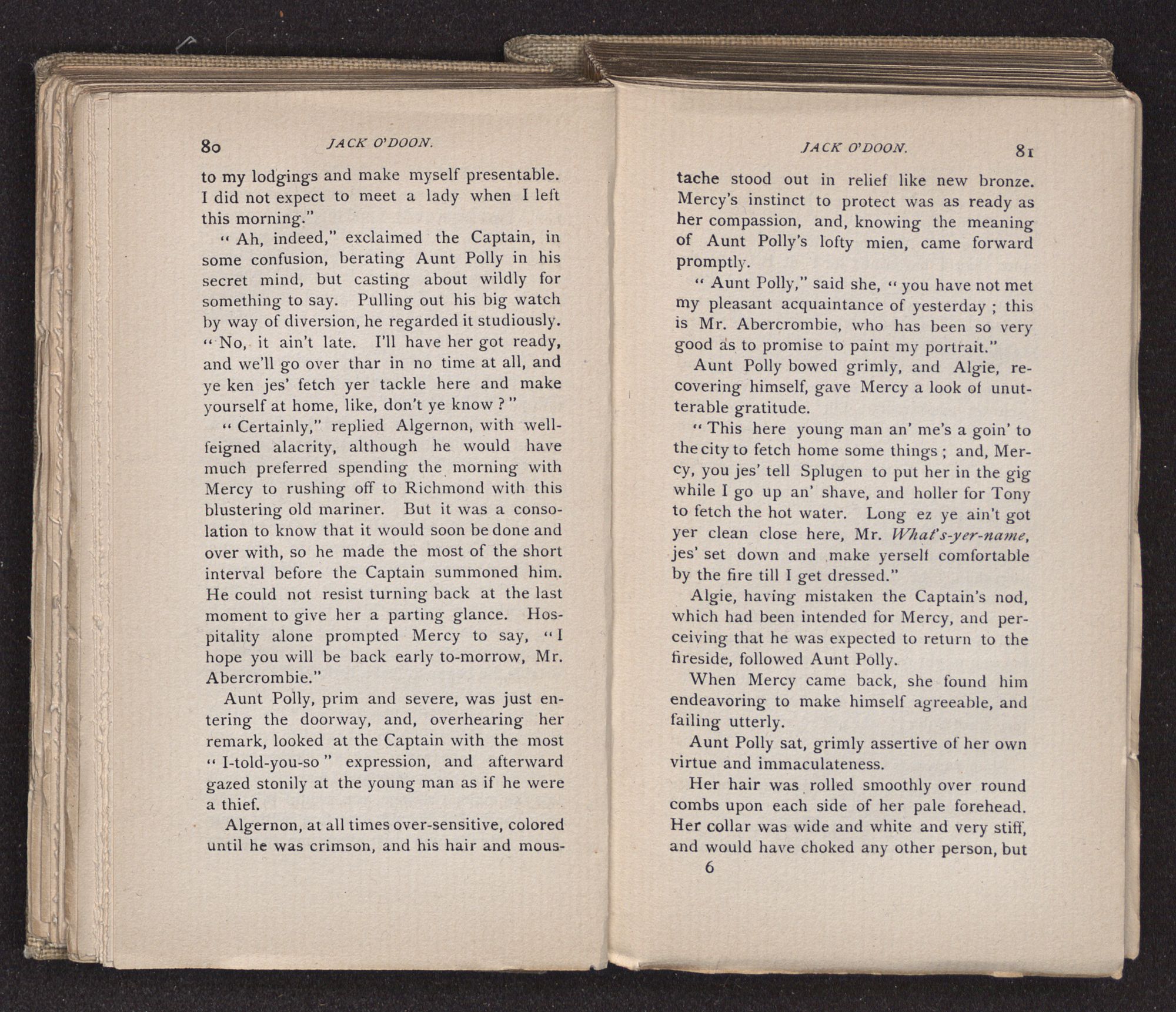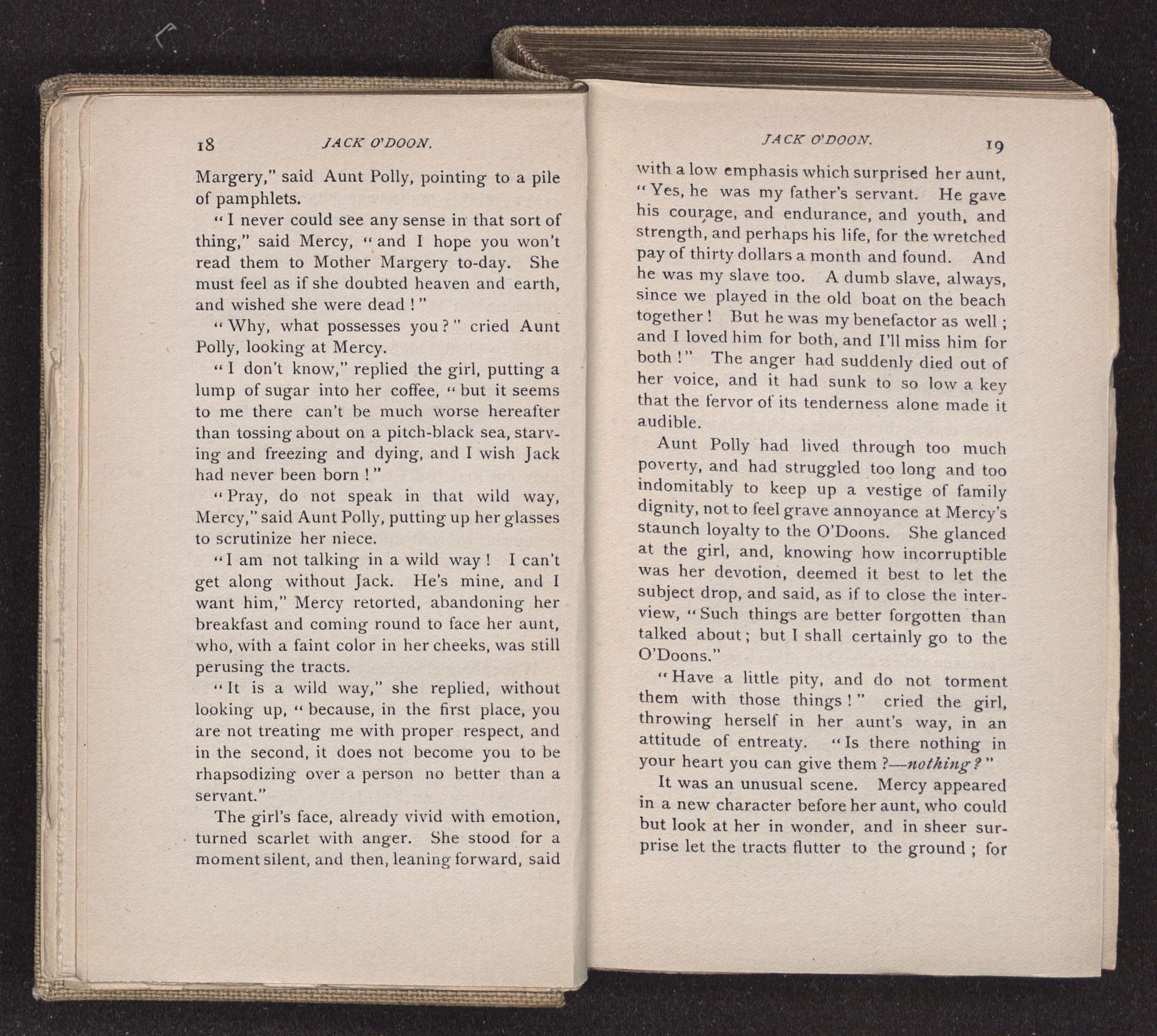 Aunt Polly had lived through too much poverty, and had struggled too long and too indomitably to keep up a vestige of family dignity, not to feel grave annoyance at Mercy's staunch loyalty to the O'Doons. She glanced at the girl, and, knowing how incorruptible was her devotion, deemed it best to let the subject drop, and said, as if to close the interview, “Such things are better forgotten than talked about; but I shall certainly go to the O'Doons.”