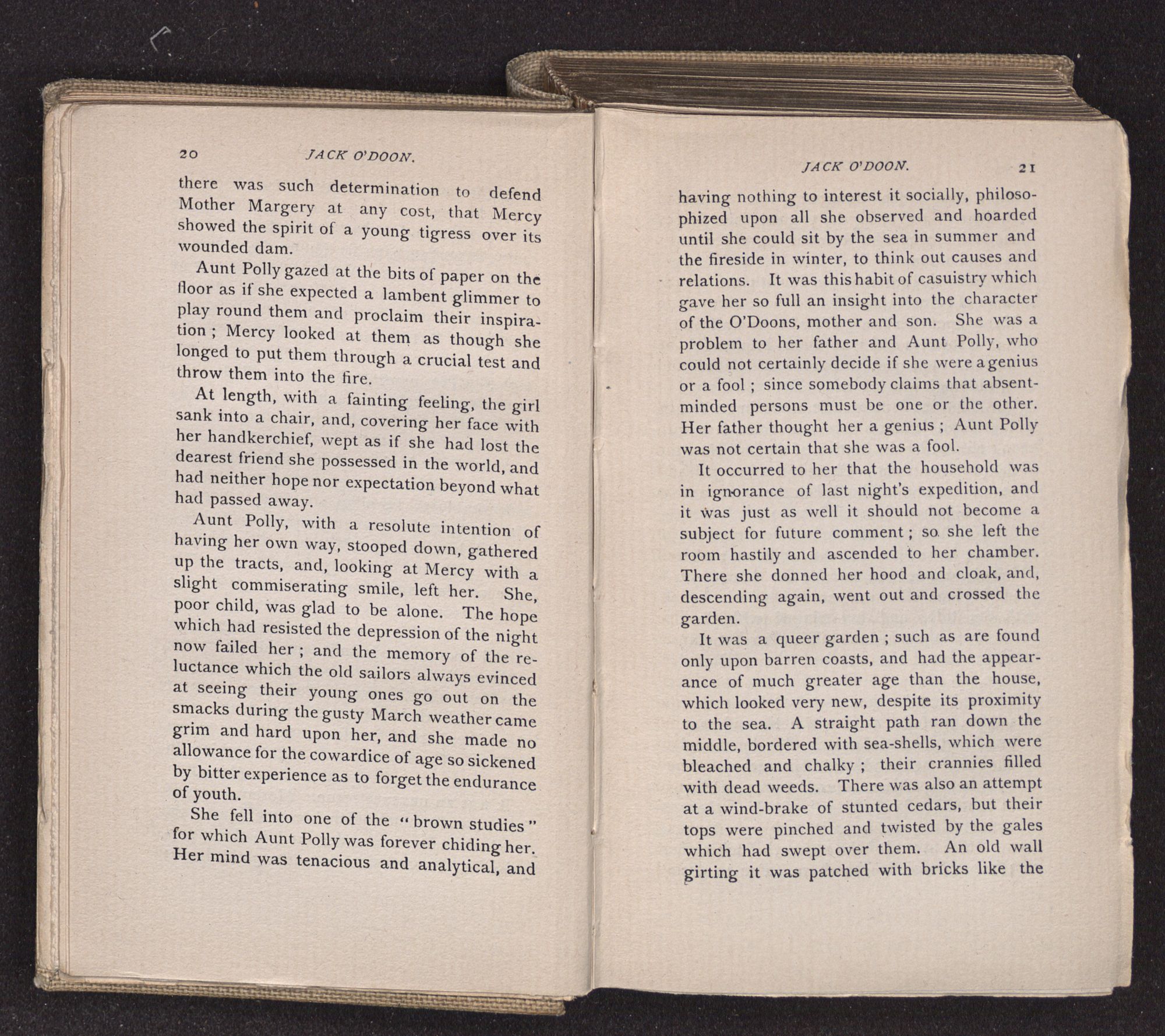 having nothing to interest it socially, philosophized upon all she observed and hoarded until she could sit by the sea in summer and the fireside in winter, to think out causes and relations. It was this habit of casuistry which gave her so full an insight into the character of the O'Doons, mother and son. She was a problem to her father and Aunt Polly, who could not certainly decide if she were a genius or a fool; since somebody claims that absentminded persons must be one or the other. Her father thought her a genius; Aunt Polly was not certain that she was a fool.