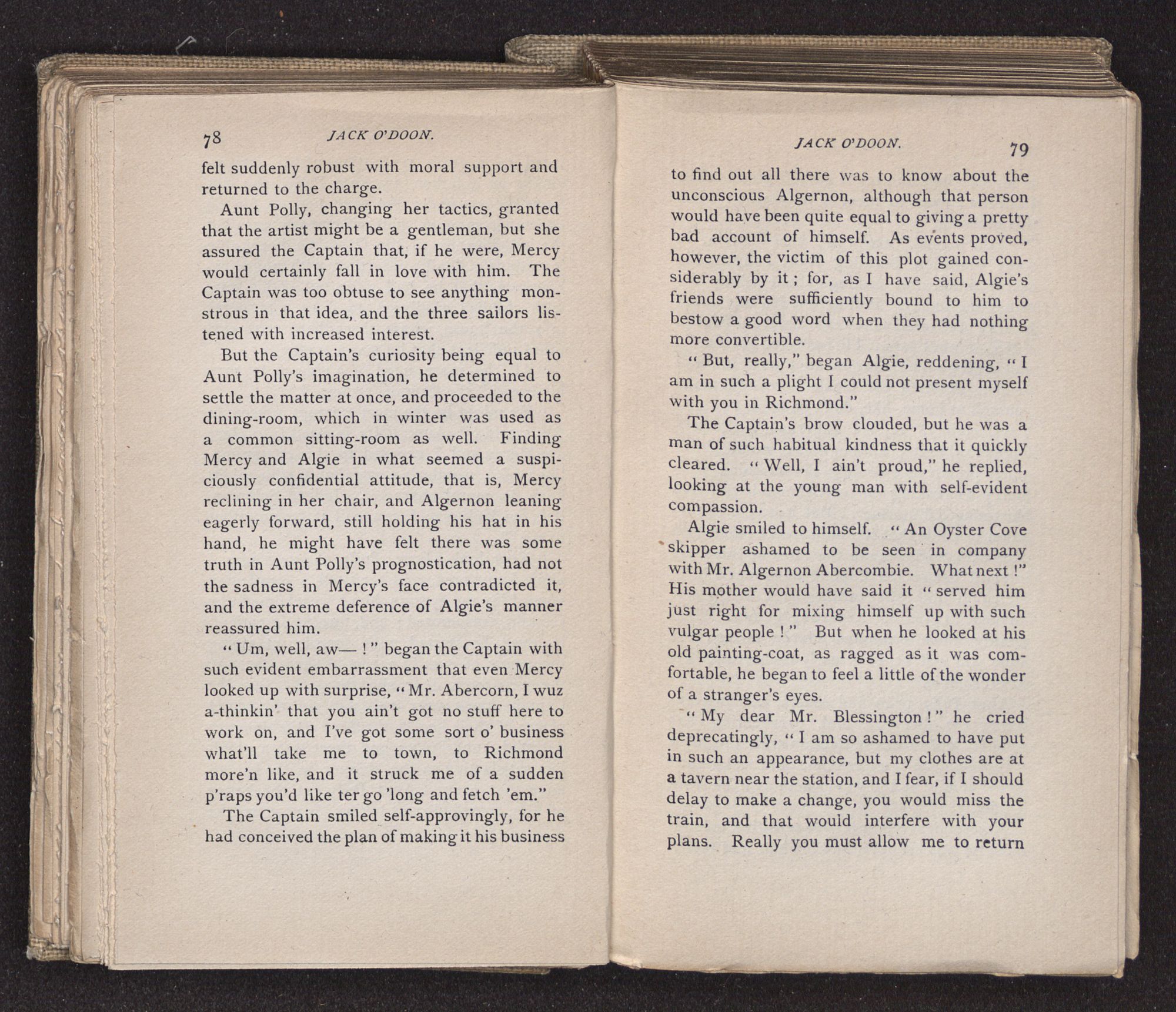 She was the darling and only child of a retired sea-captain, the offspring of his strangely-assorted marriage with the daughter of an impecunious Episcopal clergyman, accredited with more learning than money. The mother died in giving birth to the child. Usually under such circumstances, when the father recovers from the shock of his bereavement, he either detests the innocent cause of his misfortune, or else overwhelms it with more than the usual quality and quantity of affection. This erstwhile mariner, Solomon Blessington, better known in those parts as “The Captain,” having amassed a fortune, had abandoned his life upon the slippery wave at the age of thirtyeight and established himself on shore, full of hope and lavish of expenditure. Not content with giving his refined young wife all that money could buy for her, he had settled an annuity upon each of her sisters, and been altogether so bountiful to the parson, his father-in-law, that many, who could not reconcile