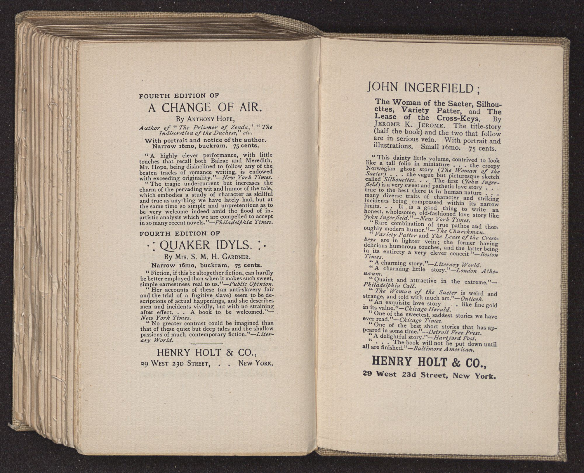 “This dainty little volume, contrived to look like a tall folio in miniature . . . the creepy Norwegian ghost story (The Woman of the Saeter) . . . the vague but picturesque sketch called Silhouettes. . . The first (John Ingerfield) is a very sweet and pathetic love story . . . true to the best there is in human nature . . . many diverse traits of character and striking incidents being compressed within its narrow limits. . . It is a good thing to write an honest, wholesome, old-fashioned love story like John Ingerfield.”—New York Times.