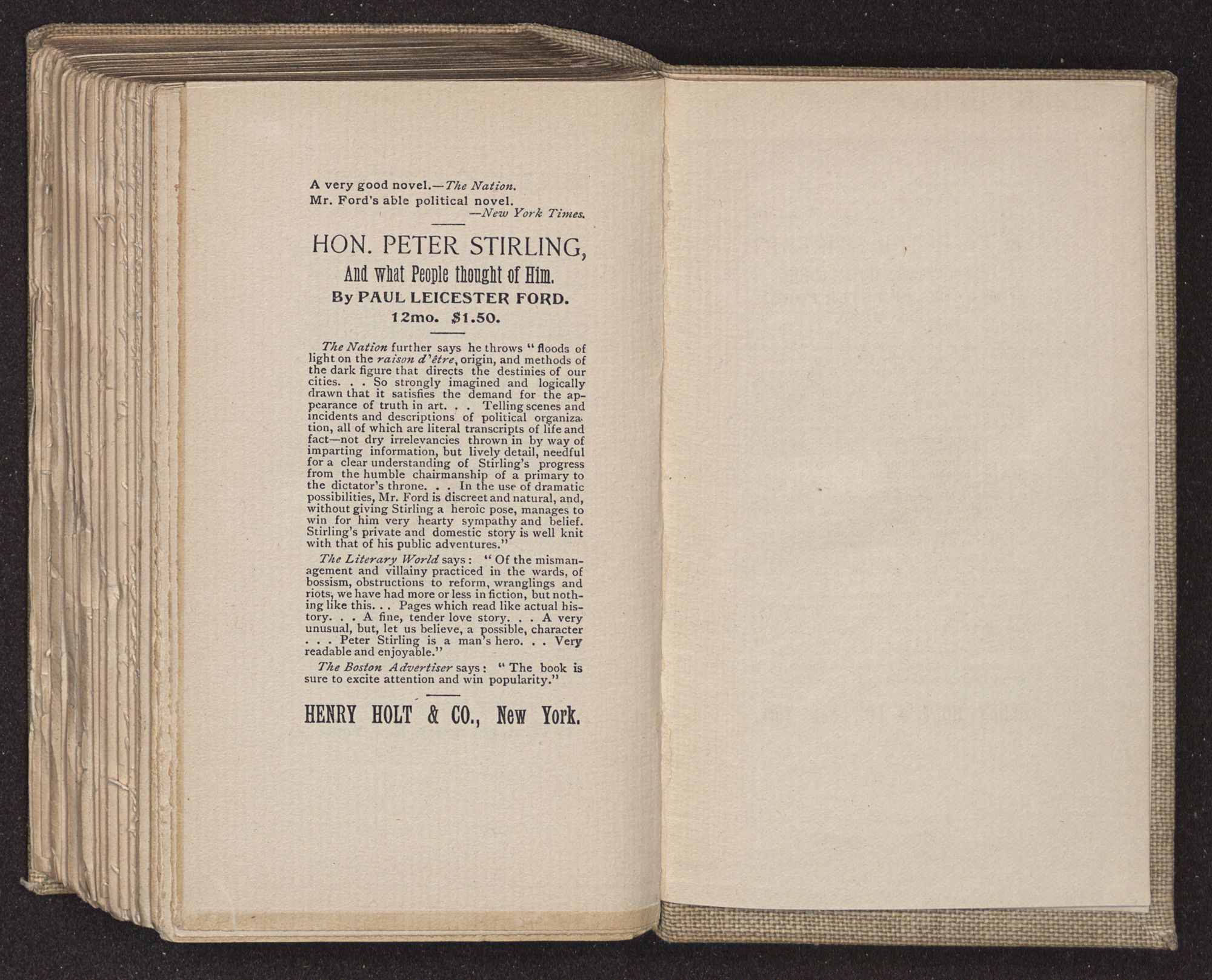 The Nation further says he throws “floods of light on the raison d’être, origin, and methods of the dark figure that directs the destinies of our cities. . . So strongly imagined and logically drawn that it satisfies the demand for the appearance of truth in art. . . Telling scenes and incidents and descriptions of political organization, all of which are literal transcripts of life and fact—not dry irrelevancies thrown in by way of imparting information, but lively detail, needful for a clear understanding of Stirling's progress from the humble chairmanship of a primary to the dictator's throne. . . In the use of dramatic possibilities, Mr. Ford is discreet and natural, and, without giving Stirling a heroic pose, manages to win for him very hearty sympathy and belief. Stirling's private and domestic story is well knit with that of his public adventures.”