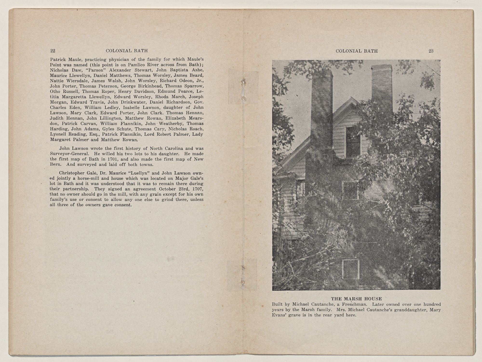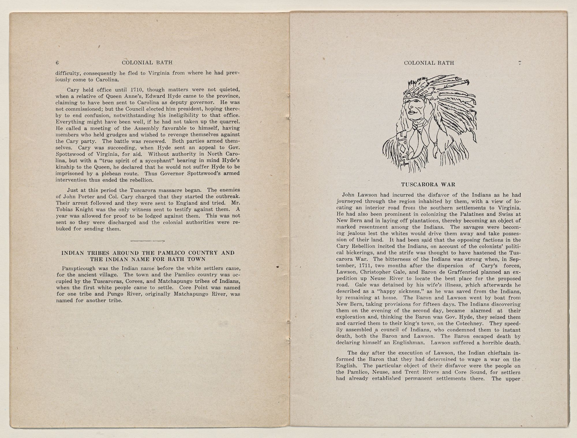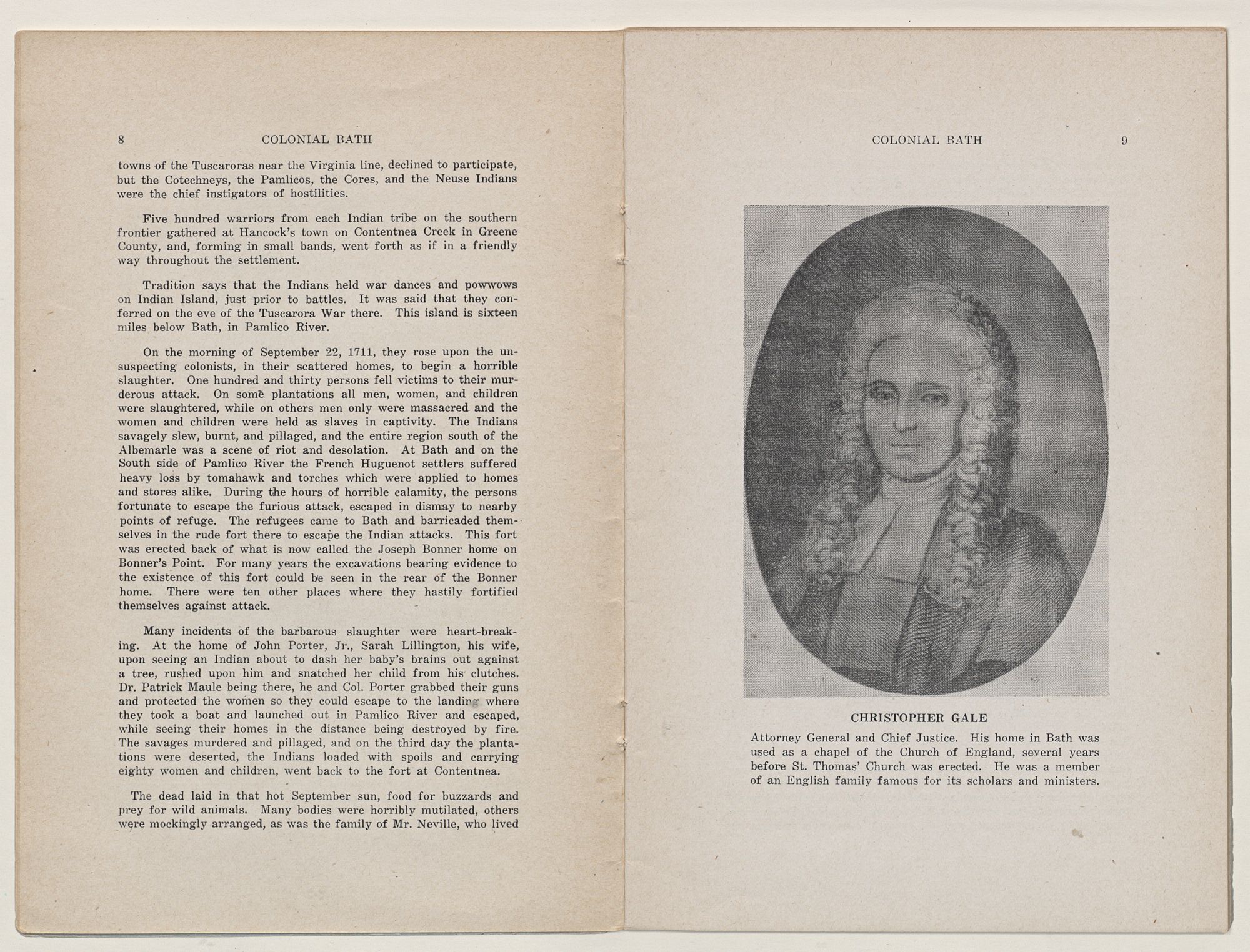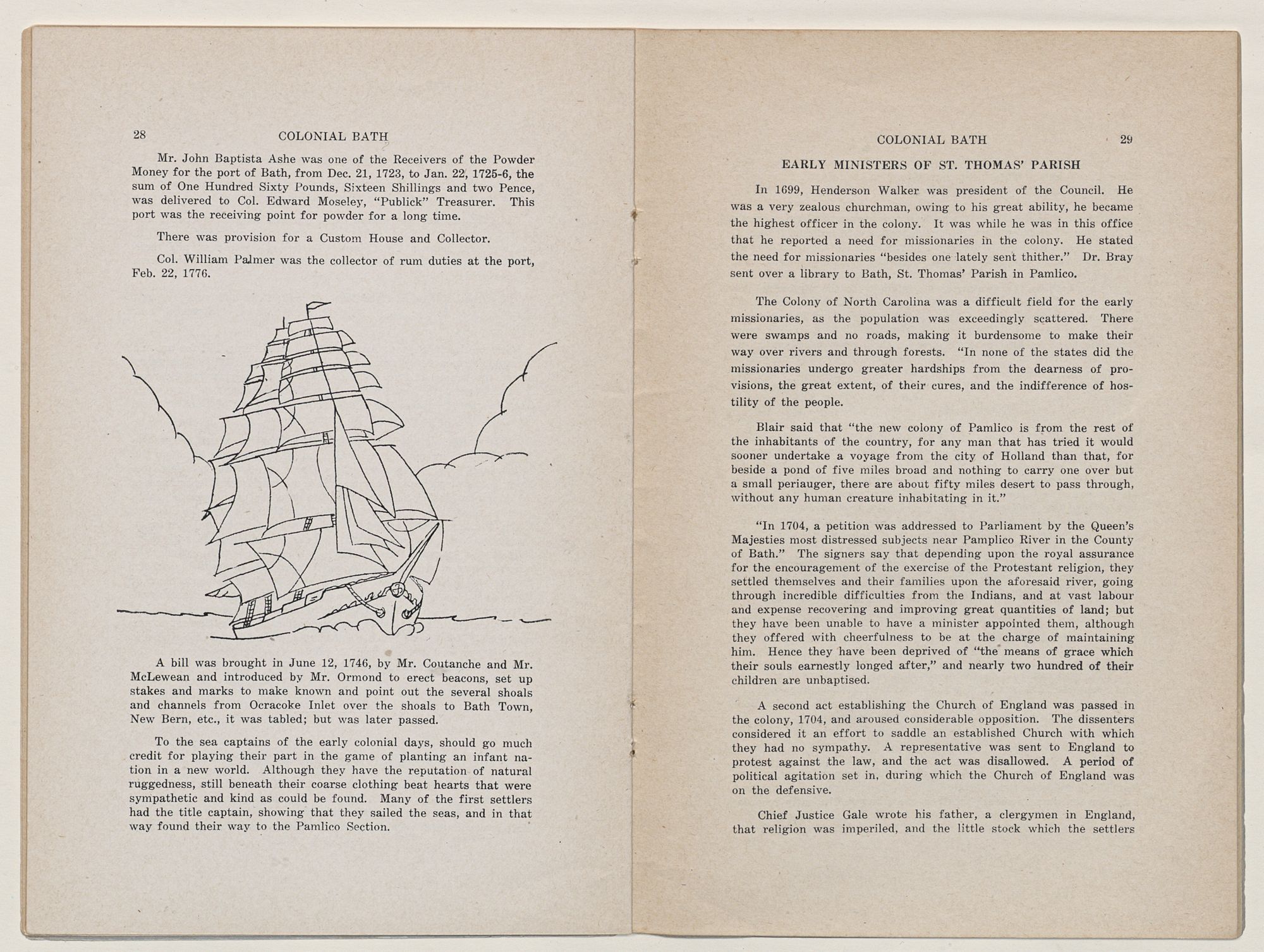 Presenting this sketch of the history of the foundation of Bath and the Pamlico Section, the writer thinks that it has been time well spent if it serves the purpose for which it was intended—to enlighten present and future generations about the citizens, their joys, sorrows, mode of living, religion, means of travel, political dealings, governors, statesmen, social life, piracy, weird stories, elegant homes, plantation life of the pioneers, government of the first incorporated town and the Pamlico Section.