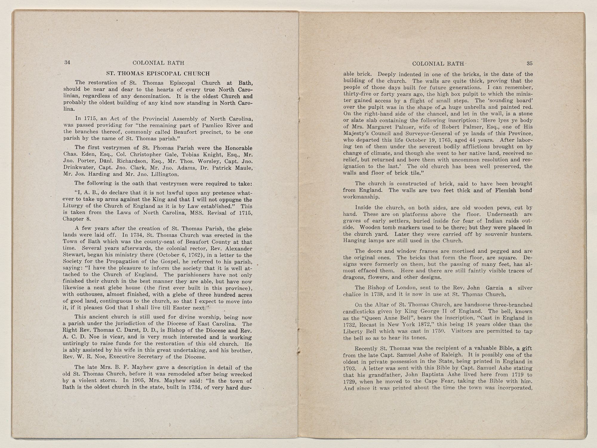 Recently St. Thomas was the recipient of a valuable Bible, a gift from the late Capt. Samuel Ashe of Raleigh. It is possibly one of the oldest in private possession in the State, being printed in England in 1703. A letter was sent with this Bible by Capt. Samuel Ashe stating that his grandfather, John Baptista Ashe lived here from 1719 to 1729, when he moved to the Cape Fear, taking the Bible with him. And since it was printed about the time the town was incorporated,