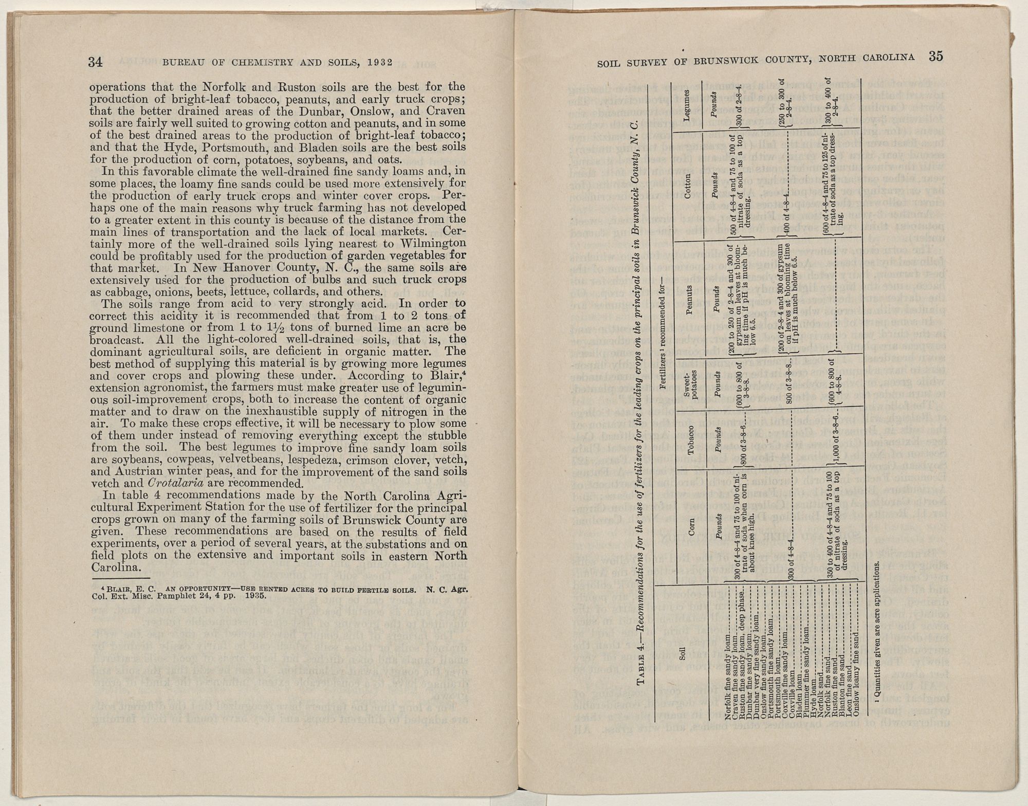 4 BLAIR, E. C. AN OPPORTUNITY—USE RENTED ACRES TO BUILD FERTILE SOILS. N. C. Agr. Col. Ext. Misc. Pamphlet 24, 4 pp. 1935.| TABLE 4.—Recommendations for the use of fertilizers for the leading crops on the principal soils in Brunswick County, N. C. | ||||||