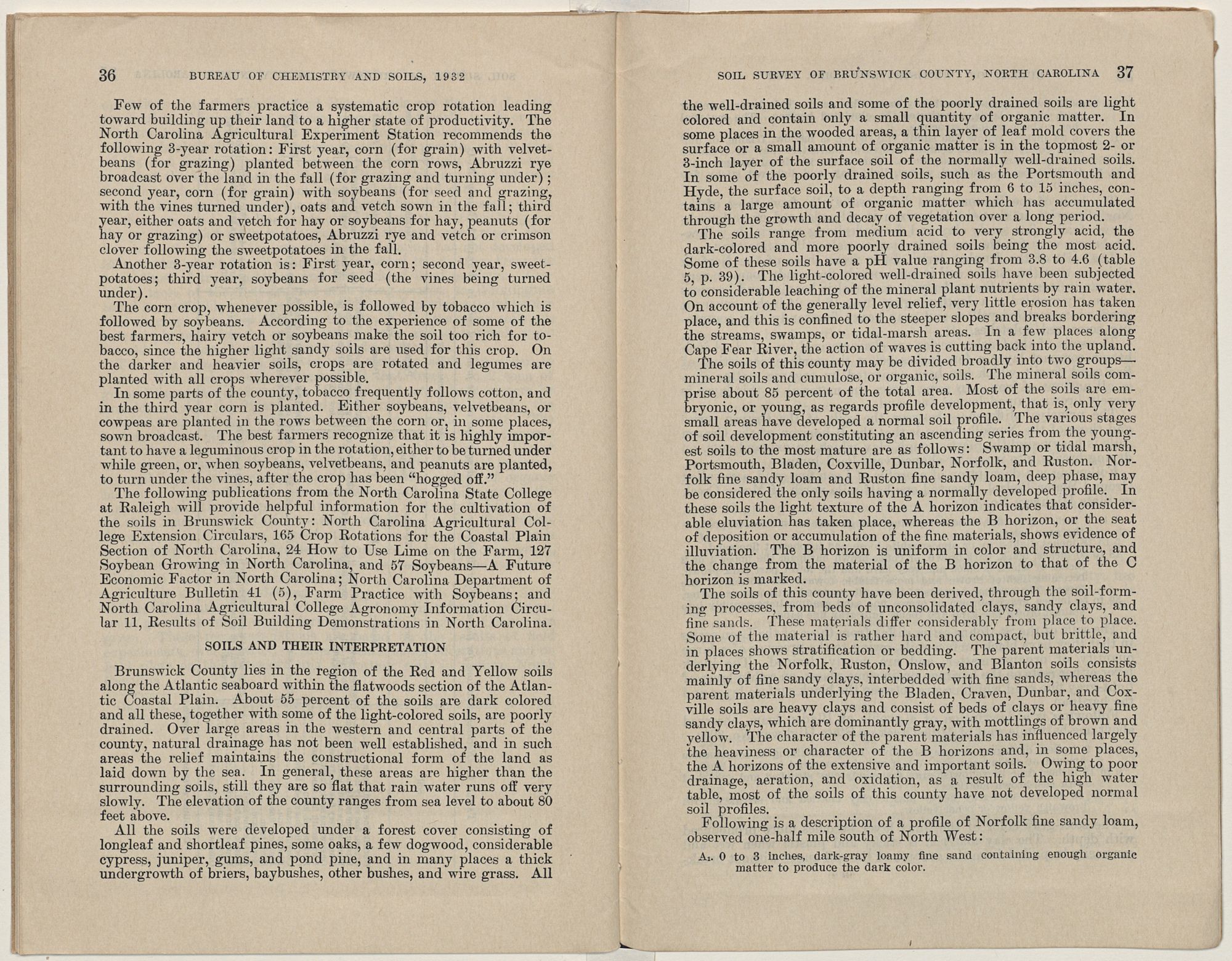 The following publications from the North Carolina State College at Raleigh will provide helpful information for the cultivation of the soils in Brunswick County: North Carolina Agricultural College Extension Circulars, 165 Crop Rotations for the Coastal Plain Section of North Carolina, 24 How to Use Lime on the Farm, 127 Soybean Growing in North Carolina, and 57 Soybeans—A Future Economic Factor in North Carolina; North Carolina Department of Agriculture Bulletin 41 (5), Farm Practice with Soybeans; and North Carolina Agricultural College Agronomy Information Circular 11, Results of Soil Building Demonstrations in North Carolina.
