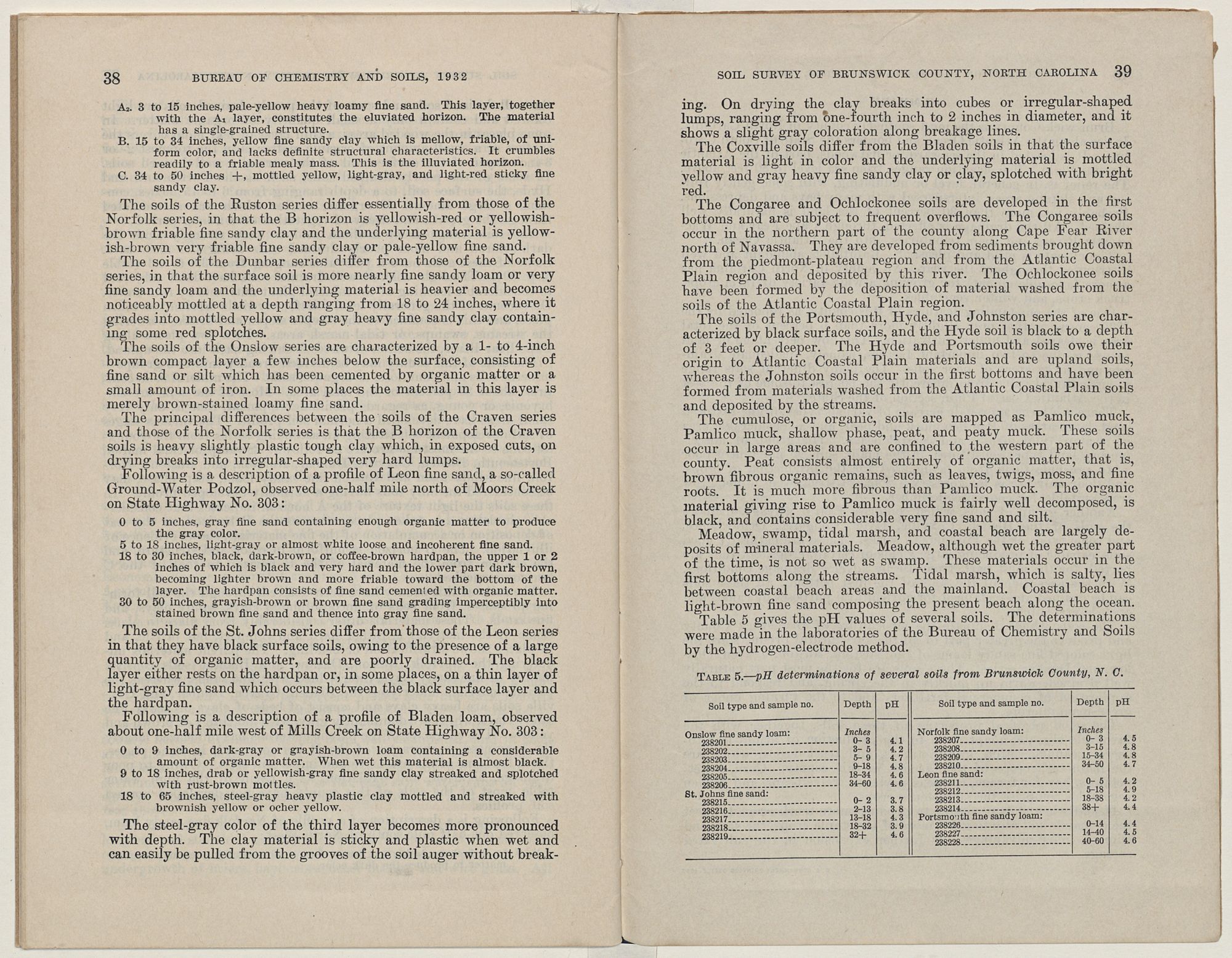 | TABLE 5.—pH determinations of several soils from Brunswick County, N. C. | |||||