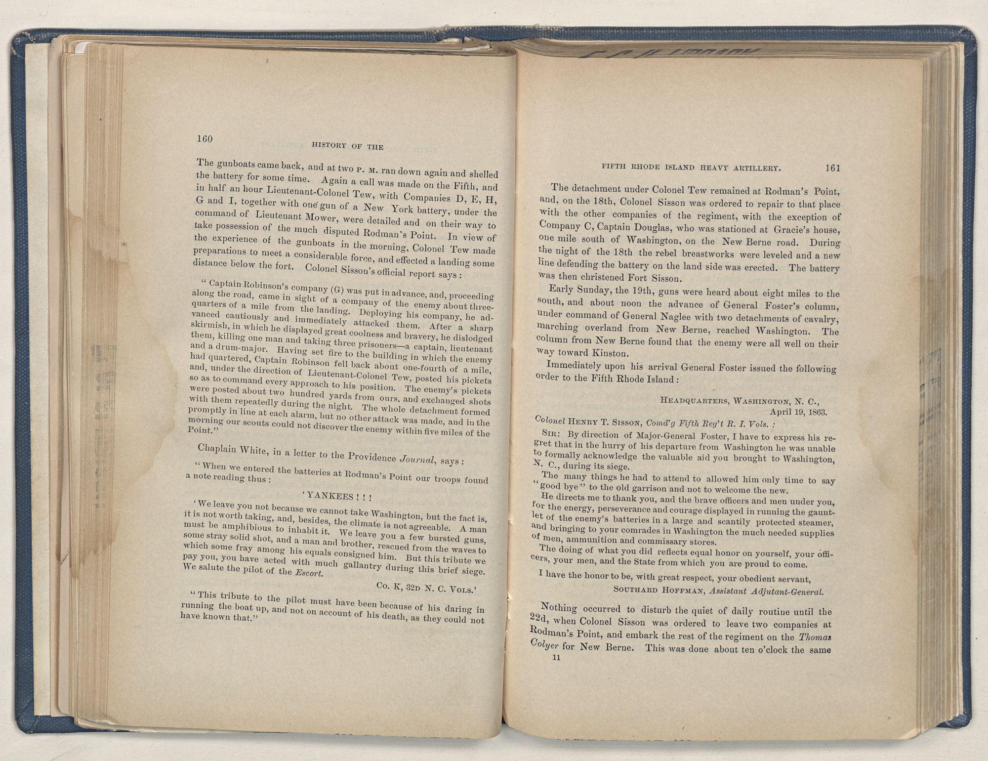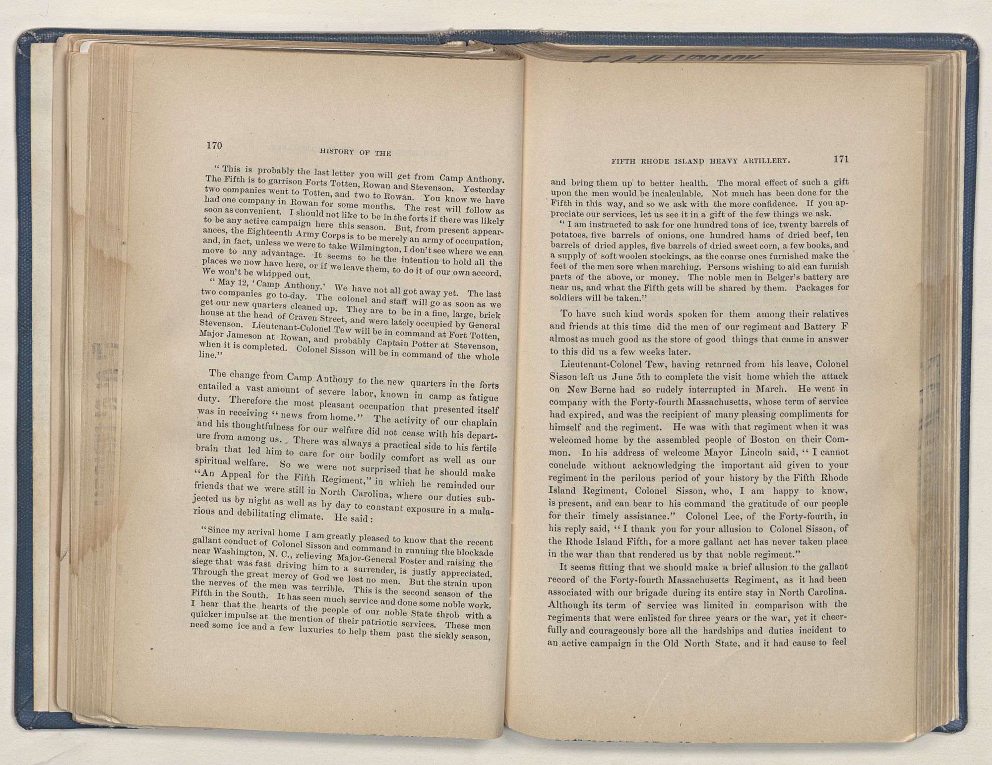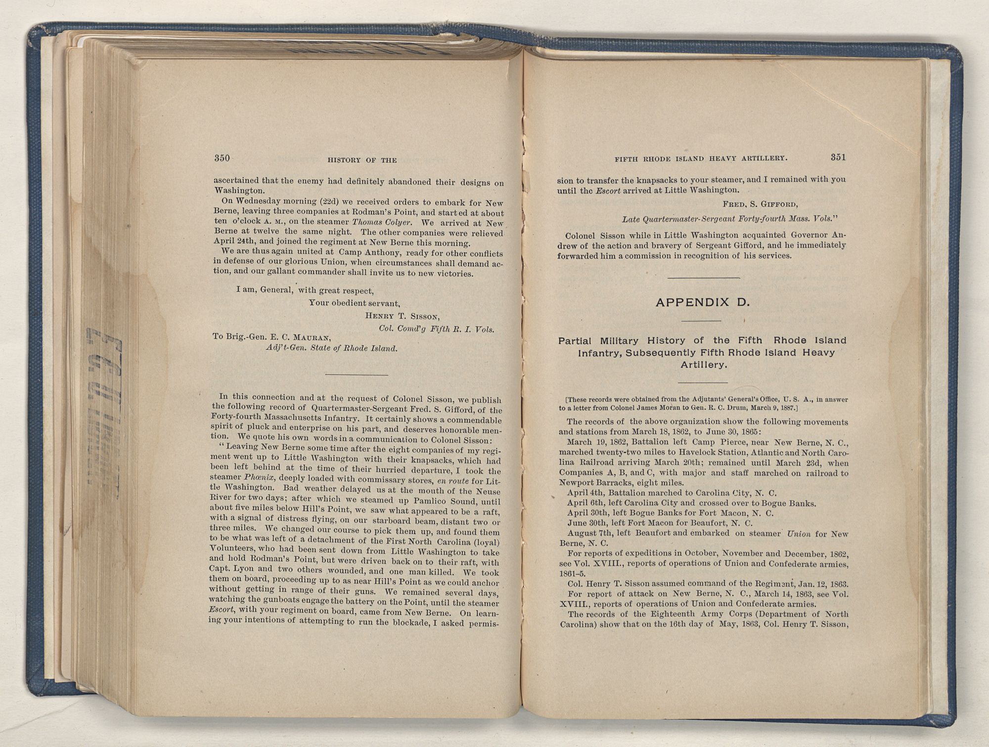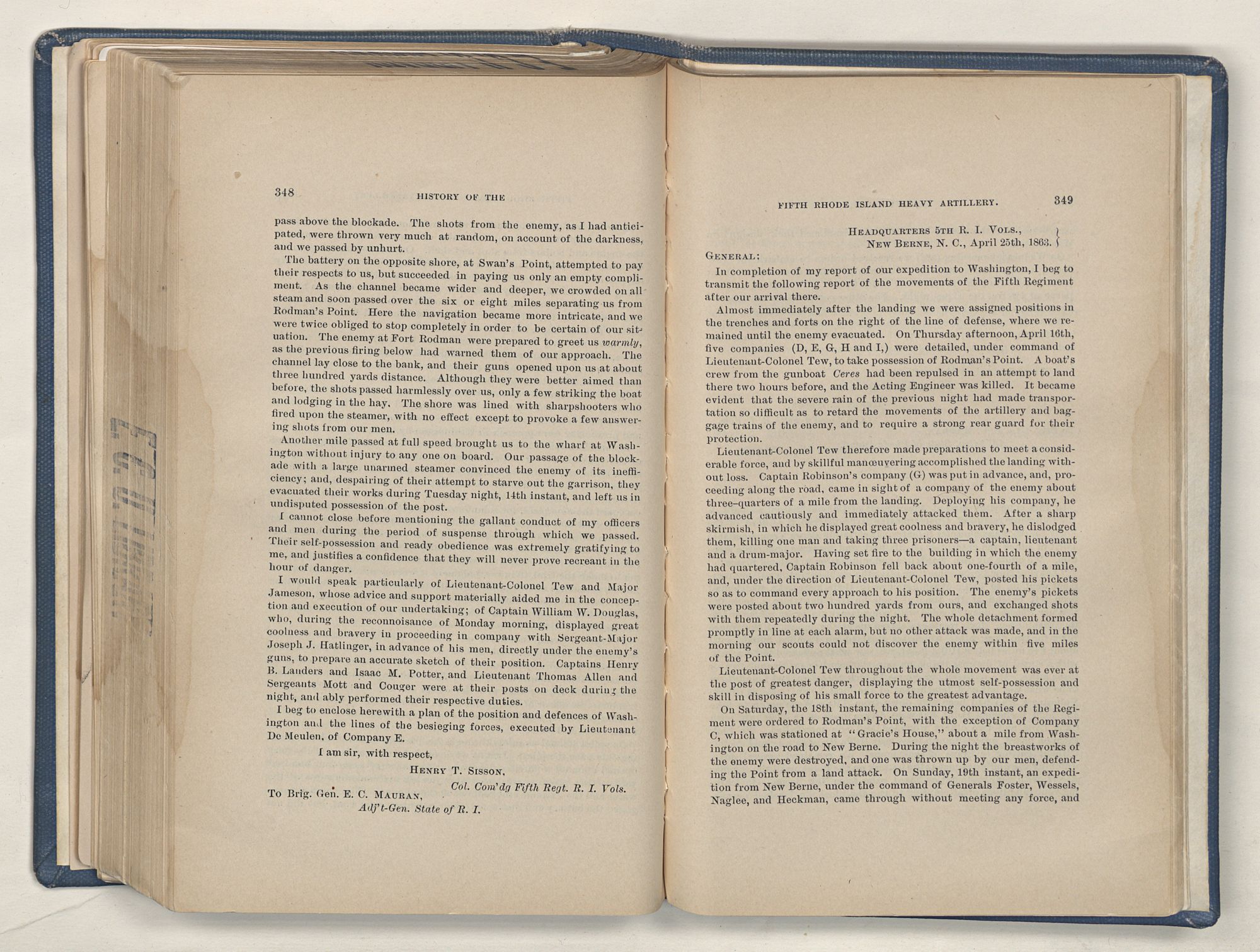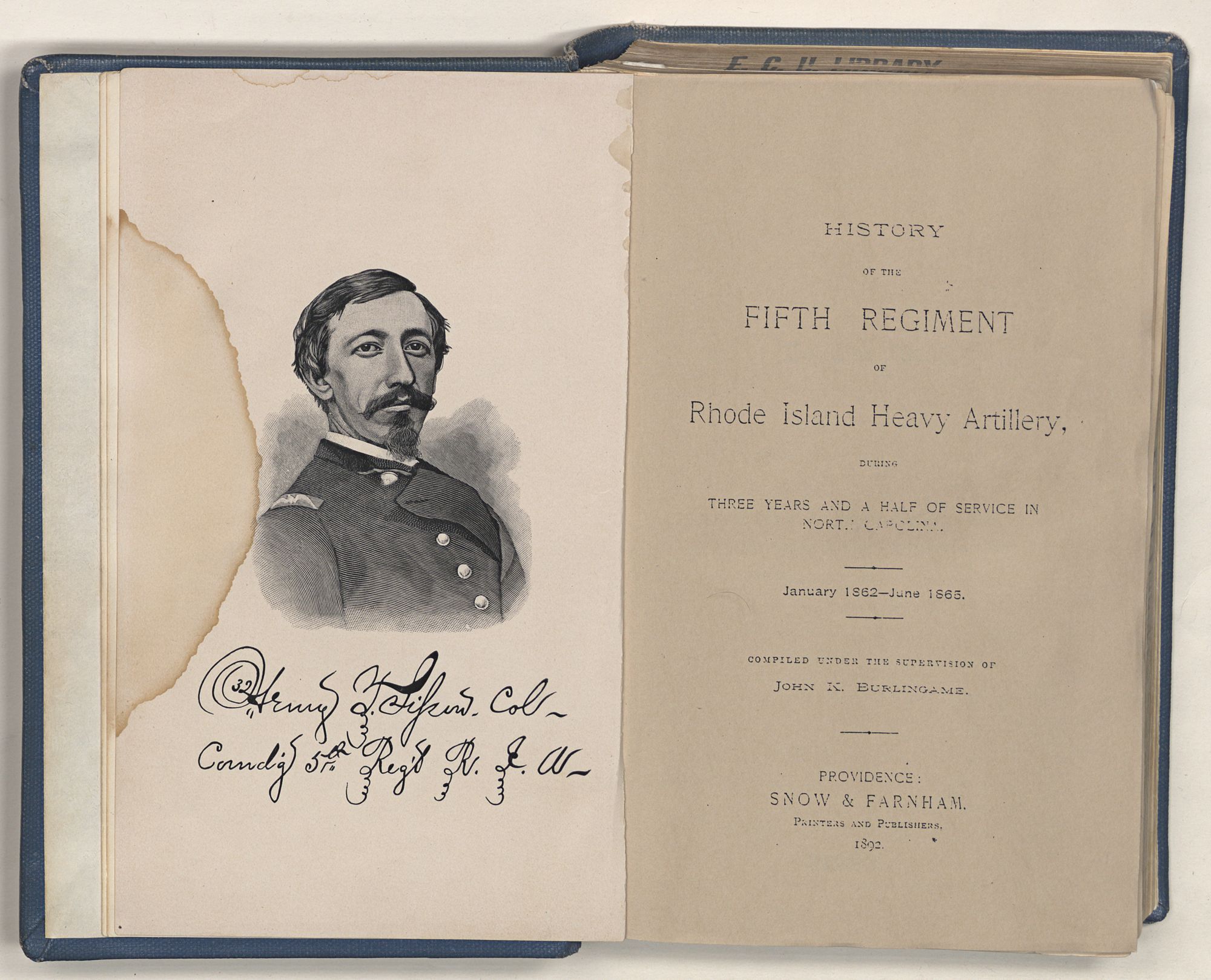 Henry T. Sisson, Colonel Commanding 5th Regiment Rhode Island ArtilleryHISTORYOF THEFIFTH REGIMENTOF Rhode Island Heavy Artillery,DURINGTHREE YEARS AND A HALF OF SERVICE INNORTH CAROLINA. January 1862-June 1865. COMPILED UNDER THE SUPERVISION OFJohn K. Burlingame.PROVIDENCE:SNOW & FARNHAM.Printers and Publishers,1892.