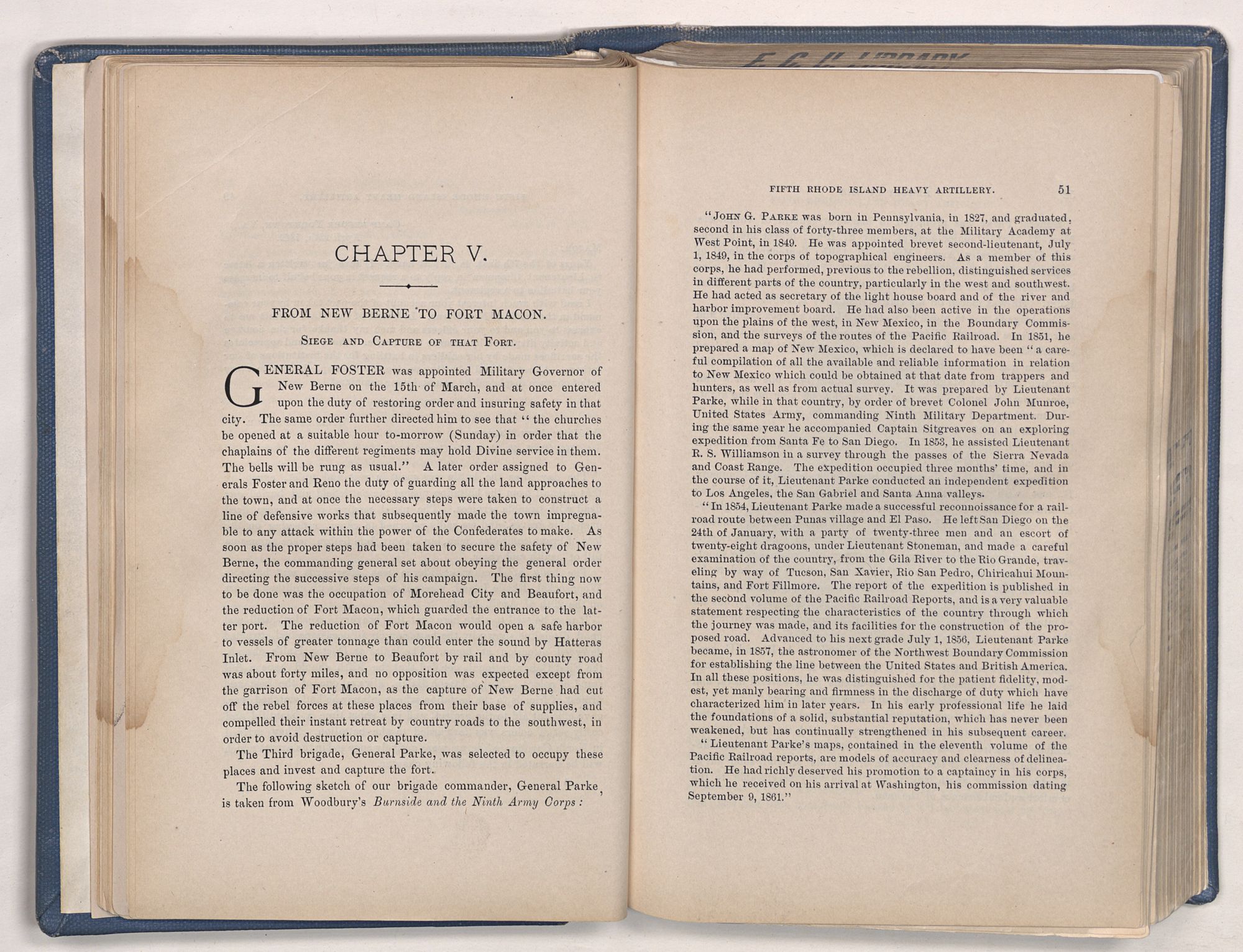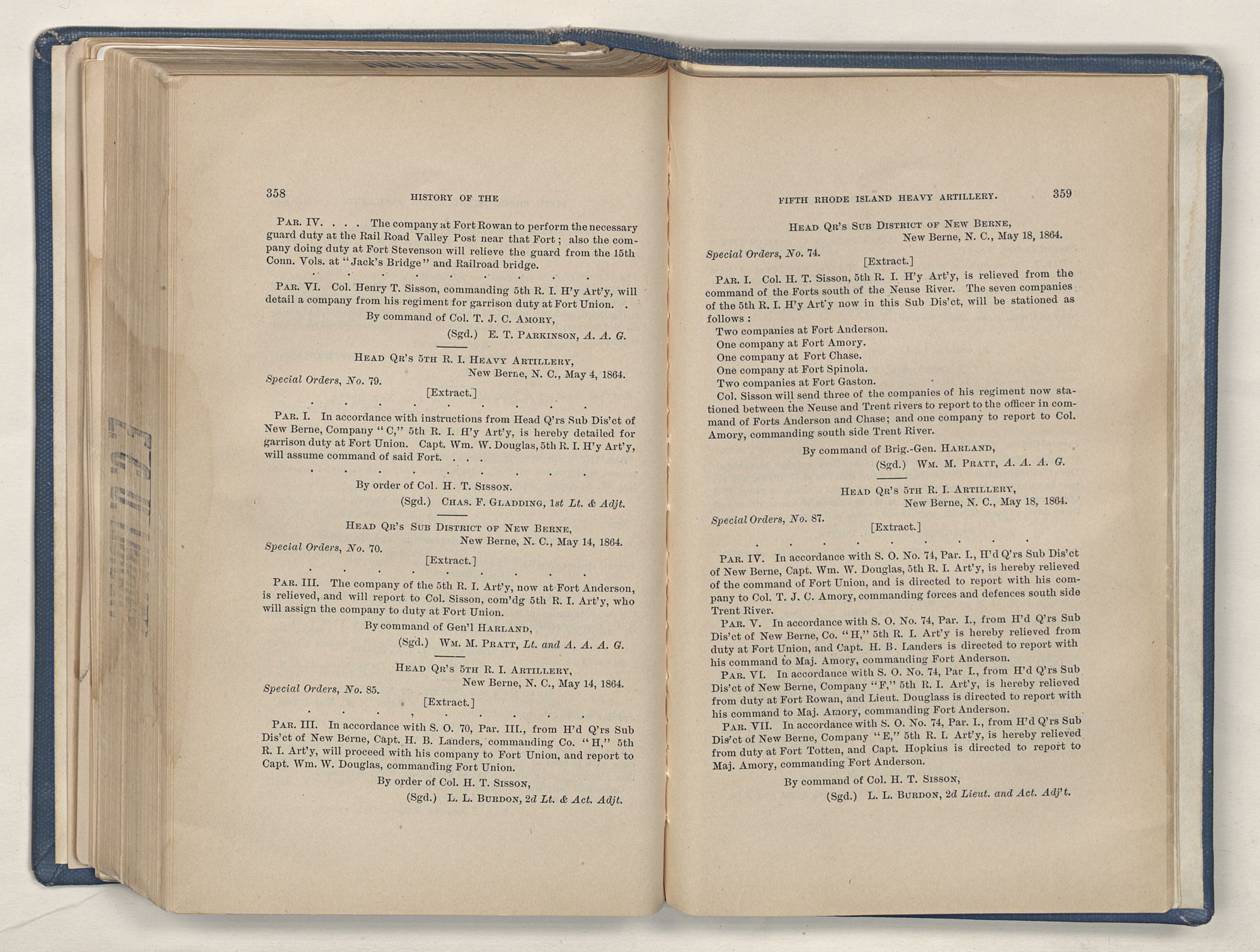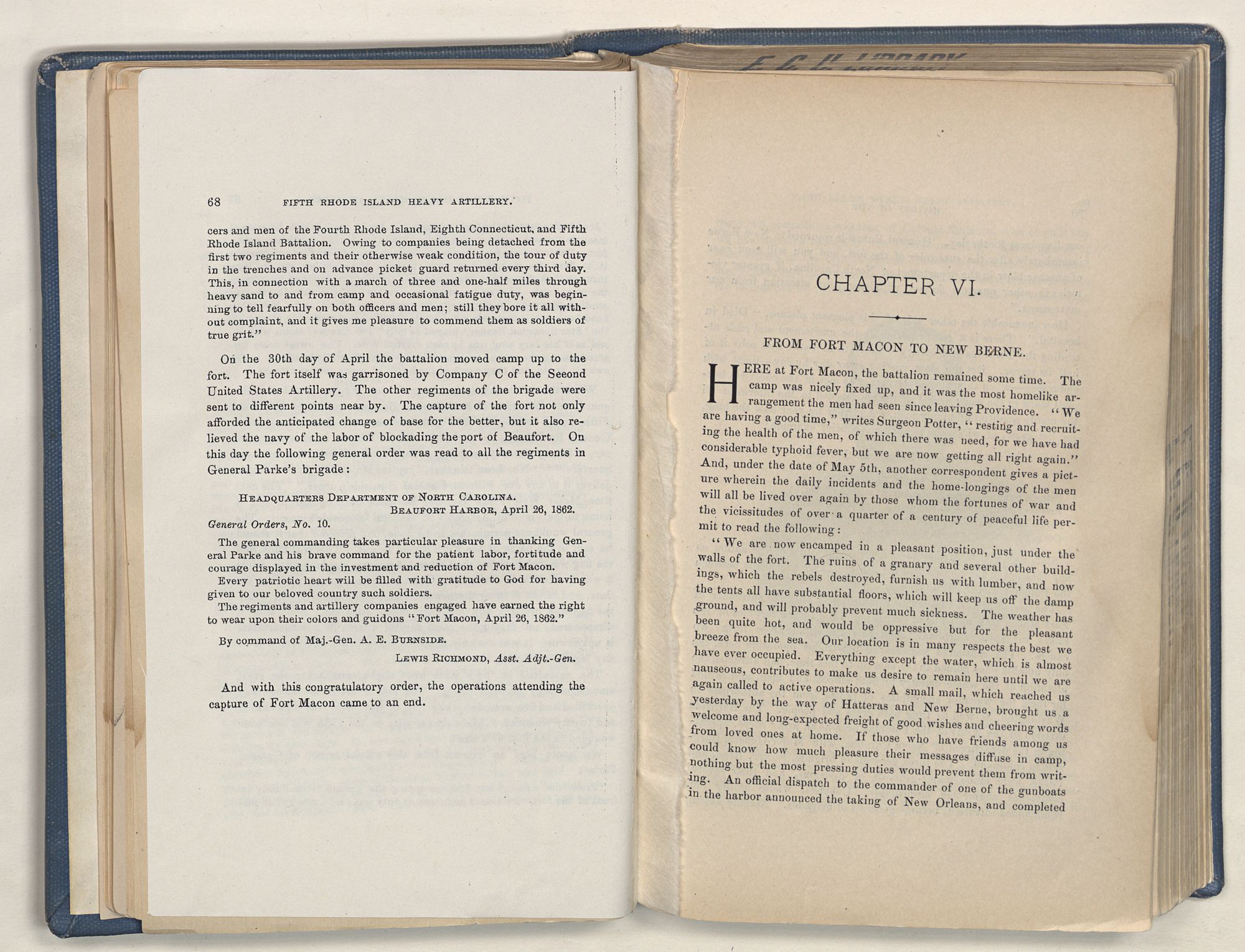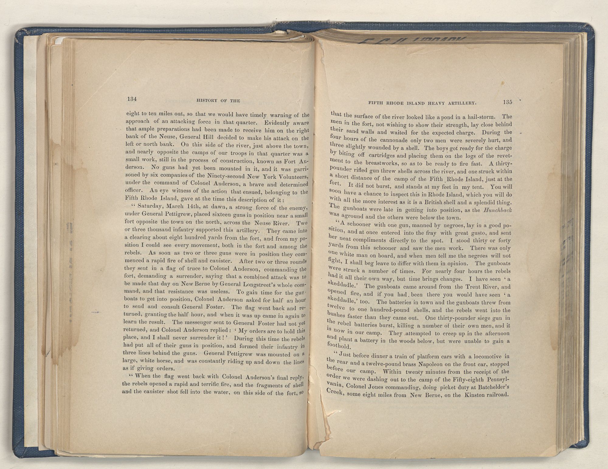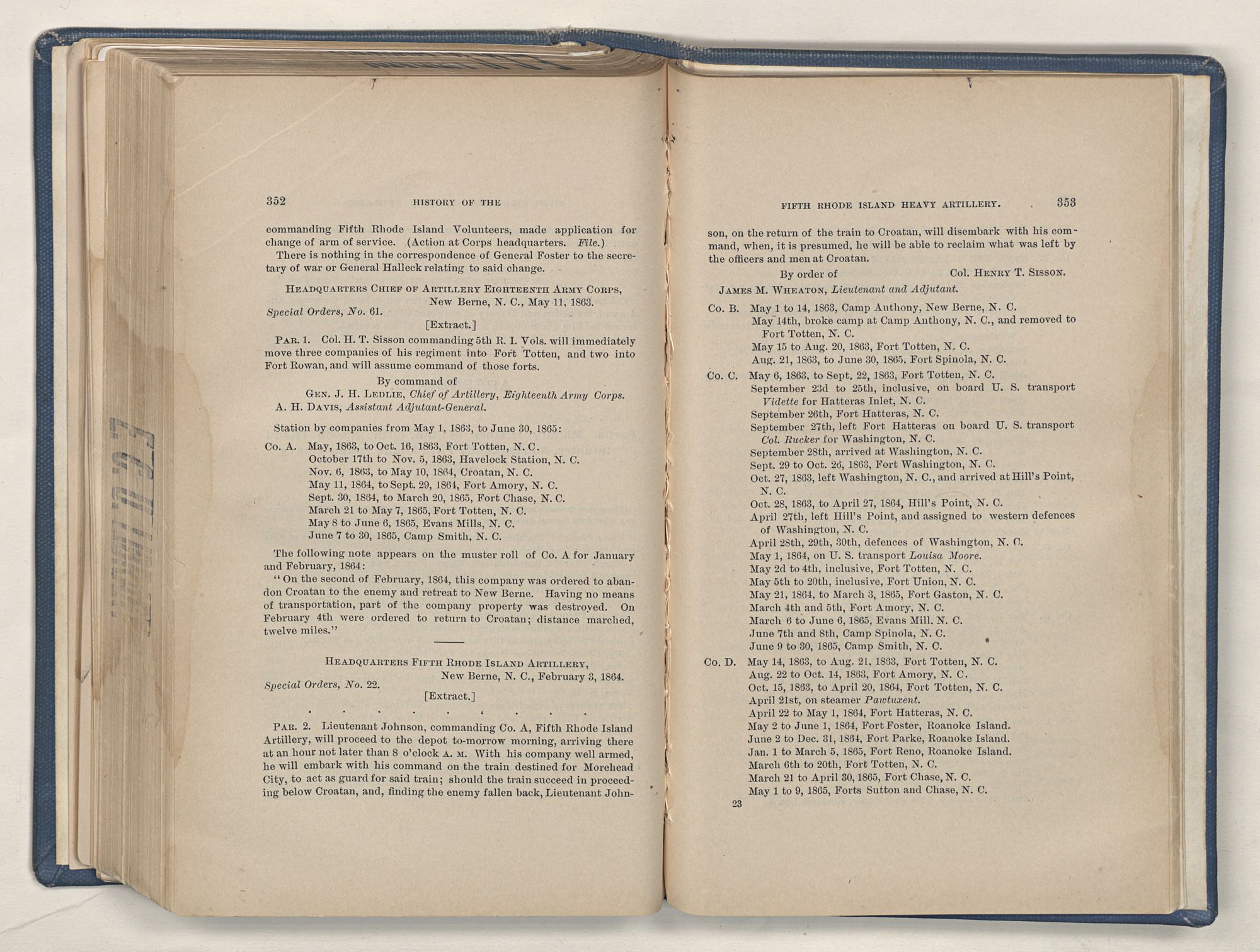 Henry T. Sisson, Colonel Commanding 5th Regiment Rhode Island ArtilleryHISTORYOF THEFIFTH REGIMENTOF Rhode Island Heavy Artillery,DURINGTHREE YEARS AND A HALF OF SERVICE INNORTH CAROLINA. January 1862-June 1865. COMPILED UNDER THE SUPERVISION OFJohn K. Burlingame.PROVIDENCE:SNOW & FARNHAM.Printers and Publishers,1892.