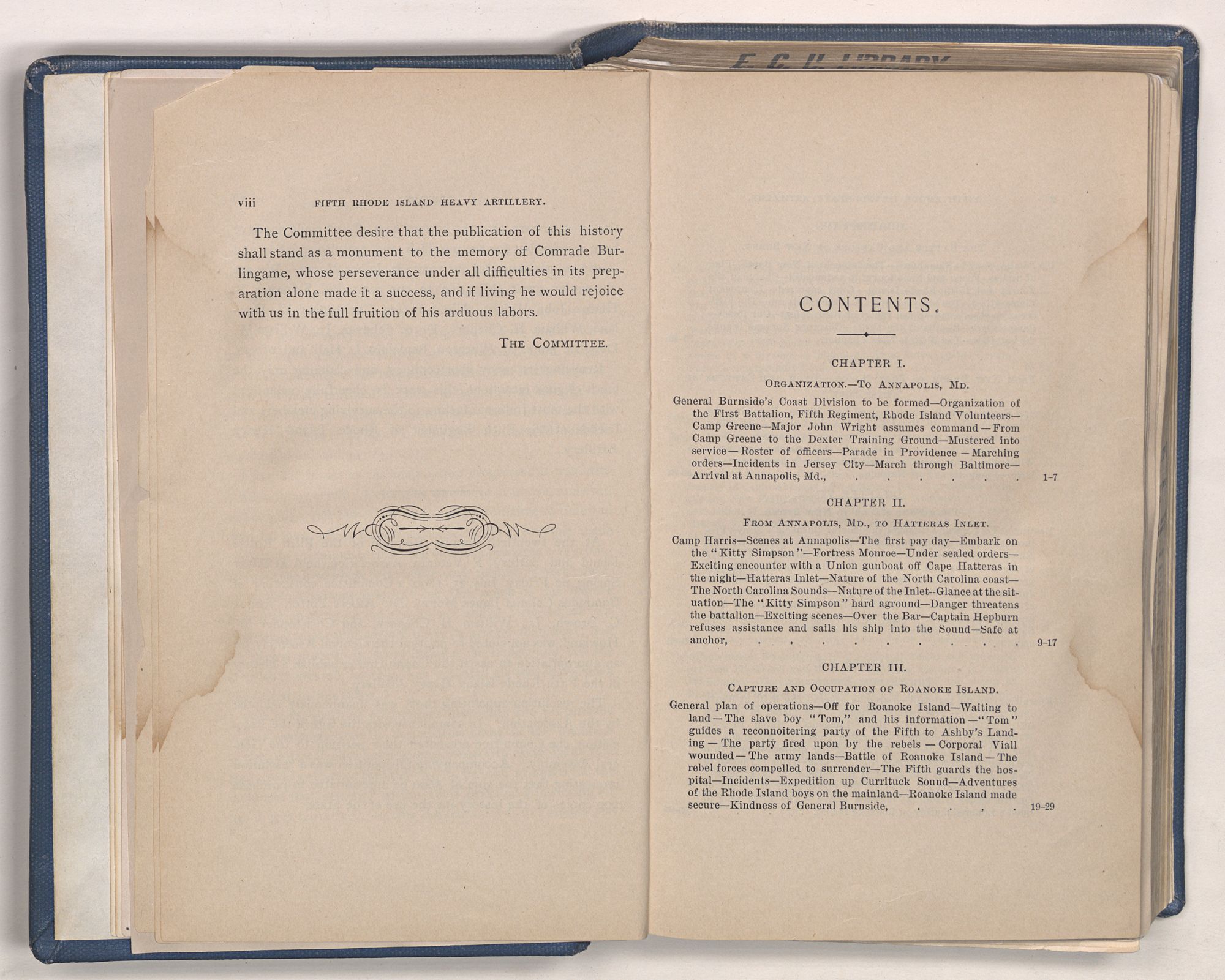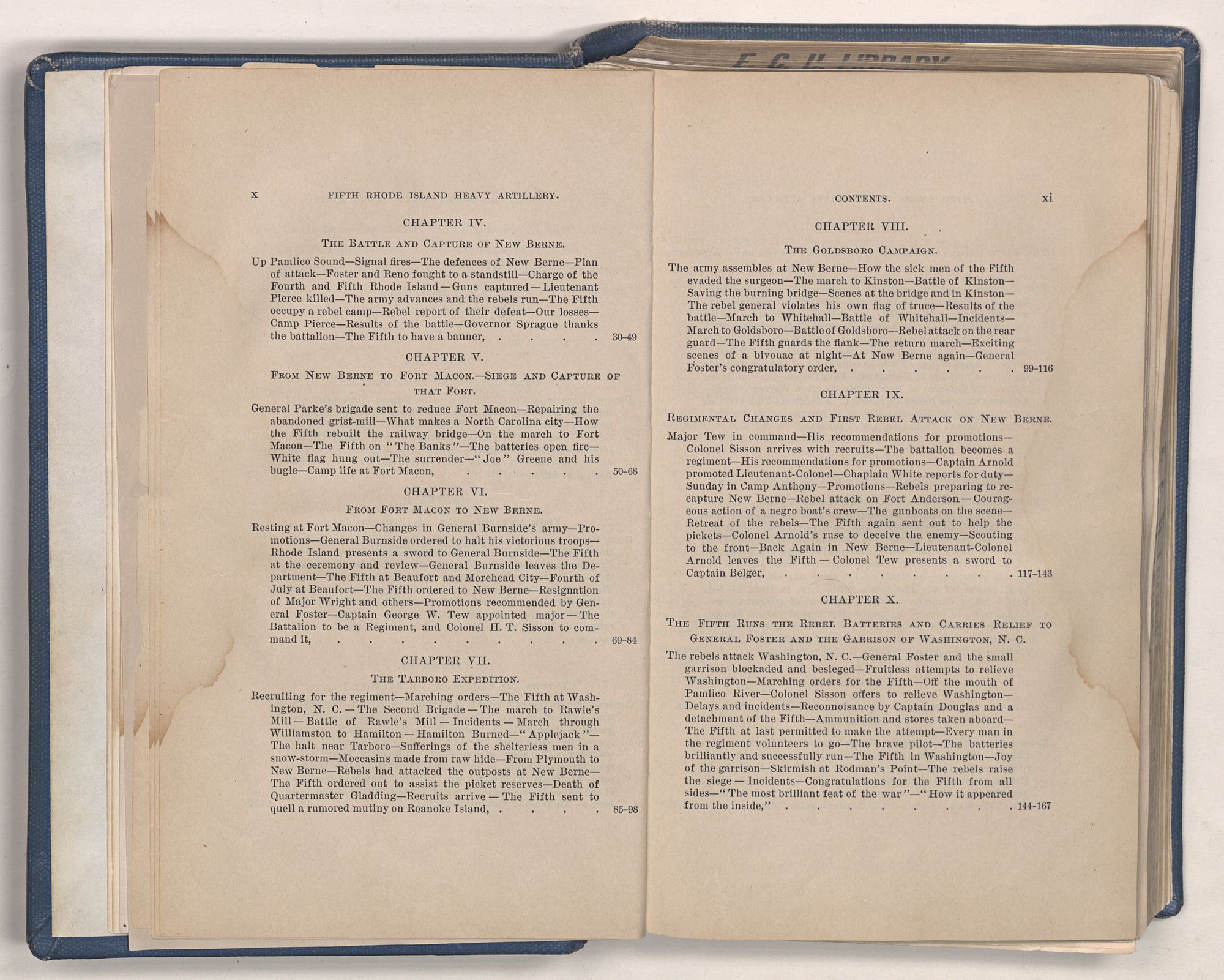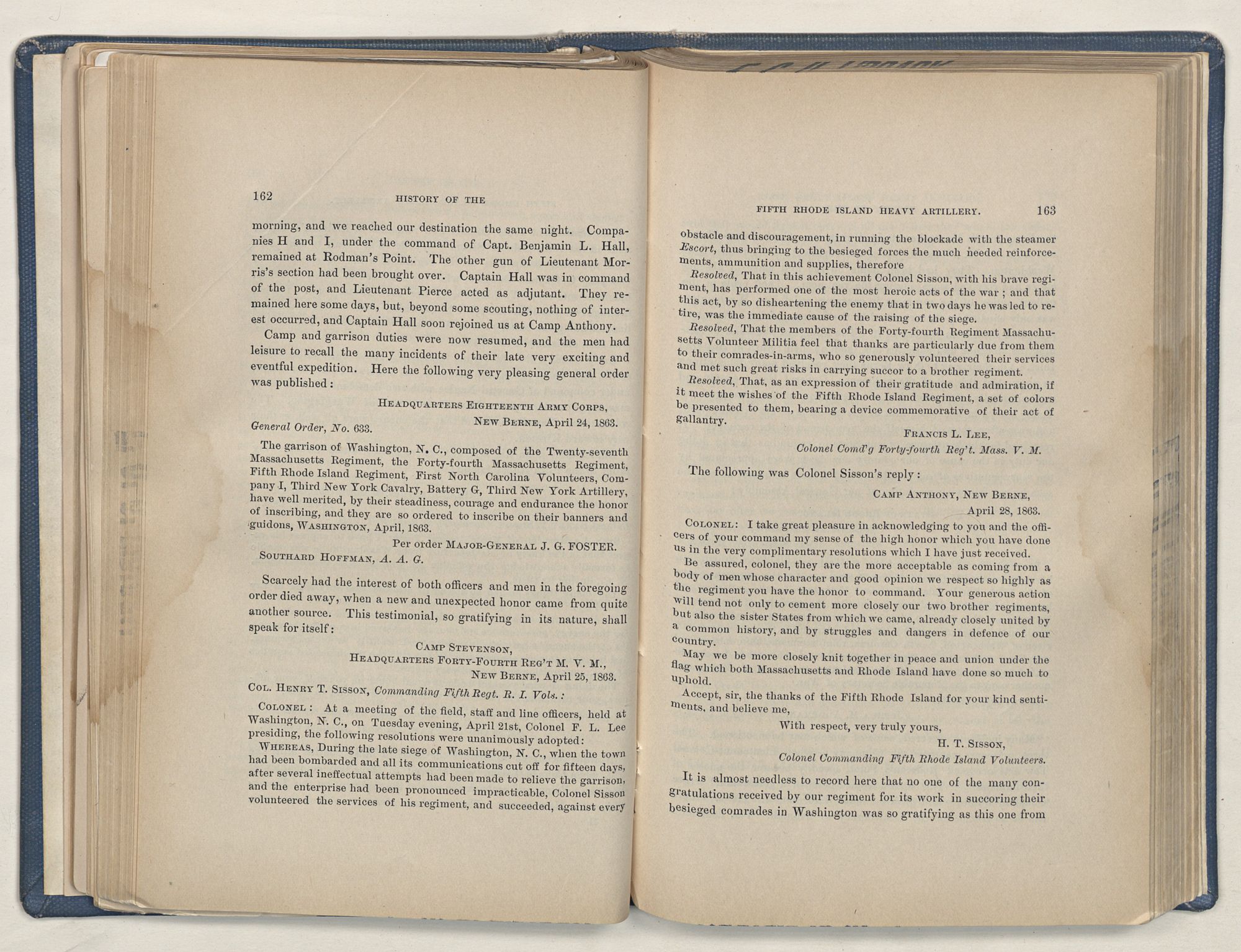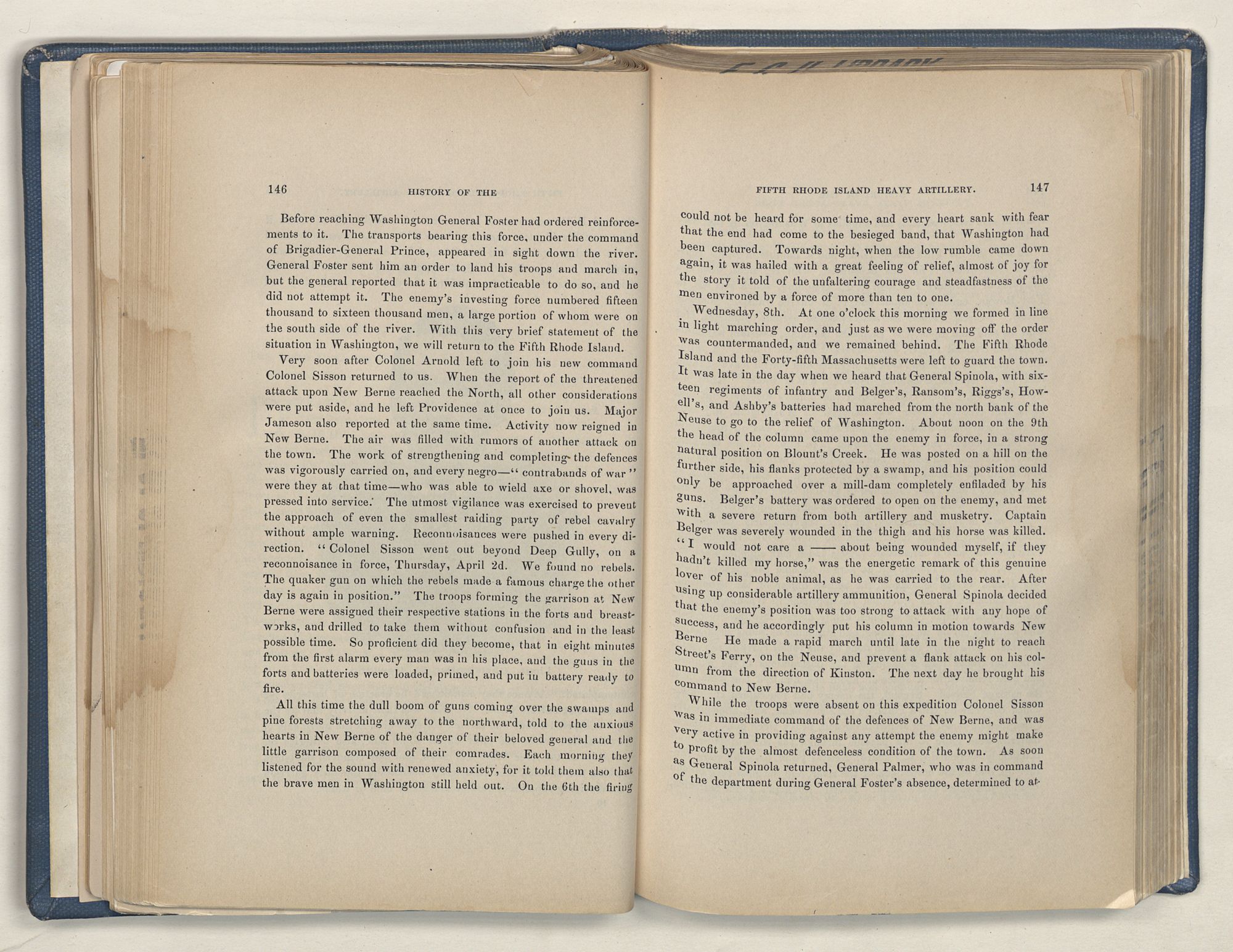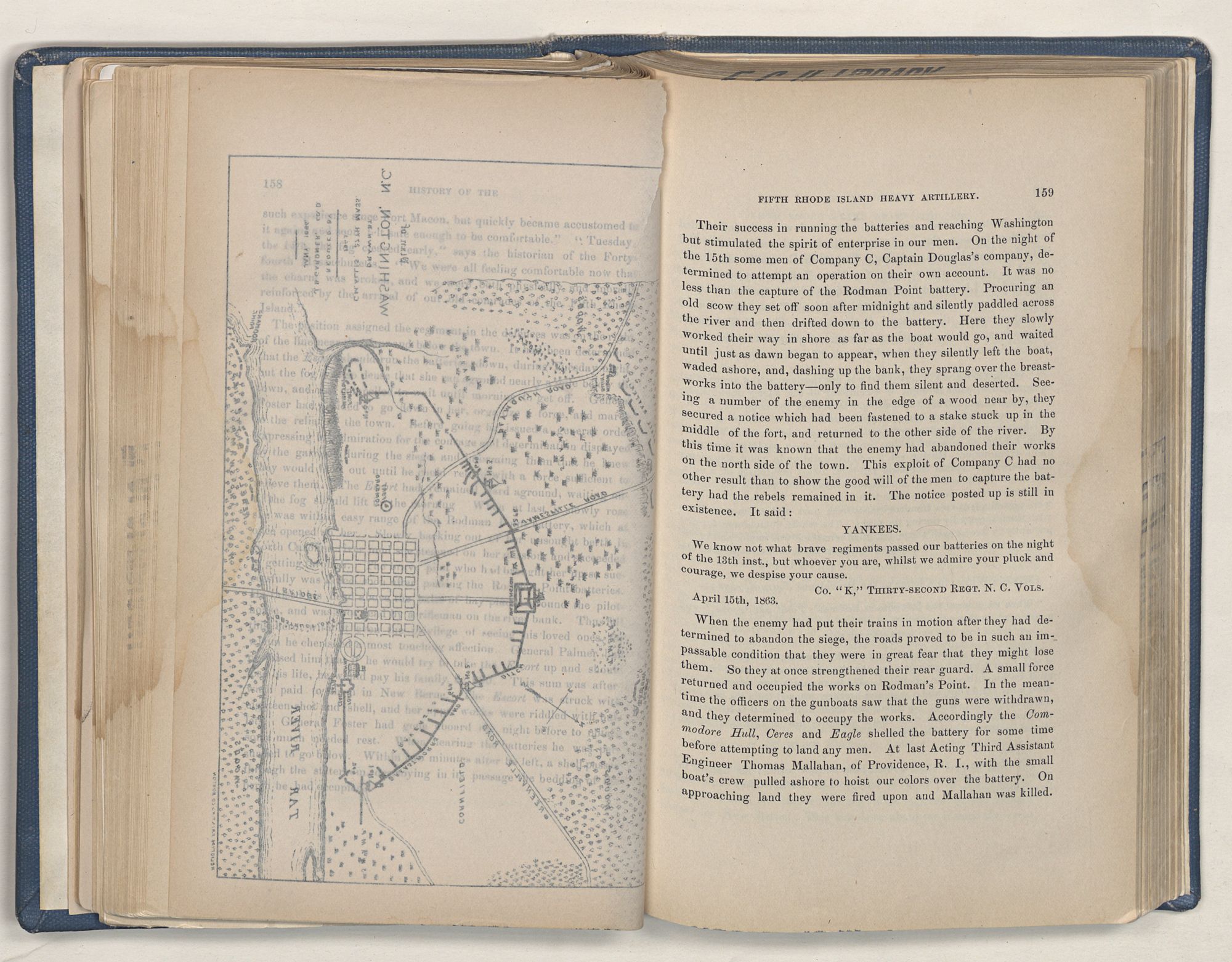 Henry T. Sisson, Colonel Commanding 5th Regiment Rhode Island ArtilleryHISTORYOF THEFIFTH REGIMENTOF Rhode Island Heavy Artillery,DURINGTHREE YEARS AND A HALF OF SERVICE INNORTH CAROLINA. January 1862-June 1865. COMPILED UNDER THE SUPERVISION OFJohn K. Burlingame.PROVIDENCE:SNOW & FARNHAM.Printers and Publishers,1892.