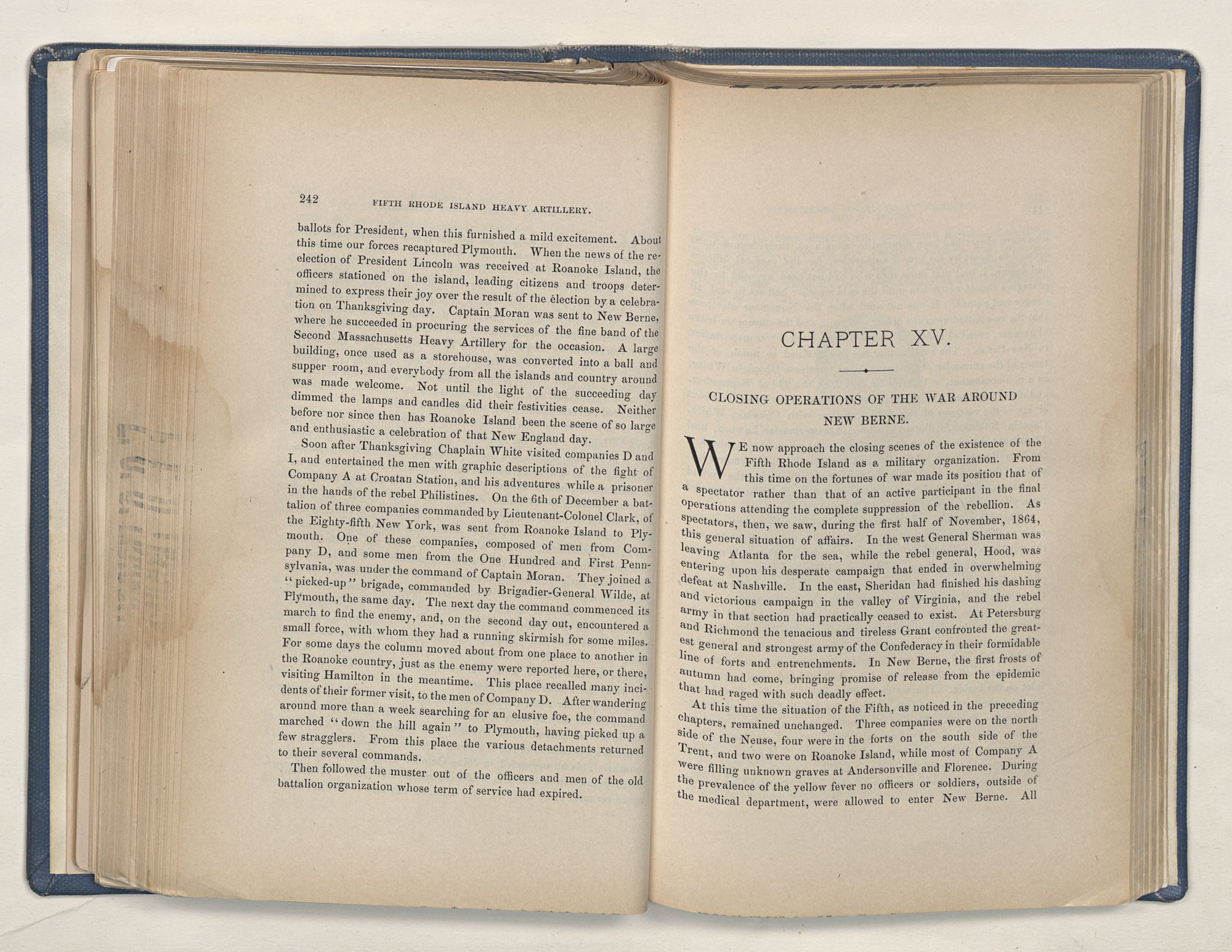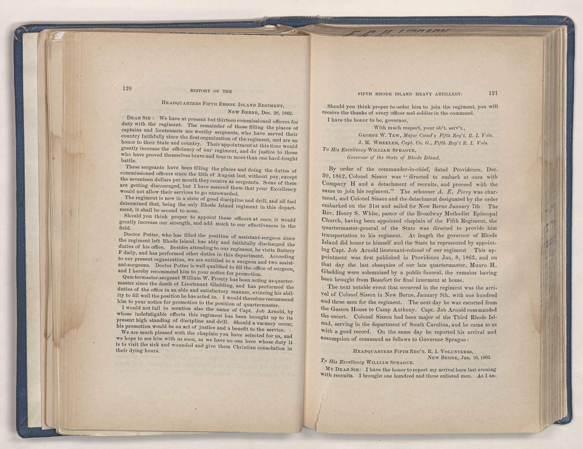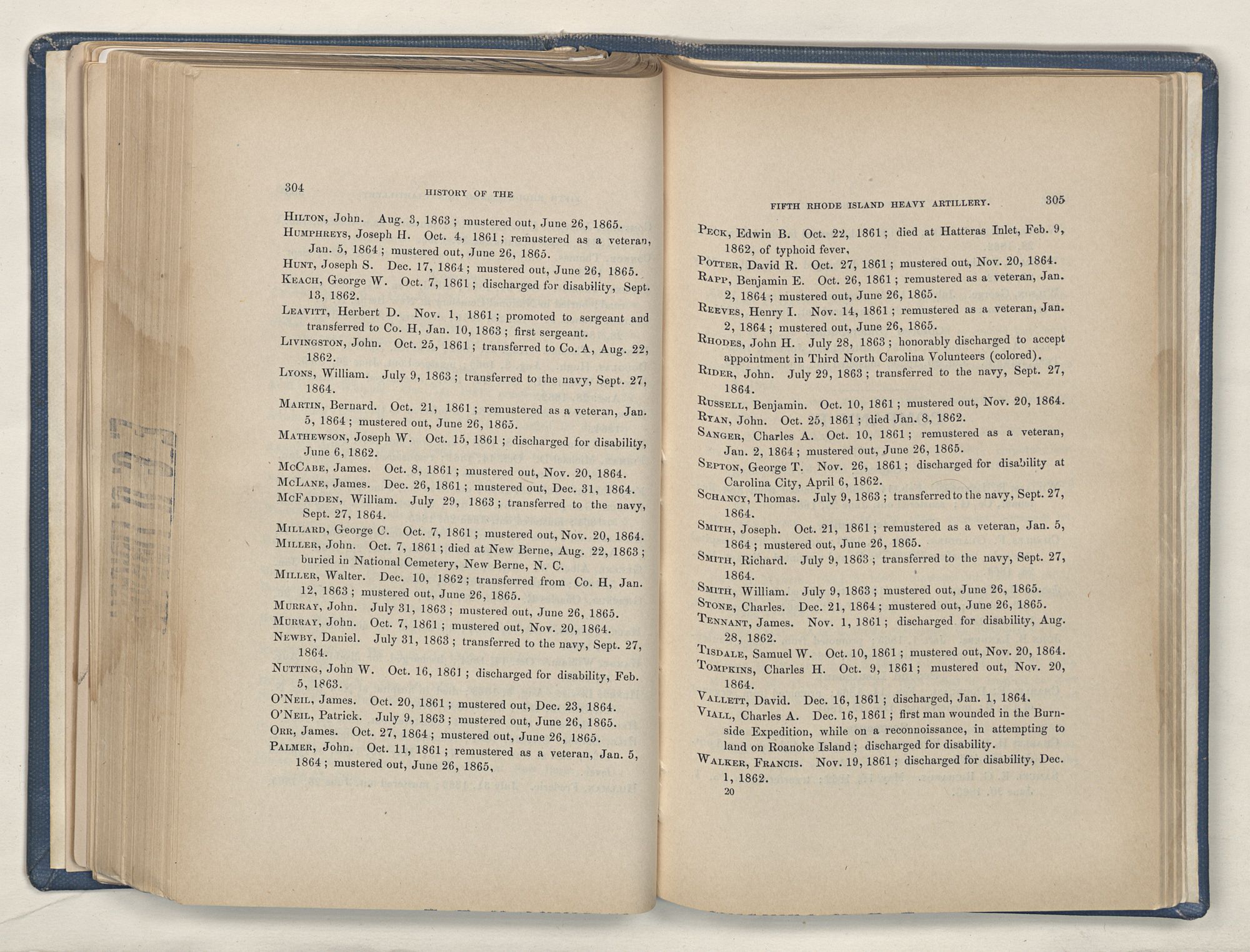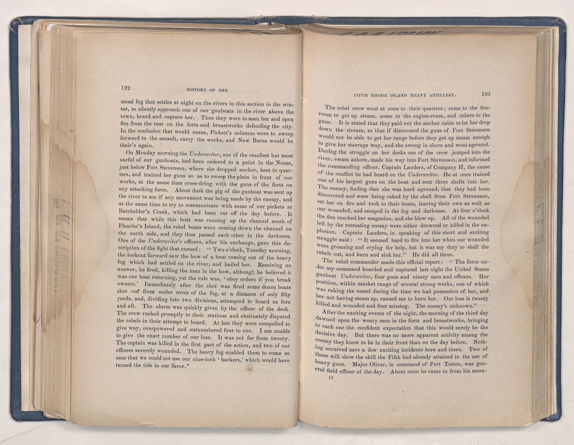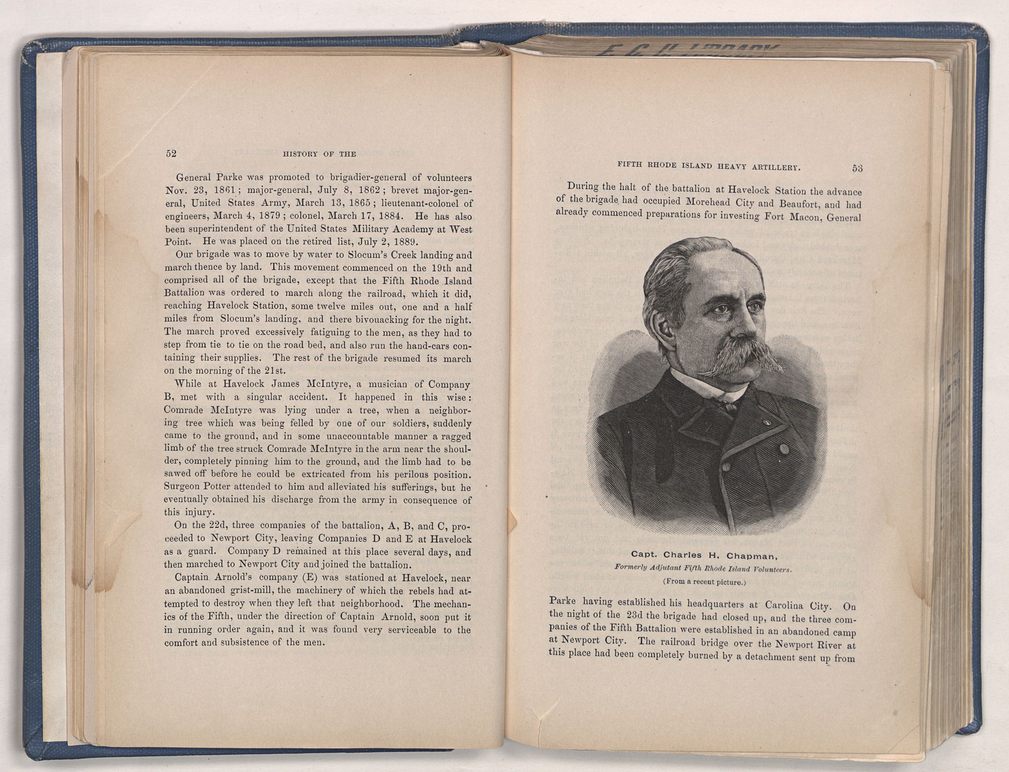Henry T. Sisson, Colonel Commanding 5th Regiment Rhode Island ArtilleryHISTORYOF THEFIFTH REGIMENTOF Rhode Island Heavy Artillery,DURINGTHREE YEARS AND A HALF OF SERVICE INNORTH CAROLINA. January 1862-June 1865. COMPILED UNDER THE SUPERVISION OFJohn K. Burlingame.PROVIDENCE:SNOW & FARNHAM.Printers and Publishers,1892.