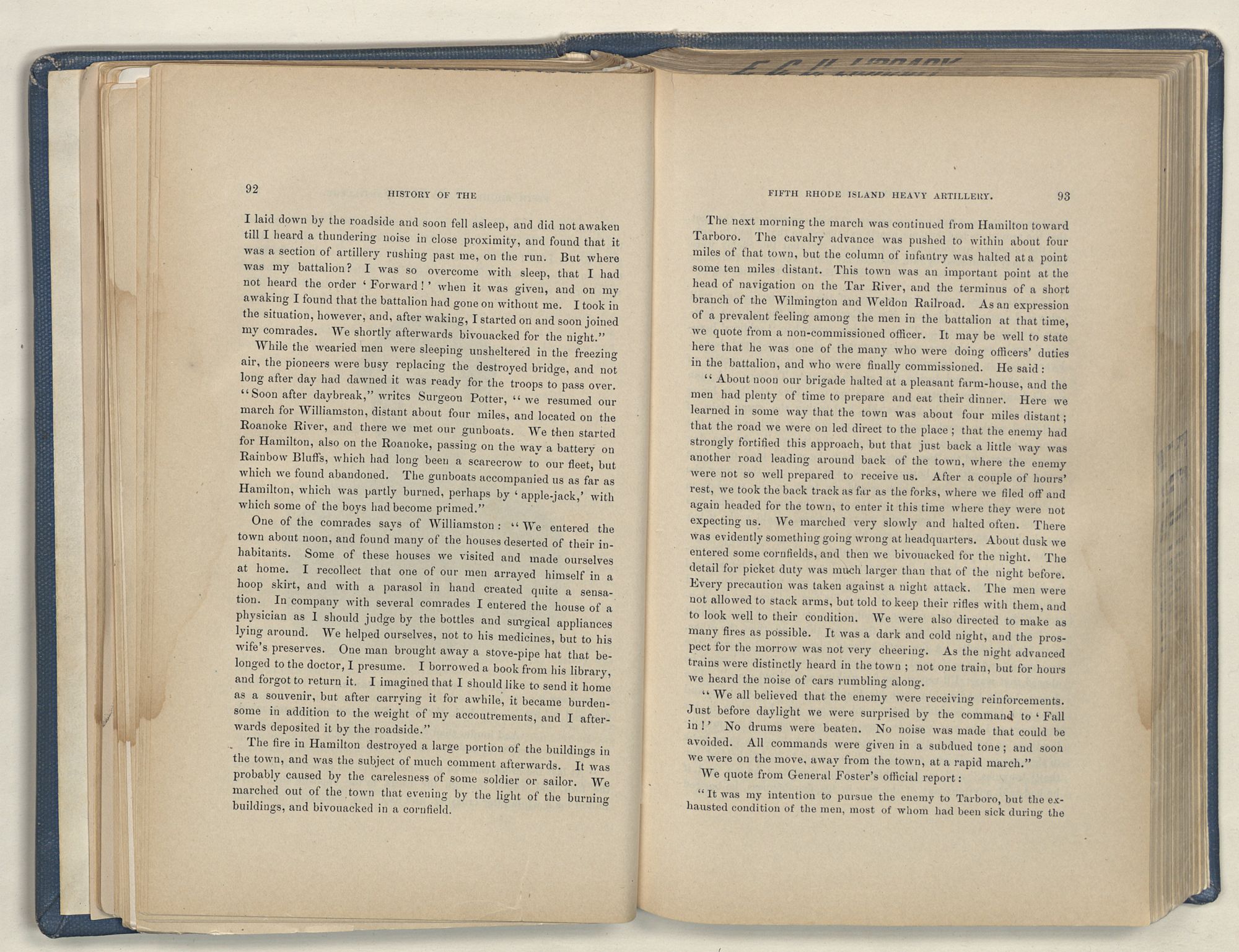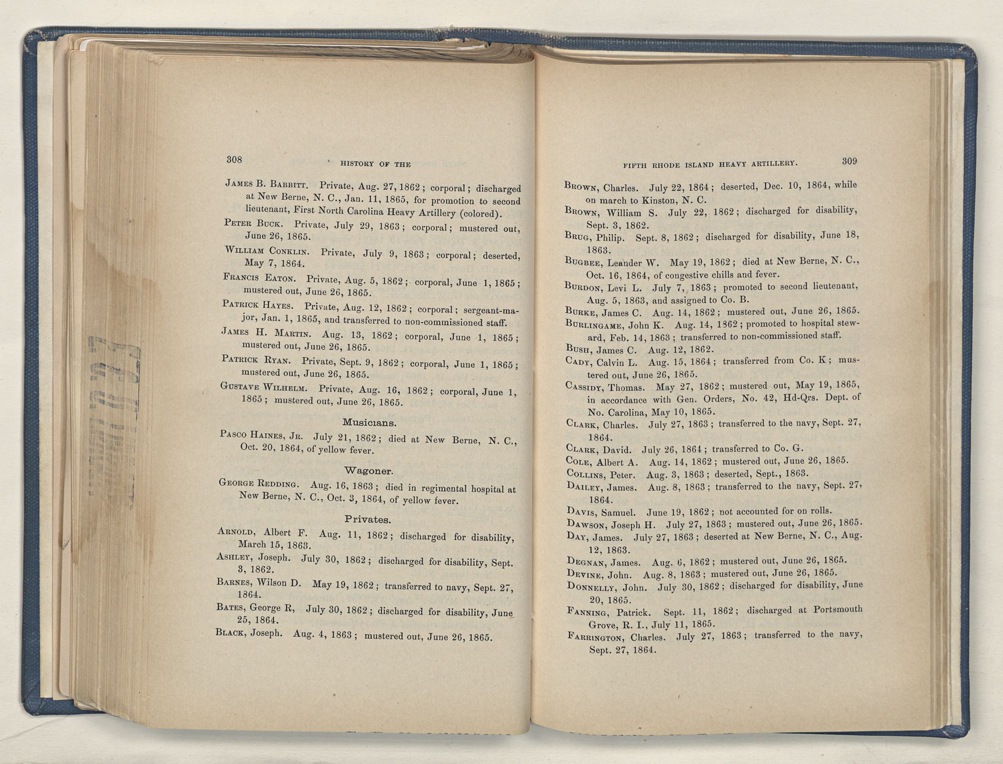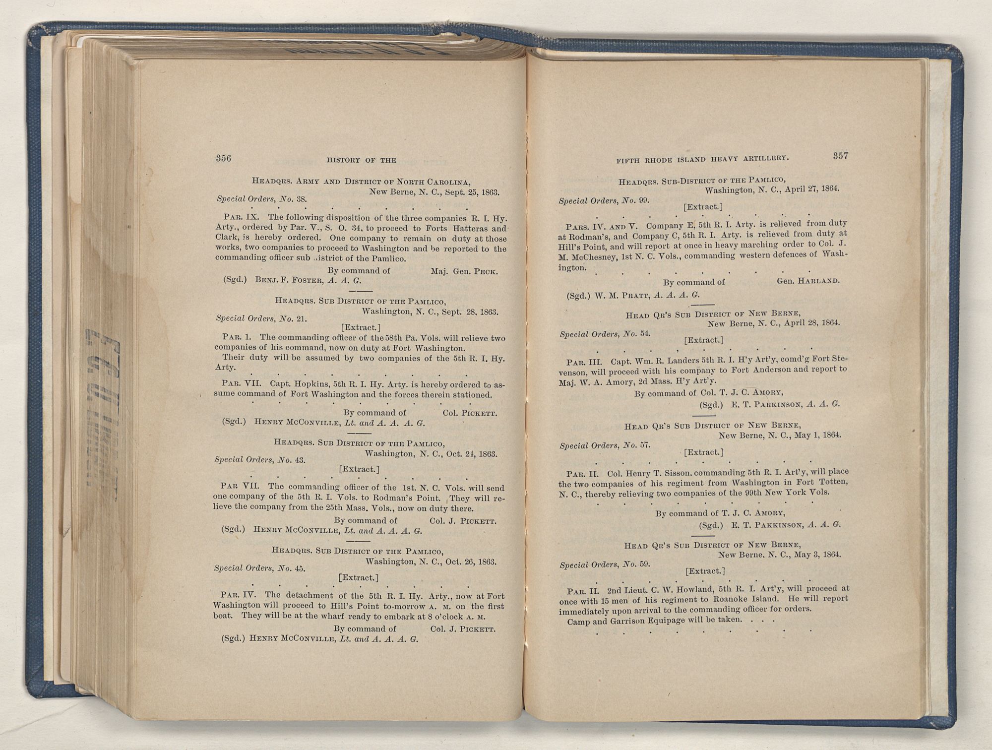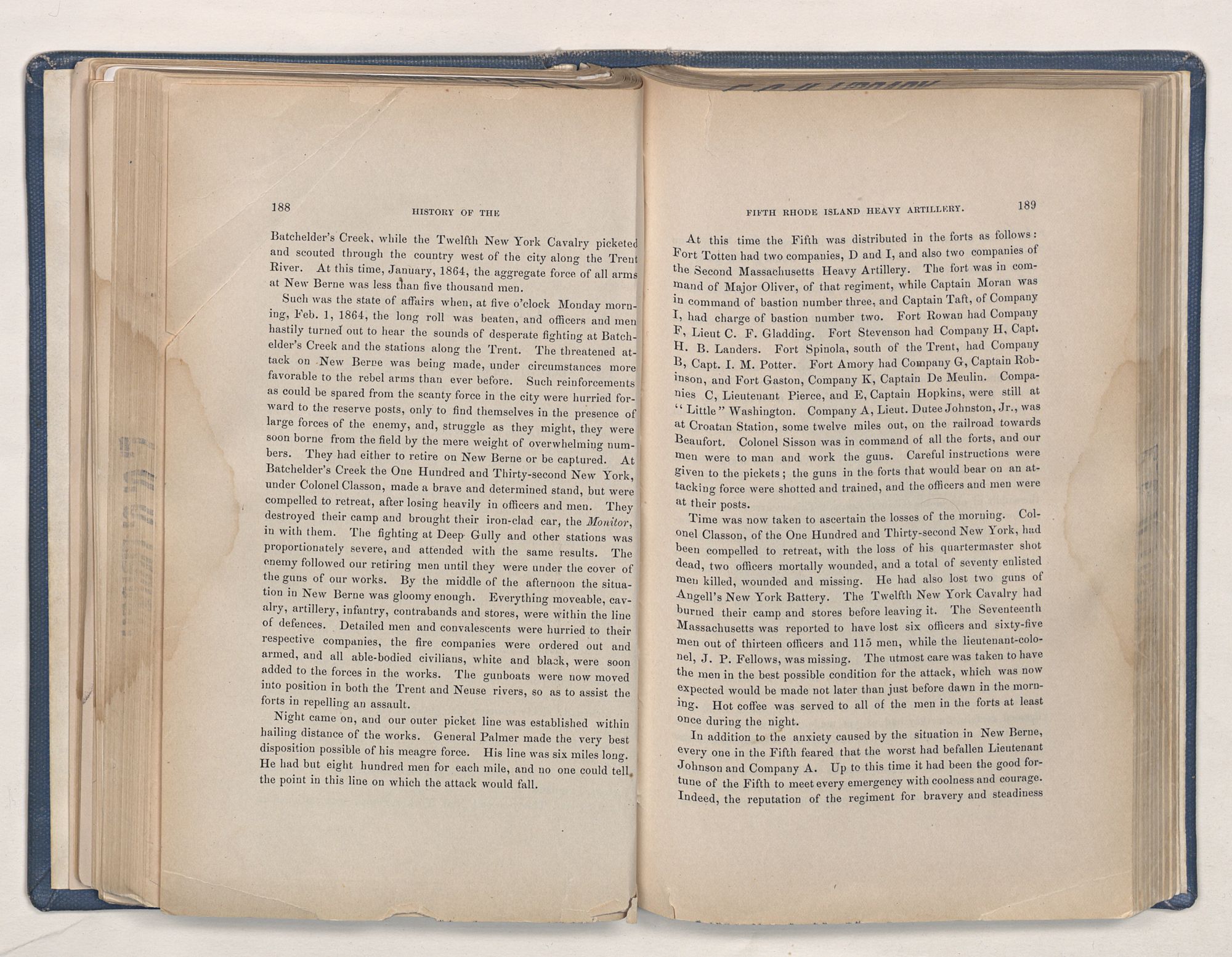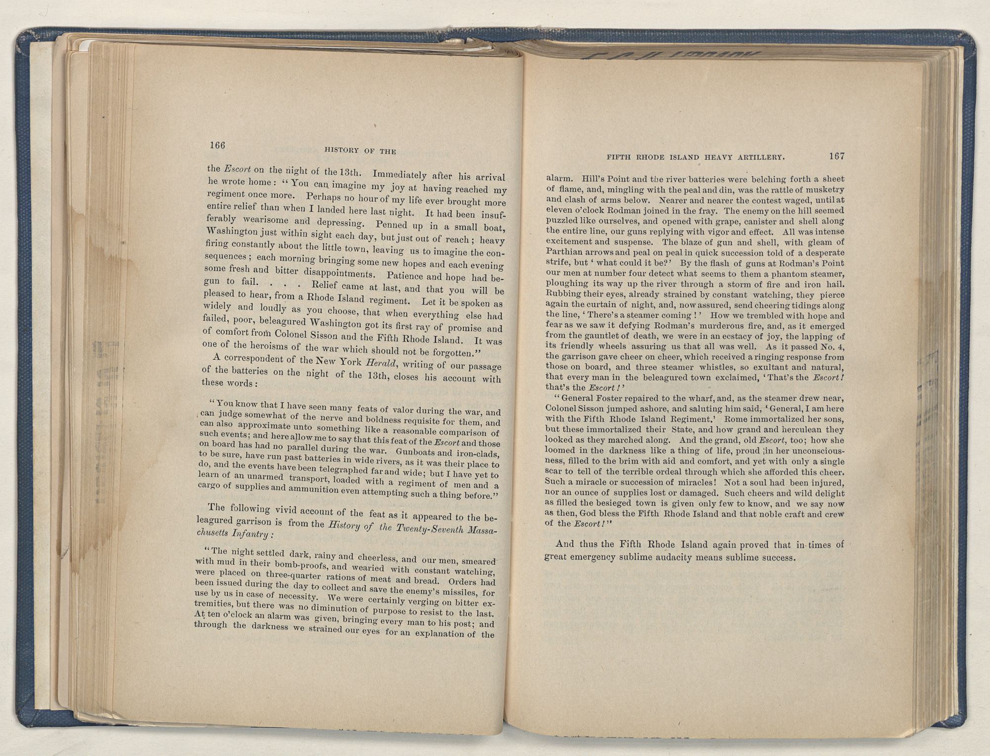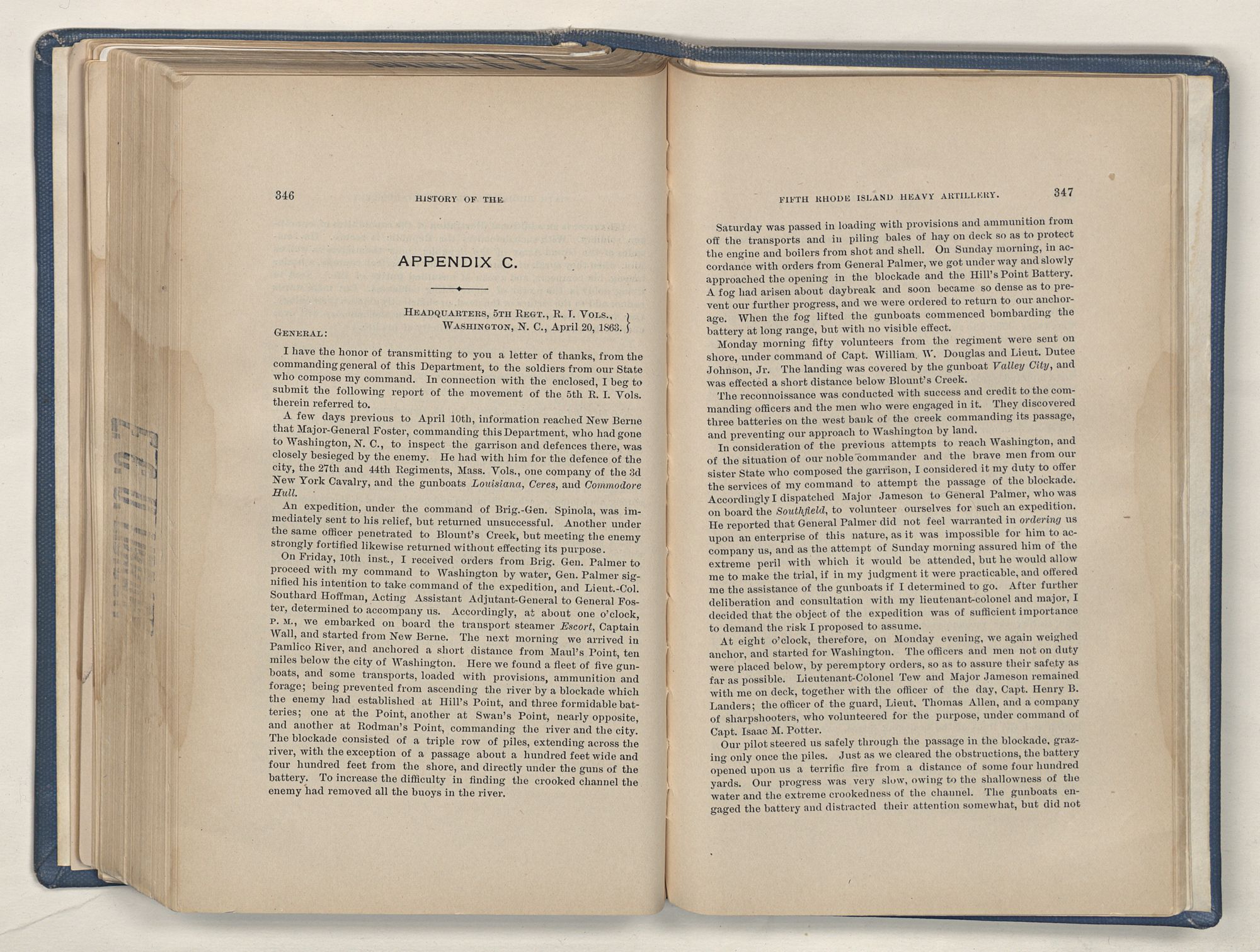 Henry T. Sisson, Colonel Commanding 5th Regiment Rhode Island ArtilleryHISTORYOF THEFIFTH REGIMENTOF Rhode Island Heavy Artillery,DURINGTHREE YEARS AND A HALF OF SERVICE INNORTH CAROLINA. January 1862-June 1865. COMPILED UNDER THE SUPERVISION OFJohn K. Burlingame.PROVIDENCE:SNOW & FARNHAM.Printers and Publishers,1892.