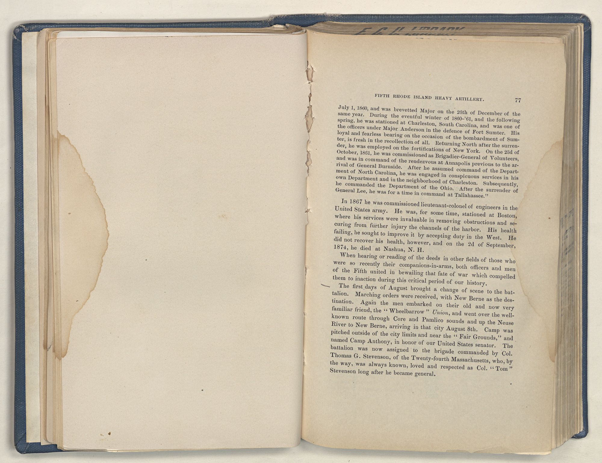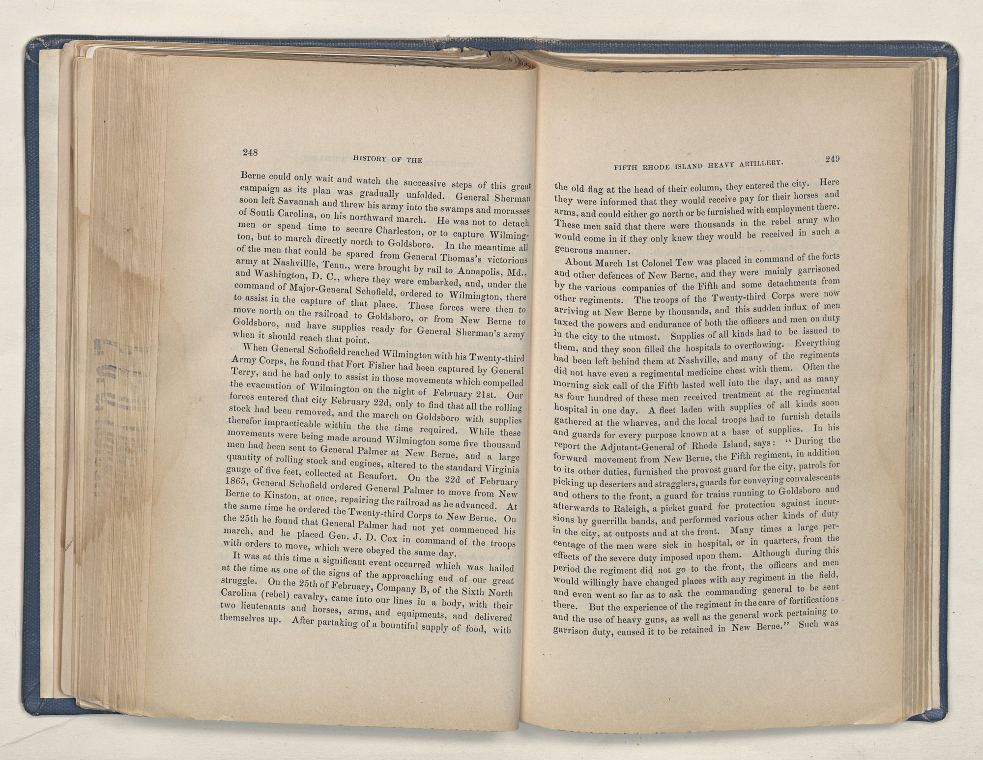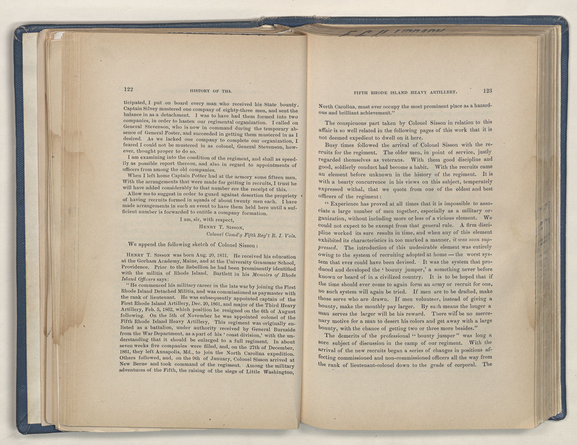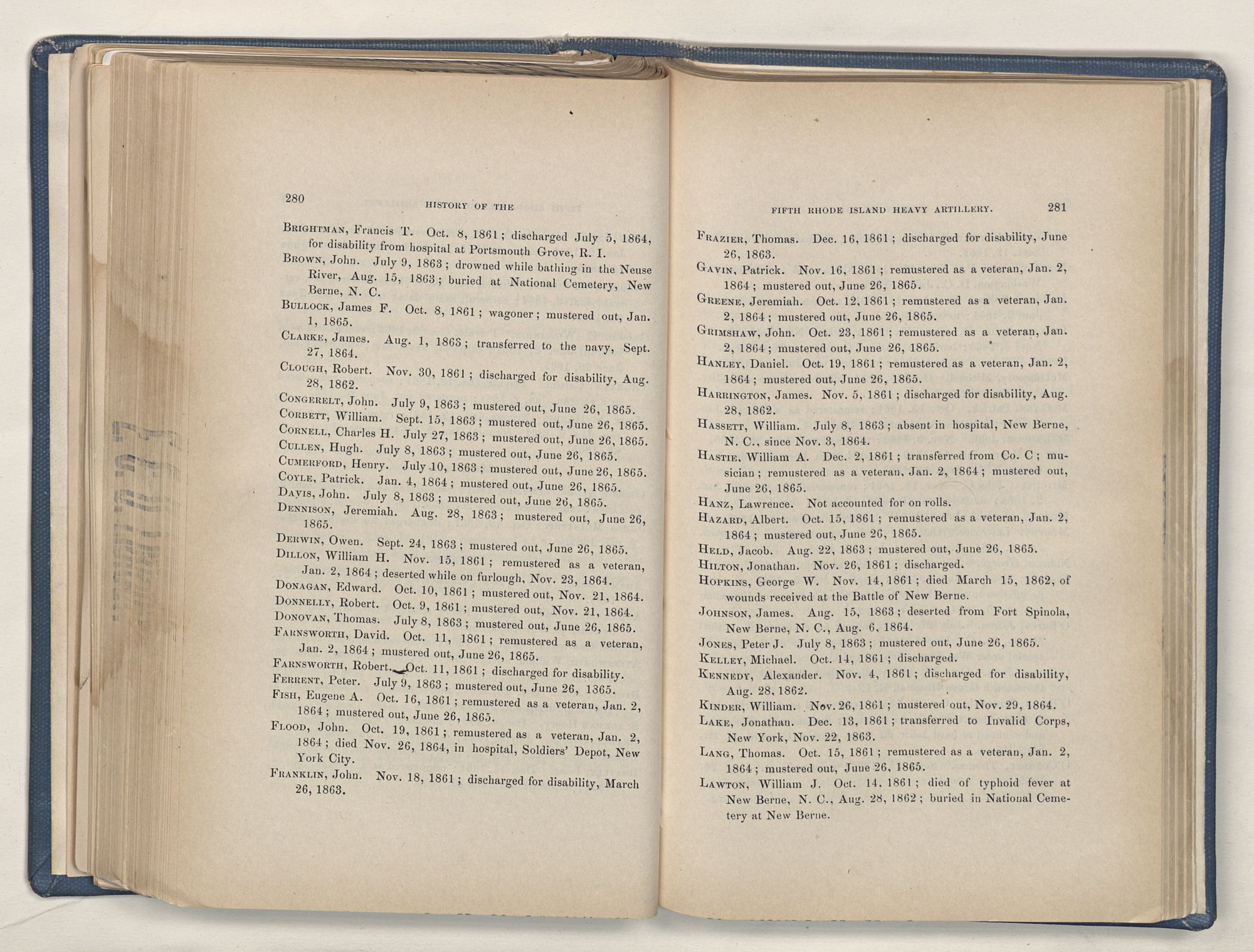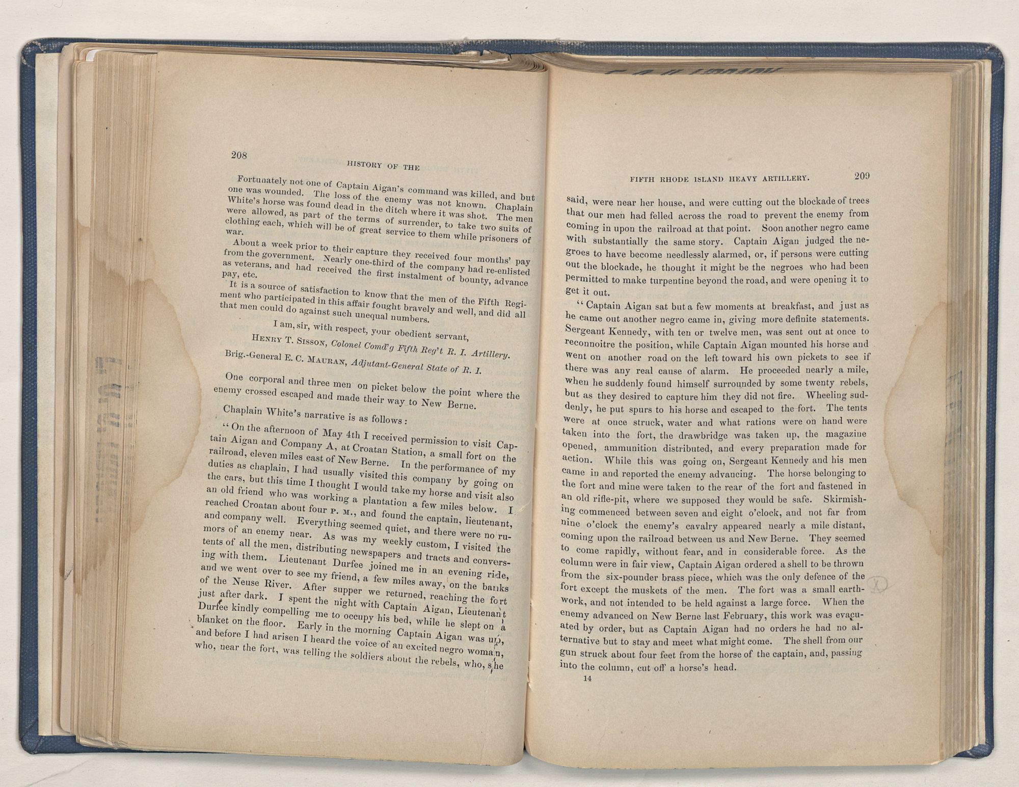 Henry T. Sisson, Colonel Commanding 5th Regiment Rhode Island ArtilleryHISTORYOF THEFIFTH REGIMENTOF Rhode Island Heavy Artillery,DURINGTHREE YEARS AND A HALF OF SERVICE INNORTH CAROLINA. January 1862-June 1865. COMPILED UNDER THE SUPERVISION OFJohn K. Burlingame.PROVIDENCE:SNOW & FARNHAM.Printers and Publishers,1892.