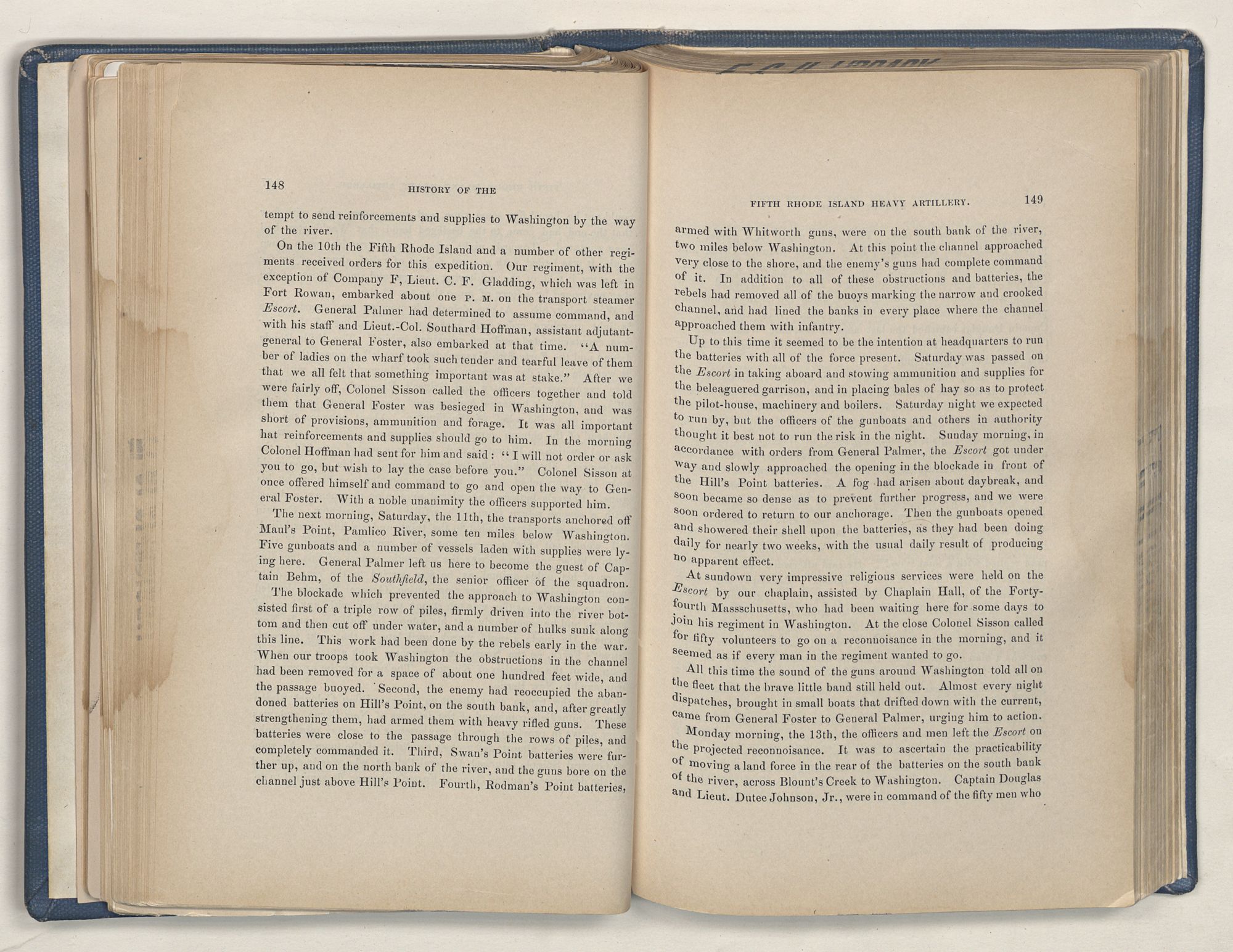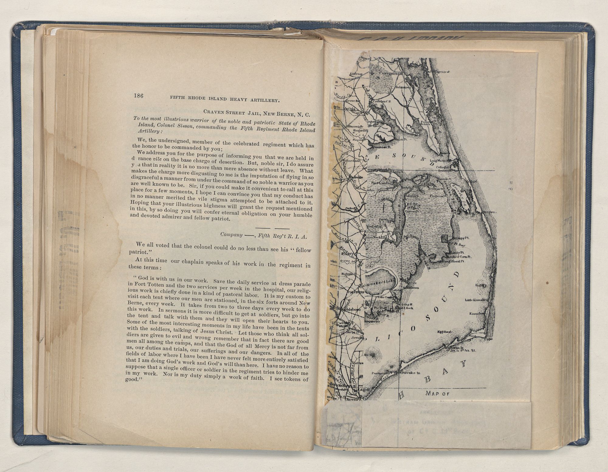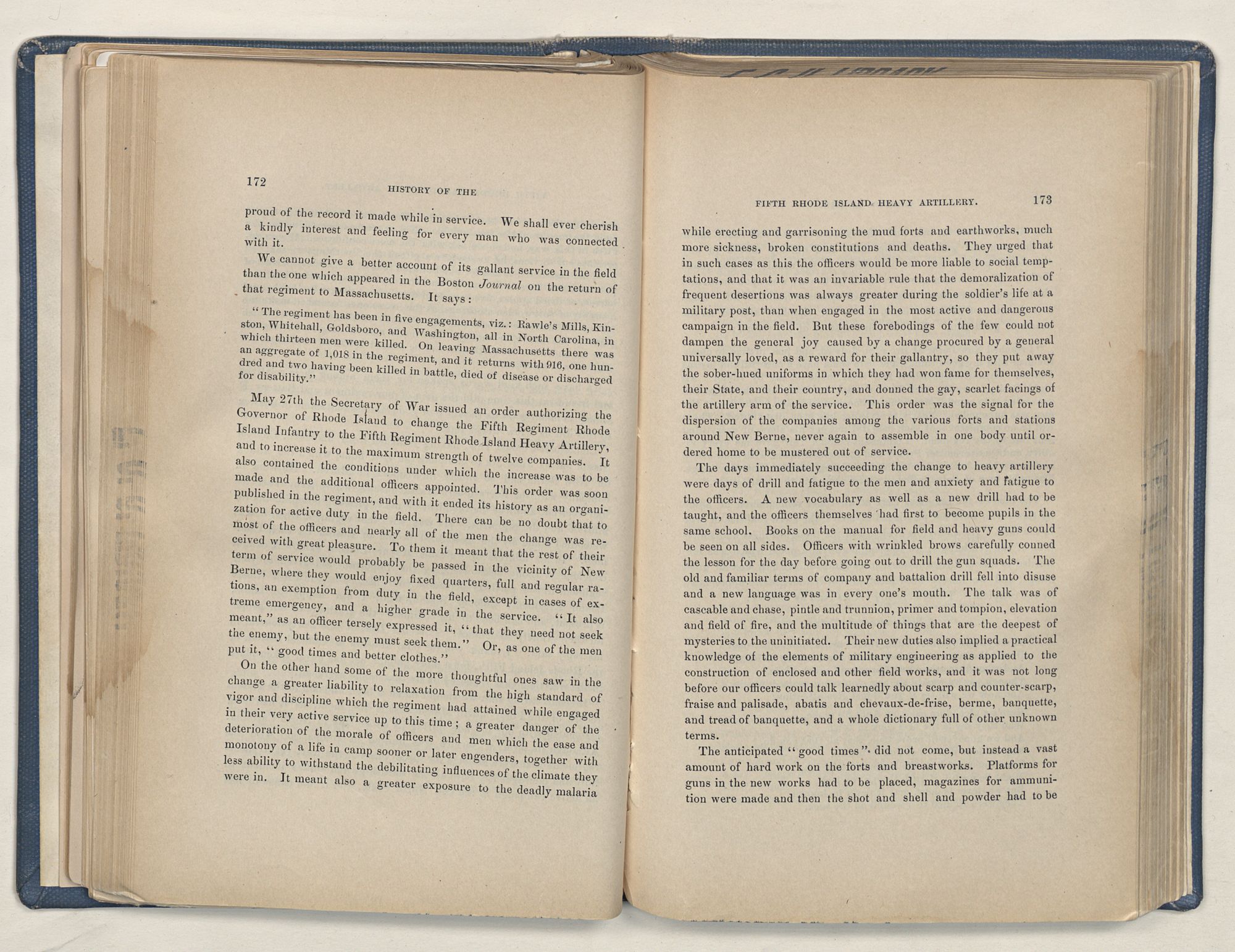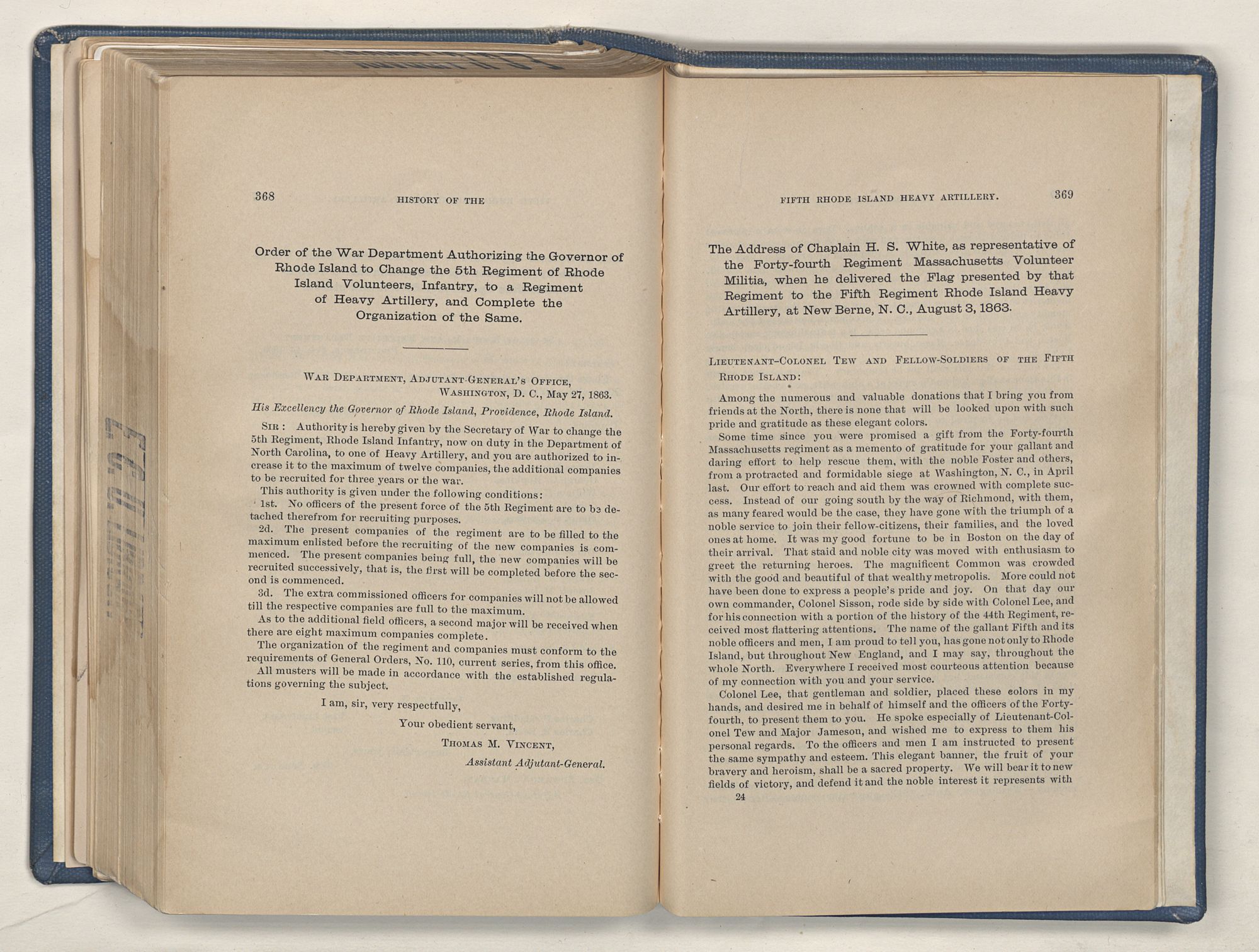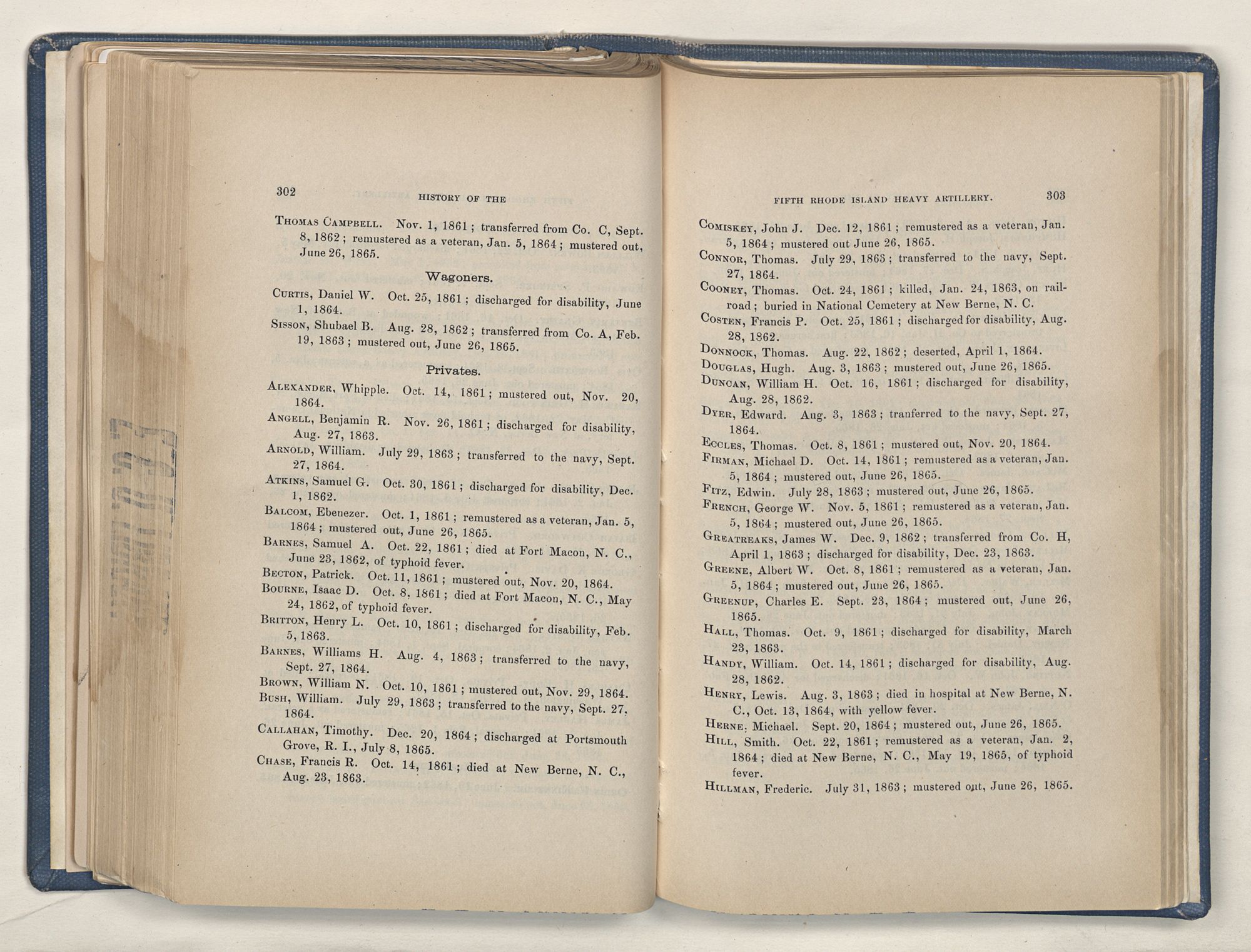 Henry T. Sisson, Colonel Commanding 5th Regiment Rhode Island ArtilleryHISTORYOF THEFIFTH REGIMENTOF Rhode Island Heavy Artillery,DURINGTHREE YEARS AND A HALF OF SERVICE INNORTH CAROLINA. January 1862-June 1865. COMPILED UNDER THE SUPERVISION OFJohn K. Burlingame.PROVIDENCE:SNOW & FARNHAM.Printers and Publishers,1892.