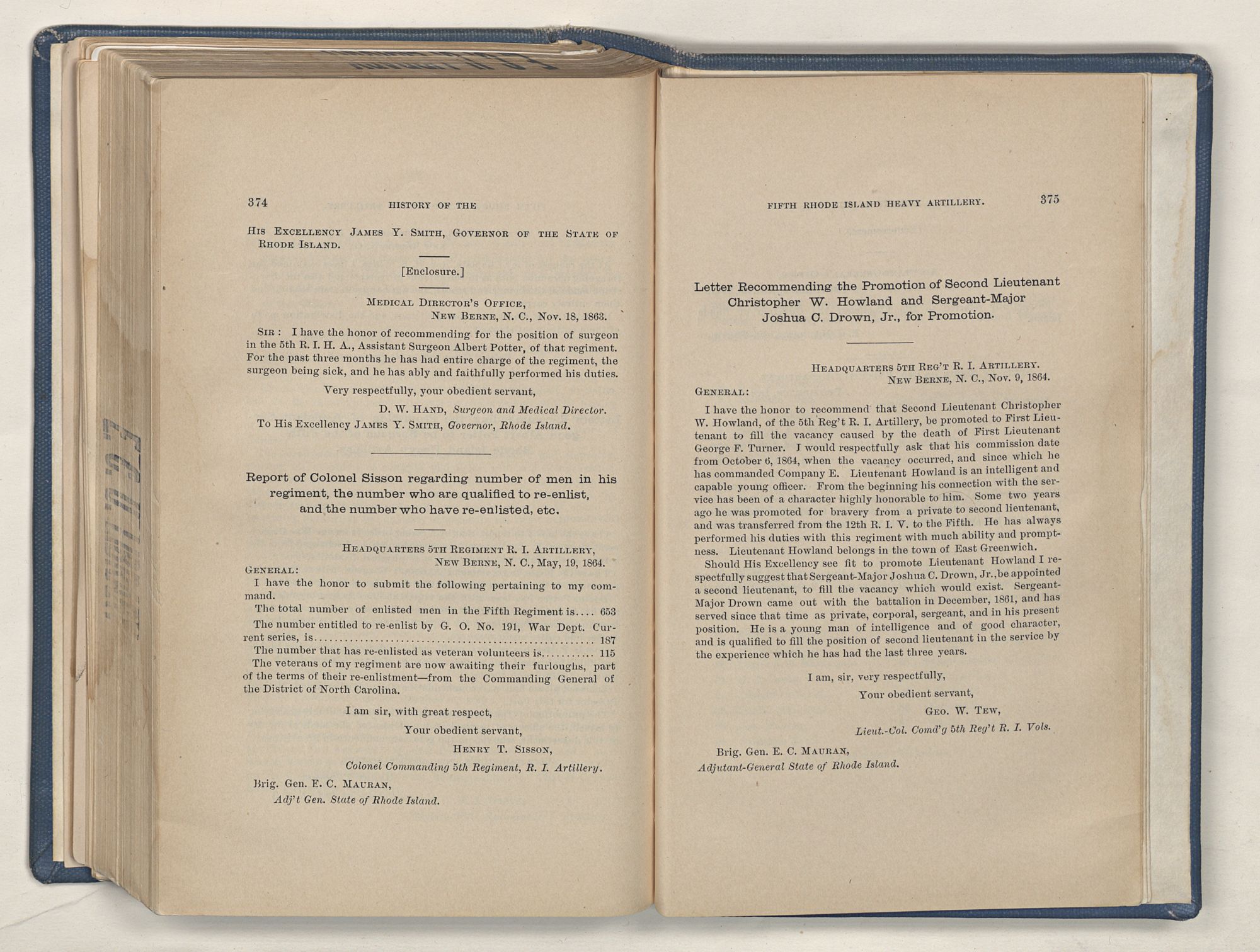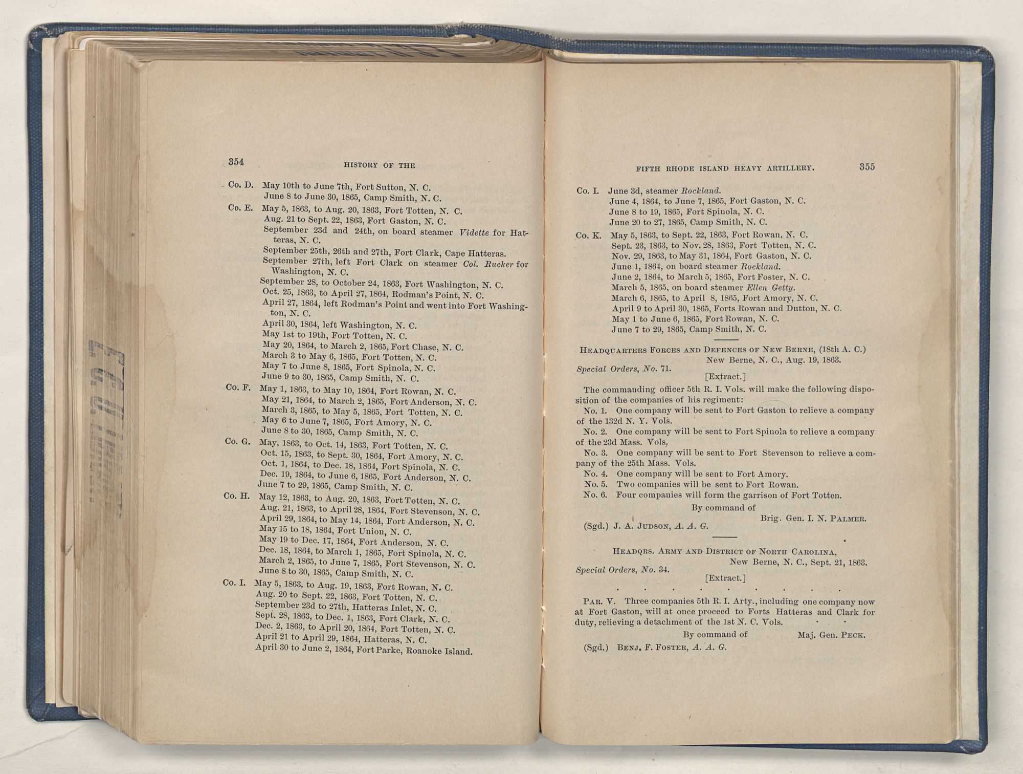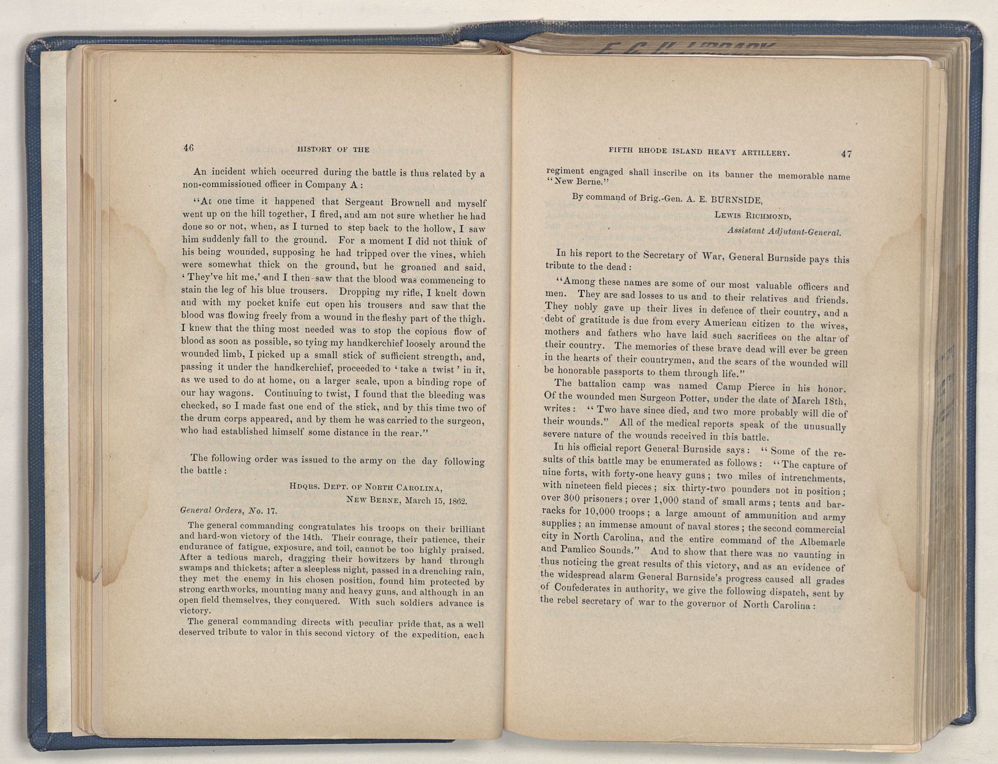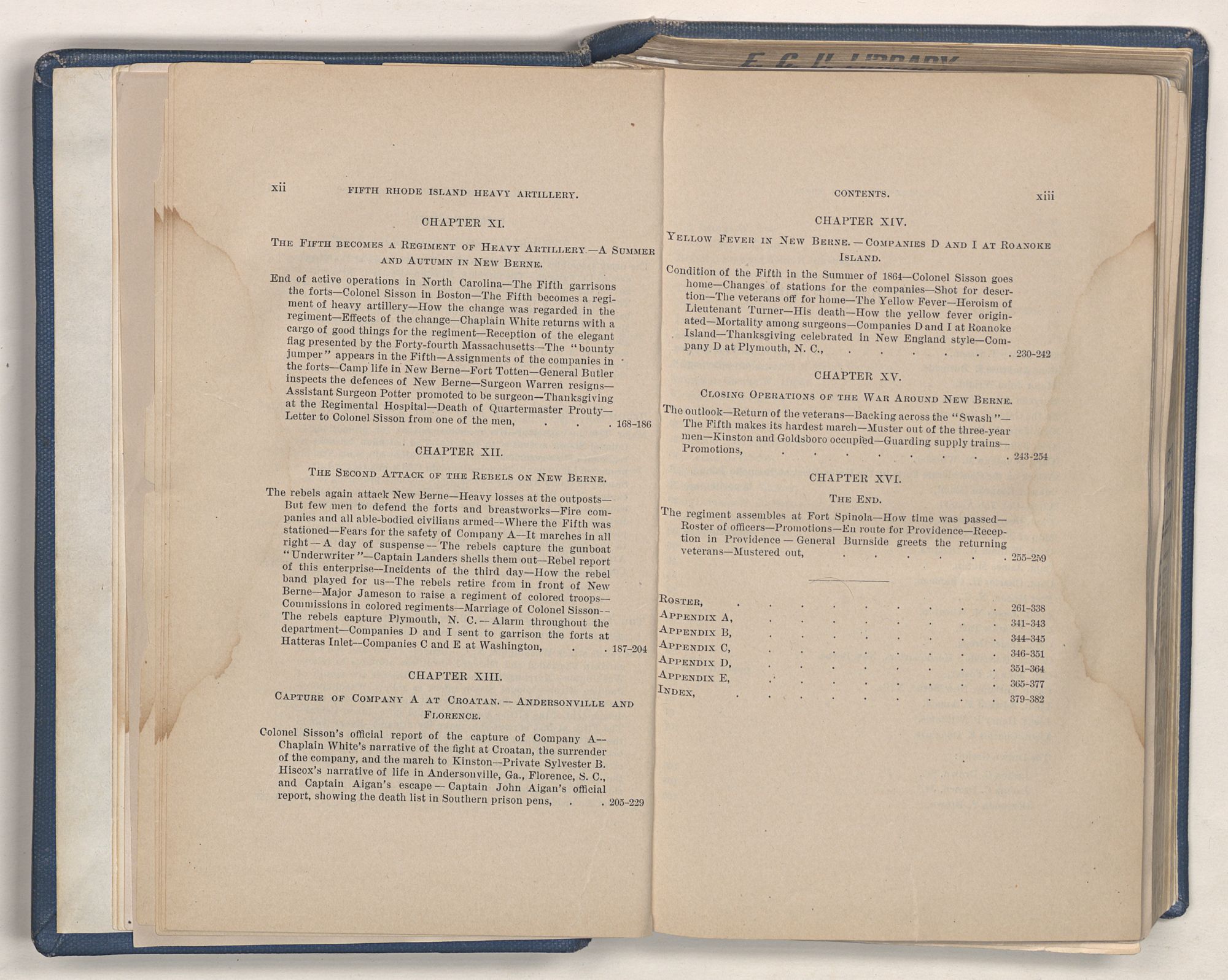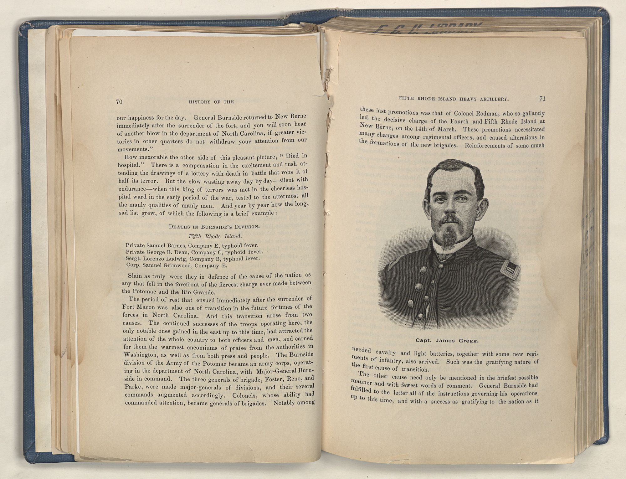Henry T. Sisson, Colonel Commanding 5th Regiment Rhode Island ArtilleryHISTORYOF THEFIFTH REGIMENTOF Rhode Island Heavy Artillery,DURINGTHREE YEARS AND A HALF OF SERVICE INNORTH CAROLINA. January 1862-June 1865. COMPILED UNDER THE SUPERVISION OFJohn K. Burlingame.PROVIDENCE:SNOW & FARNHAM.Printers and Publishers,1892.