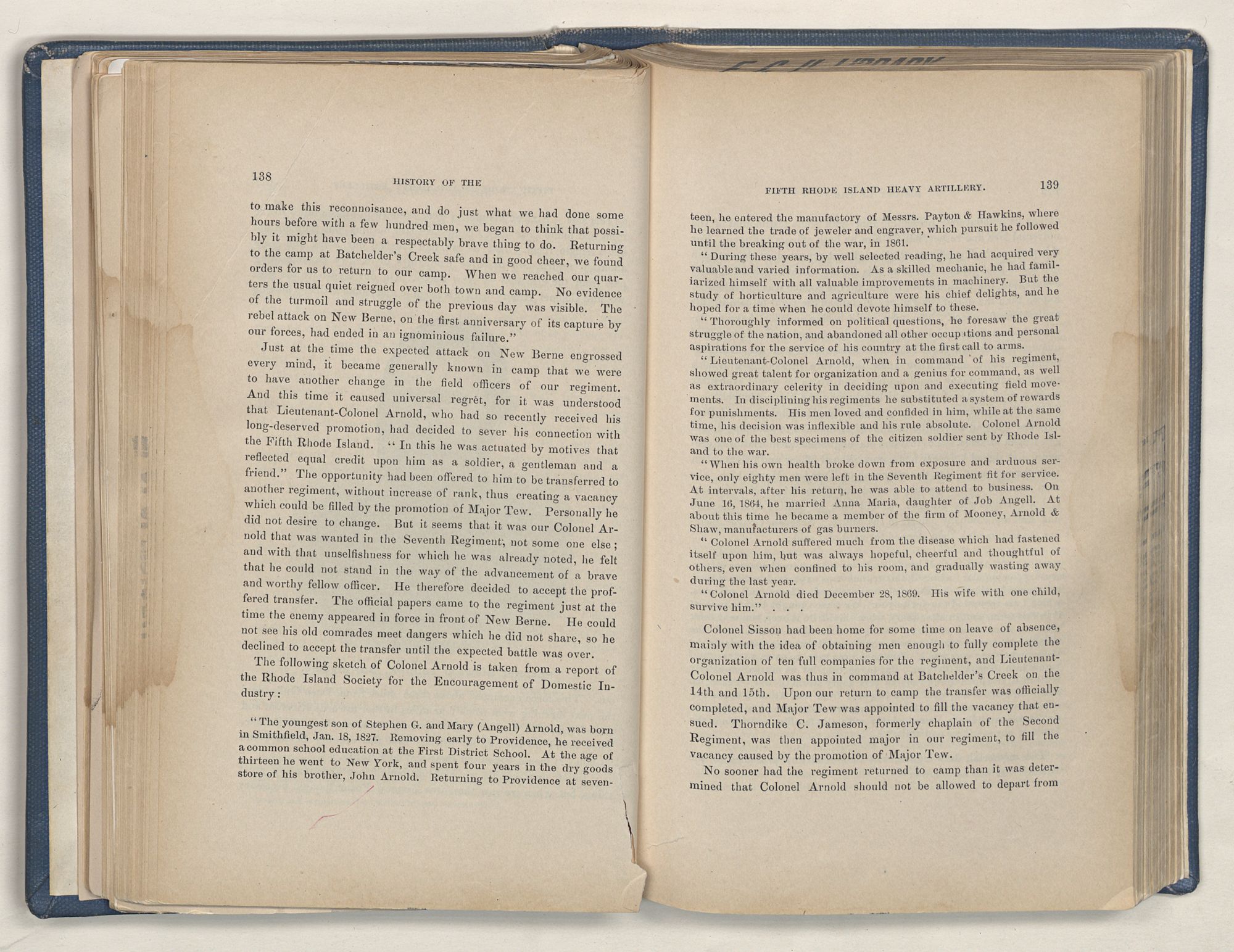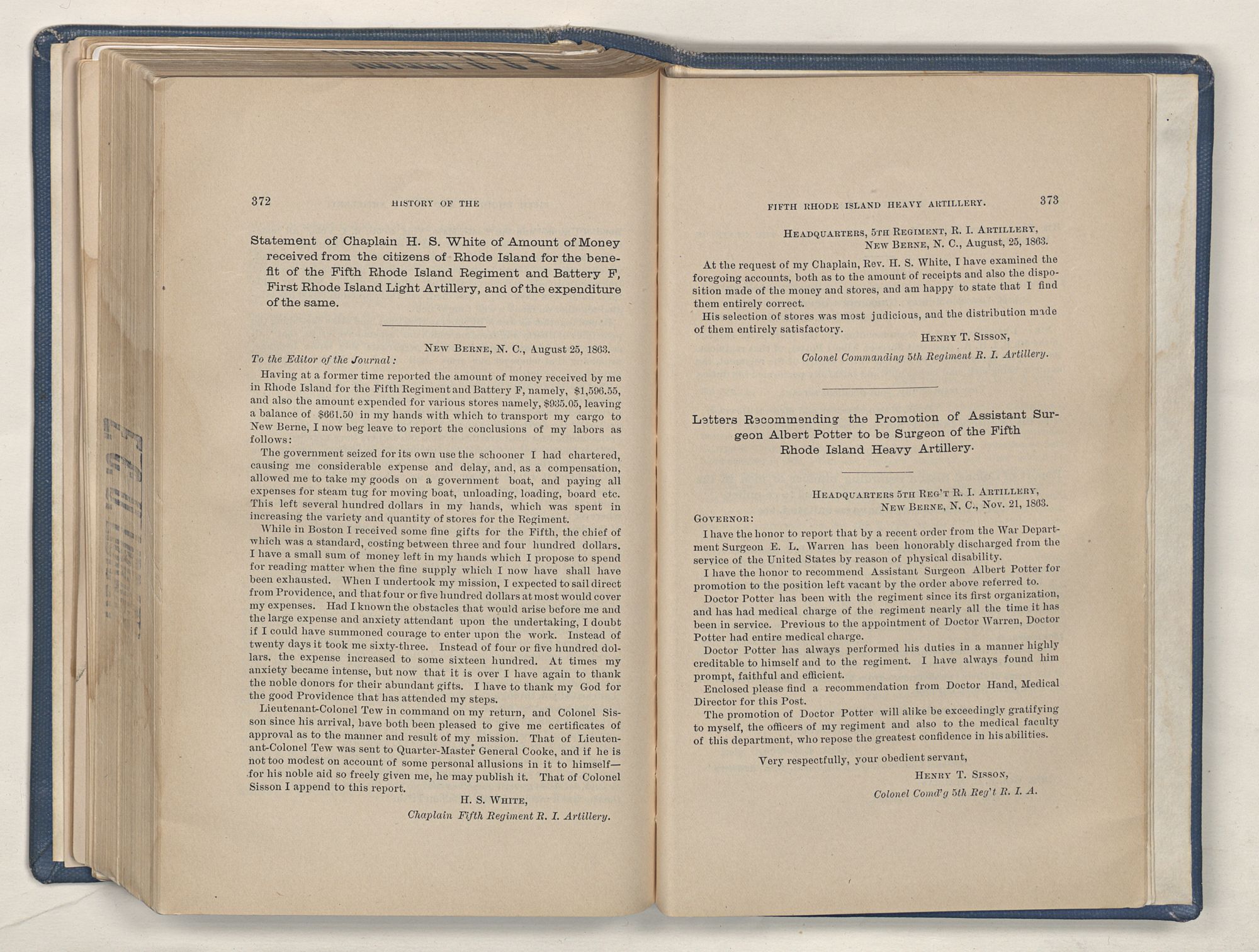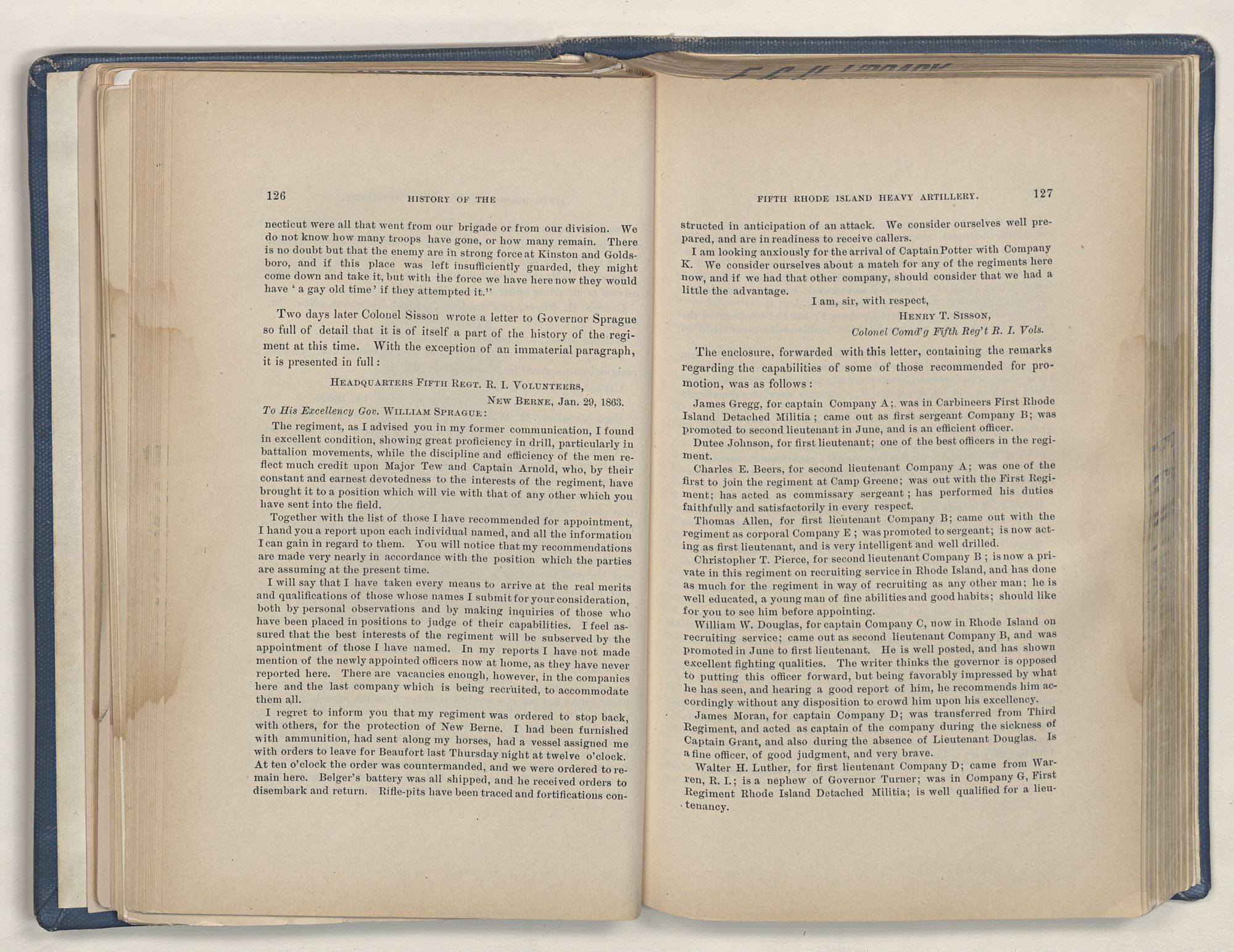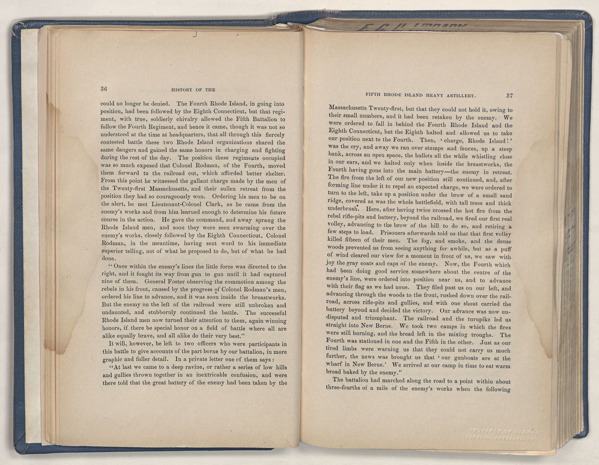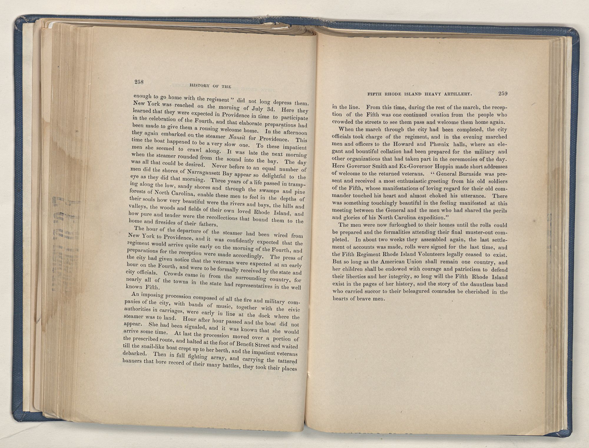 Henry T. Sisson, Colonel Commanding 5th Regiment Rhode Island ArtilleryHISTORYOF THEFIFTH REGIMENTOF Rhode Island Heavy Artillery,DURINGTHREE YEARS AND A HALF OF SERVICE INNORTH CAROLINA. January 1862-June 1865. COMPILED UNDER THE SUPERVISION OFJohn K. Burlingame.PROVIDENCE:SNOW & FARNHAM.Printers and Publishers,1892.