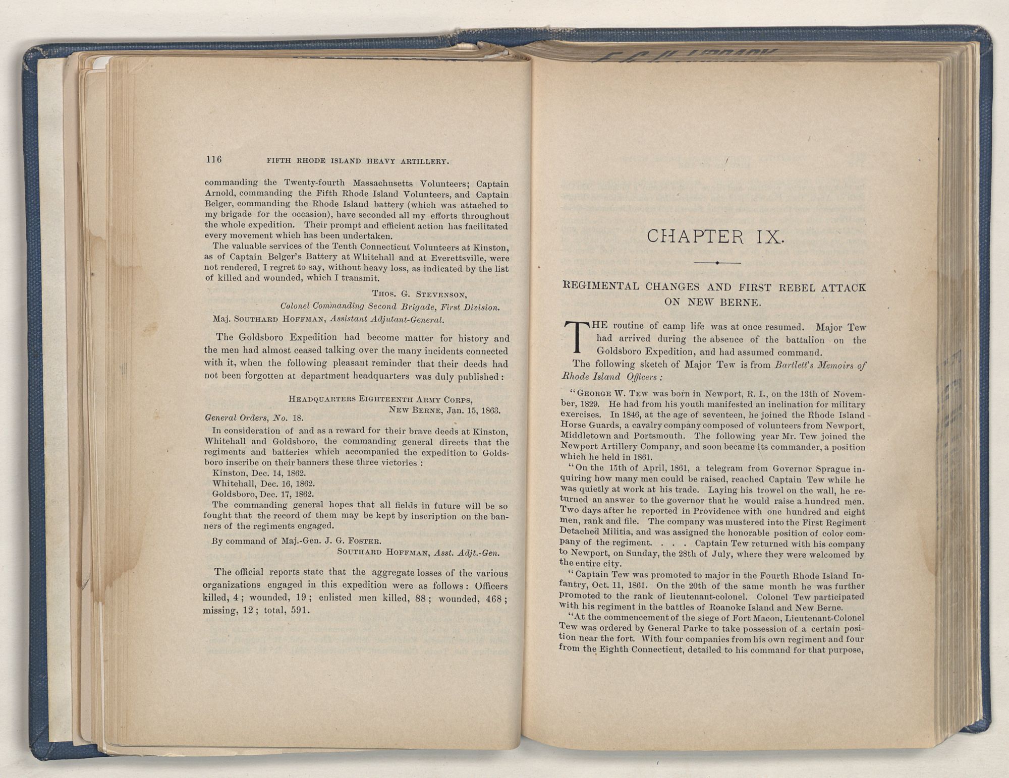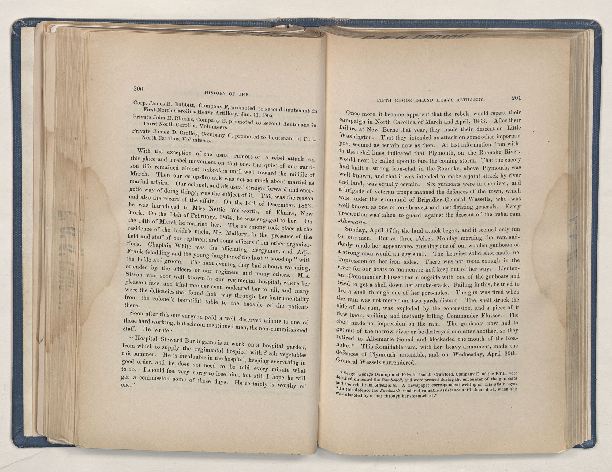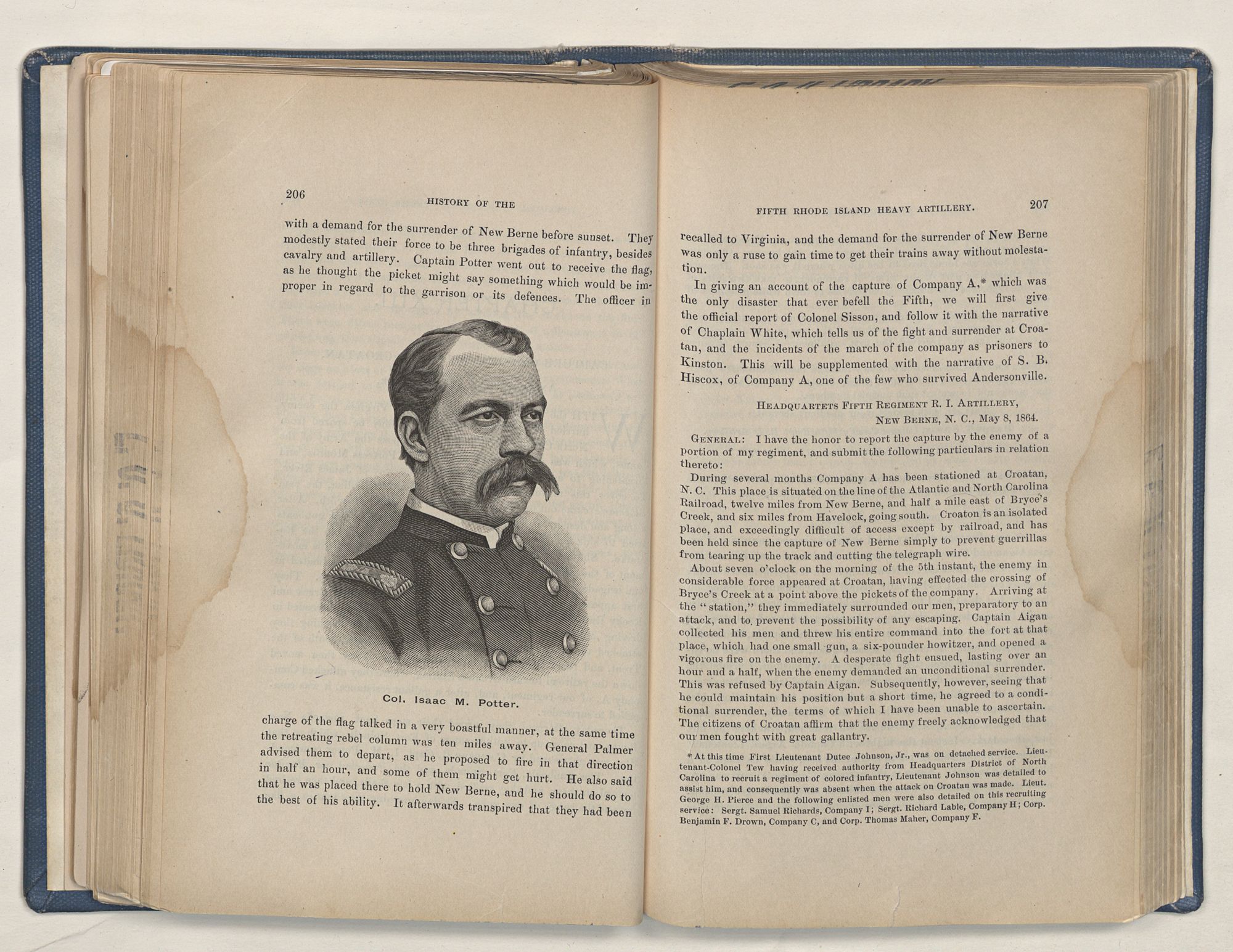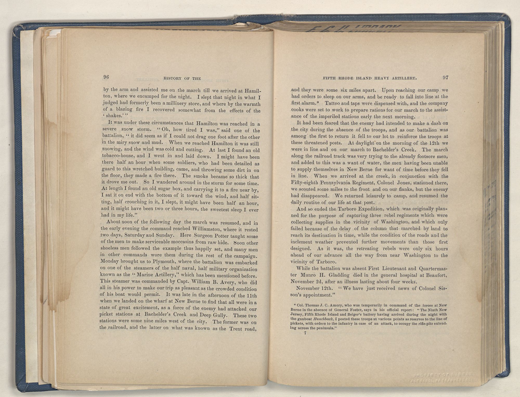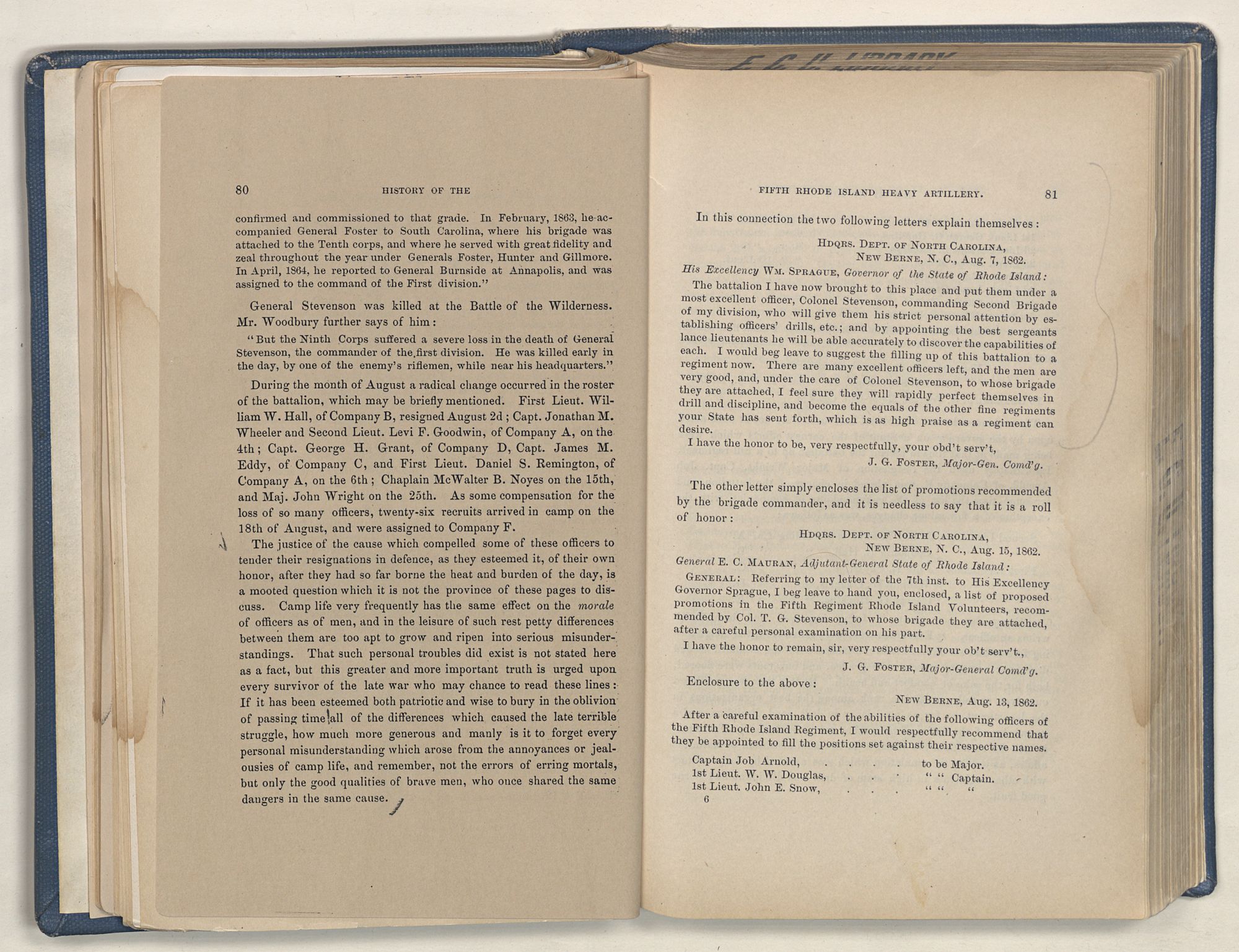 Henry T. Sisson, Colonel Commanding 5th Regiment Rhode Island ArtilleryHISTORYOF THEFIFTH REGIMENTOF Rhode Island Heavy Artillery,DURINGTHREE YEARS AND A HALF OF SERVICE INNORTH CAROLINA. January 1862-June 1865. COMPILED UNDER THE SUPERVISION OFJohn K. Burlingame.PROVIDENCE:SNOW & FARNHAM.Printers and Publishers,1892.