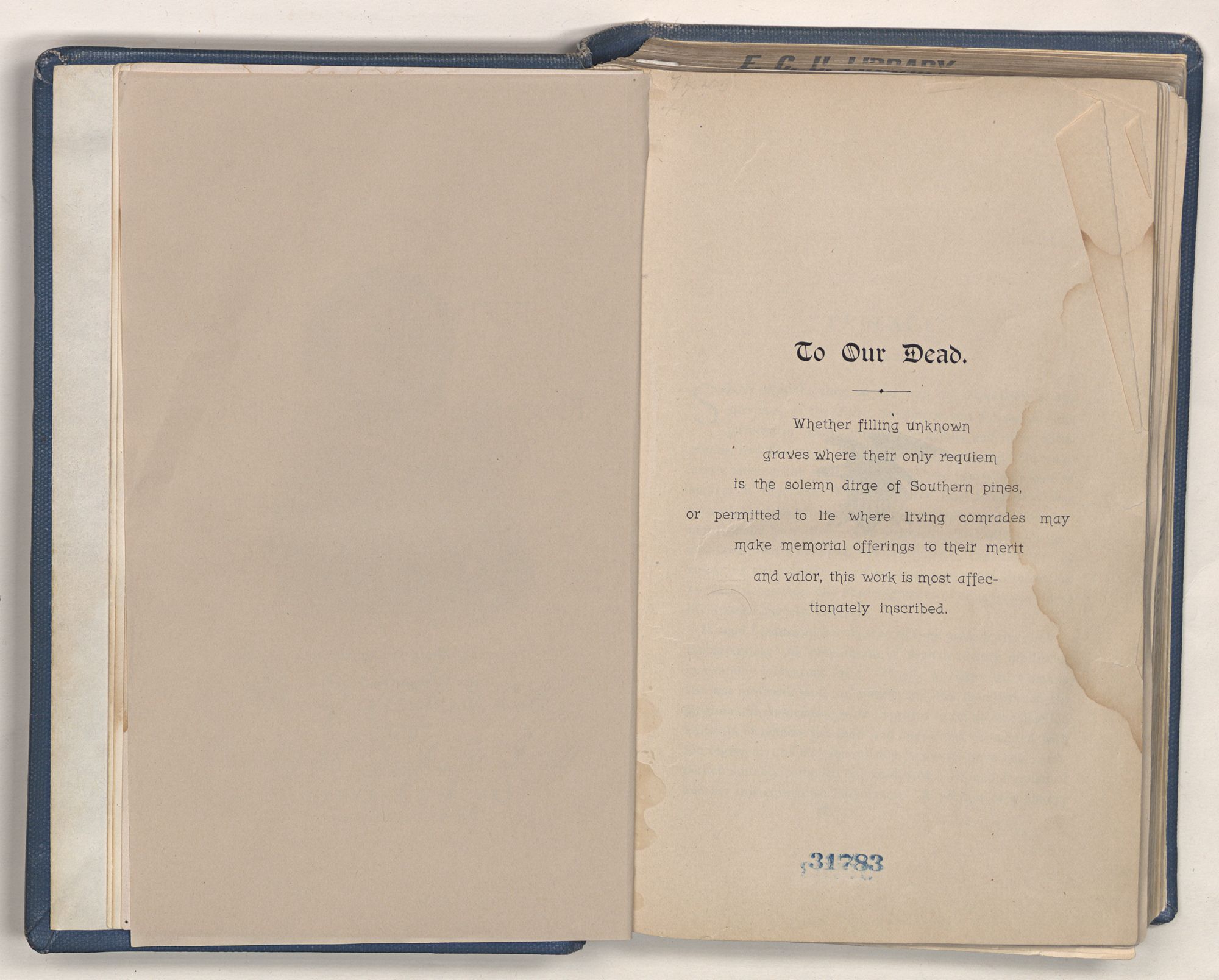 Whether filling unknown graves where their only requiem is the solemn dirge of Southern pines, or permitted to lie where living comrades may make memorial offerings to their merit and valor, this work is most affectionately inscribed.