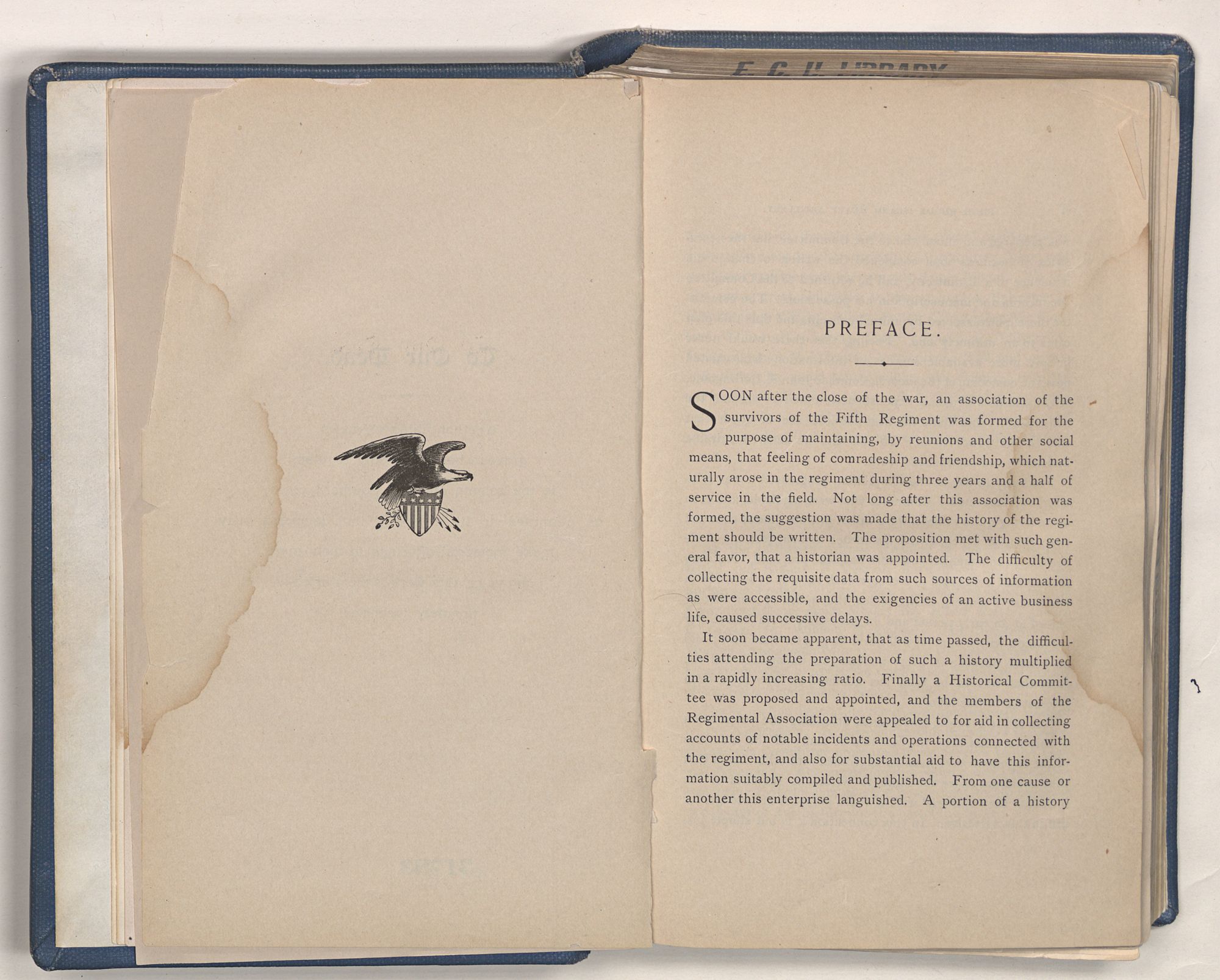 SOON after the close of the war, an association of the survivors of the Fifth Regiment was formed for the purpose of maintaining, by reunions and other social means, that feeling of comradeship and friendship, which naturally arose in the regiment during three years and a half of service in the field. Not long after this association was formed, the suggestion was made that the history of the regiment should be written. The proposition met with such general favor, that a historian was appointed. The difficulty of collecting the requisite data from such sources of information as were accessible, and the exigencies of an active business life, caused successive delays.